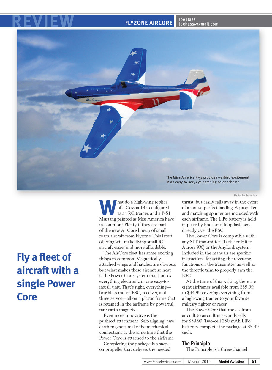What does a high-wing replica of a Cessna 195, configured as an RC trainer, and a P-51 Mustang painted as Miss America have in common? Plenty if they are part of the new AirCore lineup of small foam aircraft from Flyzone. This latest offering is going to make flying small RC aircraft easier and more affordable.