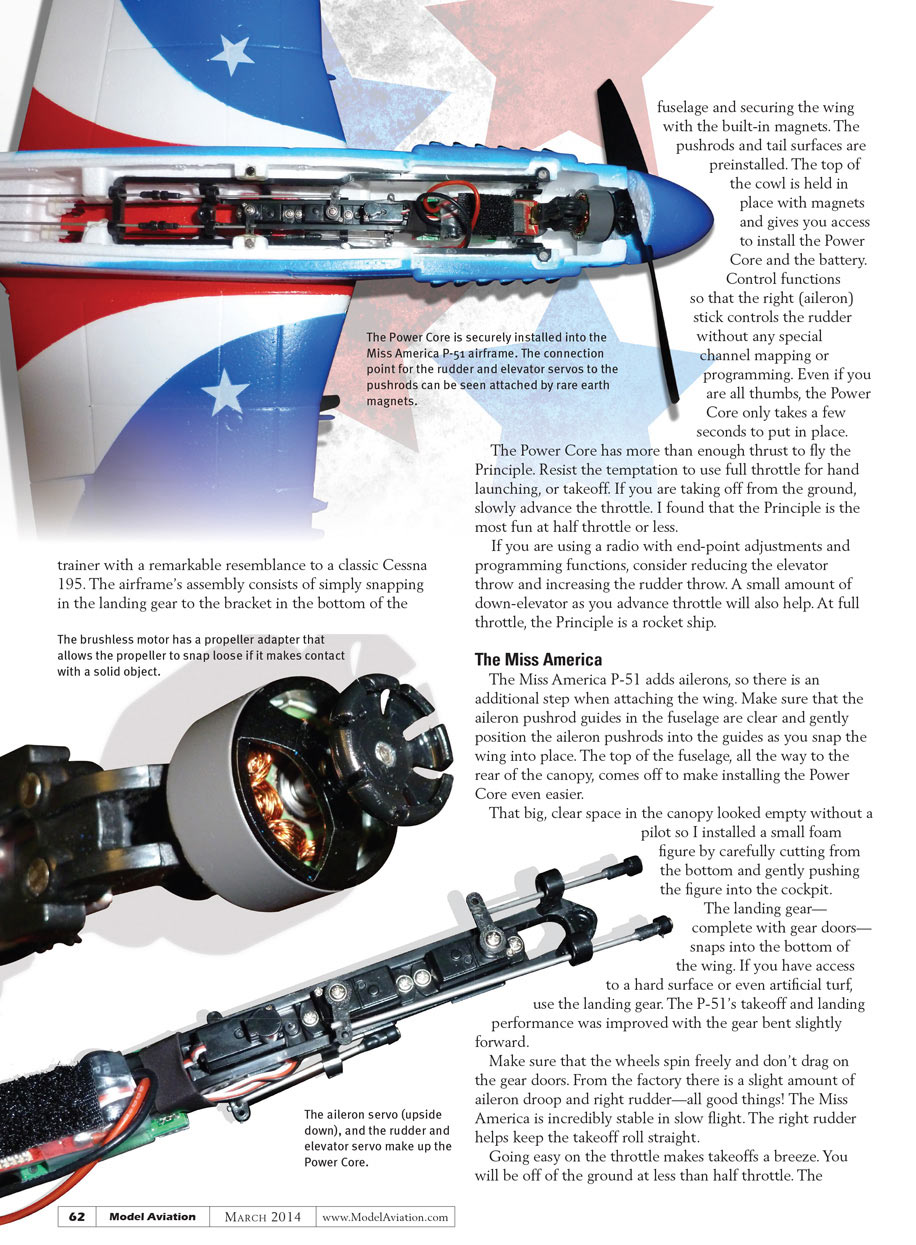 Going easy on the throttle makes takeoffs a breeze. You will be off of the ground at less than half throttle. The machine is fully aerobatic. Inverted flight requires significant down-elevator input. All of the typical warbird maneuvers are easily achieved. At full throttle, the Miss America becomes a racer burning up the indoor or outdoor skies.