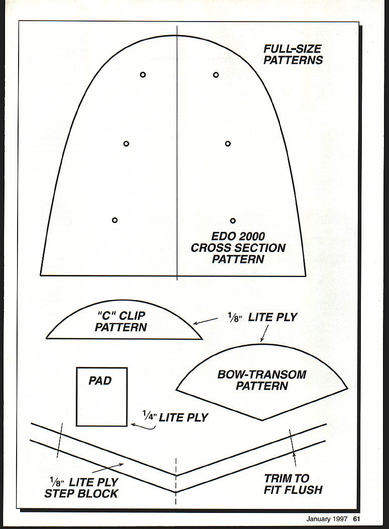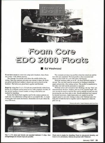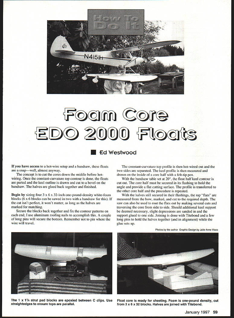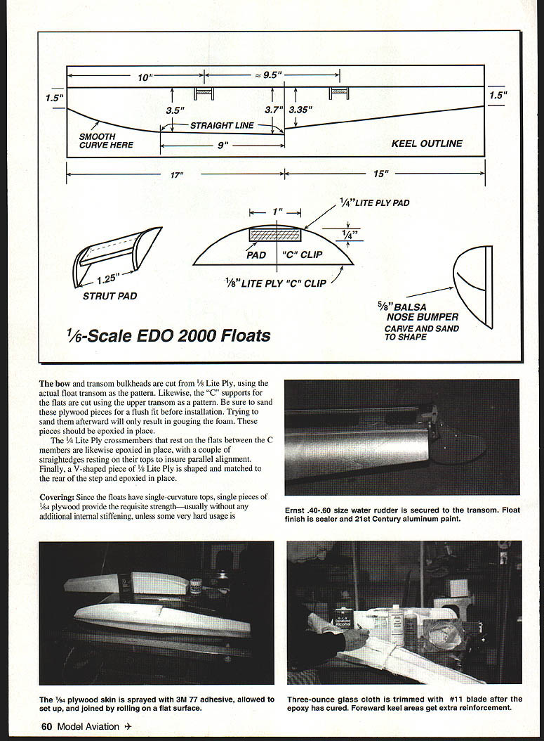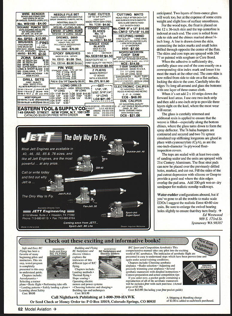 If have access hot-wire setup bandsaw floats snapwell almost anyway concept cut cores down middle before hotwiring Once constant-curvature top contour done floats parted keel outline drawn cut bevel bandsaw halves glued back together finished Begin sizing four 3 x 6 x 32-inch one-pound-density white-foam blocks 6 x 6 blocks can sawed two handsaw cut isnt perfect wont matter long halves marked matching Secure blocks back together fix contour patterns end use aluminum roofing nails accomplish couple long pins will secure bottom Remember pin wire will travel constant-curvature top profile hot-wired out two sides separated keel profile measured drawn inside core half felt-tip pen bandsaw table set 200 float half keel contour cut out core half must secured its flashing hold angle provide flat cutting surface profile transferred other core half procedure repeated halves still secured flashings top flats measured bow marked cut required depth saw can also used rout flats out making several cuts traversing core side side Should additional keel support deemed necessary slight depressions sanded support glued side Joining done Titebond few long pins hold halves together alignment glue sets up January1997 59 icri U Ed Westwood Photos ho author Granhic Oeson Julie Anne Visco 1 x 1 strut pad blocks epoxied between C clips Use Float core ready sheeting Foam one-pound density cut straightedges ensure tops parallel 3 x 6 x 32 blocks Halves joined Titebond U -IDu 35 SMOOTH CURVE HERE 1 37 iSTRAIGHTLINE k 17 335 KEEL OUTLINE I k 1- PAD C CLIP 1ALITE PLY PAD 1 25 /1 /8LITE PLY C CLIP STRUT PAD 6-Scale EDO 2000 Floats bow transom bulkheads cut 1/8 Lite Ply using actual float transom pattern Likewise C supports flats cut using upper transom pattern sure sand plywood pieces flush fit before installation Trying sand afterward will result gouging foam pieces should epoxied place Ply crossmembers rest flats between C members likewise epoxied place couple straightedges resting tops insure parallel alignment Finally V-shaped piece /8 Lite Ply shaped matched rear step epoxied place Covering Since floats have single-curvature tops single pieces 1/M plywood provide requisite strengthusually additional internal stiffening unless some very hard usage 5/8BALSA NOSE BUMPER CARVE AND SAND TO SHAPE 60 Model Aviation * 15 15 Ernst 40-60 size water rudder secured transom Float finish sealer 21st Century aluminum paint 1/64 plywood skin sprayed 3M 77 adhesive allowed Three-ounce glass cloth trimmed #11 blade after set up joined rolling flat surface epoxy has cured Foreward keel areas get extra reinforcement PATTERNS 0 0 EDO 2000 CROSS SECTION PATTERN C CLIP PATTERN 1/8~ LITE PLY L ITE PLY 1/5~ LITE PLY STEP BLOCK FIT FLUSH January1997 61 0 0 PAD 7 WIRE BENDER BENDS AND FORMS WIRE AND STRIPS OF METAL IN ANGLES CURVES LOOPS ETC No WB100 $400 SQUARE PUNCH SET CUTS SQUARES AND SLOTS SET INCLUDES SIZE2/ 1/B 3118 14 /183/B No SPS5 1200 BRUSHES T-PINS 3PCSMINLATURE 1 1/4 WIRE BRUSH SET 100 PACK ONE EACH BRASS MADE INU SA VYLON STAJNLESS TP14 MWB3 $aoo SAWS 15042 TEETH 3/45230 20032 TEETH 3/4230 250 MITRE BOX250 450 SUPER SABRE LONG & SHORT BLADE 260 500 ZONA HAKA 1 1/4 270 600 JUNIOR HACKSAW 165 MADE IN U SR DRILL SETS FIRST OUALI1Y HIGH SPEED STEEL AU BETS BUPPUED IN CASE D516511101o1/4 gIl3p"14 450 D51611/1B 101/2 2 29 pI- 1855 05150-A TO S - SB poI- 2350 MOST POPULAR 5080 lB0pcsSIB50 DSIB4NoB1 B00F0sl-SA00 NEEDLE FILE SET PLASTIC HANDLE WITH EACH FILE GREAT ON WOOD PLASTIC METAL INDUSTRIAL DUALITY HEAVY DUlY 12 DIFFERENT SHAPES NFSI00 -4 LONG- $500 NFS1OI -5 LONG $500 NFS1O2 ALONG -SEOD DREMEL 3950 TOP OF THE UNE MOTO POWER TOOL SET INCLUDES 40 ACCESSORIES AND CASE No 3950 $7000 EPOXY BRUSHES MADE IN USA 12/PACK No EB12- $100 Doz No EB144 -$800 GroSs PIN VISE STAINLESS STEEL -0 TO 110 CAP PV4 4 Long S4DD PVE 0 Long 000 PVIS10Long- 800 PV15-15LOog -1000 PV614-Oto 114 Capacity-$6O0 TUBE CUlTER 1/5 TO 5/A CAPACITY HEAVY DUTY MADE FROM SEMI-STEEL No TC58 -$400 rRTIFr BLADES No11 MADE IN USA 150 PACK SINGLE EDGE BLADES MADE IN USA FIRST QUALEY NO9100 PACK NoSEB1O2 $450 HEAVY DUTY NO11 FIRST OUALITY 100 PACK Z PLIERS MAKES PERFECT Z BENDS WITH SQUEEZE No ZPL $1100 LONG DRILLS-SET---- FIRST QUALITY- HIGH SPEED STEEL 1/ 12 LONG18 LONG16 1/8 LG1 1/16 $450 LG6 3/16 $1500 5/32 3/16114 G2 1/8450LG7 7/321500w12 LONGI LG3 5/32450LGB 1/41500LG9 $2100 LG4 3/16450 LG5 1/4550I COIIEACCEFT COD ASS $050 7EASTERN TOOL& SUPPLY ORDERS 212 925 1006 149 GRAND STREET NEW YORK NY 10013 OFFICE 21222037491 CATALOG $300 OR FREE WITH 6RI5ERFAX212 925 1010 CUTIiNG MATS HEALS ITSELF AFTER EACH CUT AND SURFACE STAYS SMOOTH NON-OLARE GREEN FINISH CUT ON BOTH SIDES 4oCM8 9x 12 $1000 JoCM12 12xlB 1500 HELPING HAND FIRST DUALITY THREE ARMS 2 ARMS WITH ALLIGATOR CLIPS ARM WITH 20 GLASS 2 1/2/MAGNIFIER HH1 -$700 NORTH WESTERN CHOP SAW MAIOES PERFECT MITRE CUTS 10 45 60 IN WOOD OR PLASTIC JOES SINGLE 0000 BLADE ADJ STOP NCS $iA KG T-BAII SANUIHS ALUMINUM MADE IN USA TiI 11LONG 5250 T22 22 LONG $350 SANDPAPER RUFF TUFF ADHESIVE SACK $1 05 EAI SPECIFY FINEIRSFIMEOIUM RSM OR COARSE RSCI I ELECTRONIC CALIPER 1ST INDUSTRIAL OUAUTY READS IN INCHES AND METRIC 0-0- 0- 155MM EC6 $4800 DIAL CALIPER 1ST INDUSTRIAL DUALITY 6 100 SINGLE REVOLUTION GRAD IN 501 SATIN CHROME FINISH WITH FITTED CASE DC6 -$2100 anticipated Two layers three-ounce glass will work too expense some extra weight slight loss surface smoothness wood tops float placed 12 x 36-inch skin top centerline indexed end core rolled side side chines marked about inch long line drawn down skin connecting index marks small holes drilled through opposite center flats skins core tops sprayed 3M 77 painted sorghum Core Bond adhesive sufficiently dry carefully place end core exactly corresponding skin index mark lower itto meet mark other end core-skin now rolled side side flat surface locking skin core Carefully trim edges 3A2 long around glass bottoms layer three-ounce cloth its set add 2 x lOstrips down forward keel areas u