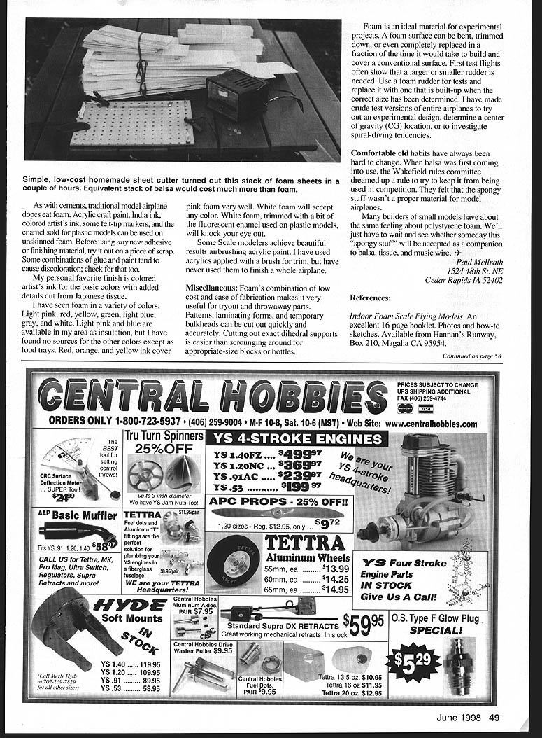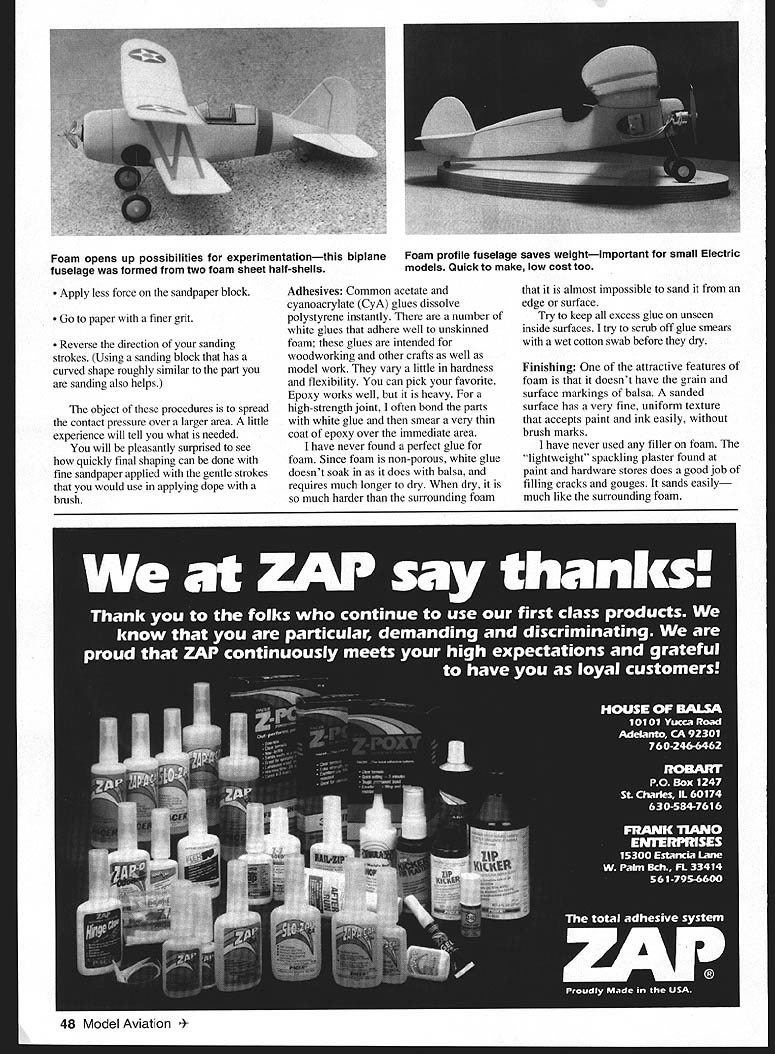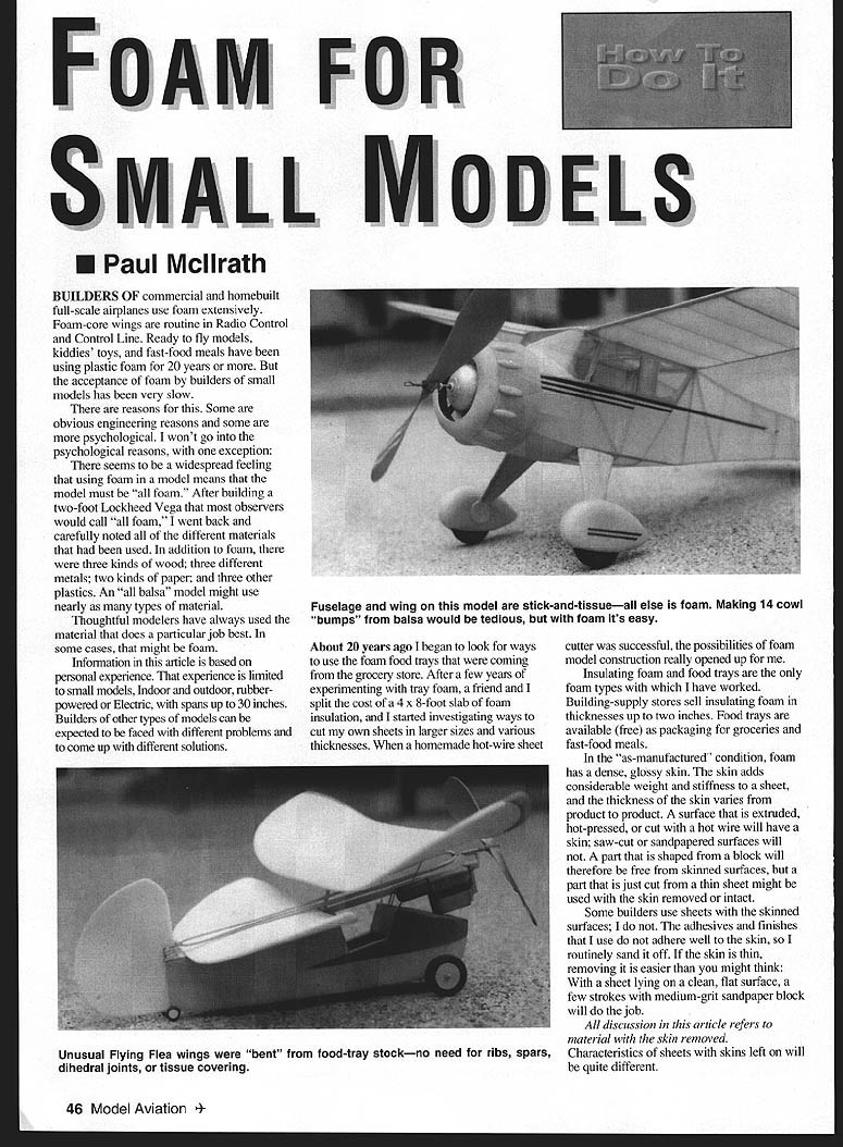 FOAM SMALL U Paul Mcllrath FOR ODELS BUILDERS OF commercial homebuilt full-scale airplanes use foam extensively Foam-core wings routine Radio Control Control Line Ready fly models kiddies toys fast-food meals have using plastic foam 20 years acceptance foam builders small models has very slow reasons Some obvious engineering reasons some psychological wont go psychological reasons exception seems widespread feeling using foam model means model must foam After building two-foot Lockheed Vega observers would call foam went back carefully noted different materials used addition foam three kinds wood three different metals two kinds paper three other plastics An balsa model might use nearly types material Thoughtful modelers have always used material does particular job best some cases might foam Information article based personal experience experience limited small models Indoor outdoor rubberpowered Electric spans up 30 inches Builders other types models can expected faced different problems come up different solutions About 20 years ago began look ways use foam food trays coming grocery store After few years experimenting tray foam friend split cost 4 x 8-foot slab foam insulation started investigating ways cut own sheets larger sizes various thicknesses homemade hot-wire sheet cutter successful possibilities foam model construction really opened up Insulating foam food trays foam types have worked Building-supply stores sell insulating foam thicknesses up two inches Food trays available free packaging groceries fast-food meals as-manufactured condition foam has dense glossy skin skin adds considerable weight stiffness sheet thickness skin varies product product suiface extruded hot-pressed cut hot wire will have skin saw-cut sandpapered surfaces will part shaped block will therefore free skinned surfaces part just cut thin sheet might used skin removed intact Some builders use sheets skinned surfaces adhesives finishes use adhere well skin routinely sand off skin thin removing easier might think sheet lying clean flat surface few strokes medium-grit sandpaper block will job discussion article refers material skin removed Characteristics sheets skins left will quite different 46 Model Aviation lage wing model stick-and-tissueall else foam Making 14 cowl bumps balsa would tedious foam its easy Unusual Flying Flea wings bent food-tray stockno need ribs spars dihedral joints tissue covering General characteristics Since foam often used parts normally would make balsa characteristics building practices balsa will usually used making comparisons Sources Some American hobby suppliers beginning offer foam form sheets Two such sources listed end article other sources foam know already mentioned make own sheets using homemade hot-wire cutter scroll saw fitted fine-tooth blade Cost purchased slab insulation cost single sheet model-building size probably few pennies family devours lot groceries food trays can considered free cost sheets hobby sources may vary will probably cheaper balsa Weight Balsa weighs about four 15 pounds per cubic foot Unskinned foam weighs about two pounds per cubic foot Thin sheets skin still might weigh four seven pounds per cubic foot depending thickness skins Strength Its hard make exact comparison strength foam versus balsa sheet applications usually make foam part lV-2 times thickness called out balsa unstressed parts made blocks like headrests air scoops foam can substituted good saving weight harmful consequences An entire fuselage can carved foam blocks high-stress areas like wing landing-gear attachment points will require some internal reinforcement spars longerons stick balsa Cutting shaping use foam starts increase might want make hot-wire cutter cutting own sheets thickness Otherwise common tools used balsa can used foam However tools must sharp dull tool will just mash material just would very soft balsa Foam easy sand sandpaper blocks will quickly become number-one tool foam part can shaped fraction time would take balsa part like cutting tools sandpaper must sharp clean Sawdust foamdust should often brushed part cutting surface sandpaper sandpaper requires regular vigorous cleaning Although foam seems soft dulls sandpaper edged tools rather quickly Blades must sharpened replaced regularly lighter touch required sanding foam balsa sometimes ugly looking scuff mark will unexpectedly appear part sanding happens stop sanding immediately things before resuming Inspect clean surfaces part sandpaper removing loose imbedded material June 1998 47 TIP LAMINATING ISE FORMS CUSTOMDIHEDRAL SANDING BLOCKSSUPPORTS ROUNDED SHA kit ALL EASY TO CARVE AND SAND FROM FOAM AREAS OF HIGH STRESS OR EXTREME WEAR SHOULD BE REINFORCED BALSA PLYWOOD OR STIFF PAPERI GLUE SKIN OFTEN HELPS Foam opens up possibilities experimentationthis biplane Foam profile fuselage saves weightimportant small Electric fuselage formed two foam sheet half-shells models Quick make low cost too Apply less force sandpaper block Go paper finer grit Reverse direction sanding strokes Using sanding block has curved shape roughly similar part sanding also helps object procedures spread contact pressure over larger area little experience will tell what needed will pleasantly surprised see quickly final shaping can done fine sandpaper applied gentle strokes would use applying dope brush Adhesives Common acetate cyanoacrylate CyA glues dissolve polystyrene instantly number white glues adhere well unskinned foam glues intended woodworking other crafts well model work vary little hardness flexibility can pick favorite Epoxy works well heavy high-strength joint often bond parts white glue smear very thin coat epoxy over immediate area have never found perfect glue foam Since foam non-porous white glue doesnt soak does balsa requires much longer dry dry much harder surrounding foam almost impossible sand edge surface Try keep excess glue unseen inside surfaces try scrub off glue smears wet cotton swab before dry Finishing
