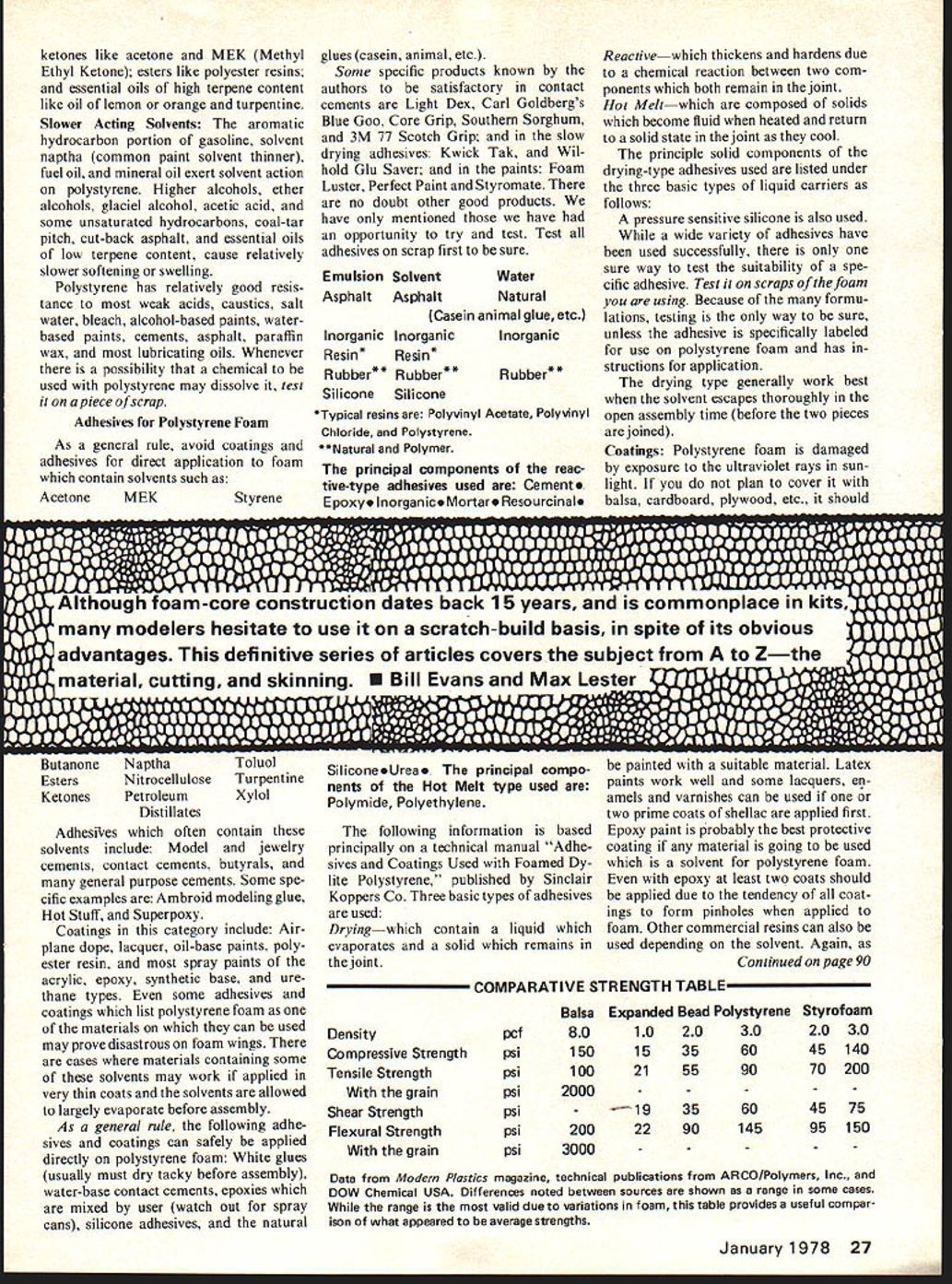 part 37 DUE TO THE amount material will presented article divided three parts months installment deals foam material types foam chemical characteristics compatible sol vents glues etc Part two will deal methods techniques cutting foam cutting bows power supply safety etc Part three deals covering skinning cements construction finishing first installment seems excessively detailed because need supply comprehensive reference will found useful later date Foam Pros Cons Construction Speed work impor tant advantage Once master tech niques cutting foam wing cores can ready cover wing minutes after get two rib templates made takes little longer make extra wing youre foam does break can often epoxy together back air leaving flying field instance Silent Squire flown post 40 mph hitting wing about 15 root putting -in deep dent wing built-up wing would have sheared two foam wing back tow line after merely covering damaged portion few strips masking tape What Foam plastics can produced foam adding chemicals called foam ing agents gases generate gases heating cause plastic assume cellular structure open cells absorb liquids closed cells generally absorb very little liquid Foam plastics produced rigid semi-rigid flexible form Several closed cell rigid plastic foams have used successfully wings fuselages model aircraft Polystyrene Expanded Bead Foam Poly styrene expanded bead foam often called quality foam approximately same density density foam affects strength properly made foam shown comparative strength tables StyrofoamExtruded Polystyrene Foam Styrofoam Dow trademark name polystyrene foam made same basic raw material polystyrene dif ferent process exact process secret generally follows Poly styrene liquid form pumped pro cessing equipment heated foaming agents introduced extruded continuous sheets material has continuous matrix relatively uniform bubbles gas trapped Freon gases used being large molecule does gradu ally escape pentane gas does expanded bead type foam Due solid matrix between bubbles styro foam generally has minimum density 17 pcf lbs/cu ft opposed 08 pcf expanded bead term styrofoam widely used describe polysty rene foams distinction made between expanded-bead type Foam Techniques Ease accuracy construction two big advantages get true airfoil easy get graduated washout root tip covering material follows exact plotted airfoil rather flattening out between ribs Only root tip ribs need plotted tapered wing eliminating plotting stack cutting remaining ribs built-up wing inherent accuracy also makes foam ideal modern scale models few disadvantages Poly styrene expanded bead foam attacked wide variety solvents core can easily ruined dont know what doing major purpose article help avoid such pitfalls take maximum advantage good properties foam Flight Characteristics accuracy airfoil ability build graduated washout high strength no weight penalty offer significant advantages well supported domination foam wings Formula racers pattern ships Its use types gliders well established spreading Moreover foam wings provide shock absorbing character istics have saved ship bead board popular pro duced expanding polystyrene beads usually contain pentane gas expanding foaming agent Foam Made Polystyrene beads appropriate grade bead size fed steam vacuum pre-expander expanded cell size required desired product density expanded beads dried aged six hours common molding sys tem arethen fed preheated molds steam applied heat beads point will complete expan sion fuse together mold cooled molded foam removed number variables affect final product Some design variables such bead size high low volatility beads resin compounds resin quality Some processing equipment varia bles several alternative processes pre-expanding molding beads also number operator controlled variables above affect characteristic finished product either design circumstance fore some variation will encountered extruded Styrofoam brand foam modelers think Styrofoam relatively light brittle DB decorator board type widely used florists Styrofoam type used aircraft modelers light solid blue color has fine texture like sandpaper called SM sheathing material usually about 18 pcf about 80% heavier 10 pcf expanded-type foam generally used Styrofoam advantageous un skinned wings due its greater strength finer grain Expanded bead foam preferred weight factor wing skinned provides ample strength rigidity example typical 60-in Styrofoam wing core could 4 5 oz heavier cut expanded bead foam Chemical Properties Solvents Polystyrene expanded bead foam especially sensitive attack due thin cell walls same solvents also attack Styrofoam Fast Acting Solvents following type solvents dissolve foam quickly Aromatic hydrocarbons like benzene chlorinated hydrocarbons like carbon tetrachloride 26 Model Aviation ketones like acetone MEK Methyl Ethyl Ketone esters like polyester resins essential oils high terpene content like oil lemon orange turpentine Slower Acting Solvents aromatic hydrocarbon portion gasoline solvent naptha common paint solvent thinner fuel oil mineral oil exert solvent action polystyrene Higher alcohols ether alcohols glaciel alcohol acetic acid some unsaturated hydrocarbons coal-tar pitch cut-back asphalt essential oils low terpene content cause relatively slower softening swelling Polystyrene has relatively good resis tance weak acids caustics salt water bleach alcohol-based paints waterbased paints cements asphalt paraffin wax lubricating oils Whenever possibility chemical used polystyrene may dissolve test apiece ofscrap Adhesives Polystyrene Foam As general rule avoid coatings adhesives direct application foam contain solvents such AcetoneMEKStyrene glues casein animal etc Some specific products known authors satisfactory contact cements Light Dex Carl Goldbergs Blue Goo Core Grip Southern Sorghum 3M 77 Scotch Grip slow drying adhesives Kwick Tak Wil hold Glu Saver paints Foam Luster Perfect Paint Styromate no doubt other good products hav