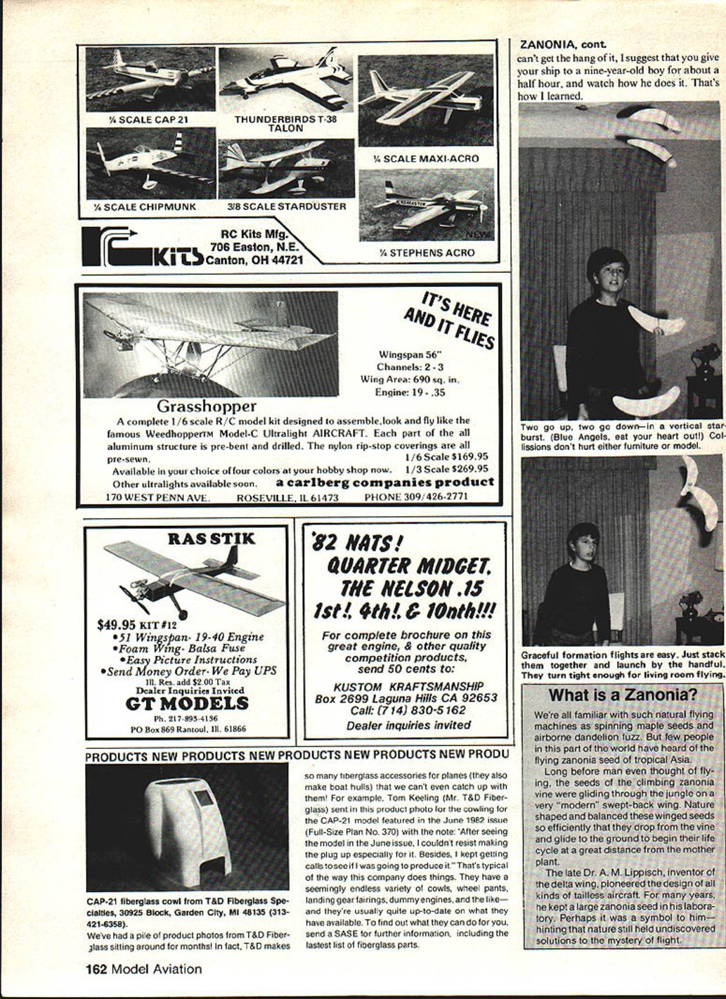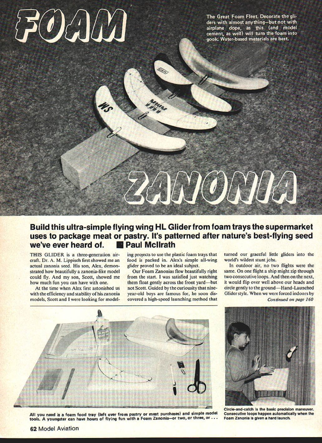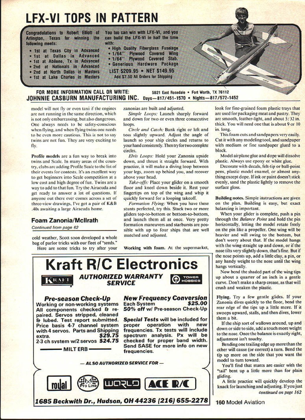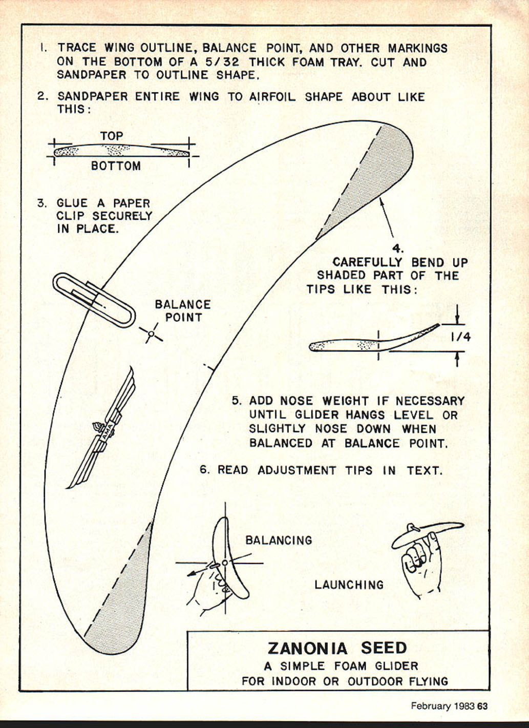 Build ultra-simple flying wing HL Glider foam trays supermarket uses package meat pastry Its patterned after natures best-flying seed weve ever heard U Paul Mcllrath THIS GLIDER three-generation air craft Dr M Lippisch first showed actual zanonia seed son Alex demon strated beautifully zanonia-like model could fly son Scott showed much fun can have time Alex first astonished us efficiency stability zanonia models Scott looking modeling projects use plastic foam trays food packed Alexs simple all-wing glider proved ideal subject Foam Zanonias flew beautifully right start satisfied just watching float gently across front yardbut Scott Guided curiousity nineyear-old boys famous soon dis covered high-speed launching method turned graceful little gliders worlds wildest stunt jobs outdoor air no two flights same flight ship might zip through two consecutive loops next would flip over well above heads circle gently groundHand-Launched Glider style forced indoors Continued page 160 62 Model Aviation need foam food tray left over pastry meet purchases simple model tools youngster can have hours flying fun Foam Zanoniaor two three or. Clrcle-and-catcfl basic precision maneuver Conaecutlve loops happen automatically Foam Zenonla given hard launch I TRACE WING OUTLINE BALANCE POINT AND OTHER MARKINGS ON THE BOTTOM OF 5/32 THICK FOAM TRAY CUT AND SANDPAPER TO OUTLINE SHAPE 2 SANDPAPER ENTIRE WING TO AIRFOIL SHAPE ABOUT LIKE THIS TOP BOTTOM 3 GLUE PAPER CLIP SECURELY CAREFULLY BEND UP SHADED PART OF THE TIPS LIKE THIS zzcc~ 1/4 5 ADD NOSE WEIGHT IF NECESSARY UNTIL GLIDER HANGS LEVEL OR SLIGHTLY NOSE DOWN WHEN BALANCED AT BALANCE POINT 6 READ ADJUSTMENT TIPS IN TEXT BALANCING 0 - ILAUNCHING ZANONIA SEED SIMPLE FOAM GLIDER FOR INDOOR OR OUTDOOR FLYING February 1983 63 LFX-VI TOPS IN PATTERN FOR MORE INFORMATION CALL OR WRITE 5821 East Rosedale Worth TX 76112 JOHNNIE CASBURN MANUFACTURING INC Days8l7/45l-lS7D ts8171572-1452 model will fly taxi engines running same direction embarrassing also dangerous always needs safety-conscious flying flying twins needs cautious say twins fun very exciting fly Profile models fun way break twins Scale areas coun try clubs adding Profile Scale list events contests Its excellent way get beginners Scale competition low cost high degree fun Twins way add fun Try Airacuda get ready answer lot questions anyone out ever comes across set three-view drawings Ive got pair K&B 40s awaiting large Airacuda home Foam Zanonia/Mcllrath Continued page 62 cold weather Scott soon developed whole bag parlor tricks fleet seeds some tricks try after Pre-season Check-Up Working non-working systems components checked & re paired Servos stripped cleaned & lubed Test report submitted Price basis 4-7 channel system 4 servos Parts Shipping extra$2975 2-3 ch system w12 servos S24 75 MILT ERB zanonias built adjusted Simple Loops Launch sharply forward down two three consecutive loops Circle Catch Bank right left toss slightly upward Adjust angle launch ship circles returns hand consistently try two complete circles Elvis Loops Hold Zanonia upside down thrust straight forward practice will make diving loop between legs zoom up behind recover above head Take-offs Place glider smooth floor kneel down beside Rest fingertips top wing whip quickly forward looping takeoff Formation Flying have stunts perfected try Stack two gliders top-to-bottom bottom-to-bottom launch once Very pretty formation maneuvers starbursts pos sible up four ships well matched adjusted Working foam supermarket New Frequency Conversion System$2500 50% oft wI Pre-season Check-Up Special Tests will included proper operation new frequencies Tx tests will include spectrum analysis Px will checked proper band width Send SASE info new frequencies look fine-grained foam plastic trays used packaging meat pastry smooth feather-light about 5/32 thick will need about 9 10 long foam cuts sandpapers very easily Cut modeling tool sandpaper medium fine sandpaper glued block Model airplane glue dope will dissolve plastic Always use epoxy white glue Decorate decals felt-tip ball-point pens plastic model enamel almost thing except dope ink paint doesnt stick evenly sand plastic lightly remove surface gloss Building notes Simple instructions given plan Building easy exact balancing important glider complete push pin through Balance Point hold pin horizontally letting model rotate freely pin like propeller wing will heavier will swing bottom dont worry about model hangs wing straight up down nose tilts very slightly down thats fine nose points up add little clay pin handy weight nose until wing hangs vertically Now bend shaded part wing tips up about quarter inch gentle curve Dont make sharp crease will crush weaken plastic Flying Try few gentle glides Zanonia dives quickly floor bend rear edge tips up little swoops upward stalls dives lower bit ship sort wallows around up down side side add touch weight nose Once balance exactly right adjustment isnt touchy Bending trailing edge up other will cause correct turn Bend tip up side want model turn toward Youll find stunts easier tail bent up little plain gliding little practice will quickly develop knack launching adjusting just continued page 162 1685 Beckwith Dr Hudson OH 44236216 655-2278 160 Model Aviation Kraft RIC Electronics AUTHORIZED WARRANTY SERVICELJi ALSOAUTHORIZEDSERWCEFOR 4S 4 ir Wingspan 56 Channels 2 -3 Wing Area 690 sq Engine 19- 35 rassnopper complete 1/6 scale H/C model kit designed assemblelook fly like famous WeedhopperrM Model-C Ultralight AIRCRAFT part aluminum structure pre-bent drilled nylon rip-stop coverings pre-sewn1/6 Scale $16995 Available choice four colors hobby shop now1/3 Scale $26995 Other ultralights available soon Caribeig companies product 170 WEST PENN AVEROSEVILLE IL 61473PHONE 309/426-2771 CAP-21 fiberglass cowl T&D Fiberglass Spe cialties 30925 Block Garden City Ml 48135 313421-6358 Weve pile product photos T&D Fiber glass sitting around months Intact T&D makes 