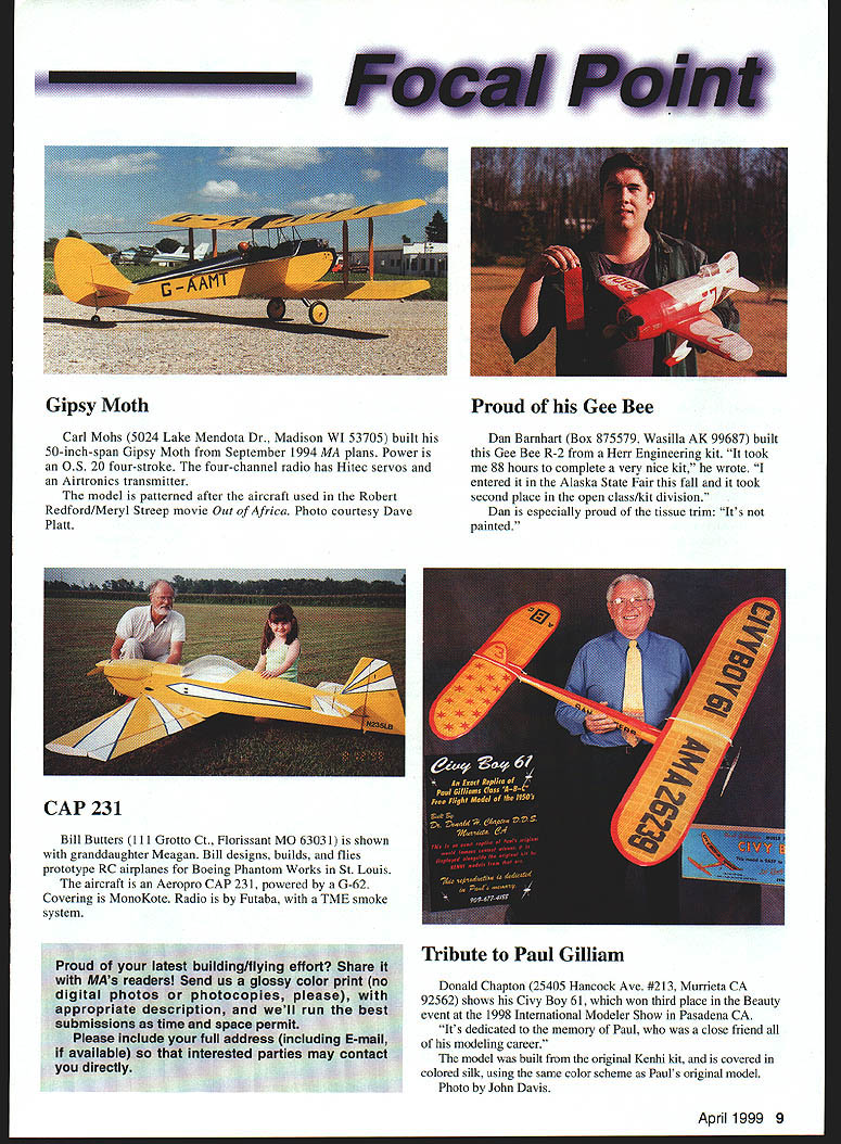 Carl Mohs 5024 Lake Mendota Dr Madison WI 53705 built 50-inch-span Gipsy Moth September 1994 MA plans Power 05 20 four-stroke four-channel radio has Hitec servos Airtronics transmitter model patterned after aircraft used Robert Redford/Meryl Streep movie Out Africa Photo courtesy Dave Platt Bill Butters ill Grotto Ct Florissant MO 63031 shown granddaughter Meagan Bill designs builds flies prototype RC airplanes Boeing Phantom Works St Louis aircraft Aeropro CAP 231 powered G-62 Covering MonoKote Radio Futaba TME smoke system Dan Barnhart Box 875579 Wasilla AK 99687 built Gee Bee R-2 Herr Engineering kit took 88 hours complete very nice kit wrote entered Alaska State Fair fall took second place open class/kit division Dan especially proud tissue trim Its painted Donald Chapton 25405 Hancock Ave #213 Murrieta CA 92562 shows Civy Boy 61 won third place Beauty event 1998 International Modeler Show Pasadena CA Its dedicated memory Paul close friend modeling career model built original Kenhi kit covered colored silk using same color scheme Pauls original model Photo John Davis April 1999 9 Gipsy MothProud Gee Bee CAP 231 Tribute Paul Gilliam