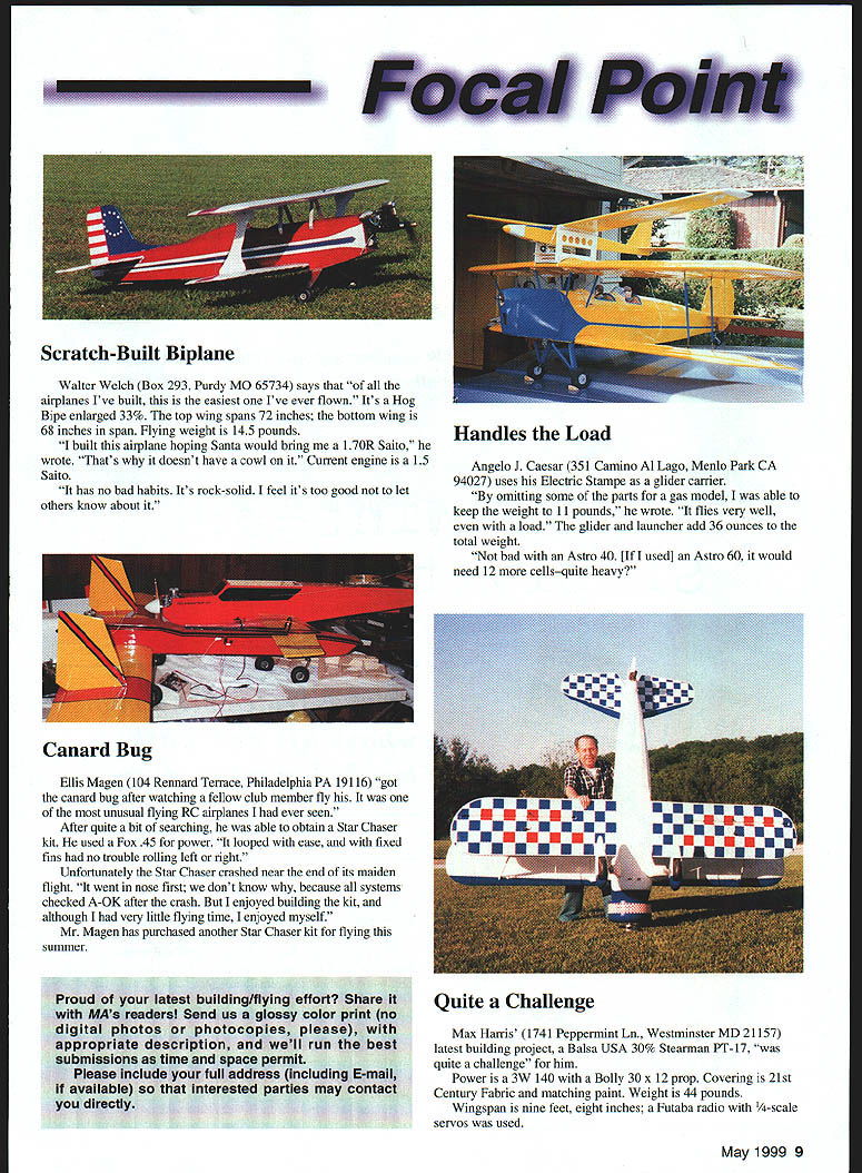 Ellis Magen 104 Rennard Terrace Philadelphia PA 19116 got canard bug after watching fellow club member fly unusual flying RC airplanes ever seen After quite bit searching able obtain Star Chaser kit used Fox 45 power looped ease fixed fins no trouble rolling left right Unfortunately Star Chaser crashed near end its maiden flight went nose first dont know because systems checked A-OK after crash enjoyed building kit although very little flying time enjoyed myself Mr Magen has purchased another Star Chaser kit flying summer Angelo J Caesar 351 Camino Al Lago Menlo Park CA 94027 uses Electric Stampe glider carrier omitting some parts gas model able keep weight 11 pounds wrote flies very well load glider launcher add 36 ounces total weight bad Astro 40 [If used] Astro 60 would need 12 cellsquite heavy Max Hats 1741 Peppermint Ln Westminster MD 21157 latest building project Balsa USA 30% Stearman PT-17 quite challenge him Power 3W 140 Bolly 30 x 12 prop Covering 21st Century Fabric matching paint Weight 44 pounds Wingspan nine feet eight inches Futaba radio -scale servos used May1999 9 Scratch-Built Biplane Walter Welch Box 293 Purdy MO 65734 says airplanes Ive built easiest Ive ever flown Its Hog Bipe enlarged 33% top wing spans 72 inches bottom wing 68 inches span Flying weight 145 pounds Handles Load built airplane hoping Santa would bring 1 70R Saito wrote Thats doesnt have cowl Current engine 15 Saito has no bad habits Its rock-solid feel its too good let others know about Canard Bug Quite Challenge