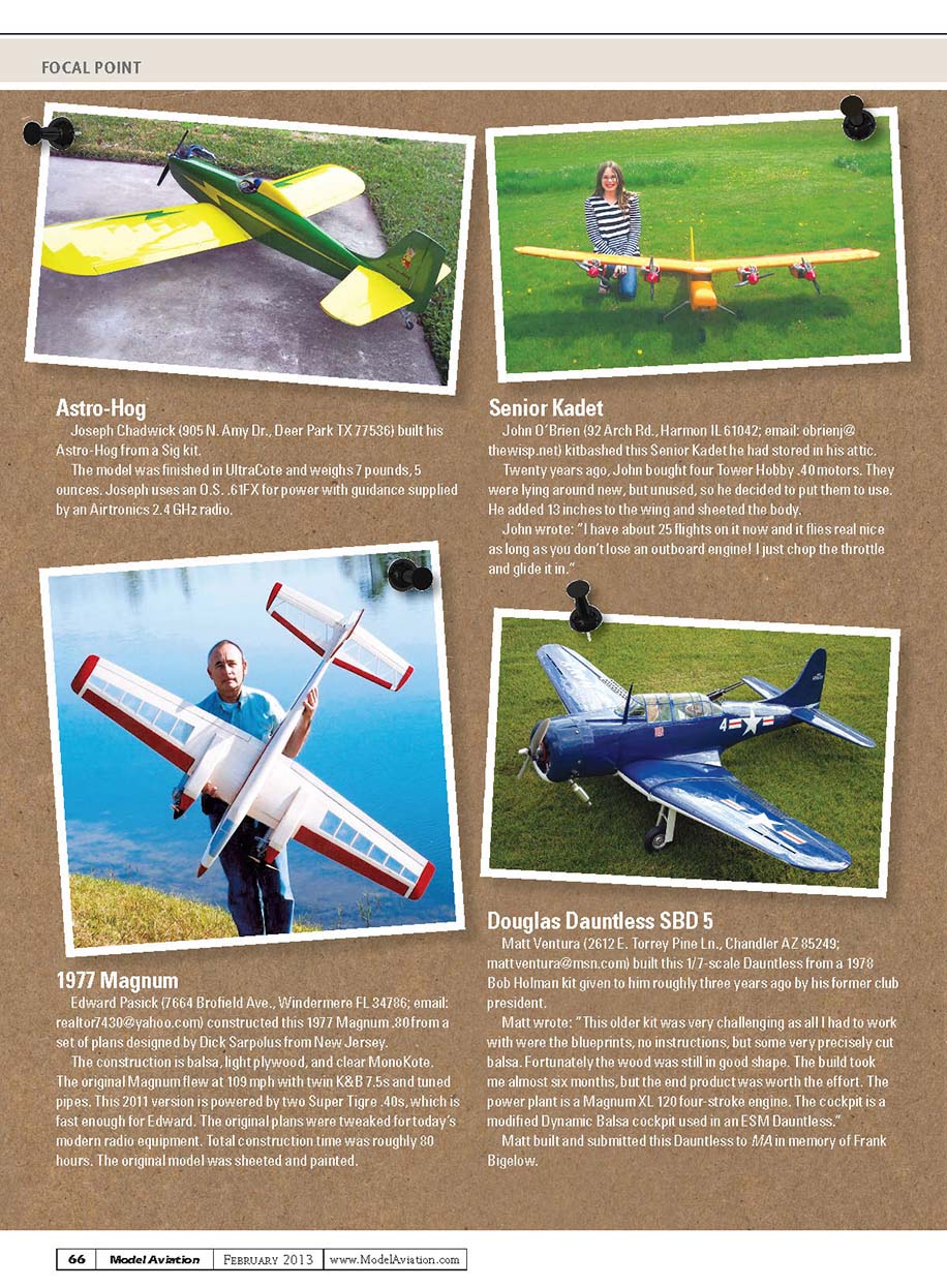 66Model Aviation FEBRUARY 2013www.ModelAviation.comSenior Kadet John O’Brien (92 Arch Rd., Harmon IL 61042; email: obrienj@thewisp.net) kitbashed this Senior Kadet he had stored in his attic. Twenty years ago, John bought four Tower Hobby .40 motors. They were lying around new, but unused, so he decided to put them to use. He added 13 inches to the wing and sheeted the body. John wrote: “I have about 25 fl ights on it now and it fl ies real nice as long as you don’t lose an outboard engine! I just chop the throttle and glide it in.”1977 Magnum Edward Pasick (7664 Brofi eld Ave., Windermere FL 34786; email: realtor7430@yahoo.com) constructed this 1977 Magnum .80 from a set of plans designed by Dick Sarpolus from New Jersey. The construction is balsa, light plywood, and clear MonoKote. The original Magnum fl ew at 109 mph with twin K&B 7.5s and tuned pipes. This 2011 version is powered by two Super Tigre .40s, which is fast enough for Edward. The original plans were tweaked for today’s modern radio equipment. Total construction time was roughly 80 hours. The original model was sheeted and painted.Douglas Dauntless SBD 5 Matt Ventura (2612 E. Torrey Pine Ln., Chandler AZ 85249; mattventura@msn.com) built this 1/7-scale Dauntless from a 1978 Bob Holman kit given to him roughly three years ago by his former club president. Matt wrote: “This older kit was very challenging as all I had to work with were the blueprints, no instructions, but some very precisely cut balsa. Fortunately the wood was still in good shape. The build took me almost six months, but the end product was worth the effort. The power plant is a Magnum XL 120 four-stroke engine. The cockpit is a modifi ed Dynamic Balsa cockpit used in an ESM Dauntless.” Matt built and submitted this Dauntless to MA in memory of Frank Bigelow.FOCAL POINT1977 MagnumAstro-Hog Joseph Chadwick (905 N. Amy Dr., Deer Park TX 77536) built his Astro-Hog from a Sig kit. The model was fi nished in UltraCote and weighs 7 pounds, 5 ounces. Joseph uses an O.S. .61FX for power with guidance supplied by an Airtronics 2.4 GHz radio.