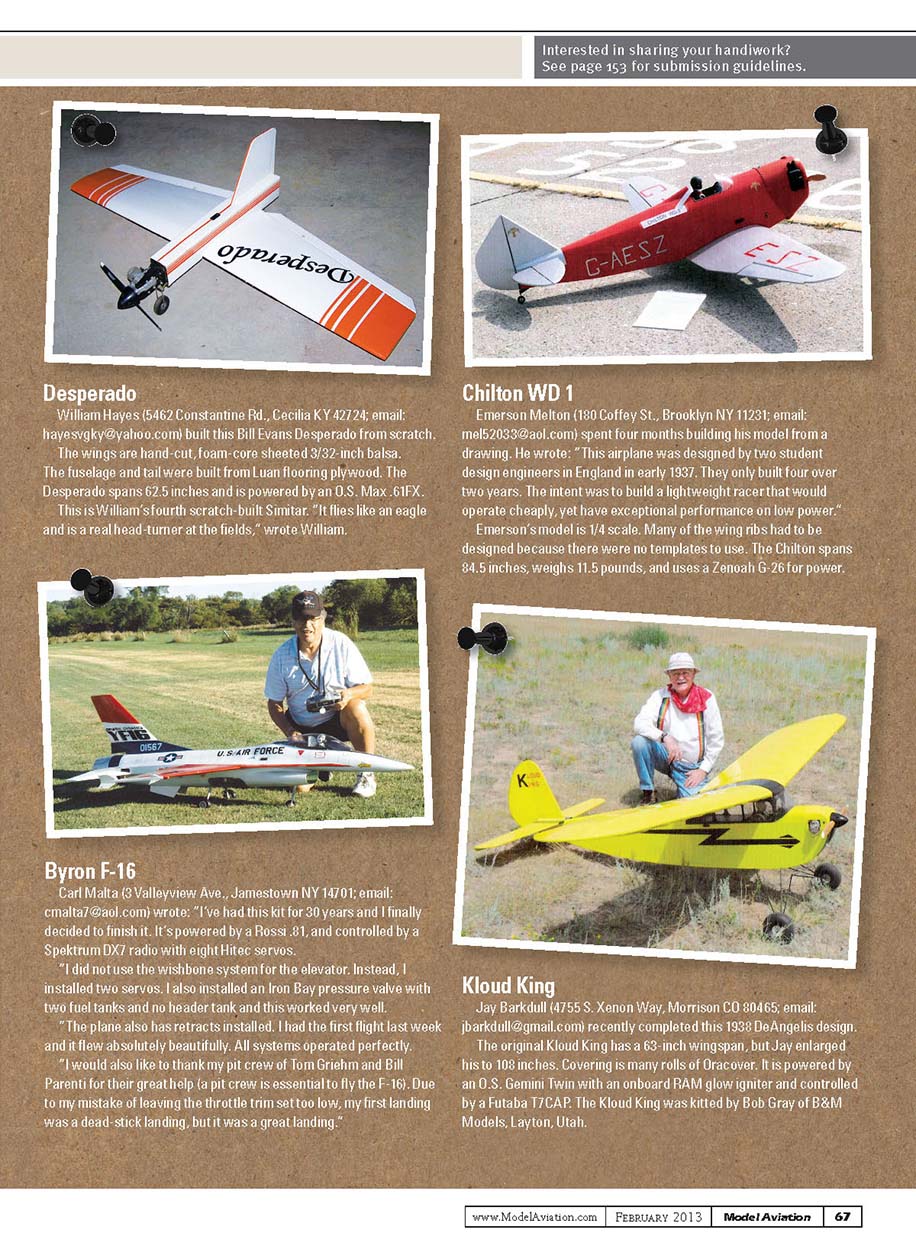 67Model Aviation FEBRUARY 2013www.ModelAviation.comChilton WD 1 Emerson Melton (180 Coffey St., Brooklyn NY 11231; email: mel52033@aol.com) spent four months building his model from a drawing. He wrote: “This airplane was designed by two student design engineers in England in early 1937. They only built four over two years. The intent was to build a lightweight racer that would operate cheaply, yet have exceptional performance on low power.” Emerson’s model is 1/4 scale. Many of the wing ribs had to be designed because there were no templates to use. The Chilton spans 84.5 inches, weighs 11.5 pounds, and uses a Zenoah G-26 for power.Byron F-16 Carl Malta (3 Valleyview Ave., Jamestown NY 14701; email: cmalta7@aol.com) wrote: “I’ve had this kit for 30 years and I fi nally decided to fi nish it. It’s powered by a Rossi .81, and controlled by a Spektrum DX7 radio with eight Hitec servos. “I did not use the wishbone system for the elevator. Instead, I installed two servos. I also installed an Iron Bay pressure valve with two fuel tanks and no header tank and this worked very well. “The plane also has retracts installed. I had the fi rst fl ight last week and it fl ew absolutely beautifully. All systems operated perfectly. “I would also like to thank my pit crew of Tom Griehm and Bill Parenti for their great help (a pit crew is essential to fl y the F-16). Due to my mistake of leaving the throttle trim set too low, my fi rst landing was a dead-stick landing, but it was a great landing.”Kloud King Jay Barkdull (4755 S. Xenon Way, Morrison CO 80465; email: jbarkdull@gmail.com) recently completed this 1938 DeAngelis design. The original Kloud King has a 63-inch wingspan, but Jay enlarged his to 108 inches. Covering is many rolls of Oracover. It is powered by an O.S. Gemini Twin with an onboard RAM glow igniter and controlled by a Futaba T7CAP. The Kloud King was kitted by Bob Gray of B&M Models, Layton, Utah.Desperado William Hayes (5462 Constantine Rd., Cecilia KY 42724; email: hayesvgky@yahoo.com) built this Bill Evans Desperado from scratch. The wings are hand-cut, foam-core sheeted 3/32-inch balsa. The fuselage and tail were built from Luan fl ooring plywood. The Desperado spans 62.5 inches and is powered by an O.S. Max .61FX. This is William’s fourth scratch-built Simitar. “It fl ies like an eagle and is a real head-turner at the fi elds,” wrote William.DesperadoInterested in sharing your handiwork? See page 153 for submission guidelines.