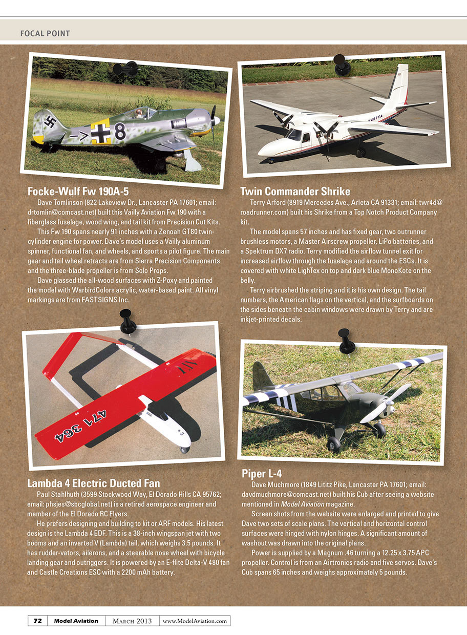 Dave Tomlinson (822 Lakeview Dr., Lancaster PA 17601; email: drtomlin@comcast.net) built this Vailly Aviation Fw 190 with fiberglass fuselage and wood wing and tail kit from Precision Cut Kits.