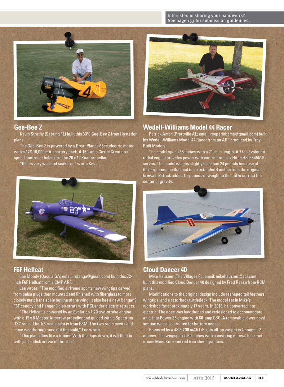 Mike Hausner (The Villages FL; email: mikehausner@aol.com) built this modified Cloud Dancer 40 designed by Fred Reese from RCM plans.