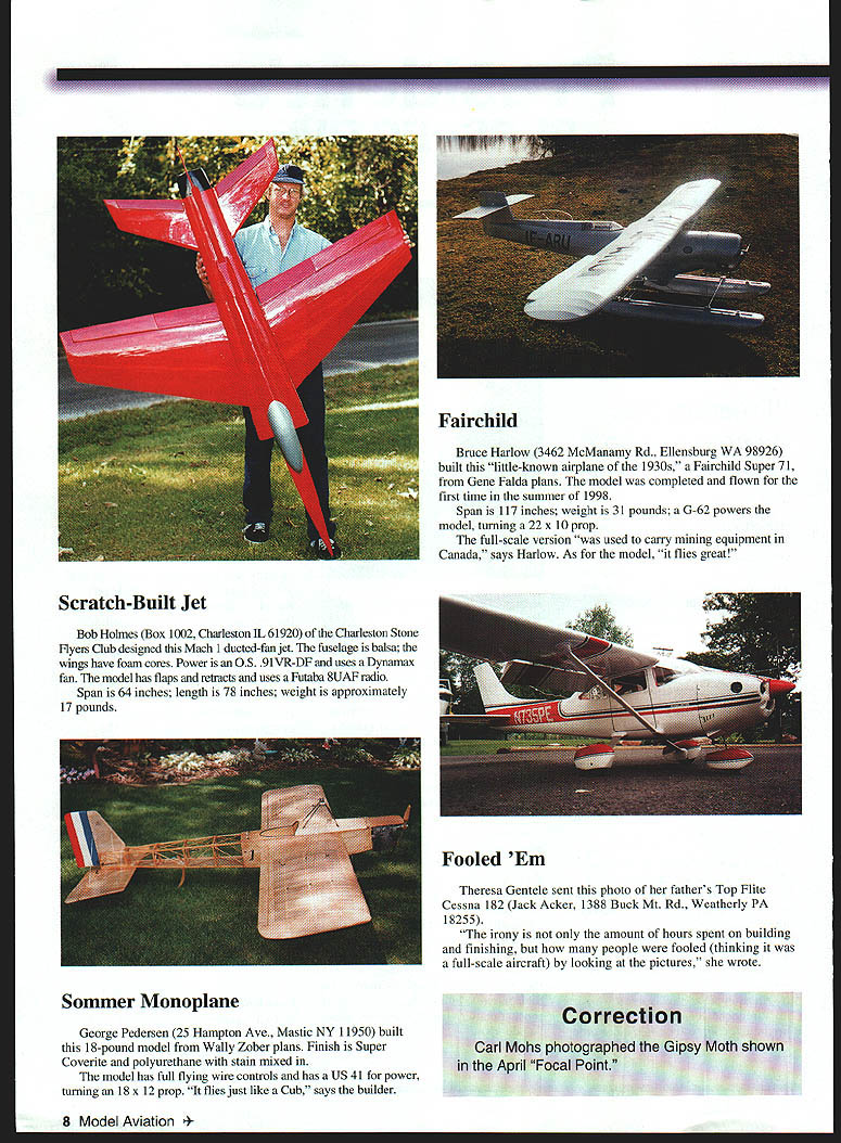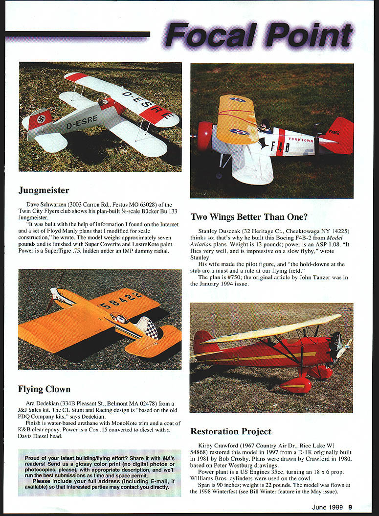 Bruce Harlow 3462 McManamy Rd Ellensburg WA 98926 built little-known airplane 1 930s Fairchild Super 71 Gene Falda pians model completed flown first time summer 1998 Span 117 inches weight 31 pounds G-62 powers model turning 22 x 10 prop full-scale version used carry mining equipment Canada says Harlow As model flies great Bob Holmes Box 1002 Charleston IL 61920 Charleston Stone Flyers Club designed Mach 1 ducted-fan jet fuselage balsa wings have foam cores Power OS 91VR-DF uses Dynamax fan model has flaps retracts uses Futaba 8UAF radio Span 64 inches length 78 inches weight approximately 17 pounds Theresa Gentele sent photo fathers Top Flite Cessna 182 Jack Acker 1388 Buck Mt Rd Weatherly PA 18255 irony amount hours spent building finishing people fooled thinking full-scale aircraft looking pictures wrote George Pedersen 25 Hampton Ave Mastic NY 11950 built 18-pound model Wally Zober plans Finish Super Coverite polyurethane stain mixed model has full flying wire controls has US 41 power turning 18 x 12 prop flies just like Cub says builder 8 Model Aviation child Scratch-Built Jet Fooled Em Sommer Monoplane Dave Schwarzen 3003 Carron Rd Festus MO 63028 Twin City Flyers club shows plan-built 1/6-scale Bucker Bu 133 Jungmeister built help information found Internet set Floyd Manly pians modified scale construction wrote model weighs approximately seven pounds finished Super Coverite LustreKote paint Power SuperTigre 75 hidden under IMP dummy radial Ara Dedekian 334B Pleasant St Belmont MA 02478 J&J Sales kit CL Stunt Racing design based old PDQ Company kits says Dedekian Finish water-based urethane MonoKote trim coat K&B clear epoxy Power Cox 15 converted diesel Davis Diesel head Stanley Dusczak 32 Heritage Ct Cheektowaga NY 14225 thinks thats built Boeing F4B-2 Model Aviation plans Weight 12 pounds power ASP 108 flies very well impressive slow flyby wrote Stanley wife made pilot figure hold-downs stab must rule flying field plan #750 original article John Tanzer January 1994 issue Kirby Crawford 1967 Country Air Dr Rice Lake WI 54868 restored model 1997 D-1K originally built 1981 Bob Crosby Plans drawn Crawford 1980 based Peter Westburg drawings Power plant US Engines 35cc turning 18 x 6 prop Williams Bros cylinders used cowl Span 90 inches weight 22 pounds model flown 1998 Winterfest see Bill Winter feature May issue June1999 9 Jungmeister Two Wings Better Flying Clown Restoration Project