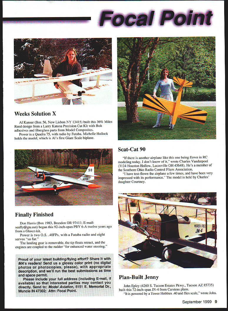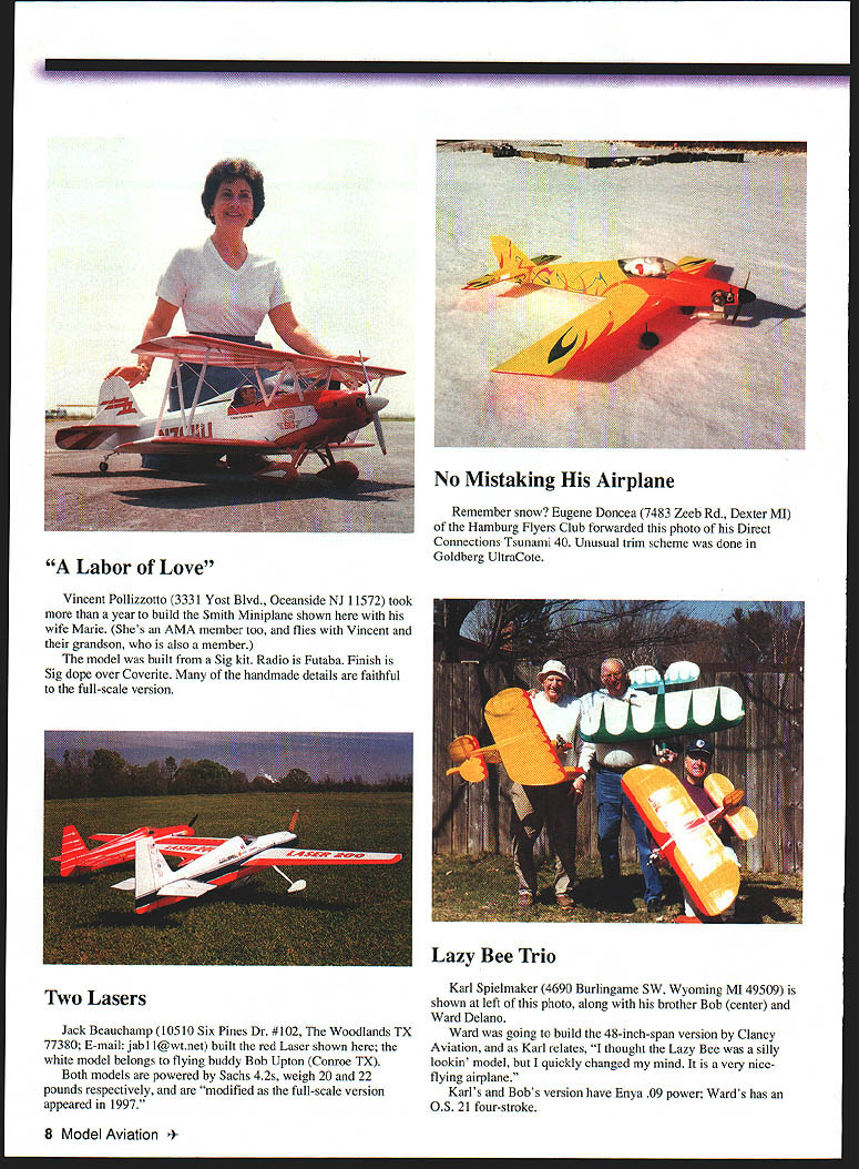 Vincent Pollizzotto 3331 Yost Blvd Oceanside NJ 11572 took year build Smith Miniplane shown wife Marie Shes AMA member too flies Vincent grandson also member model built Sig kit Radio Futaba Finish Sig dope over Coverite handmade details faithful full-scale version Jack Beauchamp 10510 Six Pines Dr #102 Woodlands TX 77380 E-mail jabi 1@wtnet built red Laser shown white model belongs flying buddy Bob Upton Conroe TX Both models powered Sachs 42s weigh 20 22 pounds respectively modified full-scale version appeared 1997 Remember snow Eugene Doncea 7483 Zeeb Rd Dexter MI Hamburg Flyers Club forwarded photo Direct Connections Tsunami 40 Unusual trim scheme done Goldberg UltraCote Karl Spielmaker 4690 Burlingame SW Wyoming MI 49509 shown left photo along brother Bob center Ward Delano Ward going build 48-inch-span version Clancy Aviation Karl relates thought Lazy Bee silly lookin model quickly changed mind very niceflying airplane Karls Bobs version have Enya 09 power Wards has OS 21 four-stroke 8 Model Aviation r Love No Mistaking Airplane Two Lasers Lazy Bee Trio Weeks Solution X Al Kanser Box 56 New Lisbon NY 13415 built 36% Miles Reed design Lany Katona Precision Cut Kit Bolt adhesives fiberglass parts Model Composites Power Quadra 75 radio Futaba Michelle Hollock holds model Als first Giant Scale biplane another airplane like being flown RC modeling today dont know wrote Charles Vanderpool 3124 Houston Hollow Lucasyille OH 45648 Hes member Southern Ohio Radio Control Fliers Association have test-flown airplane few times have very impressed its performance model held Charles daughter Courtney Don Harris Box 1983 Brandon OR 97411 E-mail seafly@gtenet began 92-inch-span PBY 6-A twelve years ago Glasco kit Power two OS 4OFPs Futaba radio eight servos far landing gear removable tip floats retract engines coupled rudder ~for enhanced water steering John Epley 4260 5 Tucson Estates Pkwy Tucson AZ 85735 built 72-inch-span JN-4 Carstens plans powered Tower Hobbies 40 flies scale wrote John September 1999 9 -4- -4- -Cat 90 Finally Finished Plan-Built Jenny