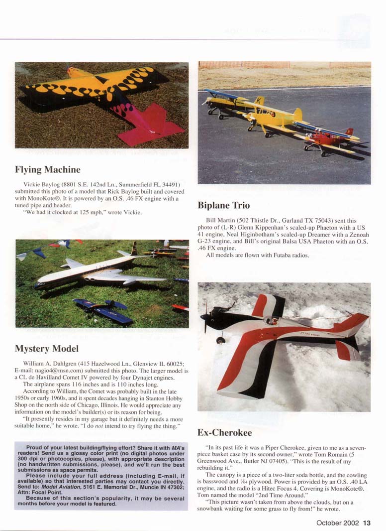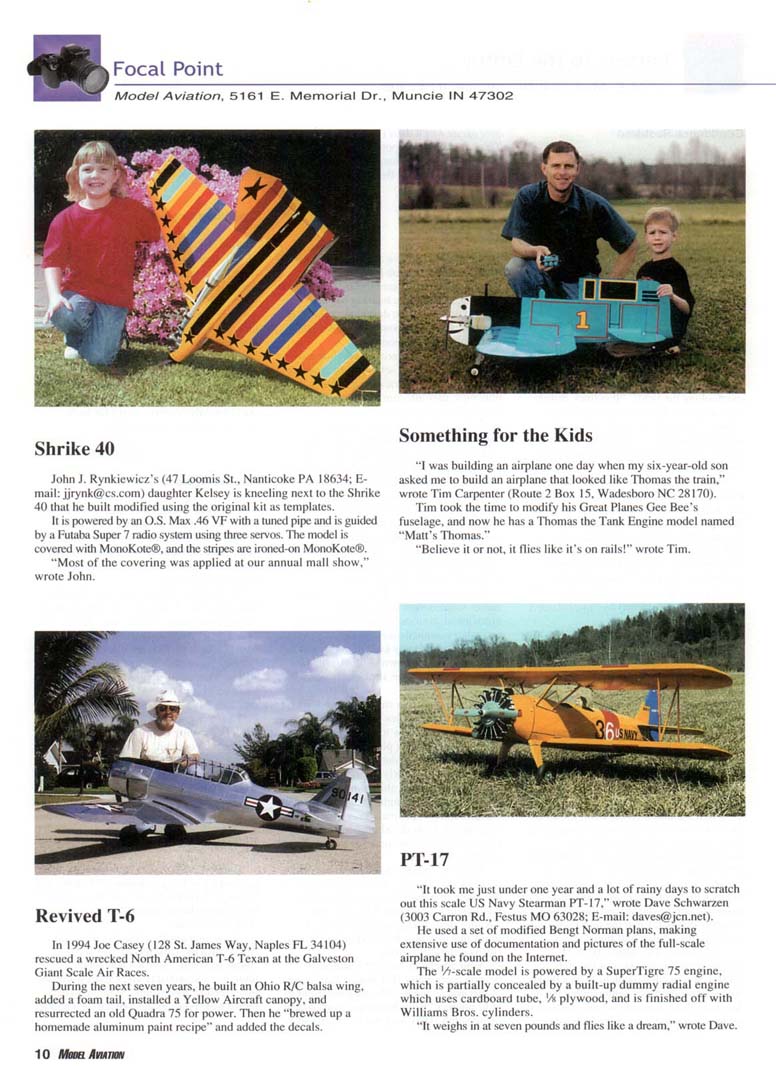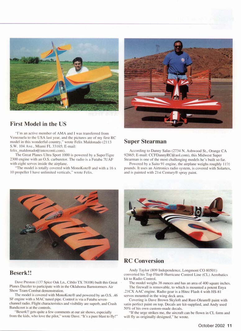Shrike 40 John J. Rynkiewicz's (47 Loomis St., Nanticoke PA 18634; E-mail: jjrynk@cs.com) daughter Kelsey is kneeling next to the Shrike 40 that he built modified using the original kit as templates. It is powered by an O.S. Max .46 VF with a tuned pipe and is guided by a Futaba Super 7 radio system using three servos. The model is covered with MonoKole®, and the stripes are ironed-on MonoKote®. "Most of the covering was applied at our annual mall show," wrote John. Something for the Kids "I was building an airplane one day when my six-year-old son asked me to build an airplane that looked like Thomas the train," wrote Tim Carpenter (Route 2 Box 15, Wadesboro NC 28170). Tim took the time to modify his Great Planes Gee Bee's fuselage, and now he has a Thomas the Tank Engine model named "Matt's Thomas." "Believe it or not, it flies like it's on rails!" wrote Tim. Revived T-6 In 1994 Joe Casey (128 St. James Way, Naples FL 34104) rescued a wrecked North American T-6 Texan at the Galveston Giant Scale Air Races. During the next seven years, he built an Ohio R/C balsa wing, added a foam tail, installed a Yellow Aircraft canopy, and resurrected an old Quadra 75 for power. Then he "brewed up a homemade aluminum paint recipe" and added the decals. "It took me just under one year and a lot of rainy days to scratch out this scale US Navy Stearman PT-17," wrote Dave Schwarzen (3003 Carron Rd., Festus MO 63028; E-mail; daves@jcn.nel). He used a set of modified Bengt Norman plans, making extensive use of documenlalion and piclures of the full-scale airplane he found on Ihe Inlernel. The '/7-scale model is powered by a SuperTigre 75 engine, which is partially concealed by a buill-up dummy radial engine which uses cardboard lube, Vu plywood, and is finished off wilh Williams Bros, cylinders. "It weighs in al seven pounds and flies like a dream," wrole Dave. First Model in the US "I'm an active member ot AMA and I was transferred from Venezuela to the USA last year, and the pictures are of my first RC model in this wonderful country." wrote Felix Maldonado (2113 S.W. 104 Ave., Miami FL 33165: E-mail: felix_maldonado@interconti.com). The Great Planes Ultra Sport 1000 is powered by a SuperTigre 2300 engine with an O.S. carburetor. The radio is a Futaba 7UAF with eight servos inside the airplane. "The model is totally covered with MonoKote® and with a 16 x 10 propeller I have unlimited verticals," wrote Felix. Super Stearman According to Danny Salas (2734 N. Ashwood St., Orange CA 92865: E-mail: CCFDannyRC@aol.com). this Midwest Super Stearman is one of the most challenging models he's built so far. Powered by a Saito 91 engine, the airplane weighs roughly 11 Vi pounds. It uses an Airtronics radio system, is covered with Solartex, and is painted with 21st Century® spray paint. Beserk!! Dave Preston (137 Spice Oak Ln.. Cibilo TX 78108) built this Great Planes Dazzler to participate with in the Oklahoma Barnstormers Air Show Team Combat demonstration. The model is covered with MonoKote® and powered by an O.S. .46 SF engine with a MAC tuned pipe. Control is via a Futaba seven-channel radio. Flight characteristics and visibility are superb, and Crash Bandicoot is at the controls. "Beserk!! gets quite a few comments at our air shows, especially from the kids, who love the pilot." wrote Dave. "It's a pure blast to fly!" RC Conversion Andy Taylor (809 Independence. Longmont CO 80501) converted his Top Flite® Hurricane Control Line (CL) Aerobatics kit to Radio Control. The model weighs 38 ounces and has an area of 400 square inches. The firewall is removable, to which is mounted a potent Enya .21CX AAC engine. Radio gear is a Hitec Flash 4 with HS-81 servos mounted in the wing deck area. Covering is Dave Brown Skyloft and Rust-Oleum® paint with satin perfect paint on top. Decals are kit-supplied, and Andy used 50% of his own custom-made decals. "If the urge strikes me, the aircraft can be flown in CL form and will fly as originally designed," he wrote. Spad XIII Bob Armstrong (9721 Appleton Ave., Kansas City MO 64134-2346; E-mail: spadxilll@swbell.nct) built his Spad from W.E. Technical Services plans. The model spans 80 inches and weighs 22 pounds. It is powered by a Zenoah G-38 gasoline engine. Everything on the airplane is handcrafted except the cowl and wheels. The machine guns are made from balsa and PVC (polyvinyl chloride) pipe. "It is patterned after Captain Eddie Rickenbacker's airplane in both color and design as closely as I could make it," wrote Bob. "1 did some heavy research to do this." AT-6 Texan This Top Elite® AT-6 was Kevin M. Knebel's (102 Morgate Cir., Royal Palm Beach FL 33411; E-mail: tmkkmk@aol.com) first kit. He built it with guidance from a couple of good friends, including Pat McCurry of PCM Models. The model is a replica of Rear Admiral Aubrey Fitch's SNJ-2. According to Kevin, this airplane was the admiral's "private puddle jumper." The AT-6 has gear doors, which were not intended by Top Elite®. The engine is an O.S. 120 Surpass. The exhaust is in the cowl with a fake radial, the front boarding step is a switch, and the air scoop houses the charging part. The model features Pratt & Whitney decals. "With some creative retract servo and valve location and radio gear at the front. I balanced perfectly at 12 pounds with no additional weight," wrote Kevin. L-19-Inspired The lines of Jerry Sciortino's (Route 1 Box 343H, Seaford DE 19973) first scratch-built airplane are inspired by the Cessna L-19 he worked on while in the Army. His wife Geri is shown with the model. It spans six feet and is powered by an O.S. .60 engine. Despite its nine-plus pounds. Jerry didn't need the flaps since takeoffs and landings are gentle and stable. "Owing to the colors and theme, it was only fitting that a bald eagle— grounded by a slight attack of lumbago—should be its pilot," he wrote. Hawker Sea Fury Victor Weitzman (10041 N.W. 3rd St., Plantation FL 33324) built this model—owned by Ernie Krat