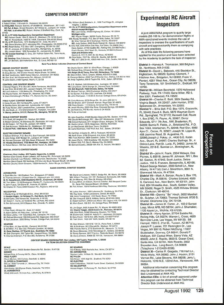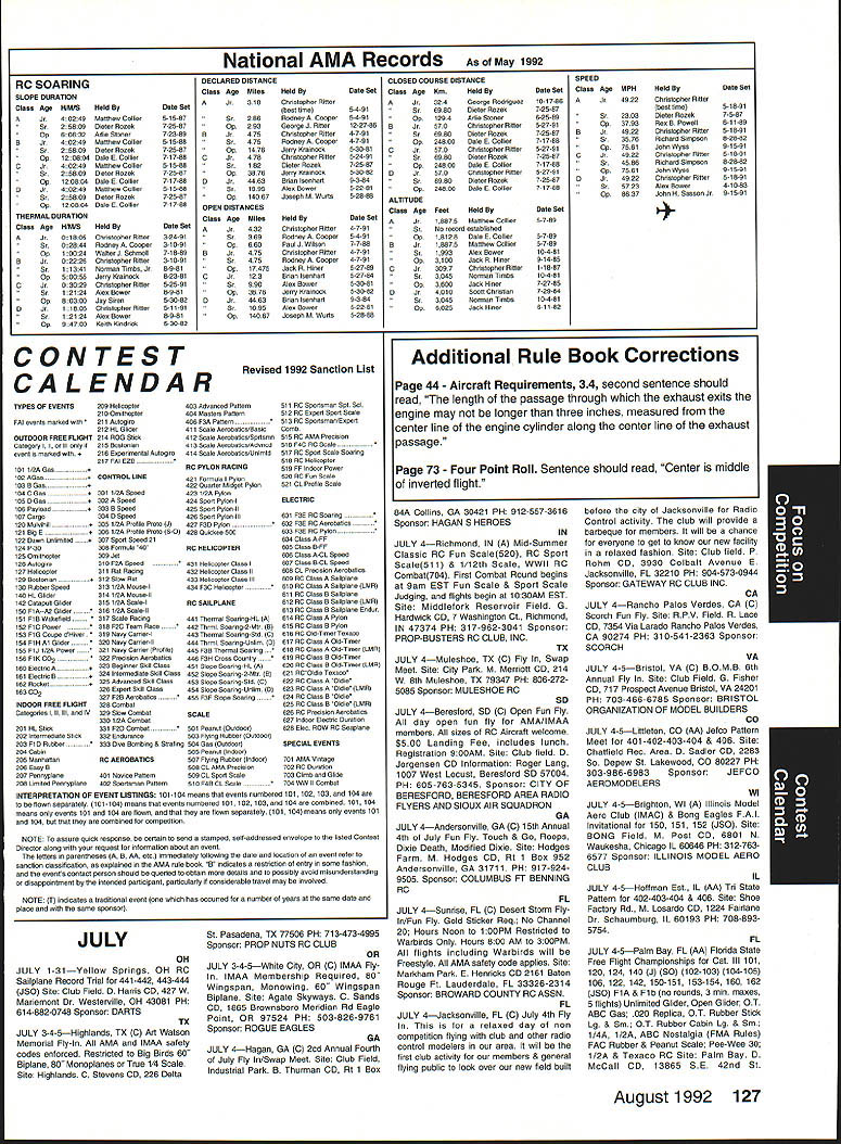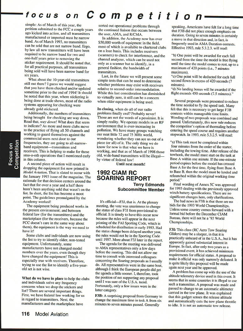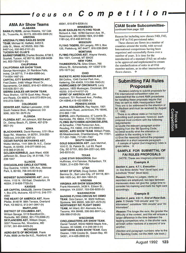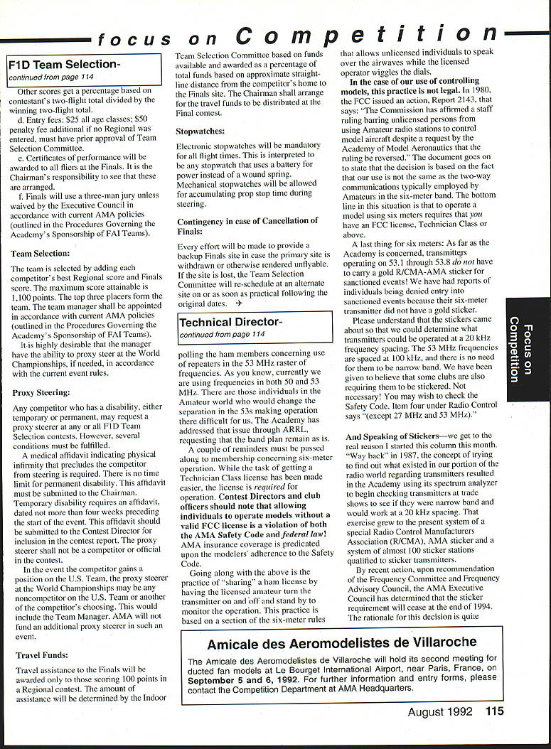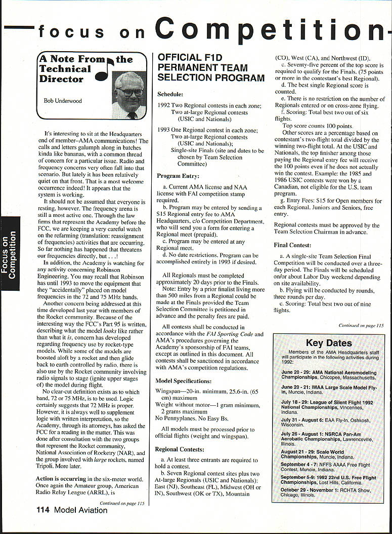Competition NoteFromthe nical Director Bob Underwood Its interesting sit Headquarters end memberAMA communications calls letters galumph along batches kinda like bananas common thread concern particular issue Radio frequency concerns very often fall scenario lately has relatively quiet front welcome occurrence indeed appears system working should assumed everyone resting however frequency arena still active Through law firms represent Academy before FCC keeping very careful watch refarming translation reassignment frequencies activities occurring So far nothing has happened threatens frequencies directly addition Academy watching activity concerning Robinson Engineering may recall Robinson has until 1993 move equipment accidentally placed model frequencies 72 75 MHz bands Another concern being addressed time developed last year members Rocket community Because interesting way FCCs Part 95 written describing what model looks like rather what concern has developed regarding frequency use rocket-type models some models boosted aloft rocket glide back earth controlled radio also use Rocket community involving radio signals stage ignite upper stages model during flight No clear-cut definition exists band 72 75 MHz used Logic certainly suggests 72 MHz proper However always well supplement logic written interpretation Academy through its attorneys has asked FCC reading matter done after consultation two groups represent Rocket community National Association Rocketry NAR group involved large rockets named Tripoli later Action occurring six-meter world Once again Amateur group American Radio Relay League ARRL Continued page 115 114 Model Aviation OFFICIAL Fl D PERMANENT TEAM SELECTION PROGRAM Schedule 1992 Two Regional contests zone Two at-large Regional contests USIC Nationals 1993 One Regional contest zone Two at-large Regional contests USIC Nationals Single-site Finals site dates chosen Team Selection Committee Program Entry Current AMA license NAA license FAI competition stamp required b Program may entered sending $15 Regional entry fee AMA Headquarters Competition Department will send form entering Regional meet prepaid c Program may entered Regional meet d No date restrictions Program can accomplished entirely 1993 desired Regionals must completed approximately 20 days prior Finals Note Entry prior finalist living 500 miles Regional could made Finals provided Team Selection Committee petitioned advance penalty fees paid contests shall conducted accordance FA Sporting Code AMAs procedures governing Academys sponsorship FAI teams except outlined document contests shall sanctioned accordance AMAs competition regulations Model Specifications Wingspan20-in minimum 256-in 65 cm maximum Weight motor 1 gram minimum 2 grams maximum No Pennyplanes No Easy Bs models must processed prior official flights weight wingspan Regional Contests least three entrants required hold contest b Seven Regional contest sites plus two At-large Regionals USIC Nationals East NJ Southeast FL Midwest OH IN Southwest OK TX Mountain CO West CA Northwest ID c Seventy-five percent top score required qualify Finals 75 points contestants best Regional d best single Regional score counted e no restriction number Regionals entered cross-zone flying f Scoring Total best two out six flights Top score counts 100 points Other scores percentage based contestants two-flight total divided winning two-flight total USIC Nationals top finisher among paying Regional entry fee will receive 100 points does actually win contest Example 1985 1986 USIC contests won Canadian eligible US team program g Entry Fees $15 Open members Regional Juniors Seniors free entry Regional contests must approved Team Selection Chairman advance Final Contest single-site Team Selection Final Competition will conducted over threeday period Finals will scheduled on/or about Labor Day weekend depending site availability b Flying will conducted rounds three rounds per day c Scoring Total best two out nine flights Continued page 115 Key Dates Members AMA Headquarters staff will participate following activities during 1992 June 20-29 AMA National Aeromodeling Championships Chicopee Massachusetts June20- 21 IMAA Large Scale Model FlyIn Muncie Indiana July 18 -29 League Silent Flight 1992 National Championships Vincennes indiana July31 August 6 EM Fly-in Oshkosh Wisconsin July28- August 1 NSRCA Pan-Am Aerobafic Championships Lawrenceville Illinois August21 -29 Scale World Championships Muncie Indiana September 4 -7 NFFS AAAA Free Flight Contest Muncie Indiana September 5-9 1992 22nd US Free Flight Championships Lost Hills California October 29- November 1 RCHTA Show Chicago Illinois focus Competition Fl D Team Selectioncontinued page 114 Other scores get percentage based contestant s two-flight total divided winning two-flight total d Entry fees $25 age classes $50 penalty fee additional no Regional entered must have prior approval Team Selection Committee e Certificates performance will awarded fliers Finals Chairmans responsibility see arranged f Finals will use three-man jury unless waived Executive Council accordance current AMA policies outlined Procedures Governing Academys Sponsorship FAI Teams Team Selection team selected adding competitors best Regional score Finals score maximum score attainable 1100 points top three placers form team team manager shall appointed accordance current AMA policies outlined Procedures Governing Academys Sponsorship FAI Teams Itis highly desirable manager have ability proxy steer World Championships needed accordance current event rules Proxy Steering Any competitor has disability either temporary permanent may request proxy steerer FID Team Selection contests However several conditions must fulfilled medical affidavit indicating physical infirmity precludes competitor steering required no time limit permanent disability affidavit must submitted Chairman Temporary disability requires affidavit dated four weeks preceding start event a