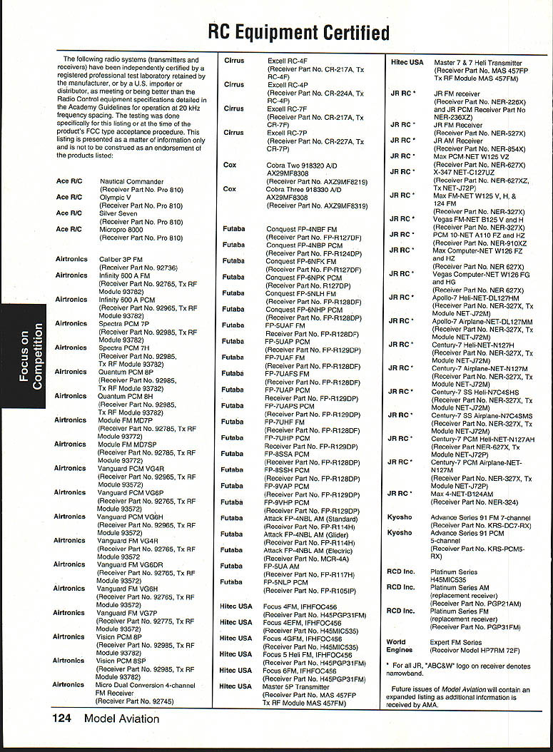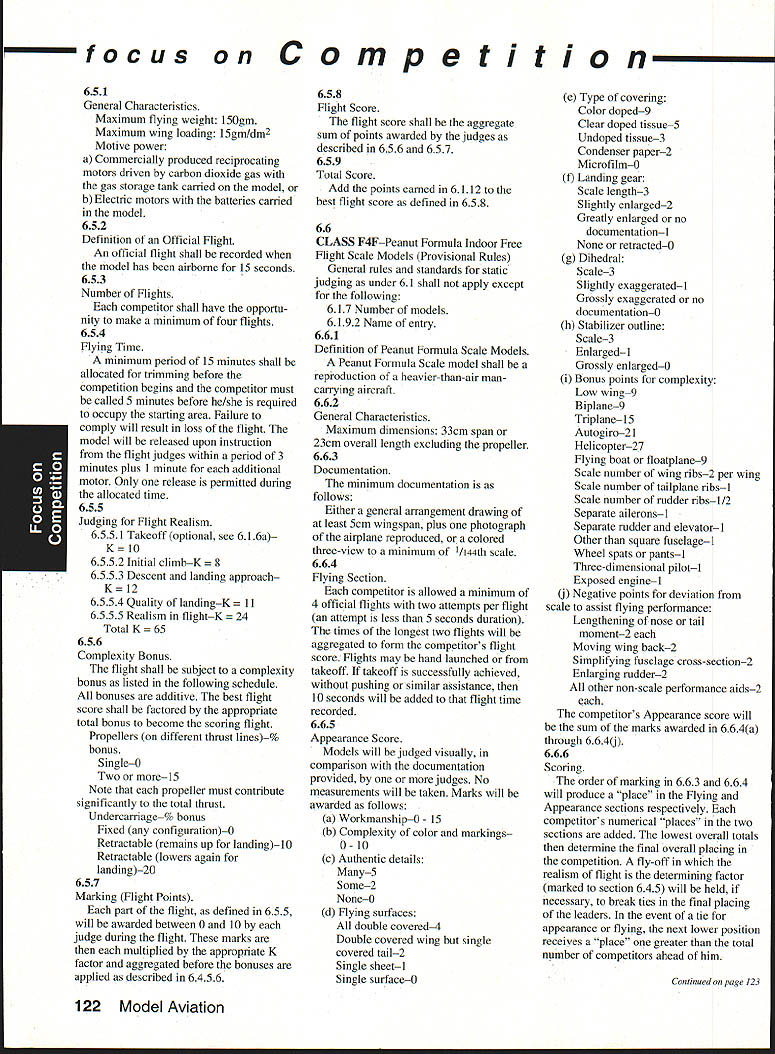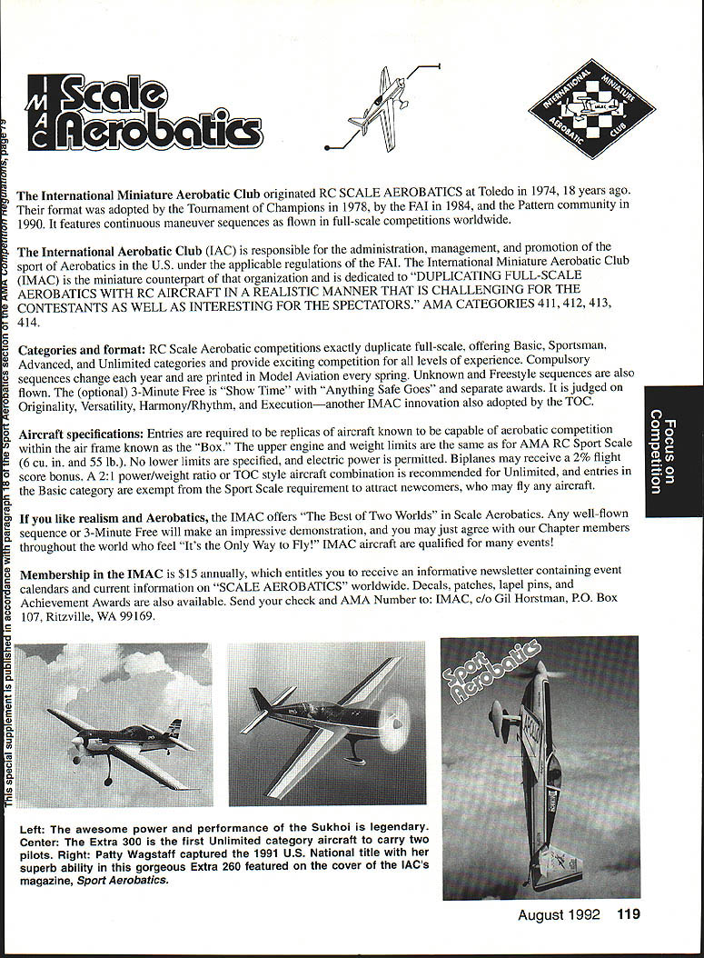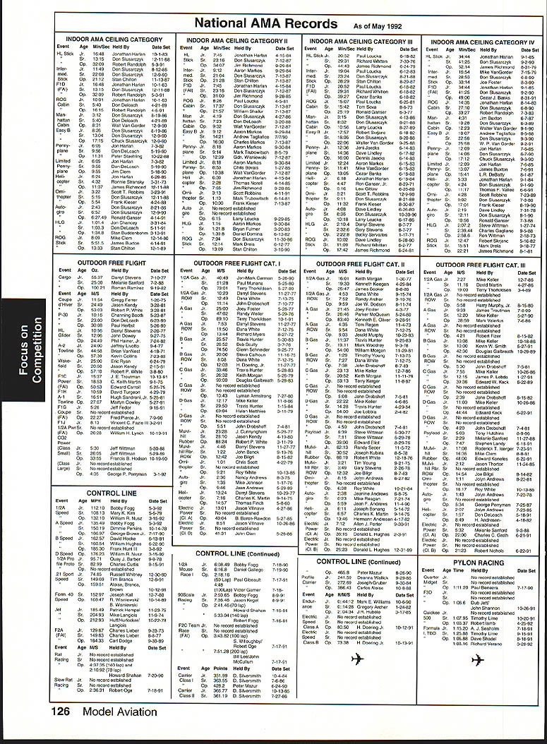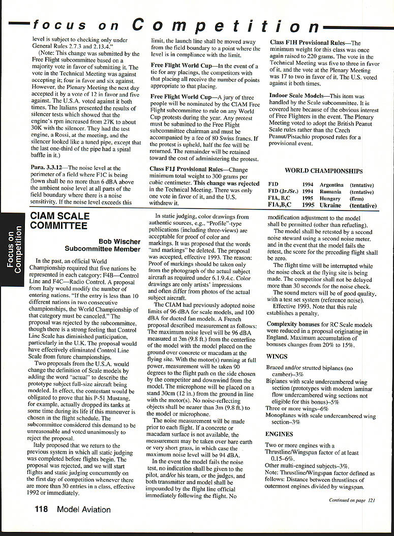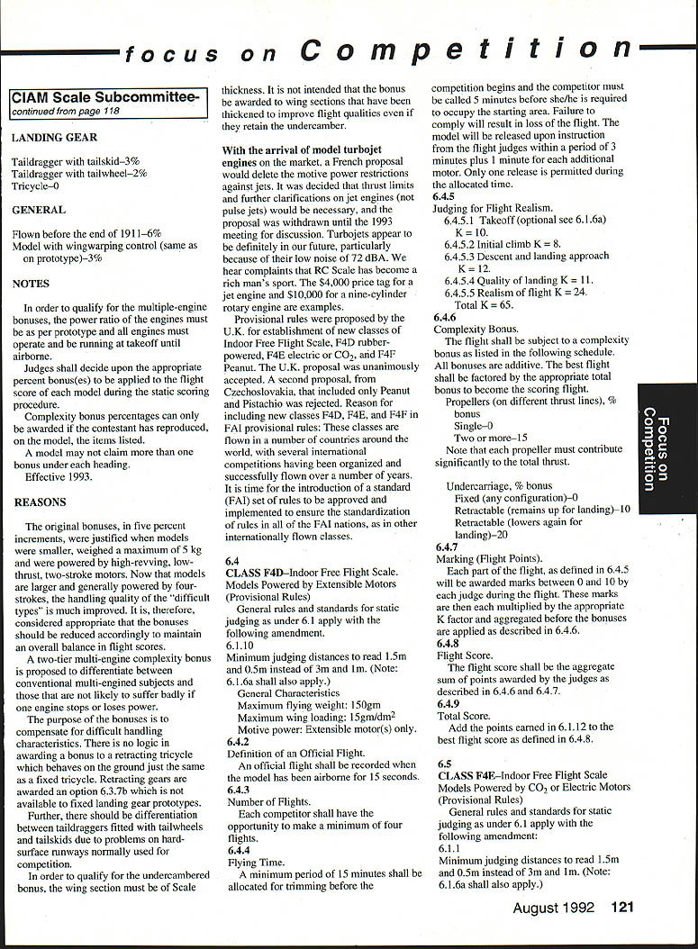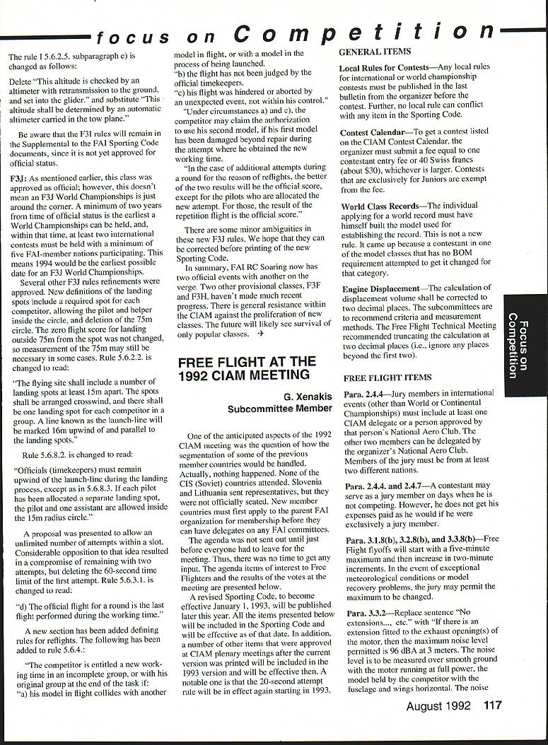 Competition NoteFromthe nical Director Bob Underwood Its interesting sit Headquarters end memberAMA communications calls letters galumph along batches kinda like bananas common thread concern particular issue Radio frequency concerns very often fall scenario lately has relatively quiet front welcome occurrence indeed appears system working should assumed everyone resting however frequency arena still active Through law firms represent Academy before FCC keeping very careful watch refarming translation reassignment frequencies activities occurring So far nothing has happened threatens frequencies directly addition Academy watching activity concerning Robinson Engineering may recall Robinson has until 1993 move equipment accidentally placed model frequencies 72 75 MHz bands Another concern being addressed time developed last year members Rocket community Because interesting way FCCs Part 95 written describing what model looks like rather what concern has developed regarding frequency use rocket-type models some models boosted aloft rocket glide back earth controlled radio also use Rocket community involving radio signals stage ignite upper stages model during flight No clear-cut definition exists band 72 75 MHz used Logic certainly suggests 72 MHz proper However always well supplement logic written interpretation Academy through its attorneys has asked FCC reading matter done after consultation two groups represent Rocket community National Association Rocketry NAR group involved large rockets named Tripoli later Action occurring six-meter world Once again Amateur group American Radio Relay League ARRL Continued page 115 114 Model Aviation OFFICIAL Fl D PERMANENT TEAM SELECTION PROGRAM Schedule 1992 Two Regional contests zone Two at-large Regional contests USIC Nationals 1993 One Regional contest zone Two at-large Regional contests USIC Nationals Single-site Finals site dates chosen Team Selection Committee Program Entry Current AMA license NAA license FAI competition stamp required b Program may entered sending $15 Regional entry fee AMA Headquarters Competition Department will send form entering Regional meet prepaid c Program may entered Regional meet d No date restrictions Program can accomplished entirely 1993 desired Regionals must completed approximately 20 days prior Finals Note Entry prior finalist living 500 miles Regional could made Finals provided Team Selection Committee petitioned advance penalty fees paid contests shall conducted accordance FA Sporting Code AMAs procedures governing Academys sponsorship FAI teams except outlined document contests shall sanctioned accordance AMAs competition regulations Model Specifications Wingspan20-in minimum 256-in 65 cm maximum Weight motor 1 gram minimum 2 grams maximum No Pennyplanes No Easy Bs models must processed prior official flights weight wingspan Regional Contests least three entrants required hold contest b Seven Regional contest sites plus two At-large Regionals USIC Nationals East NJ Southeast FL Midwest OH IN Southwest OK TX Mountain CO West CA Northwest ID c Seventy-five percent top score required qualify Finals 75 points contestants best Regional d best single Regional score counted e no restriction number Regionals entered cross-zone flying f Scoring Total best two out six flights Top score counts 100 points Other scores percentage based contestants two-flight total divided winning two-flight total USIC Nationals top finisher among paying Regional entry fee will receive 100 points does actually win contest Example 1985 1986 USIC contests won Canadian eligible US team program g Entry Fees $15 Open members Regional Juniors Seniors free entry Regional contests must approved Team Selection Chairman advance Final Contest single-site Team Selection Final Competition will conducted over threeday period Finals will scheduled on/or about Labor Day weekend depending site availability b Flying will conducted rounds three rounds per day c Scoring Total best two out nine flights Continued page 115 Key Dates Members AMA Headquarters staff will participate following activities during 1992 June 20-29 AMA National Aeromodeling Championships Chicopee Massachusetts June20- 21 IMAA Large Scale Model FlyIn Muncie Indiana July 18 -29 League Silent Flight 1992 National Championships Vincennes indiana July31 August 6 EM Fly-in Oshkosh Wisconsin July28- August 1 NSRCA Pan-Am Aerobafic Championships Lawrenceville Illinois August21 -29 Scale World Championships Muncie Indiana September 4 -7 NFFS AAAA Free Flight Contest Muncie Indiana September 5-9 1992 22nd US Free Flight Championships Lost Hills California October 29- November 1 RCHTA Show Chicago Illinois focus Competition Fl D Team Selectioncontinued page 114 Other scores get percentage based contestant s two-flight total divided winning two-flight total d Entry fees $25 age classes $50 penalty fee additional no Regional entered must have prior approval Team Selection Committee e Certificates performance will awarded fliers Finals Chairmans responsibility see arranged f Finals will use three-man jury unless waived Executive Council accordance current AMA policies outlined Procedures Governing Academys Sponsorship FAI Teams Team Selection team selected adding competitors best Regional score Finals score maximum score attainable 1100 points top three placers form team team manager shall appointed accordance current AMA policies outlined Procedures Governing Academys Sponsorship FAI Teams Itis highly desirable manager have ability proxy steer World Championships needed accordance current event rules Proxy Steering Any competitor has disability either temporary permanent may request proxy steerer FID Team Selection contests However several conditions must fulfilled medical affidavit indicating physical infirmity precludes competitor steering required no time limit permanent disability affidavit must submitted Chairman Temporary disability requires affidavit dated four weeks preceding start event a