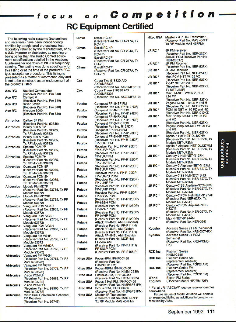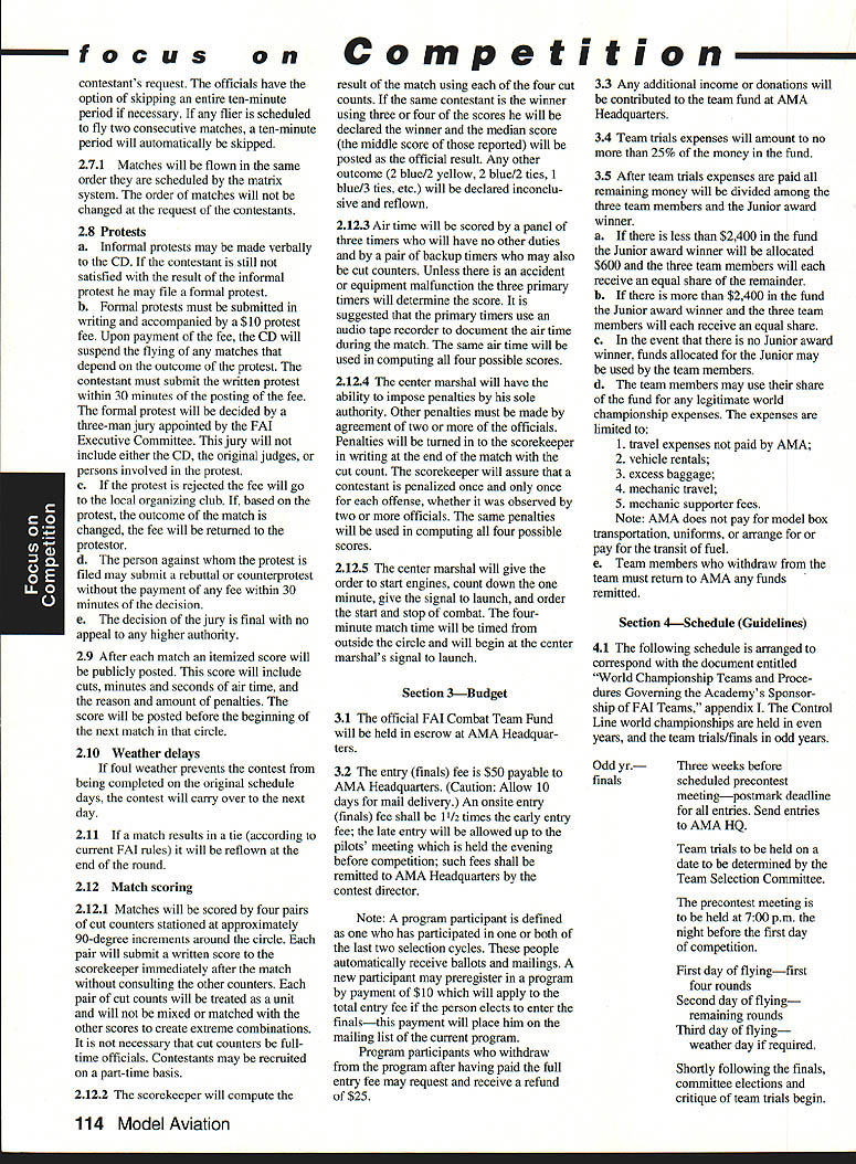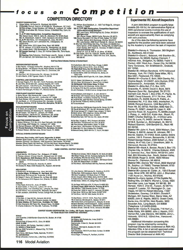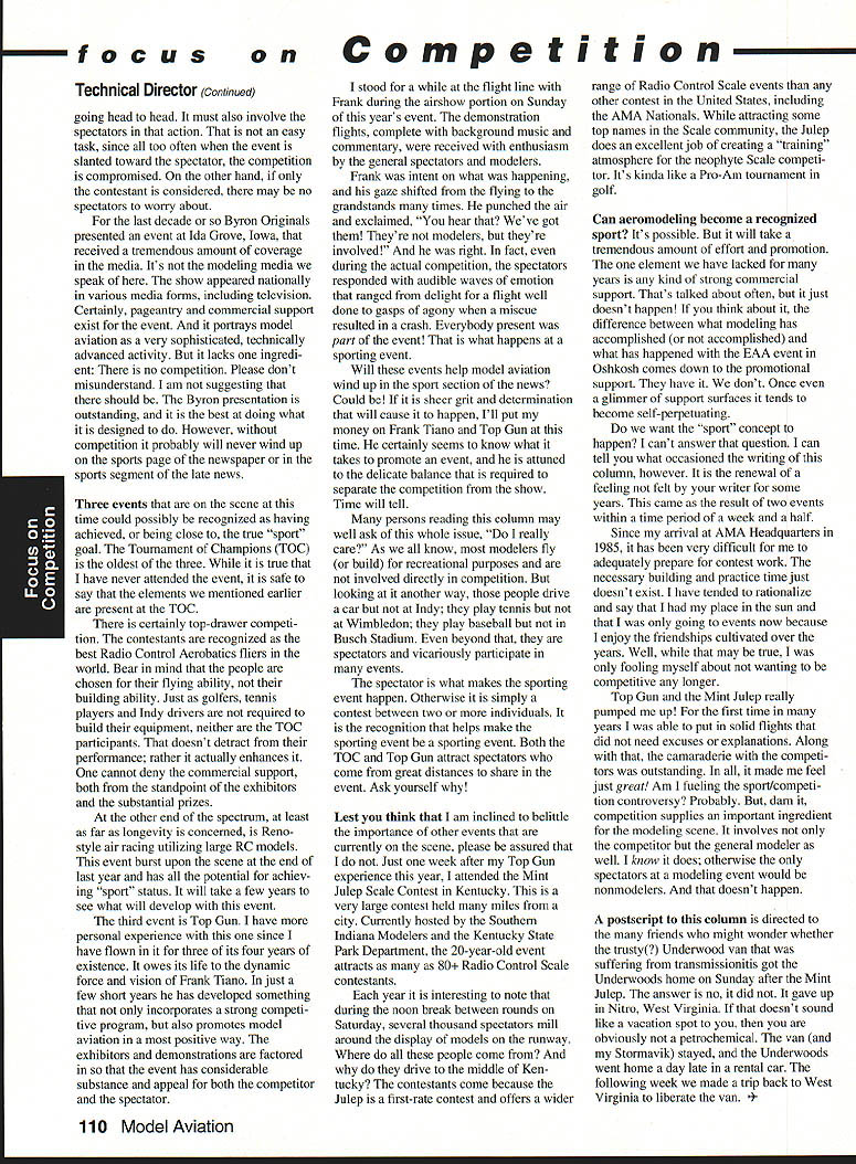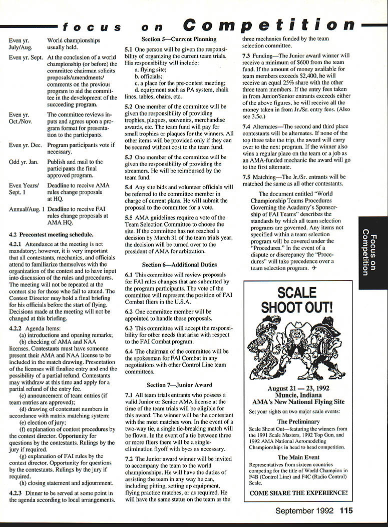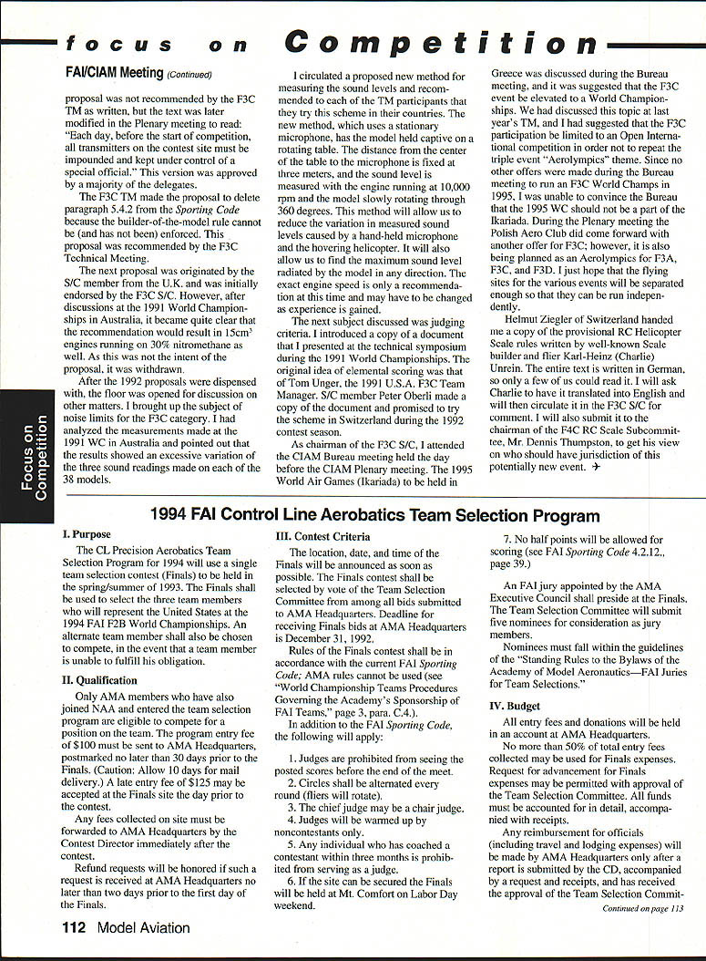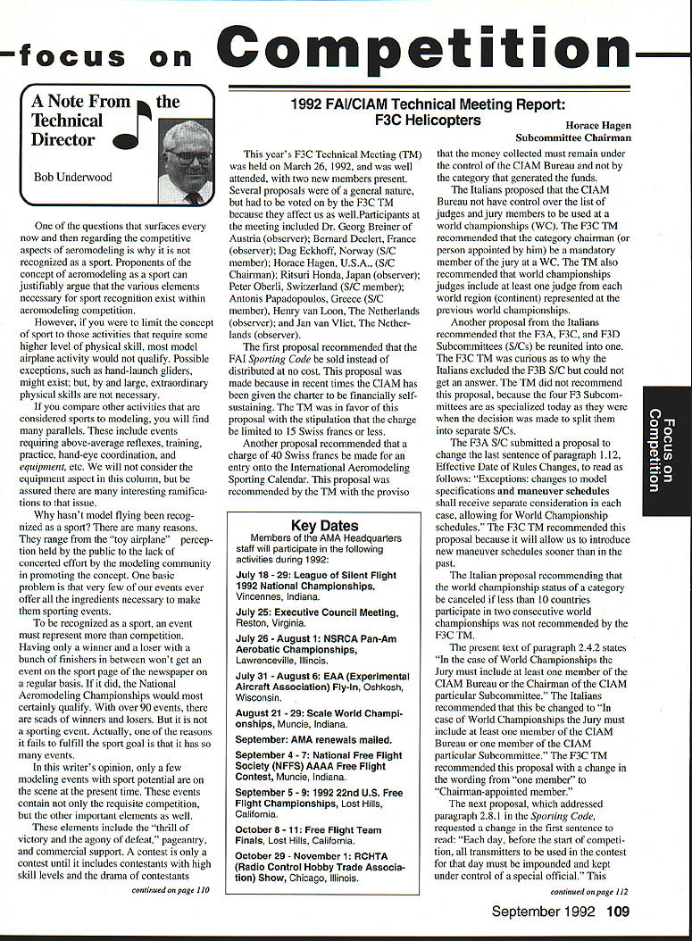 focus Competition ANoteFromthe nical Director Bob Underwood questions surfaces now regarding competitive aspects aeromodeling recognized sport Proponents concept aeromodeling sport can justifiably argue various elements necessary sport recognition exist within aeromodeling competition However limit concept sport activities require some higher level physical skill model airplane activity would qualify Possible exceptions such hand-launch gliders might exist large extraordinary physical skills necessary compare other activities considered sports modeling will find parallels include events requiring above-average reflexes training practice hand-eye coordination equipment etc will consider equipment aspect column assured interesting ramifica tions issue hasnt model flying recog nized sport reasons range toy airplane percep tion held public lack concerted effort modeling community promoting concept basic problem very few events ever offer ingredients necessary make sporting events recognized sport event must represent competition Having winner loser bunch finishers between wont get event sport page newspaper regular basis did National Aeromodeling Championships would certainly qualify over 90 events scads winners losers sporting event Actually reasons fails fulfill sport goal has events writers opinion few modeling events sport potential scene present time events contain requisite competition other important elements well elements include thrill victory agony defeat pageantry commercial support contest contest until includes contestants high skill levels drama contestants continued page 110 years F3C Technicai Meeting TM held March 26 1992 well attended two new members present Several proposais general nature voted F3C TM because affect us wellParticipants meeting included Dr Georg Breiner Austria observer Bernard Declert France observer Dag Eckhoff Norway S/C member Horace Hagen USA S/C Chairman Ritsuri Honda Japan observer Peter Oberli Switzerland S/C member Antonis Papadopoulos Greece S/C member Henry van Loon Netherlands observer Jan van Vliet Nether lands observer first proposal recommended FAJ Sporting Code sold instead distributed no cost proposal made because recent times ClAM has given charter financially selfsustaining TM favor proposal stipulation charge limited 15 Swiss francs less Another proposal recommended charge 40 Swiss francs made entry onto International Aeromodeling Sporting Calendar proposal recommended TM proviso Horace Hagen Subcommittee Chairman money collected must remain under control ClAM Bureau category generated funds Italians proposed ClAM Bureau have control over list judges jury members used world championships WC F3C TM recommended category chairman person appointed him mandatory member jury WC TM also recommended world championships judges include least judge world region continent represented previous world championships Another proposal Italians recommended F3A F3C F3D Subcommittees S/Cs reunited F3C TM curious Italians excluded F3B S/C could get answer TM did recommend proposal because four F3 Subcom mittees specialized today decision made split separate S/Cs F3A S/C submitted proposal change last sentence paragraph 112 Effective Date Rules Changes read follows Exceptions changes model specifications maneuver schedules shall receive separate consideration case allowing World Championship schedules F3C TM recommended proposal because will allow us introduce new maneuver schedules sooner past Italian proposal recommending world championship status category canceled less 10 countries participate two consecutive world championships recommended F3C TM present text paragraph 242 states case World Championships Jury must include least member ClAM Bureau Chairman ClAM particular Subcommittee Italians recommended changed case World Championships Jury must include least member ClAM Bureau member ClAM particular Subcommittee F3C TM recommended proposal change wording member Chairman-appointed member next proposal addressed paragraph 281 Sporting Code requested change first sentence read day before start competi tion transmitters used contest day must impounded kept under control special official continued page 112 September 1992 109 1992 FAI/CIAM Technical Meeting Report F3C Helicopters Key Dates Members AMA Headquarters staff will participate following activities during 1992 July 18 29 League Silent Flight 1992 National Championships Vincennes Indiana July 25 Executive Council Meeting Reston Virginia July 26 August 1 NSRCA Pan-Am Aerobatic Championships Lawrenceville Illinois July 31 August 6 EAA Experimental Aircraft Association Fly-In Oshkosh Wisconsin August 21 29 Scale World Champi onships Muncie Indiana September AMA renewals mailed September 4- 7 National Free Flight Society NFFS AAAA Free Flight Contest Muncie Indiana September 5 -91992 22nd US Free Flight Championships Lost Hills California October 8- 11 Free Flight Team Finals Lost Hills California October 29 November 1 RCHTA Radio Control Hobby Trade Associa tion Show Chicago Illinois focus Competition Technical Director Continued going head head must also involve spectators action easy task since too often event slanted toward spectator competition compromised other hand contestant considered may no spectators worry about last decade Byron Originals presented event Ida Grove Iowa received tremendous amount coverage media Its modeling media speak show appeared nationally various media forms including television Certainly pageantry commercial support exist event portrays model aviation very sophisticated technically advanced activity lacks ingredi ent no competition Please dont misunderstand am suggesting should Byron presentation outstanding best doing what designed However competition probably will never wind up sports page newspaper sports segment late news Three events scene time could possibly recognized having achieved being close true sport goal Tournament Champions TOC oldest three true have never 