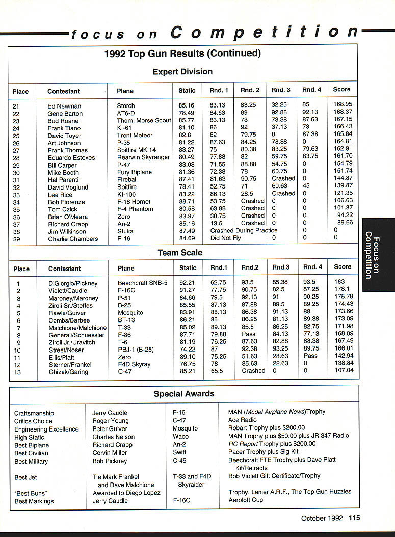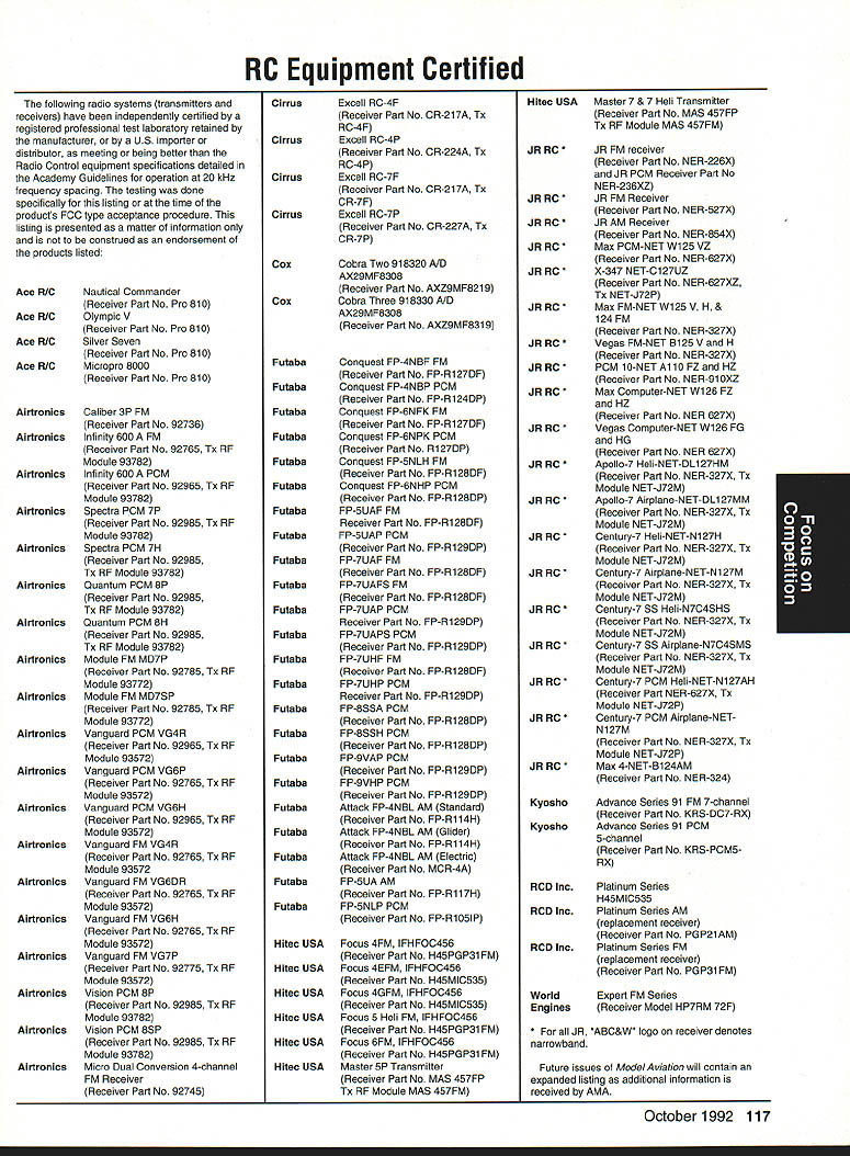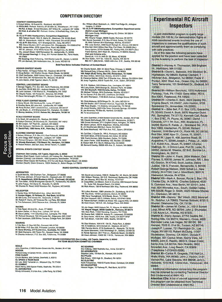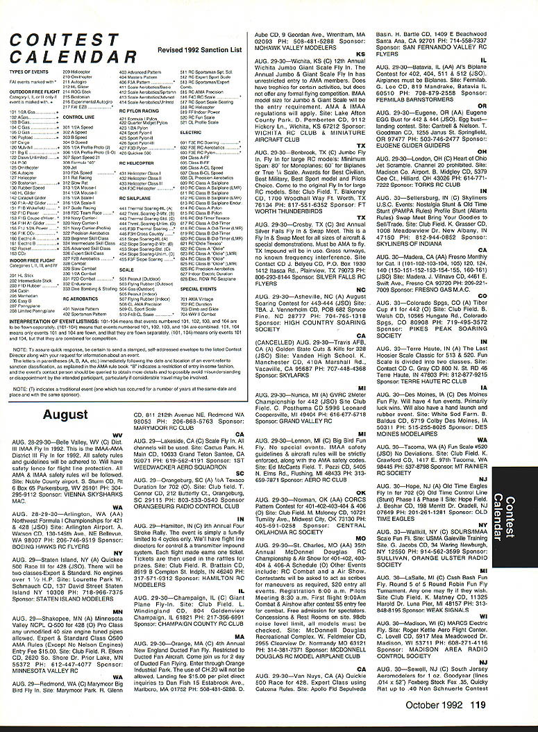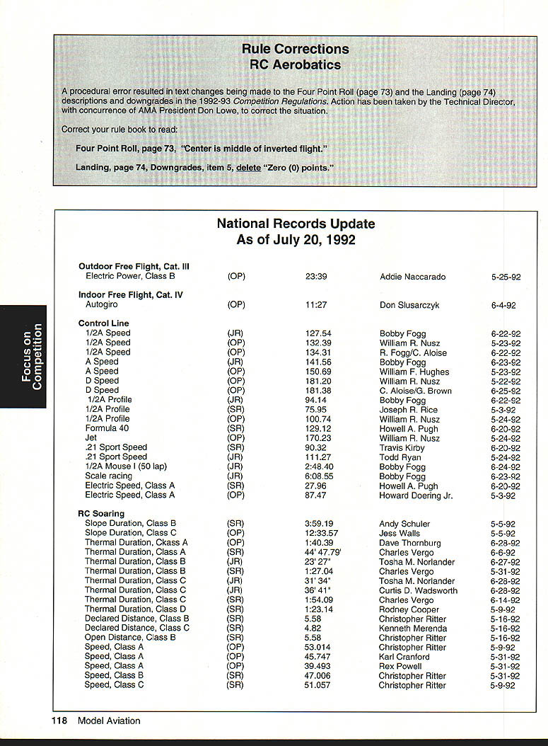 Competition Note Technical Director Bob Underwood Tis time speak provide observation two generally cover several topics Muncie Grand OpeningMethinks issue Model Aviation will filled information subject however seems appropriate spend little time talking about actual flying took place L-shaped runway set up could fly Control Line portion RC used other seemed work out well number people flew during weekend quite high Friday designated official event day however individuals took advantage excellent runway tested air RC simply gave set pins let have listed official flying time 9 am 6 pm Saturday figured flying would start before site seven officially started 8 am reality models air 630 am used six RC flight lines manned least four directors decked out brightly colored jackets easy identification instructions simple Keep line moving stay calm lend hand needed stay alert What great job did name helped included Jay Mealy Dave Ellis Mike Barbee Joe Vislay Bob Sims Bud Gorman Gary Bussell Incidentally names can found under picture district vice president month Model Aviation because associate vice presidents several districts Saturday alone some 366 flights recorded between 8 am 6 pm six lines should noted model bit dust during time went because elevator flutter subsequent failure Oh few other little repair jobs based lean engine run dumping model field beyond runway something like little cross-control landing resultant cartwheel nothing serious beyond crash brand model age radio gear can imagine flown during three days course transmitters gold stickered however no other formal checks radio equipment made very knowledgeable George Steiner ran impound six flight stations placed about 12 feet apart suspect now can guess what leading up Yep am pleased report during weekend no cries aint got uttered Everybody just flew enjoyed themselves little IM imtermodulation 21M 31M varieties monsters stayed home flew two over-55-pound models during Saturday session B-17 belonging Don Albright B-24 Ron Goodrich beautifully prepared executed models crews assembled handle did good job well made great presentation Another significant flight performed Don Lowe flying Erich Dems model Constellation quite 55 pounds very large model very notable feature quiet engines because Erichs specially designed mufflers also mixed fly-by-video model during weekend Bob Sims managed show us Helicopters can about anything want toas well some things nobody believed would Personally very impressed quality flying few people little trouble because used flying off grass Therefore models too sensitive rudder nosewbeel smooth runway Muncie As result few takeoffs looked little like rattlesnake heat fantastic turuout models fliers point Saturday Bob Sims working flight line paused surveyed assembled masses related Theres fantastic energy right was huge gaggle modelers having fun local flying field Isnt what about Oh yes very big mistake occurred event given wireless mike allowed roam flight line environs speaking fliers spectators alike downside switch mike receiver under someone elses control very shortly thereafter came Nationai Aeromodeling Championships spite Mother Natures attempts destroy several times event came off well overall really big problem Nationals trying fly different events site relatively brief time frame year flew over 90 events unable include some other 161 rule book events desired other competitors Event selection presentation available time frame really knotty problem Another factor makes putting Nationals somewhat difficult fact exists tradition traveling circus limited amounts time personnel available set up event added October1992 113 Key Dates August 21 29 Scale World Championships Muncie Indiana September Membership Renewal.1 993 Renewal Membership Notices Mail September 4- 7 NFFS AAAA Free Flight Contest Muncie Indiana September 5 -91992 22nd US Free Flight Championships Lost Hills California October 8- 11 Free Flight Finals Lost Hills California October 29- November 1 RCHTA Radio Control Hobby Trade Association Show Chicago Illinois November 15 Deadline Officer Election Ballot Return focus Competition constraints imposed owners site create problems Sometimes further aggravated sudden capricious changes imposed site owners last minuteor during event year nesting endangered bird two almost blew away whole section Nationals since some grass areas could cut year take AMA booth Oshkosh EAA event look great envy setup pieces can place well before event Equipment stored spot will used Markings barrier lines logistical setups can almost permanent fixtures really helps cut down drain manpower Whoops need addressed very last minute element necessary make Nationals work well-developed communication system have members suggested people carry radios get jollies out being able talk week Taint really isnt way could get Nationals work didnt have communication link has developed year talents Al Guerrini George Steiner combined create single department Al came known Radio Al George FM George Along way Ron Hesselbrock factored equation test equipment Ron works Motorola things worked absolutely swimmingly Ron fact saved us bunch money replacement batteries needed number hours turned three unreal September 1st upon us harbor fiendish fascination rule making will recognize date postmark deadline submission rules change proposals 1994-95 Competition Regulations Some proposals have trickled far remains seen whether flood will develop crystal ball suggests year RC Racing may feature rather large number proposals hope wont begin rival over 100 submitted Scale category last cycle event Q-500 will probably result lions share Racing problem develops event focus duplicate-type proposals surface have sorted out similar changes dont make final vote also seems safe predict Scale will again have large number Soaring will have very few would appear isnt just event its rules produce changes psychological approach competition taken participants wel