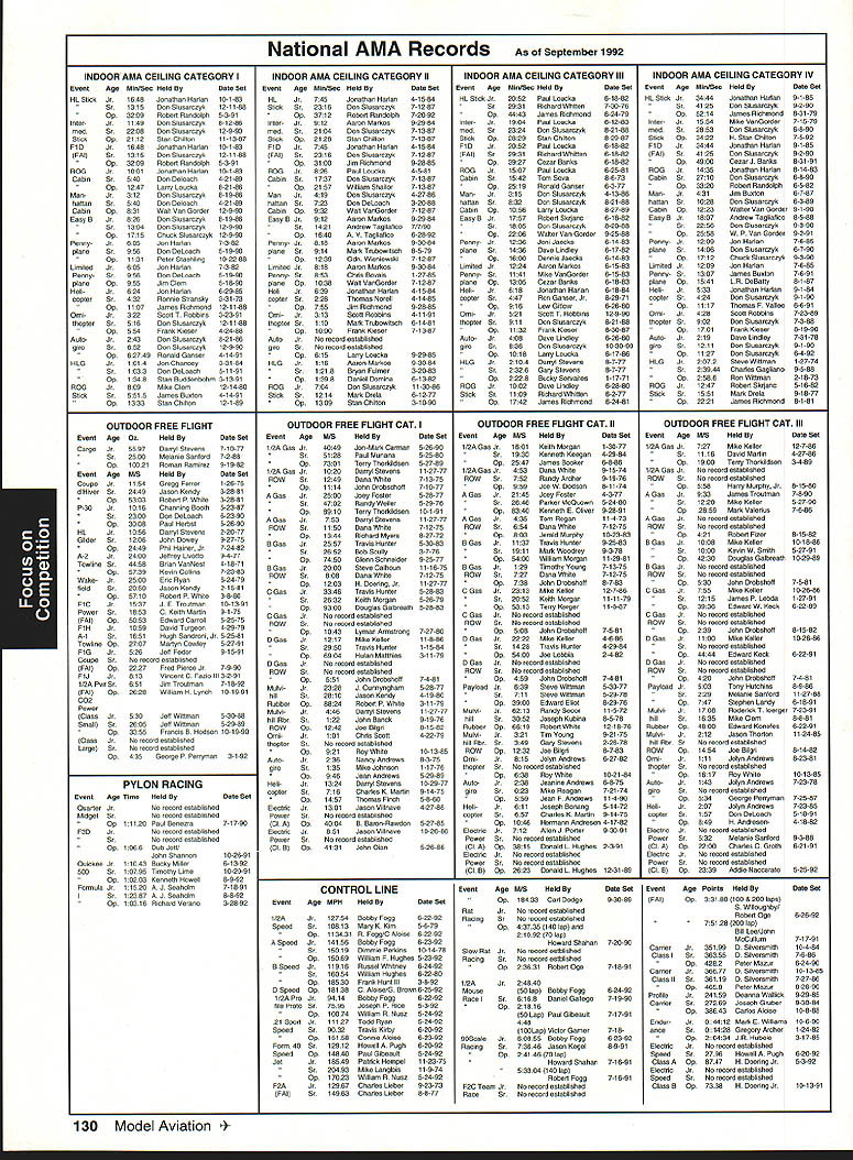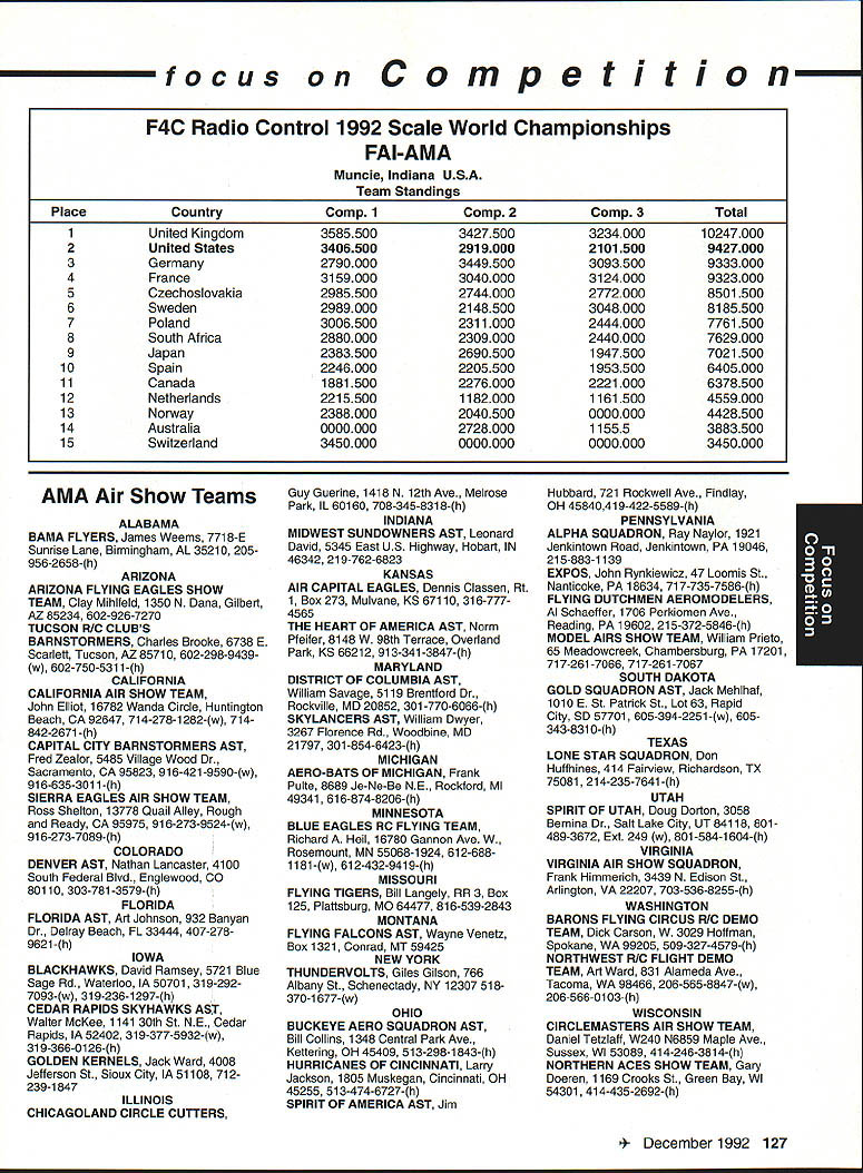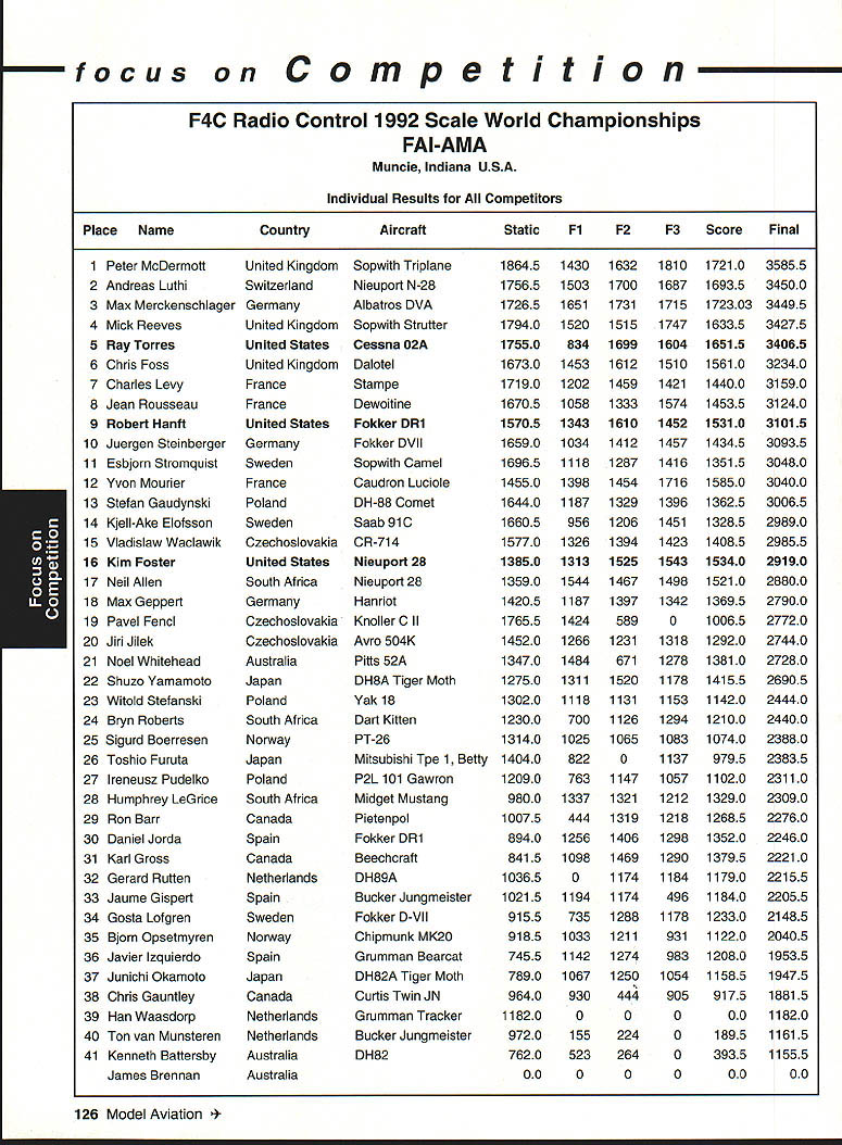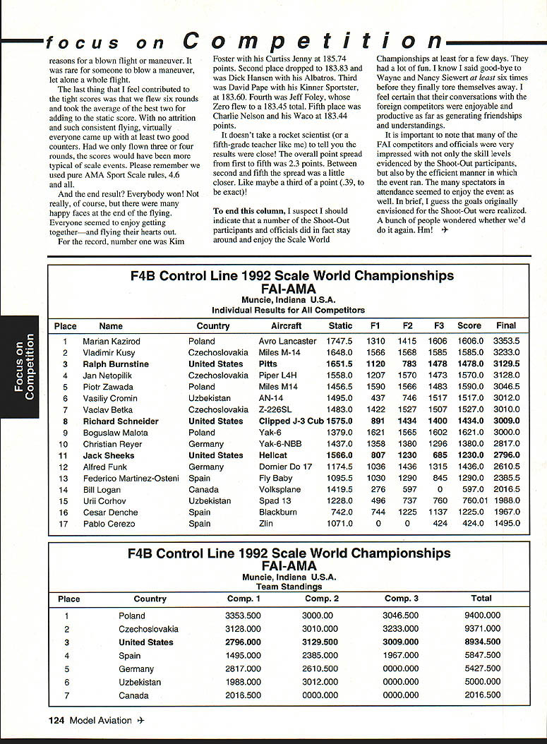 focus Competition Note Technical Director Bob Underwood months ago after learning would Contest Director Scale World Championships thought long hard about might bring members United States scale modeling community together world group Having competitor both venues realized various perceptions exist create misunderstandings between two order generate better realization both sides scale world proposed Academy run pre-event idea suggested Scale Shoot-Out Actually three basic goals mind proposing event First felt might show United States scalers FAI event mysterious convoluted thing feel hoped modelers US would learn model built seven kilos can reasonable size fly well modelers exhibiting high skill levels Granted some aspects FAI scale program may hard swallow such weight limit flight bonus large little difference between FAI present Top Gun Scalemasters event second goal mind centered around showing FAI scale community first-class scale contest can run much less time currently devoted F4C F4B events Presently full week required accommodate 40 50 competitors static judging three rounds flying third reason Shoot-Out provide activity would attract spectators end Shoot-Out provided beautiful draw hustle bustle FAI model setup led us directly colorful opening ceremony World Championships concept Shoot-Out presented Top Gun Scalemasters management see problem idea given blessing two groups winners both events invited attend addition extended invitations winners AMA Nationals thus able obtain first-class list competitors hoped able include 20-25 competitors event would meaningful comfortable time frame available reality wound up list 17 competitors missed higher number because individuals won two three events five people wished come found themselves planeless because mishaps So what result two days static judged models flew six rounds 102 possible flights actually flew 100 two flights did have record zero instance mechanical problem occurred crash fact nothing close crash occurred Someone did break prop life dont know Granted wind right down runway light both days personally cannot recall event error free Another thing made event such downright joy complete lack officialness contestants very contest oriented felt wasnt necessary lead anybody hy handand werent meet literally ran itself used two flight lines two judges first two rounds flying three judges last four rounds Static judging employed three-table technique judge three judging categories started static about 830 am flying afternoon judges organized site Darlene Frederick included husband Wayne Vein Altamarino Don Lowe John Guenther Bert Dugan Hank Cavasso line director Ron Hesselbrock George Steiner took care transmitter impound Brenda Wren Headquarters two daughters Anne Cathy handled tabulation scores ask short really tight first blush might appear scoresboth static flyingwere artificially compressed am certain would subscribe concept after looking over scores considering number rounds flown case static scores should remembered contestants best three major events exist country Actually might make four since winner Canadian Nationals present well no poorly built poorly documented models addition excellent site favorable wind weather conditions made impossible come up mber 1992 123 Key Dates 1993 Renewal Membership Notices Mail October 22 Las Vegas NV Annual AMA Membership Meeting Tournament Champions October29- November 1 RCHTA Show Radio Control Hobby Trade Association Chicago Illinois November 13 Deadline Officer Election Ballot Return November14 Executive Council Meeting Reston Virginia January 8-10 IMS Show Pasadena California January 30-31 Northwest RC Model Exposition Puyallup Washington February 131993 Executive Council Meeting Reston Virginia Scale Shoot-Out Place NameScore Plane 1Kim Foster18574Curtiss Jenny 2Dick Hansen18383Albatros 3David Pape18360Kinner Sportster 4Jeff Foley18345Zero A6M3 5Chuck Nelson18344Waco UKS 7F 6Terry Nitsch18327F-86 Sabre 7Bruce Tharpe18233Spacewalker 8Bob Wischer17952Piper Pacer 9Wayne Siewert17945Porsche Mooney 10David Hayes17935Rockwell Thrush Commander 11lrv Sean17894Ryan STA Special 12Gerald Mong17777Globe Swift 13Nick Tusa17659Fokker D-VII 14Earl Thompson17652Wirraway 15Hal Parenti17603Piper Twin Comanche 16George Buso17452Nieuport28 17Henry Mausolf17234Sukhoi 5U26M focus reasons blown flight maneuver rare someone blow maneuver let alone whole flight last thing feel contributed tight scores flew six rounds took average best two adding static score no attrition such consistent flying virtually everyone came up least two good counters flown three four rounds scores would have typical scale events Please remember used pure AMA Sport Scale rules 46 end result Everybody won really course happy faces end flying Everyone seemed enjoy getting togetherand flying hearts out record number Kim Competition Foster Curtiss Jenny 18574 points Second place dropped 18383 Dick Hansen Albatros Third David Pape Kinner Sportster 18360 Fourth Jeff Foley Zero flew 18345 total Fifth place Charlie Nelson Waco 18344 points doesnt take rocket scientist fifth-grade teacher like tell results close overall point spread first fifth 23 points Between second fifth spread little closer Like maybe third point 39 exact end column suspect should indicate number Shoot-Out participants officials did fact stay around enjoy Scale World Championships least few days lot fun know said good-bye Wayne Nancy Siewert least six times before finally tore themselves away feel certain conversations foreign competitors enjoyable productive far generating friendships understandings important note FAI competitors officials very impressed skill levels evidenced Shoot-Out participants also efficient manner event ran spectators attendance seemed enjoy event well brief guess goals originally envisioned Shoot-Out realized bunch people wondered whether wed again Hm Control Line 1992 Scale World Championships FAI-AMA Muncie Indiana USA Individual Results Co