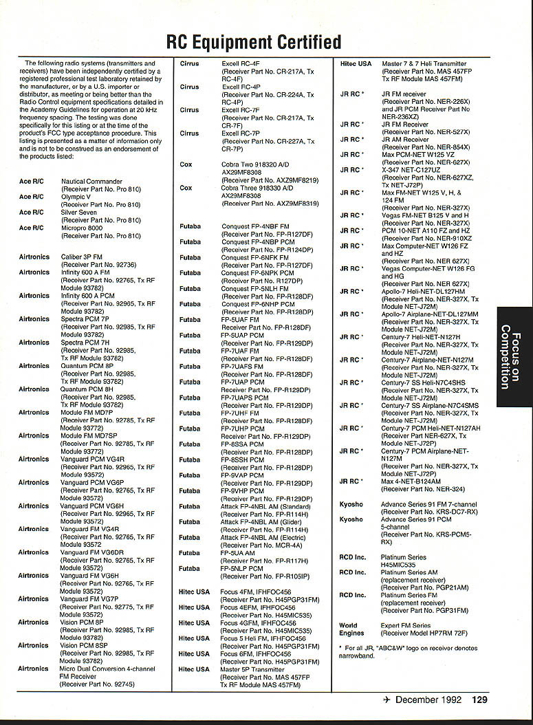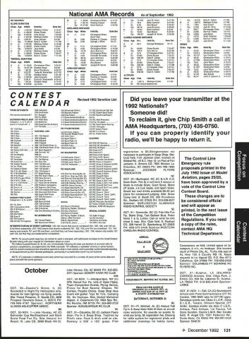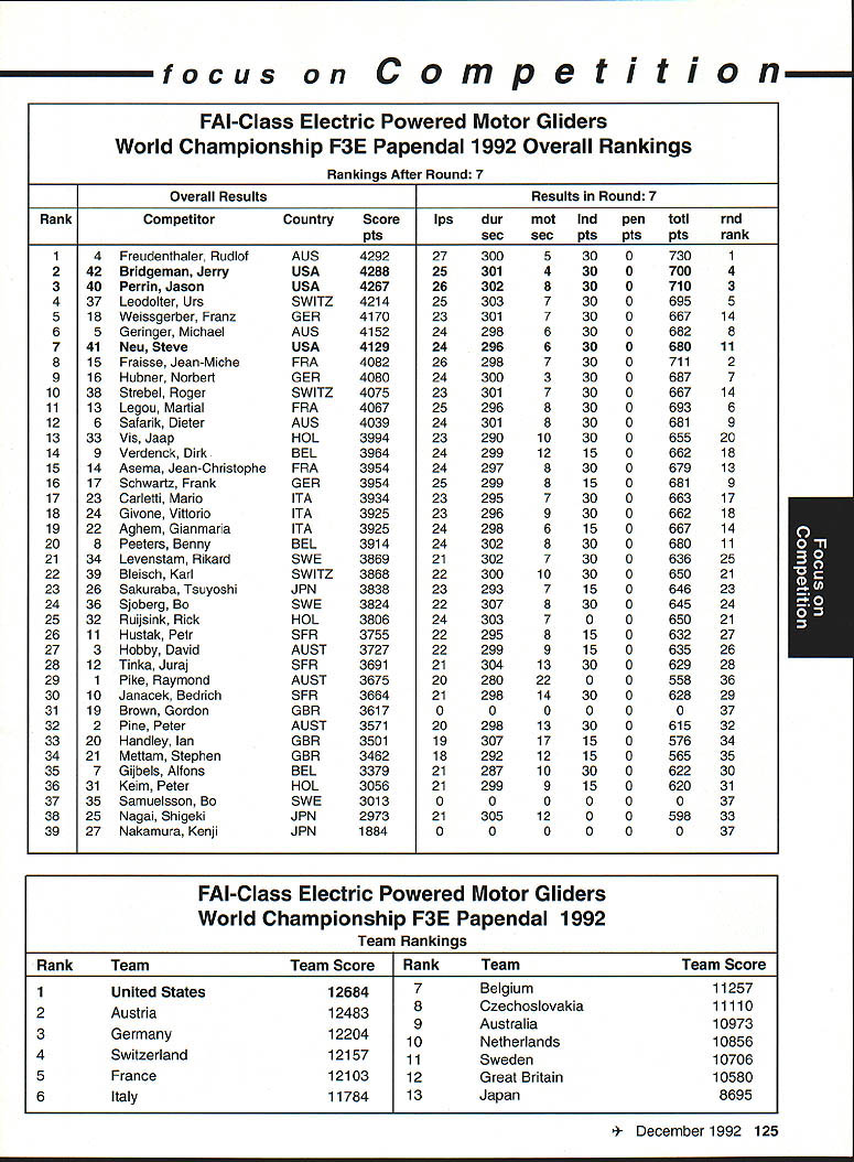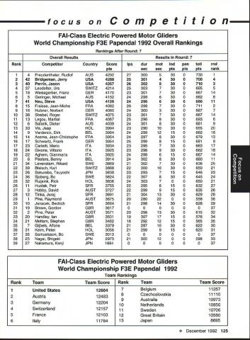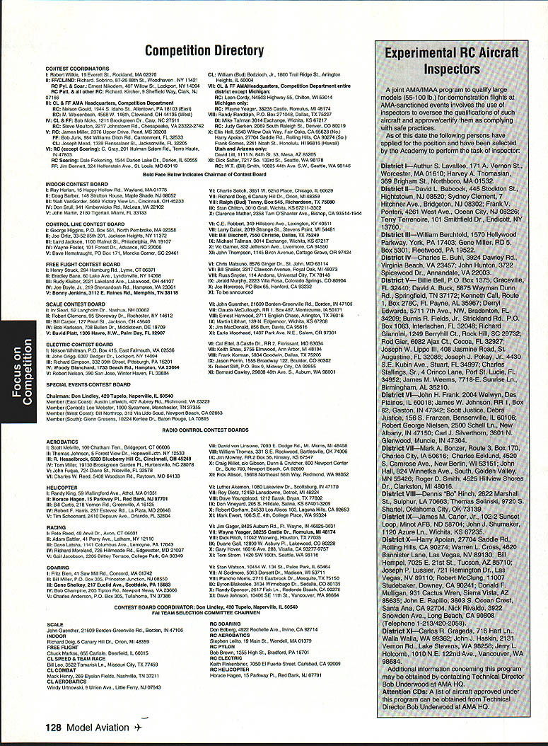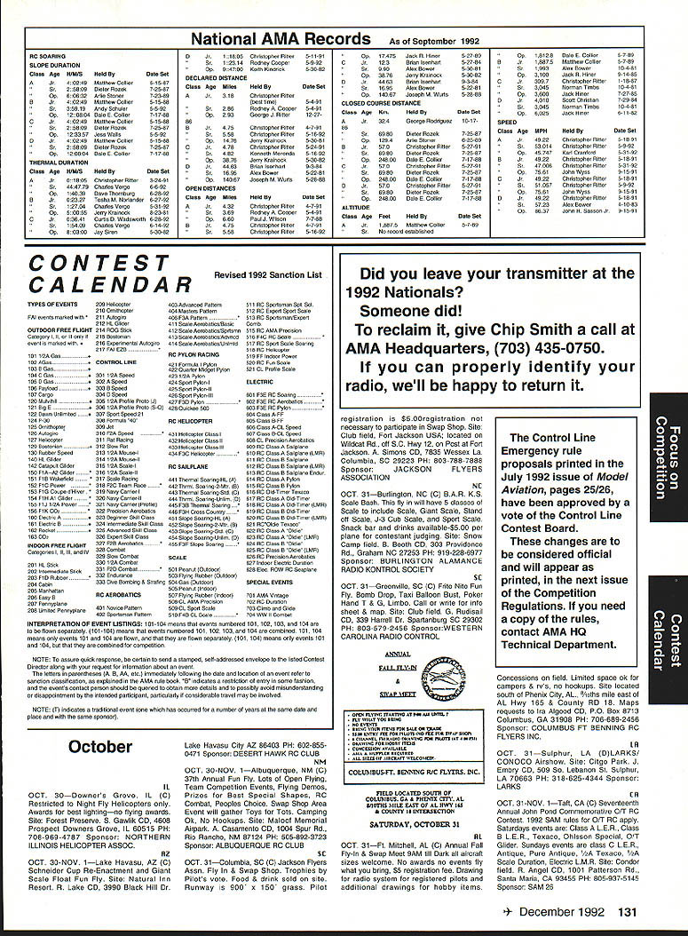 focus Competition Note Technical Director Bob Underwood months ago after learning would Contest Director Scale World Championships thought long hard about might bring members United States scale modeling community together world group Having competitor both venues realized various perceptions exist create misunderstandings between two order generate better realization both sides scale world proposed Academy run pre-event idea suggested Scale Shoot-Out Actually three basic goals mind proposing event First felt might show United States scalers FAI event mysterious convoluted thing feel hoped modelers US would learn model built seven kilos can reasonable size fly well modelers exhibiting high skill levels Granted some aspects FAI scale program may hard swallow such weight limit flight bonus large little difference between FAI present Top Gun Scalemasters event second goal mind centered around showing FAI scale community first-class scale contest can run much less time currently devoted F4C F4B events Presently full week required accommodate 40 50 competitors static judging three rounds flying third reason Shoot-Out provide activity would attract spectators end Shoot-Out provided beautiful draw hustle bustle FAI model setup led us directly colorful opening ceremony World Championships concept Shoot-Out presented Top Gun Scalemasters management see problem idea given blessing two groups winners both events invited attend addition extended invitations winners AMA Nationals thus able obtain first-class list competitors hoped able include 20-25 competitors event would meaningful comfortable time frame available reality wound up list 17 competitors missed higher number because individuals won two three events five people wished come found themselves planeless because mishaps So what result two days static judged models flew six rounds 102 possible flights actually flew 100 two flights did have record zero instance mechanical problem occurred crash fact nothing close crash occurred Someone did break prop life dont know Granted wind right down runway light both days personally cannot recall event error free Another thing made event such downright joy complete lack officialness contestants very contest oriented felt wasnt necessary lead anybody hy handand werent meet literally ran itself used two flight lines two judges first two rounds flying three judges last four rounds Static judging employed three-table technique judge three judging categories started static about 830 am flying afternoon judges organized site Darlene Frederick included husband Wayne Vein Altamarino Don Lowe John Guenther Bert Dugan Hank Cavasso line director Ron Hesselbrock George Steiner took care transmitter impound Brenda Wren Headquarters two daughters Anne Cathy handled tabulation scores ask short really tight first blush might appear scoresboth static flyingwere artificially compressed am certain would subscribe concept after looking over scores considering number rounds flown case static scores should remembered contestants best three major events exist country Actually might make four since winner Canadian Nationals present well no poorly built poorly documented models addition excellent site favorable wind weather conditions made impossible come up mber 1992 123 Key Dates 1993 Renewal Membership Notices Mail October 22 Las Vegas NV Annual AMA Membership Meeting Tournament Champions October29- November 1 RCHTA Show Radio Control Hobby Trade Association Chicago Illinois November 13 Deadline Officer Election Ballot Return November14 Executive Council Meeting Reston Virginia January 8-10 IMS Show Pasadena California January 30-31 Northwest RC Model Exposition Puyallup Washington February 131993 Executive Council Meeting Reston Virginia Scale Shoot-Out Place NameScore Plane 1Kim Foster18574Curtiss Jenny 2Dick Hansen18383Albatros 3David Pape18360Kinner Sportster 4Jeff Foley18345Zero A6M3 5Chuck Nelson18344Waco UKS 7F 6Terry Nitsch18327F-86 Sabre 7Bruce Tharpe18233Spacewalker 8Bob Wischer17952Piper Pacer 9Wayne Siewert17945Porsche Mooney 10David Hayes17935Rockwell Thrush Commander 11lrv Sean17894Ryan STA Special 12Gerald Mong17777Globe Swift 13Nick Tusa17659Fokker D-VII 14Earl Thompson17652Wirraway 15Hal Parenti17603Piper Twin Comanche 16George Buso17452Nieuport28 17Henry Mausolf17234Sukhoi 5U26M focus reasons blown flight maneuver rare someone blow maneuver let alone whole flight last thing feel contributed tight scores flew six rounds took average best two adding static score no attrition such consistent flying virtually everyone came up least two good counters flown three four rounds scores would have typical scale events Please remember used pure AMA Sport Scale rules 46 end result Everybody won really course happy faces end flying Everyone seemed enjoy getting togetherand flying hearts out record number Kim Competition Foster Curtiss Jenny 18574 points Second place dropped 18383 Dick Hansen Albatros Third David Pape Kinner Sportster 18360 Fourth Jeff Foley Zero flew 18345 total Fifth place Charlie Nelson Waco 18344 points doesnt take rocket scientist fifth-grade teacher like tell results close overall point spread first fifth 23 points Between second fifth spread little closer Like maybe third point 39 exact end column suspect should indicate number Shoot-Out participants officials did fact stay around enjoy Scale World Championships least few days lot fun know said good-bye Wayne Nancy Siewert least six times before finally tore themselves away feel certain conversations foreign competitors enjoyable productive far generating friendships understandings important note FAI competitors officials very impressed skill levels evidenced Shoot-Out participants also efficient manner event ran spectators attendance seemed enjoy event well brief guess goals originally envisioned Shoot-Out realized bunch people wondered whether wed again Hm Control Line 1992 Scale World Championships FAI-AMA Muncie Indiana USA Individual Results Co