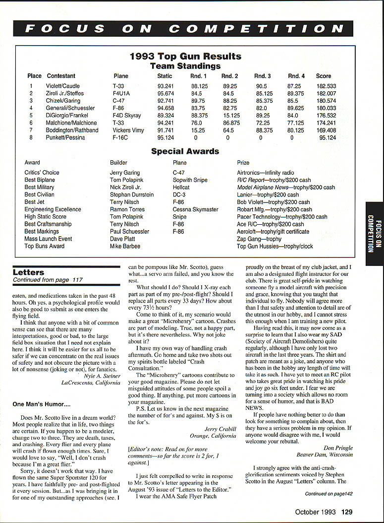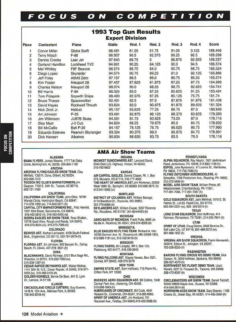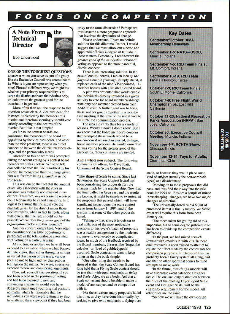 ANoteFromthe nical F Director Bob Underwood ONE OF THE TOUGHEST QUESTIONS answer serve part group like Executive Council contest board representing vote Phrased different way might ask whether primary responsibility serve district vote desires look toward greatest good association general often response question seems clear vice president instance elected members district therefore seemingly should vote strictly according desires district isnt simple As far contest boards concerned members board appointed vice presidents other vice president no direct connection between district members-atlarge person serves Attention concern prompted during recent voting contest board member unclear felt compelled vote line mandated district recognized charge given him far being mandate true sense due fact amount activity associated rules question virtually non-existent district Therefore response received could technically called majority logical assume must vote mandate given district under circumstances fact feels along others rule should passed does greater good organization factor scenario Another concern enters Very often constituency has little opportunity participate total dialogue associated voting particular issue time another have exposed situation formed definite views either through written verbal discussion issue various points came light changed feelings matter essence exposed new convincing arguments Now ask yourself question placed position voting exposed new convincing arguments would have doggedly maintained original position no matter what possible individuals representing may also have altered viewpoint privy same discussion Perhaps must assume pragmatic approach involves dynamics change Please understand have no definite solution dilemma Rather would suggest must allow elected appointed officials degree latitude matters Personally tend toward greater good association school voting opposed parochial district concept interesting solution case contest boards ran idea up flagpole couple years ago Simply stated replaced nine VP-appointed 11member boards smaller elected board plan presented would enable individuals directly involved given activity vote board members-at-large member elected AMA district further goal bring smaller groups together face-toface meeting time initial vote facilitate communication process idea didnt fly variety reasons Would now dont know know board members concern prompted words would nonconcern used elected at-large board member process would know voting greater good association comments invited whole new subject following comments offered Dave Platt Chairman Scale Contest Board shape Scale come Since last September Scale Contest Board has considering proposals rule changes made membership Now final ballot has cast results known might timely examine proposals passed will have significant impact upon scale contest scene January 1 1994 b reasons some other proposals failed Taking b first since quicker deal noticeable reactions cycles batch proposals healthy antagonism modelers out over-wordy complicated ideas much feedback received Board members phrases like forget calculus load gobbledygook occurred Scale contestants want keep things rule book simple other thing needs stressed Scale Contest Board has long held Flying Scale contest should just equal emphasis flying Scale Also body feel Scale contestant should able make model subject competitive reasons proposals failed time have done historically seeking give extra emphasis flying over static because would place some kind subject usually non-aerobatic types disadvantage Moving proposals did pass thus find way rule book 1994 Besides couple minor housekeeping changes have two major changes direction universally-hated rule 46 list purchased items finally history No Scale event will require form next January mechanism getting rid unpopular some degree justified rule has divide up competition events differently past mixed scratch own-design models kits circumstances need existed attempt equate effort made contestants comparison purposes retrospect has probably faulty system along no other sport comes mind attempts make work future own-design models will have separate event category Designer Scale distinction between rules existing Expert Sport Scale event Designer Scale will eligibility requirement model other rules same So now will have own-design October 1993 125 w models competing against other kit/plan models doing same thing no basis unfairness prevails course nobody says owndesign model can compete Designer Scale contestant could enter regular Expert wanted although its unlikely hell want First 46 gone hes placed disadvantage kit/plan entries model qualifies higher class hell probably want enter Indeed some have said likely scenario would kit contestant attempt enter Designer Scale Will added prestige entering top category result such wangling will hope kit contestants great number could design own model now move up doing Until now little point competition-wise creating own design January changes Now point fly peers What contest organizers will new class affect Very little actually judging models both statically flight same classes Sportsman Expert Designer thats needed key contestants name 5 E D denote division being flown announce results accordingly Lastly sad news few very few suspect oldest RC scale event Precision Scale gone years laying doldrums hardly contests being offered permanently-disappointing entry numbers board finally faced up reality Precisions time over deleting rule book offering new top-level event Designer its place rules everyone already understands no special requirements model its documentation hoped clubs will offer Designer support will far exceed what Precision getting Time will tell 1993 FAI/CIAM Technical Meeting Report F3C Subcommittee SIC Technical Meeting TM voted rules change proposals pertaining ClAM International Regulations General Rules International Contests General Regula
