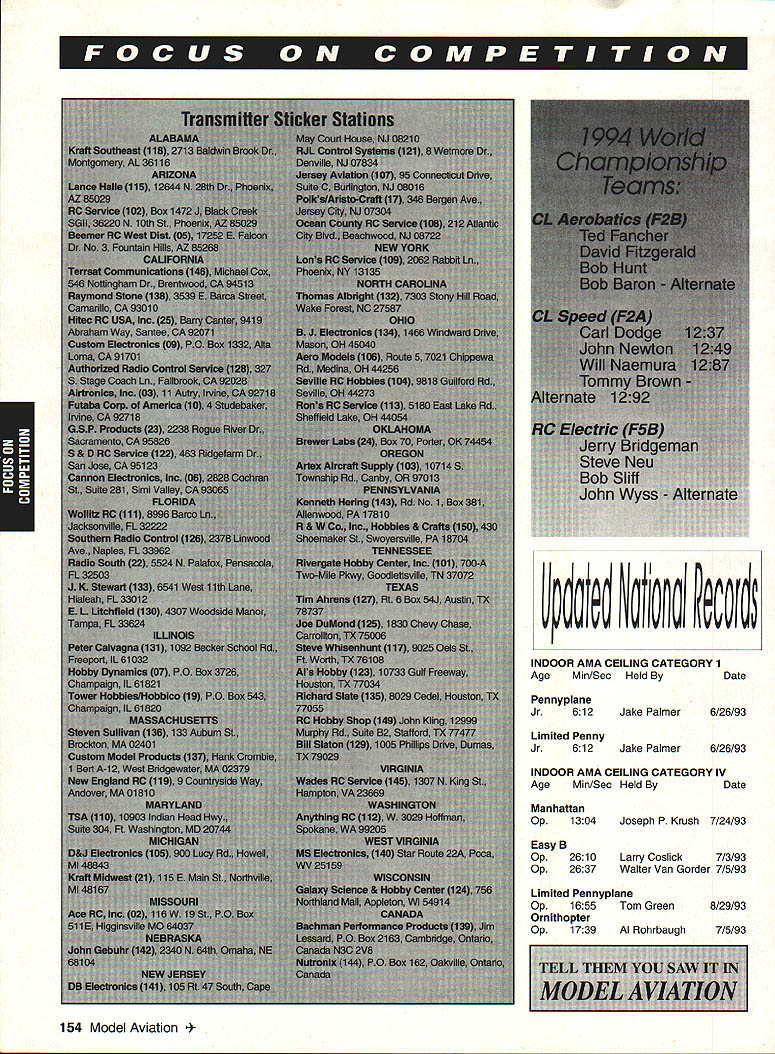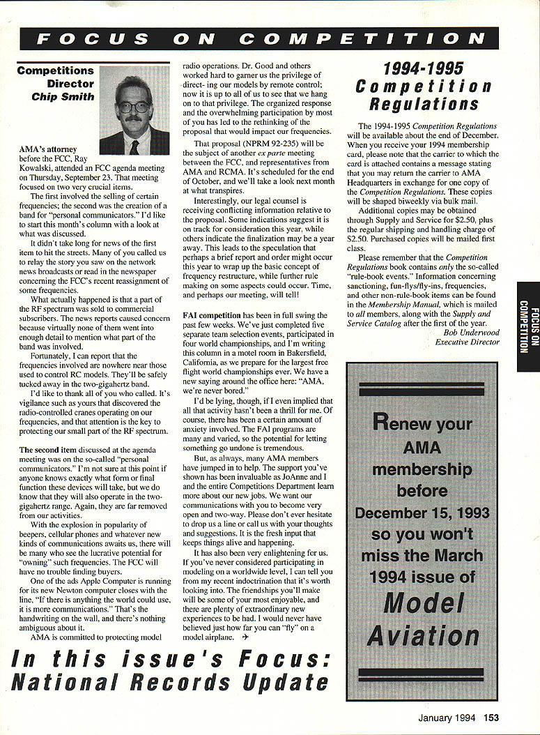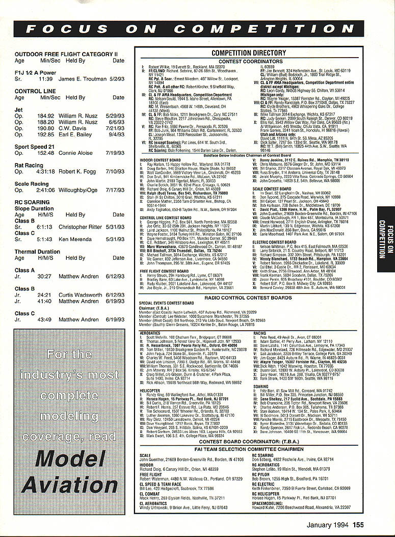 Competitions Director Chip Smith AMAs attorney before FCC Ray Kowaiski attended FCC agenda meeting Thursday September 23 meeting focused two very crucial items first involved selling certain frequencies second creation band personal communicators Id like start months column look what discussed didnt take long news first item hit streets called us relay story saw network news broadcasts read newspaper concerning FCCs recent reassignment some frequencies What actually happened part RF spectrum sold commercial subscribers news reports caused concern because virtually went enough detail mention what part band involved Fortunately can report frequencies involved nowhere near used control RC models Theyll safely tucked away two-gigahertz band Id like thank called Its vigilance such yours discovered radio-controlled cranes operating frequencies attention key protecting small part RF spectrum second item discussed agenda meeting so-called personal communicators Im sure point anyone knows exactly what form final function devices will take know will also operate twogigahertz range Again far removed activities explosion popularity beepers cellular phones whatever new kinds communications awaits us will see lucrative potential owning such frequencies FCC will have no trouble finding buyers ads Apple Computer running its new Newton computer closes line anything world could use communications Thats handwriting wall theres nothing ambiguous about AMA committed protecting model radio operations Dr Good others worked hard garner us privilege direct- ing models remote control now up us see hang privilege organized response overwhelming participation has led rethinking proposal would impact frequencies proposal NPRM 92-235 will subject another ex parte meeting between FCC representatives AMA RCMA Its scheduled end October well take look next month what transpires Interestingly legal counsel receiving conflicting information relative proposal Some indications suggest track consideration year others indicate finalization may year away leads speculation perhaps brief report order might occur year wrap up basic concept frequency restructure further rule making some aspects could occur Time perhaps meeting will tell FAI competition has full swing past few weeks Weve just completed five separate team selection events participated four world championships Im writing column motel room Bakersfield Califoruia prepare largest free flight world championships ever have new saying around office AMA never bored Id lying though implied that activity hasnt thrill course has certain amount anxiety involved FM programs varied potential letting something go undone tremendous always AMA members have jumped help support youve shown has invaluable JoAnne entire Competitions Department learn about new jobs want communications become very open two-way Please dont ever hesitate drop us line call us thoughts suggestions fresh input keeps things alive happening has also very enlightening us youve never considered participating modeling worldwide level can tell recent indoctrination its worth looking friendships youll make will some enjoyable plenty extraordinary new experiences would never have believed just far can fly model airplane -1995 Competition Regulations 1994-1995 Competition Regulations will available about end December receive 1994 membership card please note carrier card attached contalns message stating may return carrier AMA Headquarters exchange copy Competition Regulations copies will shaped biweekly via bulk mail Additional copies may obtained through Supply Service $250 plus regular shipping handling charge $250 Purchased copies will mailed first class Please remember Competition Regulations book contains so-called rule-book events Information concerning sanctioning fun-flys/fly-ins frequencies other non-rule-book items can found Membership Manual mailed members along Supply Service Catalog after first year Bob Underwood Executive Director issues Focus National Records Update January1994 153 updated Natona Pecotds INDOOR AMA CEILING CATEGORY 1 AgeMm/Sec Held ByDate Pennyplane Jr612Jake Palmer6/26/93 Limited Penny Jr612Jake Palmer6/26/93 INDOOR AMA CEILING CATEGORY IV AgeMm/Sec Held ByDate Manhattan Op1304Joseph P Krush 7/24/93 Easy B Op2610Larry Coslick7/3/93 Op2637WaIter Van Gorder 7/5/93 Limited Pennyplane Op1655Tom Green8/29/93 Ornithopter Op1739Al Rohrbaugh7/5/93 154 Model Aviation OOR FREE FLIGHT CATEGORY II AgeMm/Sec Held ByDate F1J 12 Power Sr 1139 James E Troutman 5/293 18492 18820 19080 19285 William R Nusz William R Nusz CW Davis Earl E Bailey Sport Speed 21 Op 15248 Connie Aloise Robert K Fogg Willoughby/Oge RC SOARING Slope Duration AgeH/M/SHeld Class B Sr6113 Christopher Ritter Class C Sr5143 Ken Merenda Held 3027 Matthew Andren Date 5/29/93 6/6/93 7/21/93 9/4/93 7/19/93 7/10/93 7/17/93 Date 5/31/93 5/31/93 Date 6/12/93 2421Curtis Wadsworth6/12/93 4140Matthew ren6/19/93 4349Matthew Andren6/19/93 COMPETITION DIRECTORY CONTEST COORDINATORS IRobert Wilkie 18 Everett St Rockland MA 02370IL 60559 iiFFICLItNO Richard Sobrios 87-26 88th St WoodhavenFF Jim Bennett 324 Heitenstein Ave St Louis MO 63119 NY 11421CL William Bud Badzioch Jr 1800 Trail Ridge St AC Pyi & Soar Ernest Nikodom 407 Willow St LockportArlington Heights IL 60004 NY 14084VIICL & FF AMA Headquartern Competition Department entire AC Patt & alt other AC Robert Kircher 9 Sheftield Waydiotrict encept Michigan Ciark NJ 07066AC Leon Cordy N4503 Highway 55 Chiltan Wi 53014 IiiCL & FF AMA Headgeartero Competition DepartmentMichigan AC Nelson Gould 1044 S Idaho Street Allentawn PAAC Wayne Yeager 15387 Forrister Rd Clayton Ml 48235 18103 lotlViii Ci & FF Randy Randolph PO Bax 271048 Duiiat TX 75227 AC M eloenbach 4568W 146th Cleveland OHAC Clyde Brothers 4863 Whispering Oaks Dr College 44135 IWestStation Tv 77845 IVCL & FF Bob Nicks 1211 Brookgreen Cary NC 27511iXMike Tollmon 3014 Euchonge Wichita KS 87217 AC Steve Moulton 2217 Johottown Rd ChesapeakeA