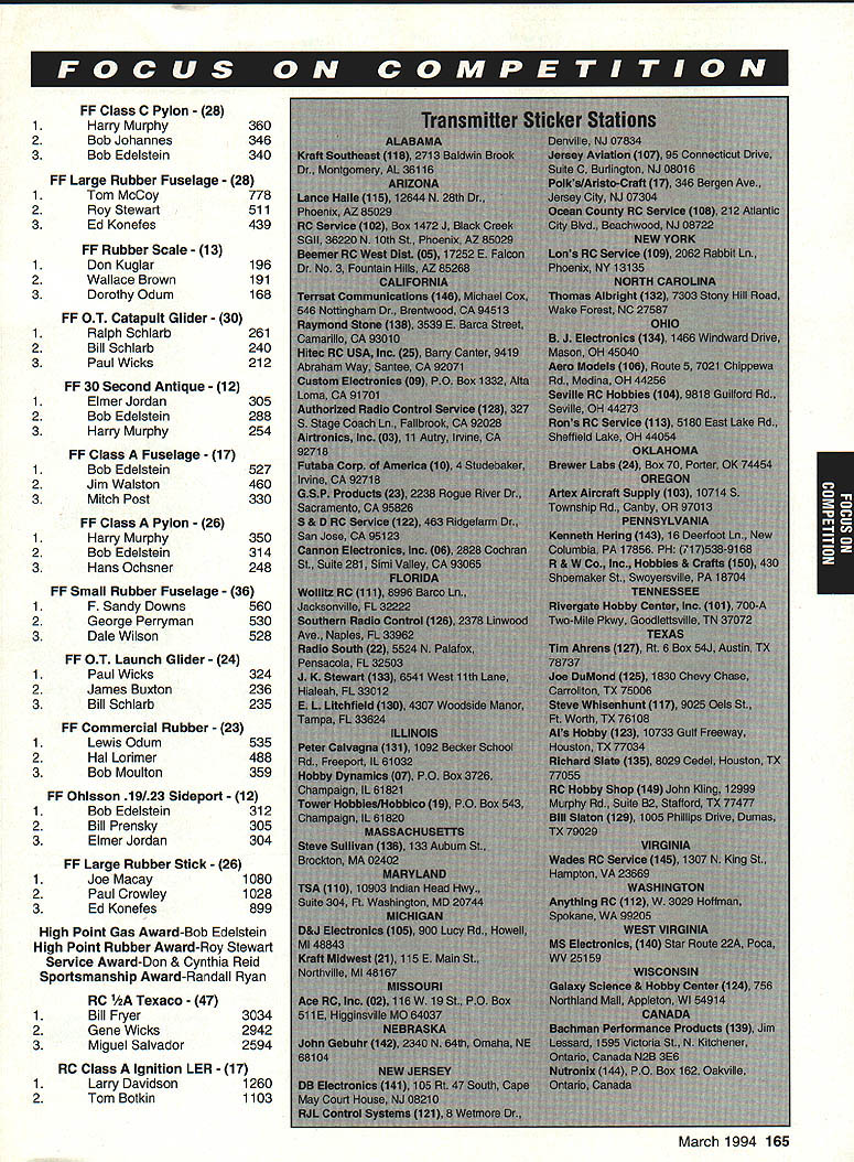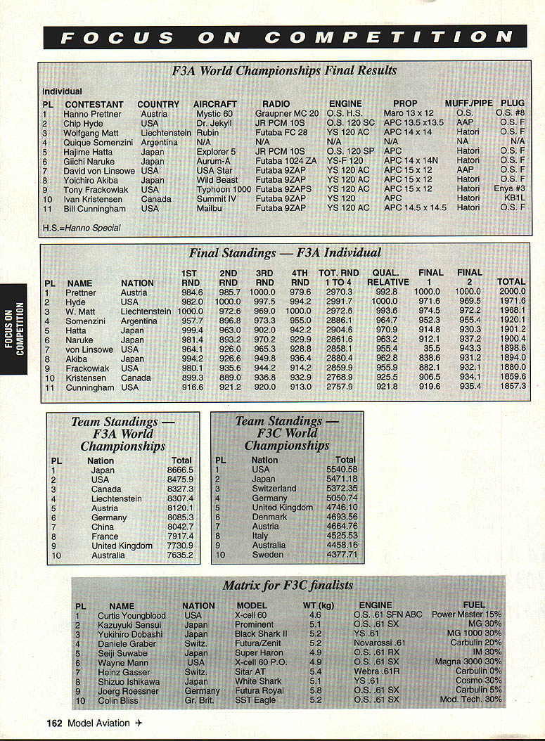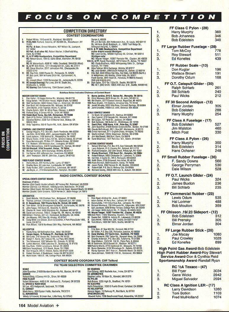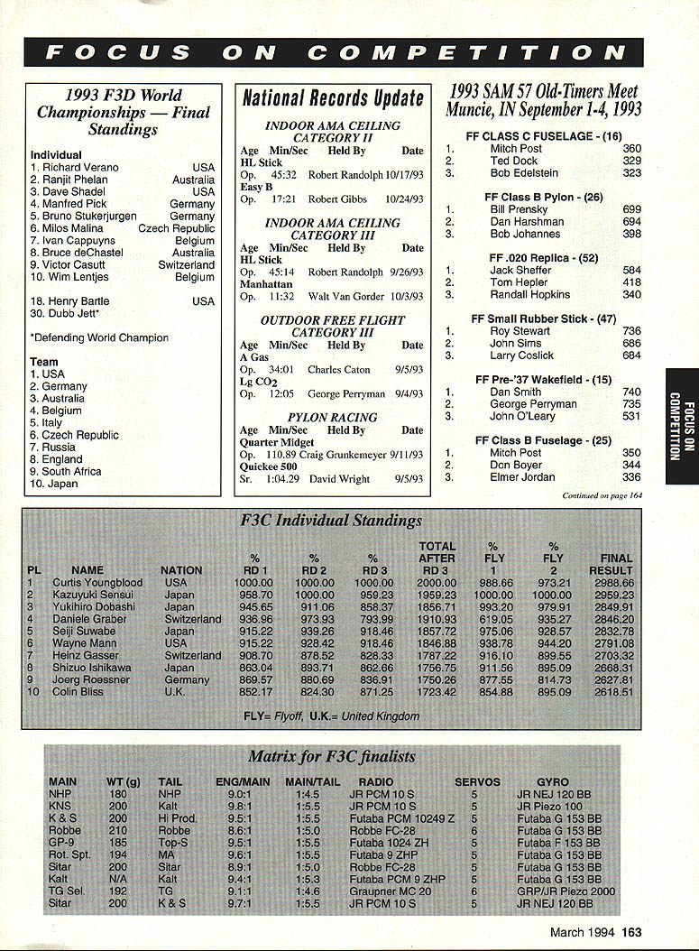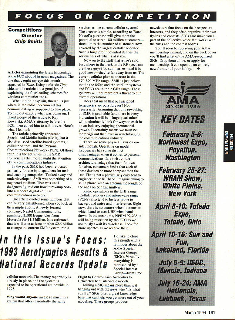 Competitions Director Chip Smith Articles examining latest happenings FCC abound news magazines caught eye month appeared Time Using classic Time sidebar article did good job explaining four leading schemes wireless communications What didnt explain though just radio spectrum communicating supposed take place find out exactly what going faxed copy article Ray Kowaiski AMAs attorney before FCC called him talk over Heres what learned article primarily concerned Specialized Mobile Radio SMR also discussed satellite-based systems cellular phones Personal Communications Network PCN four activities SMR frequencies caught attention communications industry past SMR relocated primarily use dispatchers taxis trucking companies Tucked away underdeveloped SMR something neglected medium until designers figured out revamp SMR modern digital cellular communications network article quoted some numbers can very enlightening look implications newly formed company Nextel Communications purchased 2500 frequencies Motorola $18 billion estimated will take least another $25 billion change current SMR system services current cellular system answer simple according Time Nextel s purchase will give potential serve 180 million customers three times number customers now covered largest cellular operator Such huge profit potential defines seriousness what stake Now stuff wasn t said Just heck RF spectrum guys summarizeand good newstheyre far away us current cellular phones operate 870-890 MHz range SMR just below 850s satellite systems PCNs 2 GHz range systems will represent threat current operations Does mean assigned frequencies forever necessarily Assuming reworking SMR profitable indication will behugely others will undoubtedly look ways cash industry enjoying phenomenal growth certainly means must vigilant ever watchdogging communications industry some physical laws side though Operating model frequencies has some distinct disadvantages comes personal communications twist architectural adage form follows function consumers insist devices compact last Thats particularly easy feat engineer RC band Imagine trying sell phone antenna length ones transmitters Radio operations UHF range Cellular phones microwave range PCNs also tend less prone background noise interference Right now no contest comes band use UHF wins hands down meantime NPRM 92-235 still being rewritten FCC anxiously await its re-release Look updates receive newsletters focus respective interests often organize own fly-ins contests SIGs also make part collective voice works rules contest boards Youll soon receiving AMA membership manual back cover youll find list AMA-recognized SIGs Drop line apply membership can open up entirely new frontier hobby es Focus 1993 Aerolympics Results & ational Records Update cellular network money reportedly already place system expected operational nationwide 1995 would anyone invest much system offers essentially same Id like close month reminder about AMA Special Interest Groups SIGs Virtually everything represented Special Interest Groupfrom Free Flight Control Line Aerobatics Helicopters quarter-scale models Joining SIG means just hanging out guys fly what fly SIGs offer great knowledge base can help get out modeling groups produce March 1994 161 STANT Prettner yde Lng Matt ne Hatta Naruke David von Yoichiro Tony Fracko Ivan Kristensen Bill Cunningham Tanno Special P1.NAME 1Prettner 2Hyde 3WMatt 4Somenzini 5Hatta 6Naruke 7von Linsowe 8Akiba 9Frackowiak 10Kristensen 11Cunningham Team F3A C PLNation 1 Japan 2 USA 3Canada 4 Lie 5Austria 6 Germany 7 China 8 France 9 United Kir 10 Australia 162 Model Aviation 135 14x 14 1 4N 12 12 12 x 145 FINAL 1 0 5 p23 48 1 3RD RND 0 5 3 33 20 02 498 442 0 1993 F3D World Championships l Standings Individual 1 Richard Verano 2 Ranjit Pheian 3 Dave Shadel 4 Manfred Pick 5 Bruno Stukeriurgen 6 Milos Malina 7 Ivan Cappuyns 8 Bruce deChastel 9 Victor Casutt 10 Wim Lentjes 18 Henry Bartle 30 Dubb Jett* USA Australia USA Germany Germany Czech Republic Belgium Australia Switzerland Belgium USA *Defendjng World Champion Team 1 USA 2 Germany 3 Australia 4 Belgium 5 Italy 6 Czech Republic 7 Russia 8 England 9 South Africa 10 Japan 1993 SAM 57 Old-Timers Meet Muncie IN September 1-4 1993 FF CLASS C FUSELAGE 16 1 Mitch Post 2 Ted Dock 3 Bob Edelstein FF Class B Pylon 26 1 Bill Prensky 2 Dan Harshman 3 Bob Johannes FF 020 Replica 52 1 Jack Sheffer 2 Tom Hepler 3 Randall Hopkins 1 2 3 FF Small Rubber Stick 47 Roy Stewart John Sims Larry Coslick FF Pre-37 Wakefield 15 1 Dan Smith 2 George Perryman 3 John OLeary FF Class B Fuselage 25 1 Mitch Post 2 Don Boyer 3 Elmer Jordan 360 329 323 699 694 398 584 418 340 736 686 684 740 735 531 350 344 336 Continued page 164 March 1994 163 National Records Update INDOOR AMA CEILING CATEGORY H Age Mm/Sec Held Date ilL Stick op 4532 Robert Randolph 10/17/93 Easy B op 1721 Robert Gibbs 10/24/93 INDOOR AMA CEILING CATEGORY HI AgeMm/Sec Held Date HL Stick op4514 Robert Randolph 9/26/93 Manhattaa op1132 Walt Van Gorder 10/3/93 OUTDOOR FREE FLIGHT CATEGORY HI Age Mm/Sec Held Date Gas op 3401 Charles Caton 9/5/93 Lg C02 op 1205 George Perryman 9/4/93 PYLON RACING Age Mm/Sec Held Date Quarter Midget Op 11089 Craig Grunkemeyer 9/11/93 Quickee 500 Sr 10429 David Wright 9/5/93 I Robert Wilkie 19 Everett St Rackland MA 02370 II FF/CLIIND Richard Sabrina 87-26 88th St Woodhaven NY 11421 BC Pyl & Soar Ernest Nikodem 407 Willow St Lockport NY 14094 RE Pati & other BC Robert Kimber 9 Sheffield Way Clark NJ 07066 itt CL & PP AMA Headquarters Competition Departmett BC Nelson Gould 1944S Idaha Street Allentown PA 18103 East RE M Weisenhach 4568W 146th Cleveland 0H44135 West IV CL & FF Beb Nicks 1211 Brookgreeo Dr Cary NC 27511 RC Steve Moulton 2217 Johostown Rd ChesapeskeVA 23322-2742 V RE Rae Fritz 5980 Pawne Dr Pensacola FL 32528 FF Bvb Junk 984 Williams Ditch Rd Cantonment FL 32533 CL Jotepir Mead 1339 Rensoaloer St JackoonvilleEL 32205 Vt RE except Soaniag Pat Lines 614W Sooth 