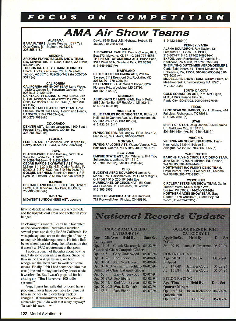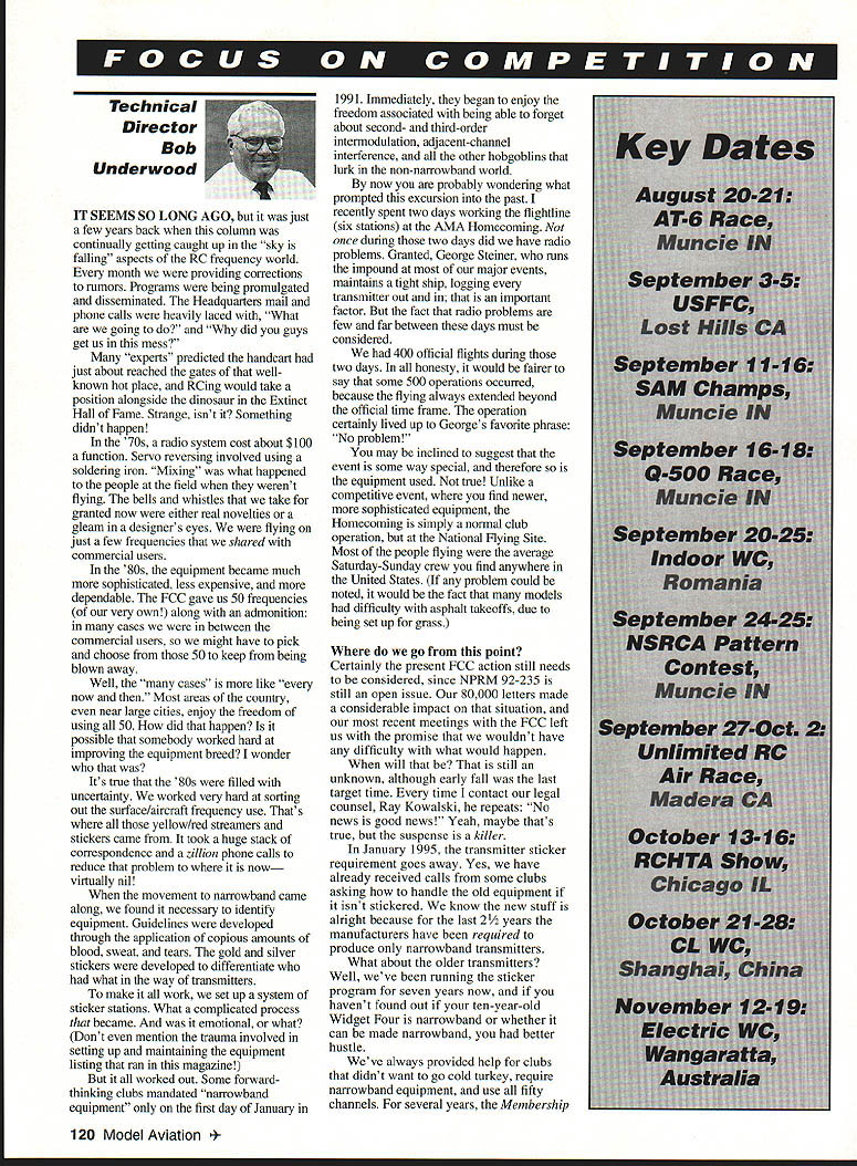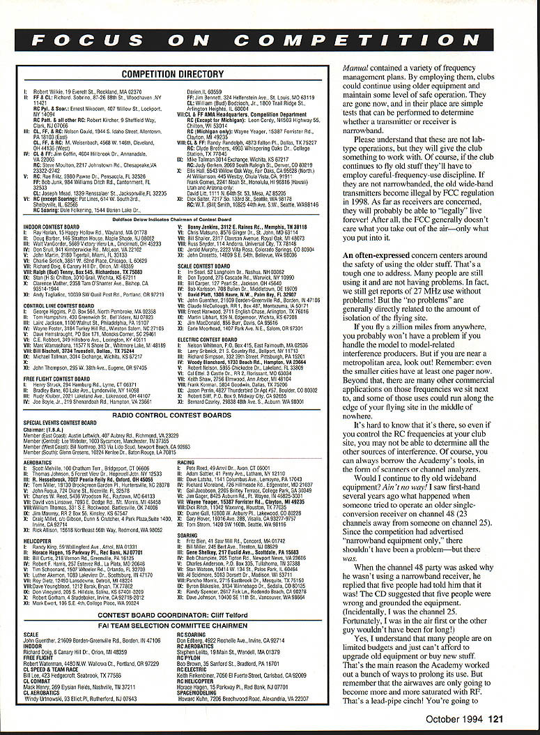 w W- Wj Technical Director Bob Underwood IT SEEMS SO LONG AGO just few years back column continually getting caught up sky falling aspects RC frequency world month providing corrections rumors Programs being promulgated disseminated Headquarters mail phone calls heavily laced What going did guys get us mess experts predicted handcart just about reached gates wellknown hot place RCing would take position alongside dinosaur Extinct Hall Fame Strange isnt Something didnt happen 70s radio system cost about $100 function Servo reversing involved using soldering iron Mixing what happened people field werent flying bells whistles take granted now either real novelties gleam designers eyes flying just few frequencies shared commercial users 80s equipment became much sophisticated less expensive dependable FCC gave us 50 frequencies very own along admonition cases between commercial users might have pick choose 50 keep being blown away Well cases like now Most areas country near large cities enjoy freedom using 50 did happen possible somebody worked hard improving equipment breed wonder Its true SOs filled uncertainty worked very hard sorting out surface/aircraft frequency use Thats yellow/red streamers stickers came took huge stack correspondence zillion phone calls reduce problem now virtually nil movement narrowband came along found necessary identify equipment Guidelines developed through application copious amounts blood sweat tears gold silver stickers developed differentiate what way transmitters make work set up system sticker stations What complicated process became emotional what Dont mention trauma involved setting up maintaining equipment listing ran magazine worked out Some forwardthinking clubs mandated narrowband equipment first day January 1991 Immediately began enjoy freedom associated being able forget about second- third-order intermodulation adjacent-channel interference other hobgoblins lurk non-narrowband world now probably wondering what prompted excursion past recently spent two days working flighfline six stations AMA Homecoming once during two days did have radio problems Granted George Steiner runs impound major events maintains tight ship logging transmitter out important factor fact radio problems few far between days must considered 400 official flights during two days honesty would fairer say some 500 operations occurred because flying always extended beyond official time frame operation certainly lived up Georges favorite phrase No problem may inclined suggest event some way special therefore equipment used true Unlike competitive event find newer sophisticated equipment Homecoming simply normal club operation National Flying Site Most people flying average Saturday-Sunday crew find anywhere United States problem could noted would fact models difficulty asphalt takeoffs due being setup grass go point Certainly present FCC action still needs considered since NPRM 92-235 still open issue 80000 letters made considerable impact situation recent meetings FCC left us promise wouldnt have difficulty what would happen will still unknown although early fall last target time time contact legal counsel Ray Kowalski repeats No news good news Yeah maybe thats true suspense killer January 1995 transmitter sticker requirement goes away Yes have already received calls some clubs asking handle old equipment isnt stickered know new stuff alright because last 2/2 years manufacturers have required produce narrowband transmitters What about older transmitters Well weve running sticker program seven years now havent found out ten-year-old Widget Four narrowband whether can made narrowband better hustle Weve always provided help clubs didnt want go cold turkey require narrowband equipment use fifty channels several years Membership 120 Model Aviation bert Wilkie 19 Everett St Rackland MA 02370 II FF & CL Richard Sobrino 87-26 88th St Woodhavee NY 11421 BC Pyl & Soar Ernest Nikadem 407 Willow St Lackyort NY 14094 BC Poll & oil other BC Robert Kircher 9 Sheffield Way Clark NJ 07066 Ill CL FF & BC Nelson Goold 1944S Idaha Street Allontawn PA 16103 East CL FE & BC M Weisenbach 4668W 146th Cleveland OIl 44135 West IV CL & FE Jim Coffin 4604 Hillbrank Dr Annanadalo VA 22003 BC Steve Mosltno 2217 Johootown Rd ChesapeakeVA 23322-274 2 B BC Rae Frito 6966 Pawns Dr Pensacola FL 32626 FF Bob dank 984 Williams Bdch Rd Cantonment FL 32533 CL Joseph Mood 1336 Reossalser St JscknonvilloFL 32205 VI BC except Soariog Pat Lines 614W Soath 3rd Shelbynille IL 62565 BC Seanine Bale Folkanins 1544 Baries Loke Dr INDOOB CONTEST BOABO I Ray Harlan 15 happy Hollow Rd Wayland MA 61776 II Bong Barber t46 Stratton Hoose May10 Shade NJ 08652 III Wa6 VanGordor 6669 Victory View Lo Cincienari BH 45233 IV Don Oroll 841 Kimbermicke Rd McLean VA 22102 V Jobs Martin 2169 Tigertail Miami FL 32133 VI Charlie Sotich 3651 W 62nd Place Chicago IL 66626 VII Richard Boig 6 Canary Hill Dr Brion Ml 48358 VIII Bolph Bed Teeny Boo 848 Bichordoex TX 75888 IX Stan H 5 ChilIes 3010 Grail Wichda KS 67211 K Clarence MaSher 2358 Tam BShanter Ave Bishop CA 9351 4-1 944 XI Andy Tagliatica 10039 SW Qosil Post Rd Fartland 0897219 CONTBOL LINE CONTEST BOABO I George Higgion PO Ben 561 NartO Pembroke MA 02356 II Tom Hampshire 439 Gresowich 55 Bel Videre NJ 97823 III Laird Jackson 1106 Walnat St Philadelphia PA 19107 IV Wayne Foster 3184 Torkey Hill Rd Winstos Salem NC 27106 B Bane Hemotrooght PC Boo 171 Moacks Corner SC 29461 VI CE Robbert 349 Hillsbaro Ave Loninglon KY 49511 VII Marc Warwashasa 11577 N Shore Dr Whitmoro Lake Ml 48189 VIII Bill Biochoti 3734 Troendell Dolloc TX 75244 IX Michael Tallmas 3914 Enchasge Wichita 6567217 XI John Thompson 295W 36th Ave Eagene BR 97405 FOBE FLIGHT CONTEST BOABO I Henry Strack 294 Hamboeg Rd Lymo CT 06371 II Bradley Bane 69 Lako Ave Lyodonville NY 14696 III Rody Klsibor 2021 Lakeland Ave Lakewond OH 44107 IV Joe Boyle Jr 219 Shenandoah Rd Hampton VA 23661 SPECIAL EVENTS CONTEST BOABO Choirmoc TBA Member