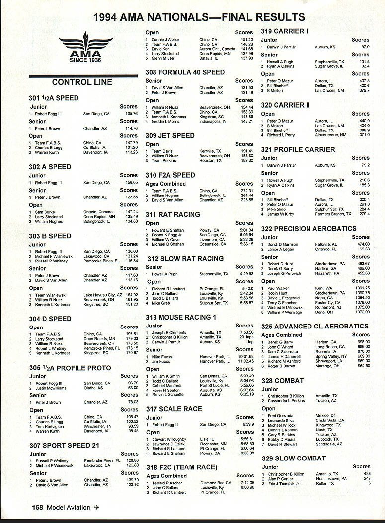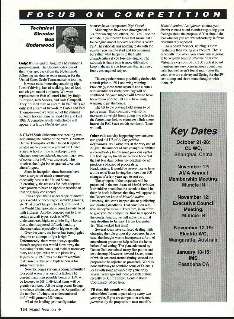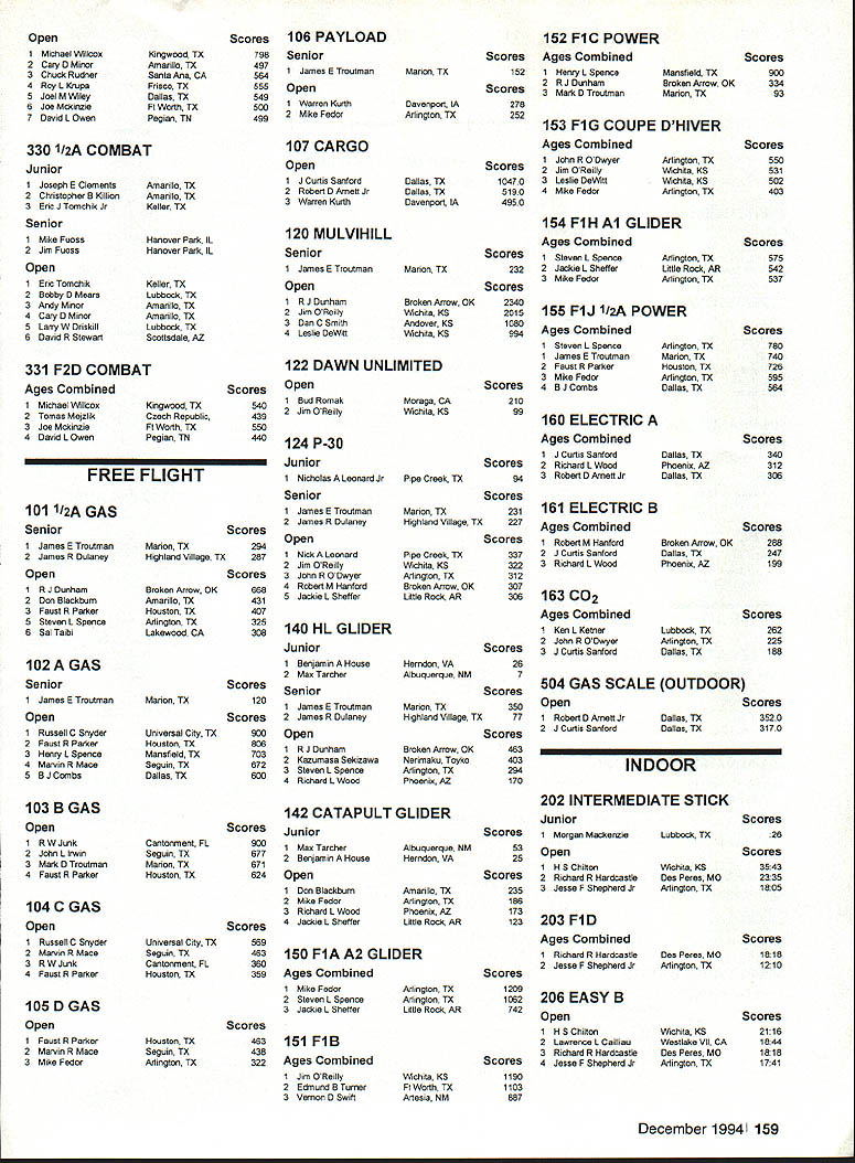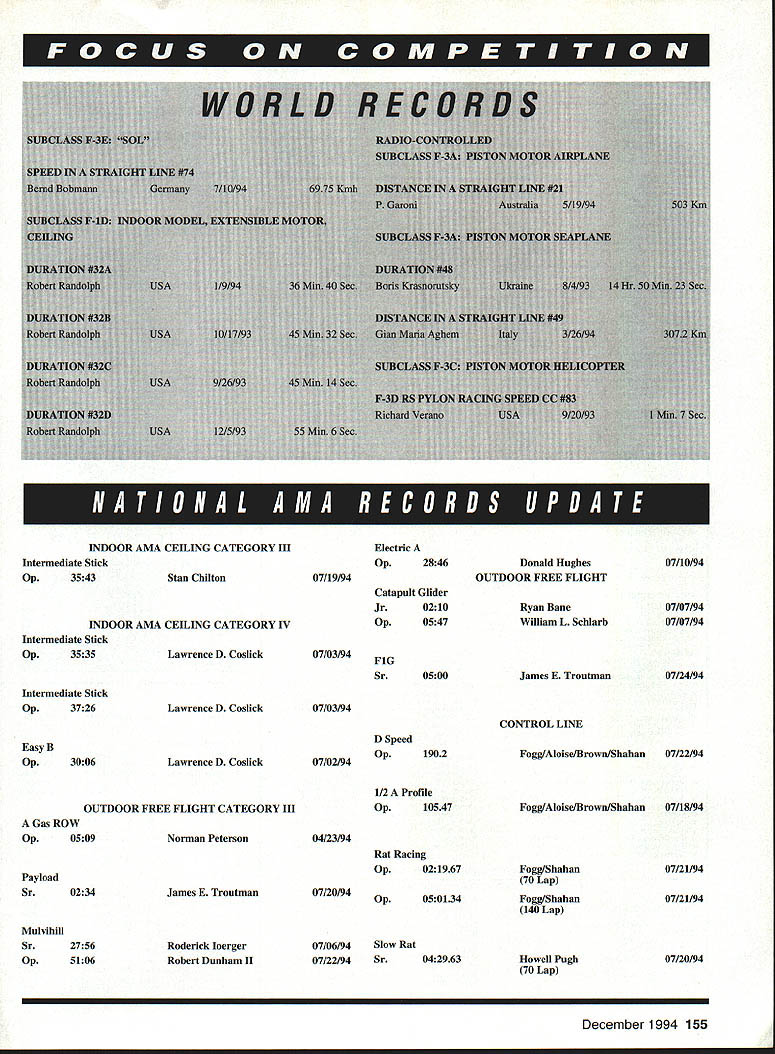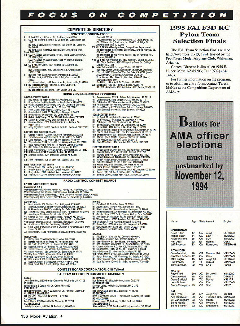 Technical Director Bob Underwood Gulp Its end August summers gonealmost Underwoods four just got back Netherlands following duty team manager United States Scale Team some touring interesting tiring trip Lots driving lots walking lots food oh yes model airplanes represented F4B Control Line Ralph Bumstine Jack Sheeks Dale Campbell finished third team F4C RC sent team twoKim Foster Earl Thompsonso out running team honors Kim finished 11th Earl 19th complete article photos will appear future Model Aviation bonuses have disappeared Zip Gone Multiengines have downgraded 3% two engines others 2% Yes see wrinide brow Does mean four-engine model receives less twin Yes rationale has nothing number need start keep running rather what happens flight characteristics lose engine rationale twin difficult keep air lose three- four- etc engined subject other bonus possibility deals aircraft prior 1911 wing warping Previously separate bonus awarded now will combined So subject will have have flown prior 1911 have wing warping get bonus tilt playing field seems going away combined some increases weight limits going effect future may help stimulate little interest FM Scale continent Time will tell Model Aviation please contact district contest board member regarding feelings about proposals should whether wholeheartedly favor adamantly opposed As board member nothing frustrating voting vacuum Thats especially true know youre going verbally beat up after final vote Virtually 100 contest board members very conscientious about task havent found over years clairvoyant Spring 29cent stamp share some thoughts Scale Subcommittee meeting held during course event Chairman Dennis Thumpston United Kingdom invited attend represent United States host little housekeeping rule changes considered major area concern F4C discussed involves flight bonus granted certain aircraft types Since its inception bonuses have subject much controversy especially United States Interestingly reasons adoption have proven have opposite reaction originally considered hoped wider range aircraft types would encouraged including multis etc didnt happen fact resulted World Championships being heavily laced biplanes Another concept give certain aircraft types such WWI undercambered biplanes little flight bonus due supposed difficult handling characteristics especially higher winds Over years bonus has jiggled about attempt get right Unfortunately always specific aircraft subjects would blow away reasoning bonus make necessary try adjust what place Hiperbipe 1978 first exception caused change biplane bonus subsequent years Now bonus system being diminished point less factor current maximum possible bonus 15% will lowered 6% Individual items will greatly restricted wing bonus listings have eliminated save Regardless number wings undercambered airfoil will gamer 3% bonus landing gear configuration Other rule activity happening now concerns good old US Competition Regulations As write very end August number rule changes submitted considerably below some previous cycles Im holding breath fond hope last few days before deadline produce blizzard proposals Headquarters would so-o-o nice have little relief having 200 changes few years ago sort out synopsis proposals will presented next issue Model Aviation should noted schedule found rule book indicates will appear December issue Model Aviation Presently cant happen due publishing printing deadlines condition true last cycle well Therefore effort give competitor time respond contest boards will move initial vote deadline January 1 December 1st worked last time Several ideas have surfaced dealing changing rule proposal procedures case thought incorporate form amendment process help refine items before final voting plan advanced Duane Gall contained fine points text cleanup However several issues some centered around timing caused proposal rejected presented Work now underway combine some Duanes ideas some advanced yours truly several years ago presented recently Cliff Telford Contest Board Coordinator later Ill close month same admonition seem pass along two year cycle competition oriented please study proposals next months 154 Model Aviation OR AMA CEILING CATEGORY III Intermediate Stick Op3543Stan Chilton INDOOR AMA CEILING CATEGORY IV Intermediate Stick Op3535Lawrence D Coslick Intermediate Stick Op3726Lawrence D Coslick Easy B Op3006Lawrence D Coslick OUTDOOR FREE FLIGHT CATEGORY III Gas ROW Op0509Norman Peterson Payload Sr0234James E Troutman Mulvibill Sr2756 Op5106 Roderick loerger Robert Dunham II Electric Op2846 07/19/94 Catapult Glider Jr0210 Op0547 07/03/94FiG Sr0500 07/03/94 D Speed 07/02/94Op1902 1/2 Profile Op10547 04/23/94 Rat Racing Op021967 07/20/94Op050134 07/06/94Slow Rat 07/22/94Sr042963 Donald Hughes07/10/94 OUTDOOR FREE FLIGHT Ryan Bane07/07/94 William L Schlarb07/07/94 James E Troutman07/24/94 CONTROL LINE Fogg/Aloise/Brown/Shahan07/22/94 Fogg/Aloise/Brown/Shahan07/18/94 Fogg/Shahan 70 Lap Fogg/Sbahan 140 Lap Howell Pugh 70 Lap 07/21/94 07/21/94 07/20/94 December 1994 155 w 1 w k m COMPETITION DIRECTORY CONTEST COORDINATORS IRobert Wilkie 19 Everett St Rockland MA 02370DarieniL 60559 II CL & FF Richard Sobrino 87-26 88th St Woodhavee NY FF Jim 8enoett 324 Heltenstein Ave. St Lovis MO 63119 11421 CL William Bud Bodzioch Jr 1800 trail Ridge St BC Pyl & Soar Ernest Nikodero 407 Willow St Lackport Arlington Heights IL 60004 NY 14084 VII CL & FF AMA Headqoartern Competition Department RC Pall & other RE Robert Kircher 8 Shetteld Way RE Except br Michigan Leon Cordy N4503 Highwoy 55 Clark NJ 87866 Chilton WI 53814 Iii CL PP & RC Nelson Gould 1844 S Idaho Street Allentown RC Michigan Wayne Yeager 15387 Forrister Rd PA 16183 East Clayton Ml 49235 CL FE & RE M Weisenbach 4568W 146th Cleveland VtttCL & FF Randy Randolph 4873 Fallon P1 Dallas TX 75227 OH 44135 West RC Clyde Brothers 4903 Whispering Oaks Dr College IV CL & FE Jim Cottin 4604 Hillbrook Dr Annandale Station TX 77845 VA 22003 IX M