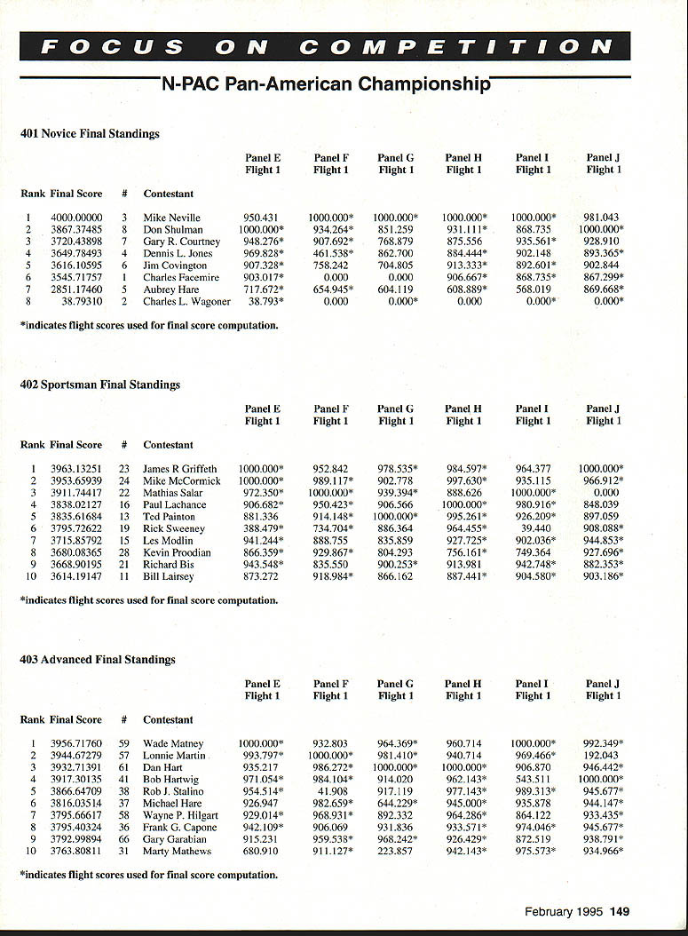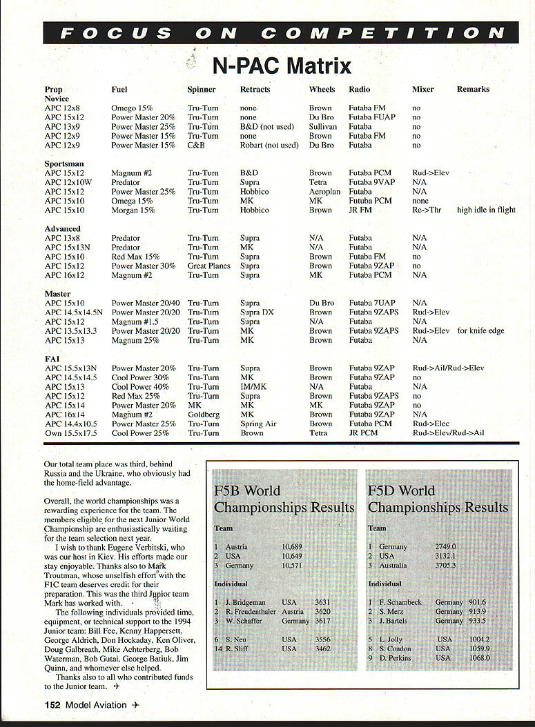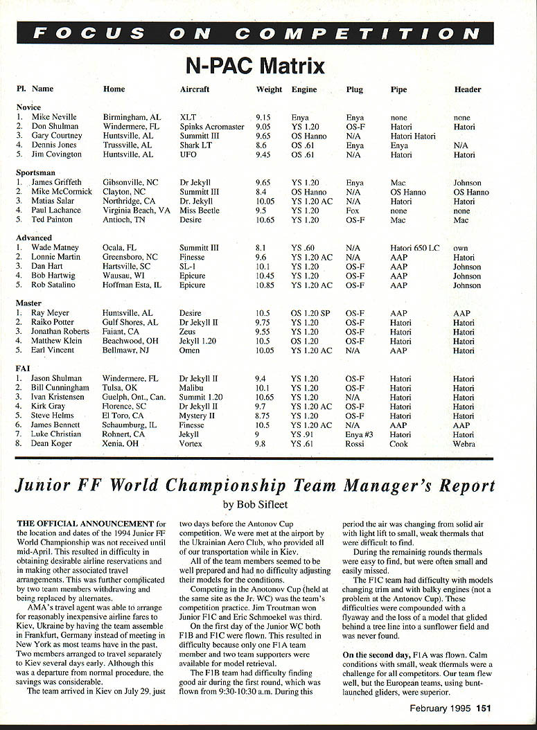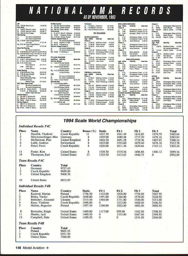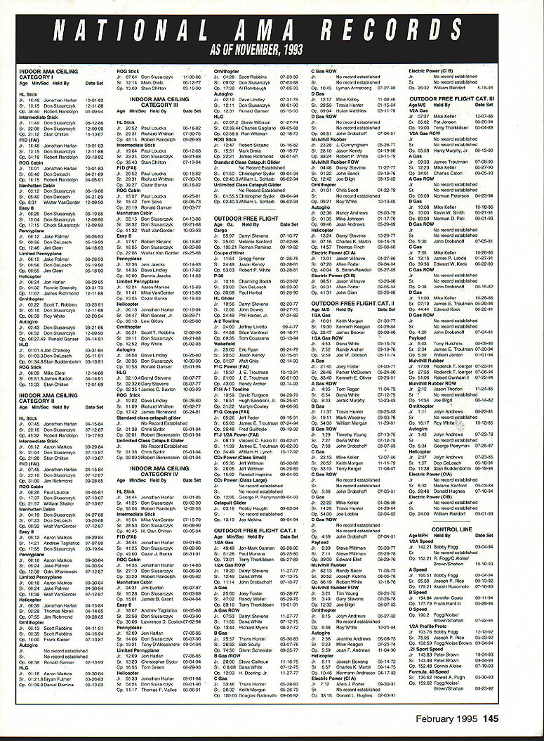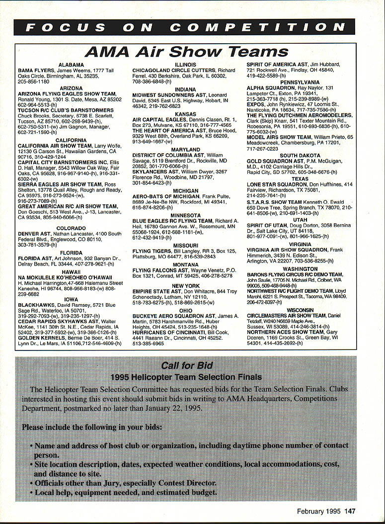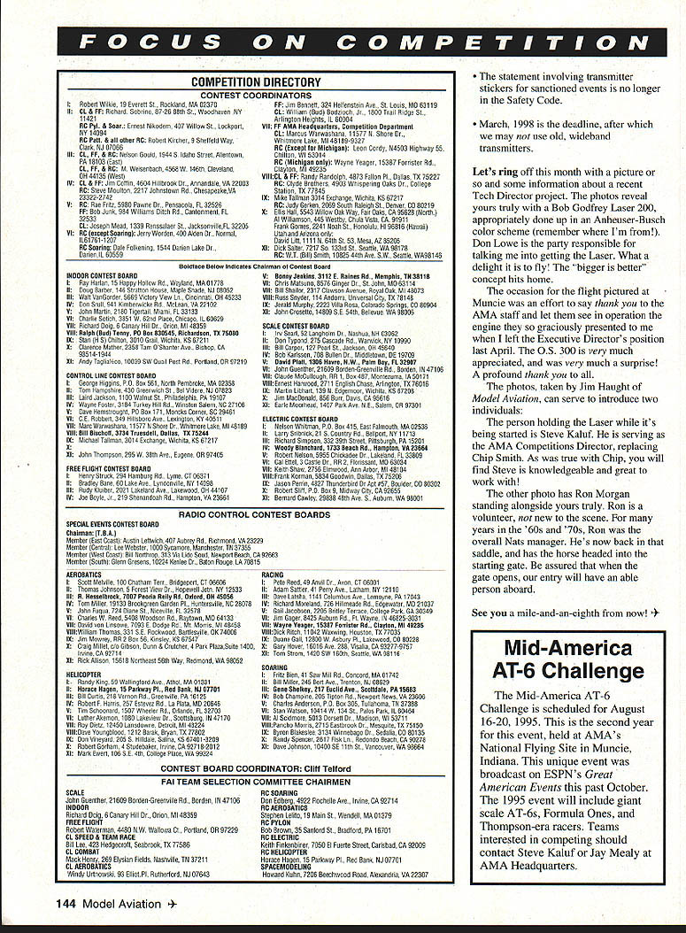kWU WW 1m mm mA m Technical Director Bob Underwood THE NOVEMBER ISSUE carried Tech Directors column containing highly charged editorial concerning National Aeromodeling Championships specifically designed evoke commentIt did date few days before ghosts goblins sally forth number letters some very long calls some very long writer have reached half hundred represents significant level interest issue Virtually communications echoed basic premise column Nats national championships should restructured very surprised find drastic measures suggested some areas instance letter indicated trophy policy predicated comment first place counts Second place stated first last place would love share letters conversations especially since represent articulate impassioned set have experienced during tenure AMA employee Alas cant since actual letters phone Bob Underwood L cranks up 05 300 Laser 200 AMAs Competitions Director Steve Kaiuf holds notes would fill two years worth columns However assured information has provided individuals responsible managing Nats Executive Council establish policy important clarify issue two came through some communications First am two seemed think favor canceling Nats wish see event returned status national championships hoped could provoke thinking achieve goal seems have happened Second individual took task personally cancelling Scale 1994 Nats may suggest am empowered make such heavyweight decisions Actually am amazed number individuals seem think AMA employees policymakers association Quite frankly facilitators implement policies Bob enjoys demo fiight Laser AMA employees Nats Manager Ron Morgan Bobs left iooks given us role chose writing November column ombudsmansomeone attempting identify articulate concerns issues may exist viewed membership actual policymaking body Enough philosophy dialogue resulting column has will continue very constructive fact virtually everyone said right basic premise column flattering revealing True different solutions offered some cases members responding commended excellent suggestions borne careful thinking long experience can utter hmm.I wish thought considering ideas what will happen Time will tell feel certain however changes will occursoon Thank very much wonderful ideas support Shift gears Whats happening issue created crises 93the FCC action identified NPRM 92-235 question can best answered phrase very little fact appears attempt refarm frequencies 72-76 MHz bands has evaporated present true strong campaign mounted modelers through 80000 letters flooded FCC Congress played important role other issues consider instance FCC continues undergo significant structural change incorporating new personnel important us fact now under new bureau called Wireless time read Academy will have opportunity meet new folks involved will have attempted explain what have no doubt under able guidance counsel Ray Kowalski will help us maintain excellent working relationship FCC Interestingly Doron Fertig individual responsible writing 92-235 no longer directly involved issue may recall Mr Fertig economist FCC restructuring now part department known Office Competitiveness Please dont write ask what heck means because havent foggiest So-o-o well trundle along business usual looking forward Frequency Committee meeting shortly after first year some items frequency arena need reminded however As January 1995 new transmitters will no longer sold RCMA-AMA gold sticker attached Narrowband has required manufacturers since March 1992 February 1995 143 CONTEST COORDINATORS IRobert Wilkie 19 Everett SI Rocklond MA 02370FF Jim Bennett 324 1-leltenstein Ave St Louis MO 63119 IICL & FF Richard Sobrino 87-26 88th St Woedhavee NYCL William Bud Budoinch Jr. 1800 Trail Ridge St 11421Arlington Heights IL 90804 AC Pyl & Soar Ernest Nikodem 4g7 Willow St LockyoraVIIFF AMA Headquarters Competition Department NY 14694CL Marcus Worwoshono 11577 N Shore Dr AC PaB & other AC Robert Kircher 0 Shetteld WayWhitmore Lake Ml 48189-0327 Clark NJ 07066AC Enoept tot Michigan Leon Cordy N4503 Highway 55 ttlCL FF & BC Nelson Gould 1944 S Idaho Street AllentownChilton WI 53014 PA 18103 EastBC Michigan Wayne Yeager 15367 Forrister Rd CL FF & AC M Weisenbach 4566W 146th ClevelandClayton Ml 40235 OH 44135 WestVtllCL & FF Randy Randolph 4073 FolIos P1 Dallas TX 75227 tVCL & FF Jim Coffin 4604 Hillbrook Dr Annondale VA 22003BC Clyde Brothers 4903 Whispering Oaks Dr College BC Steve Moulton 2217 Johnstown Rd ChesapeokeVAStation TX 77645 23322-2742IXMike Tallman 3014 Exchange Wichita KS 67217 VBC Rae Fritz 5080 Pawne Dr Pensacola FL 33526BC Judy Gerken 2060 Sooth Raleigh St Denver CO 80219 FF Bob Junk 084 Williams Ditch Rd Cantonment FLXEllis Hdll 5543 Willow Oak Way Fair Oaks CA 95628 North 32533Al Williomoon 445 Westhy Chub Vista CA 91011 CL Joseph Mood 1339 Rensualoer SI JocknvnvilleFL 32205Frank Gowns 2241 Noah St Honolulu HI 96016 Hawaii VtBC except Soaring Jerry Wordoo 400 Alden NvrmalUtah Ariovon 1L61 761-1207David Li0 1111 N 64th St 53 Mesa AZ 85205 RC Snaring Dole Folkening 1544 Darien Lake DrXtDick Salter 7217 So 133rd St Soothe WA 08178 DorienIL 60559BCWT Bill Smith 1g625 44th Ave SW Seattlo WA98146 Boldface Below Indicates Chairman Contest Board 0 Benny Jenkion 3112 E Raines Rd Momphin TN 38118 VI Chris Matouna 8576 Ginger Cr St John MO 63114 VIt Bill Shailor 2317 Clawoon Avenue Royal Oak Ml 48073 VIII Russ Snyder 114 Andorro Universal City TX 78148 IX Jerold Murphy 2223 Villa Rosa Colorado Springs CO 80004 XI John Crosetto 14809 SE 54th Bellevue WA 98006 INDOOR CONTEST BOARD I Ray Harlan 15 Happy Hallow Rd Wayland MA 01778 It Doug Barber 146 Stratton Hoave Maple Shade NJ 08052 Ill Walt VooGorder 5669 Victory View Ln Cincionati DH 45233 IV Don Srull 941 Kimherwicke Rd McLean VA 22102 V John Martin 2188 Tigertoil Miami FL 33133 VI Charlie Sotich 3851 W 62nd Placo Chicago IL 60629 VII Richard Doig 6 Canary Hill Dr Orion Ml 48359 VIII Ralph Bud Teeny PD Boo 830545 Rlohardoon TX 75088 IX Stan