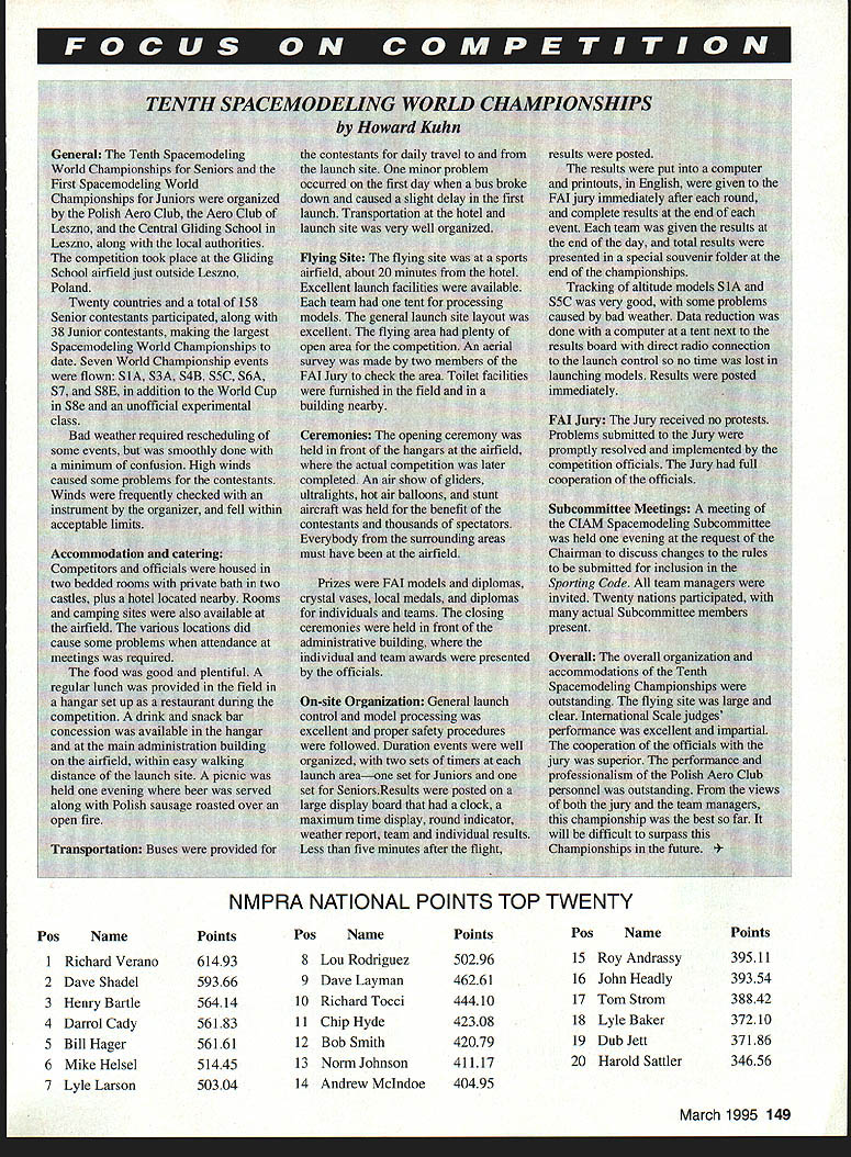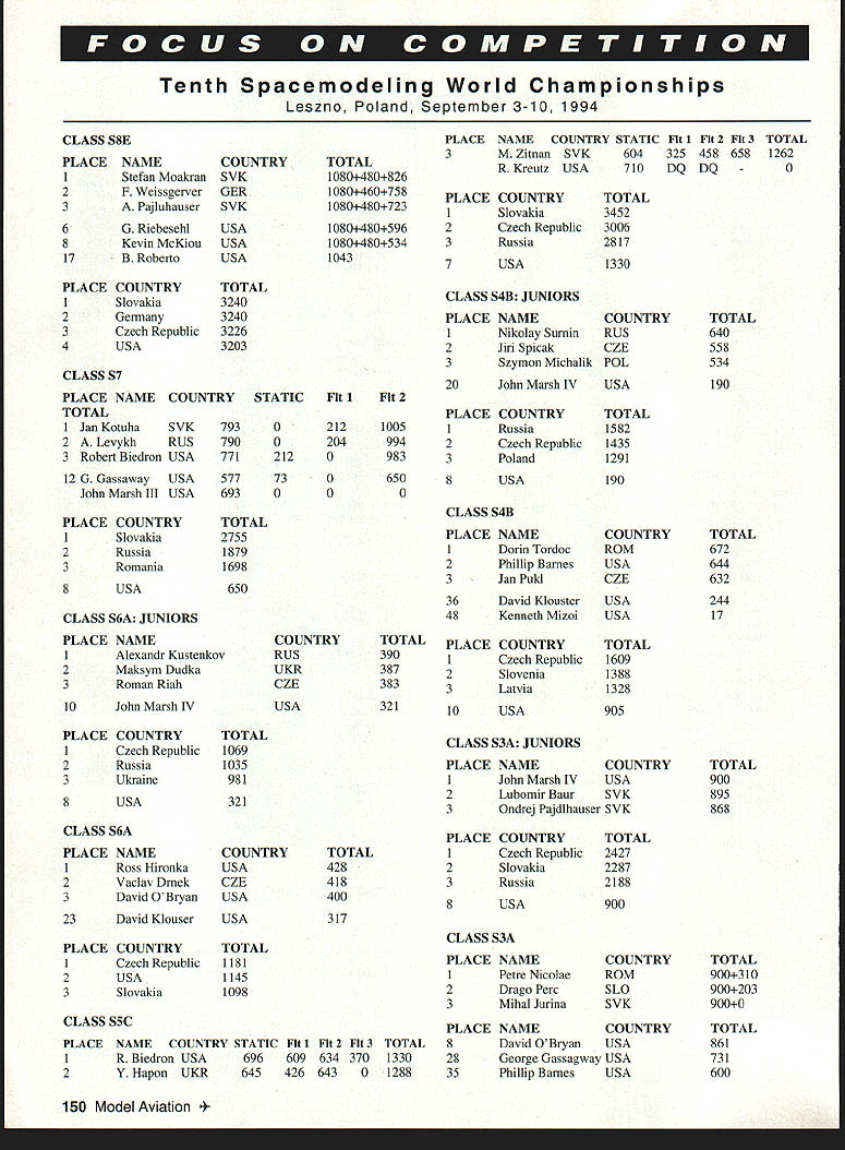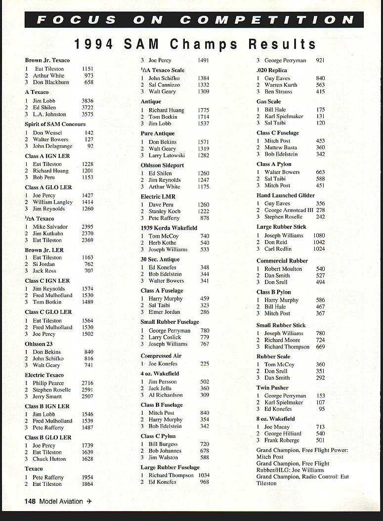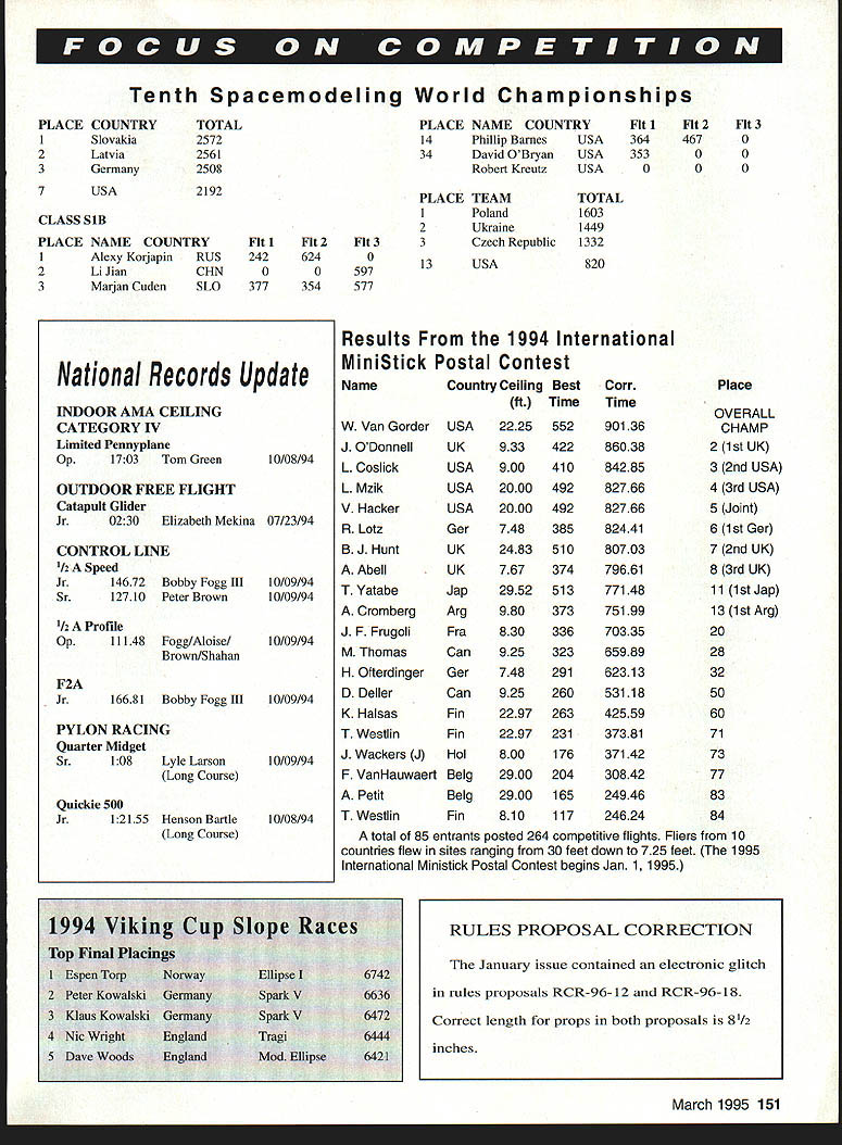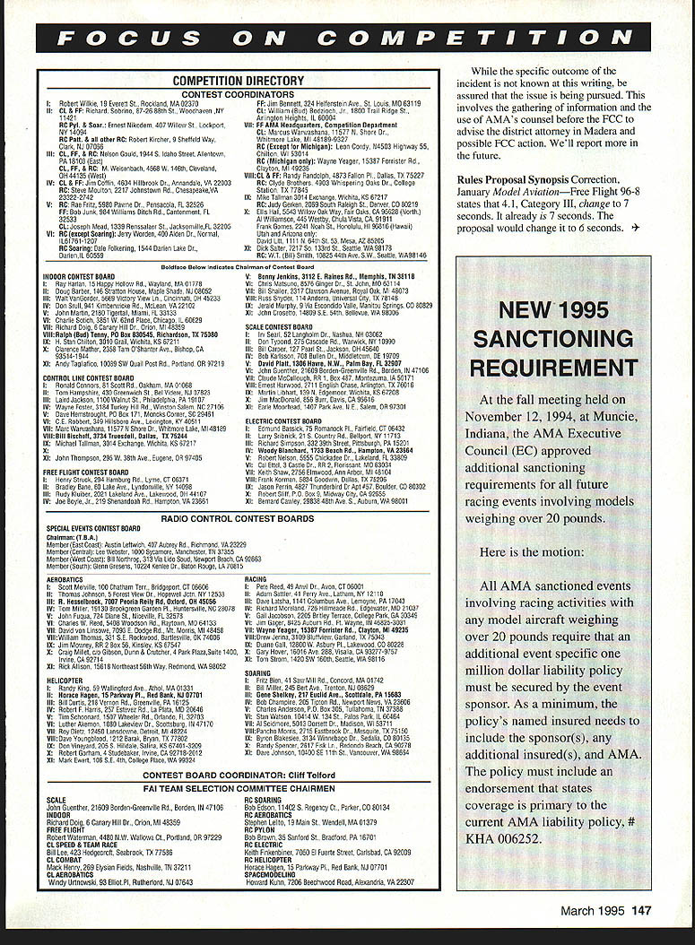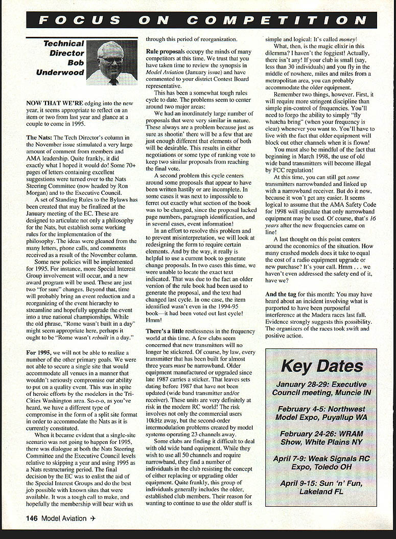 Technical Director Bob Underwooi NOW THAT WERE edging new year seems appropriate reflect item two last year glance couple come 1995 Nats Tech Directors column November issue stimulated very large amount comment members AMA leadership Quite frankly did exactly what hoped would Some 70 pages letters containing excellent suggestions turned over Nats Steering Committee now headed Ron Morgan Executive Council set Standing Rules Bylaws has created may finalized January meeting EC designed articulate philosophy Nats establish some working rules implementation philosophy ideas gleaned letters phone calls comments received result November column Some new policies will implemented 1995 instance Special Interest Group involvement will occur new award program will used just two sure changes Beyond time will probably bring event reduction reorganizing event hierarchy streamline hopefully upgrade event true national championships old phrase Rome wasnt built day might seem appropriate perhaps ought Rome wasnt rebuilt day 1995 will able realize number other primary goals able secure single site would accommodate venues manner wouldnt seriously compromise ability put quality event spite heroic efforts modelers Tri Cities Washington area So-o-o youve heard have different type compromise form split site format order accommodate Nats currently constituted became evident single-site scenario going happen 1995 dialogue both Nats Steering Committee Executive Council levels relative skipping year using 1995 Nats restructuring period final decision EC enlist aid Special Interest Groups best job possible known sites available tough call make hopefully membership will bear us through period reorganization Rule proposals occupy minds competitors time trust have taken time review synopsis Model Aviation January issue have commented district Contest Board representative has somewhat tough rules cycle date problems seem center around two major areas inordinately large number proposals very similar nature always problem because just sure shootin will few just enough different elements both will desirable results either negotiations some type ranking vote keep two similar proposals reaching final vote second problem cycle centers around some proposals appear have written hastily incomplete some cases next impossible ferret out exactly what section book changed since proposal lacked page numbers paragraph identification several cases event information effort resolve problem prevent misinterpretation will look redesigning form require certain elements way really helpful use current book generate change proposals two cases time unable locate exact text indicated due fact older version rule book used generate proposal text changed last cycle case item identified wasnt 1994-95 bookit voted out last cycle Hmm Theres little restlessness frequency world time few clubs seem concerned new transmitters will no longer stickered course law transmitter has built almost three years must narrowband Older equipment manufactured upgraded since late 1987 carries sticker leaves sets dating before 1987 have updated wide hand transmitter and/or receiver units very definitely risk modern RC world risk involves commercial users 10kHz away second-order intermodulation problems created model systems operating 23 channels away Some clubs finding difficult deal old wide band equipment wish use 50 channels require narrowband find number individuals club resisting concept either replacing upgrading older equipment Quite frankly group individuals generally includes older established club members reason wanting continue use older stuff simple logical Its called money What magic elixir dilemma havent foggiest Actually isnt club small say less 30 individuals fly middle nowhere miles miles metropolitan area can probably accommodate older equipment Remember two things however First will require stringent discipline simple pin-control frequencies Youll need forgo ability simply fly whatcha bring frequency clear whenever want Youll have live fact older equipment will block out other channels flown must also mindful fact beginning March 1998 use old wide band transmitters will become illegal FCC regulation time can still get some transmitters narrowbanded linked up narrowband receiver now because wont get easier seems logical assume AMA Safety Code 1998 will stipulate narrowband equipment may used course thats 16 years after new frequencies came line last thought point centers around economics situation crashed models does take equal cost radio equipment upgrade new purchase Its call Hmm. havent addressed safety end have tag month may have heard about incident involving what purported have purposeful interference Madera races last fall Evidence strongly suggests possibility organizers races took swift positive action 146 Model Aviation bert Wilkie 19 Everett St Rockland MA 02370 II CL & FF Richard Sobrino 87-26 88th St Woodhaven NY 11421 RC Pyl & Soar Ernest Nikodem 407 Willow St Leckport NY 14084 RE Pail & other AC Robert Kircher 9 Shetteld Way Clark NJ 07066 Ill CL FF & RC Nelson Gould 19445 Idaho Street Allentown PA 18103 East CL FF & RC M Weloenbach 4568W 146th Cleveland OH 44135 Weot IV CL & FF Jim Coffir 4804 Hillbrook Dr Annandale VA 22003 RC Steve Moulton 2217 Jobootown Rd ChesapeakeVA 23322-2742 V RE Rae Fritz 5880 Pawne Penoacola FL 32526 FF Bob Junk 984 Williamo Ditch Rd Cantonment FL 32533 CL Jeseph Mead 1339 Renonalaer St JacknonvilleFL 32205 VI RE except Searing Jerry Warden 400 Alden Dr Normal LOt 781-1207 RE Soaring Dale Folkening 1544 Darien Lake Dr OurienIL 60559 INDOOR CONTEST BOARD I Ray Harlan t5 Happy Hollow Rd Wayland MA 01778 II Doug Barber 148 Stratton House Maple Shade NJ 08052 III Walt VonGsrder 5669 Victory View Ln Cincienati OH 45233 IV Don Srull 041 Kimberwicke Rd McLean VA 22102 V John Martin 2180 Tigertoil Miami FL 33133 Vt Charlie Sotich 3861 W 82nd Place Chicago L 80829 VII Richard Doig 8 Canary Hill Dr Orion Ml 48359 VIII R