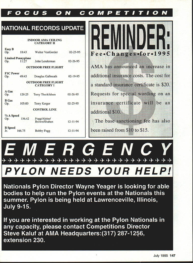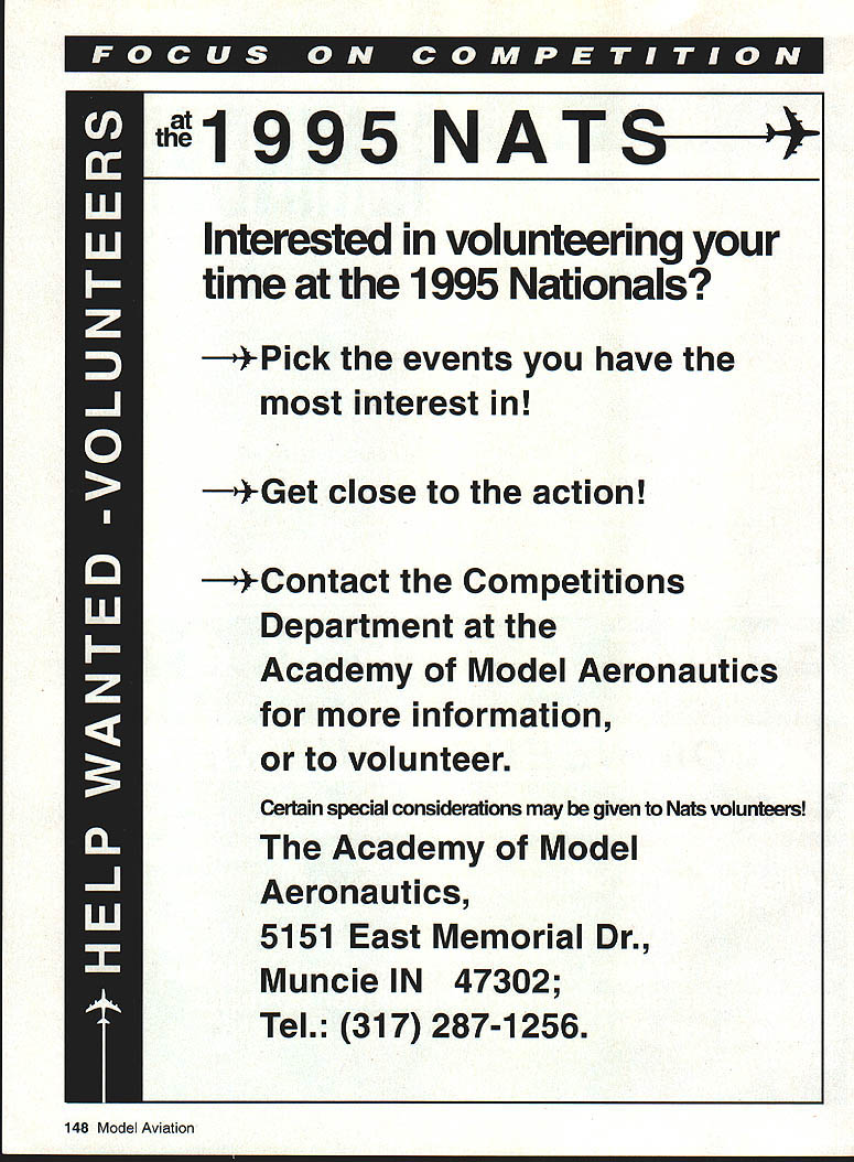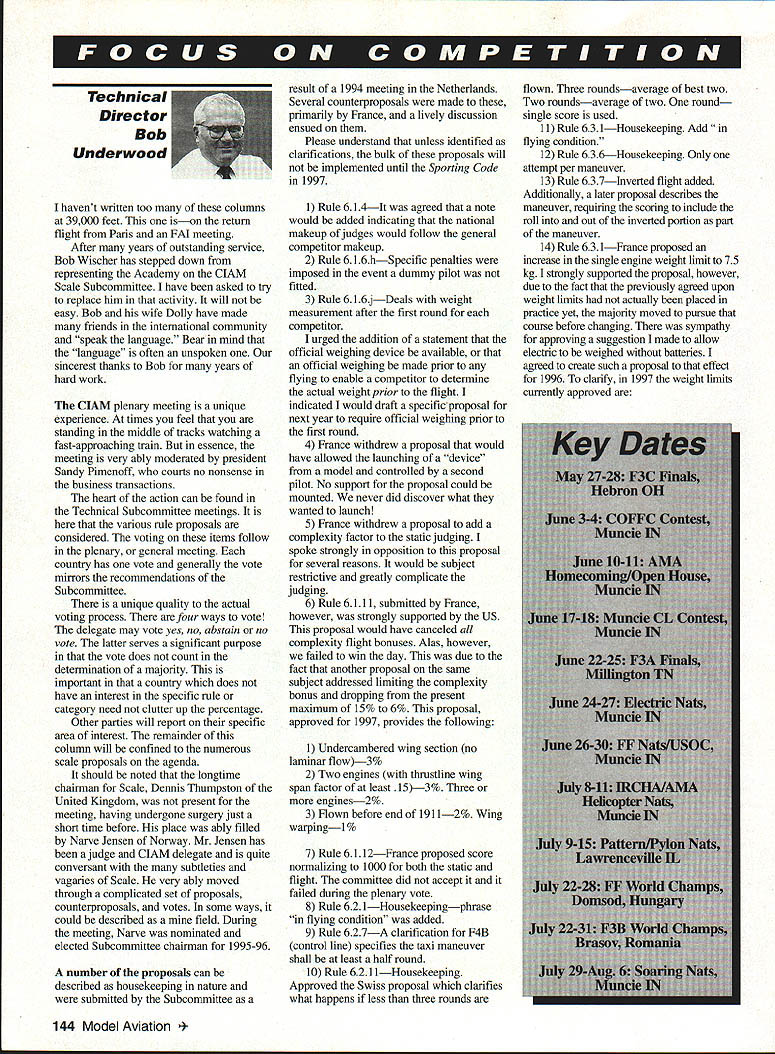 Technical Director Bob Underwood havent written too columns 39000 feet ison return flight Paris FAI meeting After years outstanding service Bob Wischer has stepped down representing Academy ClAM Scale Subcommittee have asked try replace him activity will easy Bob wife Dolly have made friends international community speak language Bear mind language often unspoken sincerest thanks Bob years hard work ClAM plenary meeting unique experience times feel standing middle tracks watching fast-approaching train essence meeting very ably moderated president Sandy Pimenoff courts no nonsense business transactions heart action can found Technical Subcommittee meetings various rule proposals considered voting items follow plenary general meeting country has vote generally vote mirrors recommendations Subcommittee unique quality actual voting process arefour ways vote delegate may vote yes no abstain no vote latter serves significant purpose vote does count determination majority important country does have interest specific rule category need clutter up percentage Other parties will report specific area interest remainder column will confined numerous scale proposals agenda should noted longtime chairman Scale Dennis Thumpston United Kingdom present meeting having undergone surgery just short time before place ably filled Narve Jensen Norway Mr Jensen has judge ClAM delegate quite conversant subtleties vagaries Scale very ably moved through complicated set proposals counterproposals votes some ways could described field During meeting Narve nominated elected Subcommittee chairman 1995-96 number proposals can described housekeeping nature submitted Subcommittee result 1994 meeting Netherlands Several counterproposals made primarily France lively discussion ensued Please understand unless identified clarifications bulk proposals will implemented until Sporting Code 1997 1 Rule 61 4It agreed note would added indicating national makeup judges would follow general competitor makeup 2 Rule 61 6hSpecific penalties imposed event dummy pilot fitted 3 Rule 61 6jDeals weight measurement after first round competitor urged addition statement official weighing device available official weighing made prior flying enable competitor determine actual weight prior flight indicated would draft specific proposal next year require official weighing prior first round 4 France withdrew proposal would have allowed launching device~ model controlled second pilot No support proposal could mounted never did discover what wanted launch 5 France withdrew proposal add complexity factor static judging spoke strongly opposition proposal several reasons would subject restrictive greatly complicate judging 6 Rule 6111 submitted France however strongly supported US proposal would have canceled complexity flight bonuses Alas however failed win day due fact another proposal same subject addressed limiting complexity bonus dropping present maximum 15% 6% proposal approved 1997 provides following 1 Undercambered wing section no laminar flow3% 2 Two engines thrustline wing span factor least 1 53% Three engines2% 3 Flown before end 19112% Wing warpingi % 7 Rule 6112France proposed score normalizing 1000 both static flight committee did accept it failed during plenary vote 8 Rule 621Housekeepingphrase flying condition added 9 Rule 627A clarification F4B control line specifies taxi maneuver shall least half round 10 Rule 6211Housekeeping Approved Swiss proposal clarifies what happens less three rounds flown Three roundsaverage best two Two roundsaverage two roundsingle score used 11 Rule 631Housekeeping Add flying condition 12 Rule 636Housekeeping Only attempt per maneuver 13 Rule 637Inverted flight added Additionally later proposal describes maneuver requiring scoring include roll out inverted portion part maneuver 14 Rule 631France proposed increase single engine weight limit 75 kg strongly supported proposal however due fact previously agreed upon weight limits actually placed practice yet majority moved pursue course before changing sympathy approving suggestion made allow electric weighed batteries agreed create such proposal effect 1996 clarify 1997 weight limits currently approved 144 Model Aviation le engine7 kg Electric75 kg Twin-engine8 kg twoengines9 kg 15 Judges guideScale Subcommittee states 20 minutes should available static judging debated should must 20 minutes 16 Judges guideFrance statement accepted static judges will discuss item team attempt arove unanimously agreed score item although will retain right differ Huh still feel cant serve both masters rules 17 Organizers Guidefor F4B safety area added beyond flight circle 18 host housekeeping items Rule 6279 F4BTaxi demo must occur after flight B Wind direction removed F4C maneuvers C 637pSimple maneuvers such procedure turn climbing turn descending turn acceptable aerobatic type aircraft D Rule 6361If model flies retractable gear down total flight score shall reduced 10% 19 supplement Sporting Code changes made specifications large RC Hying Scale dummy pilot included overall weight references minimum weight deleted 20 completely rewritten set Peanut Scale rules adopted overly complicated set outdoor rubber scale rules rejected few significant advances made opening up rules However must remembered Sporting Code operates four-year cycle Thenextbookis 1997 Next year willbethelastopportunitytomodifythe 1997 book intend write up several proposals next year will distribute Scale community Input field would helpful also have copy preliminary bulletin World Championships France next year would like copy contact Box 40 St Peters MO 63376 Tel 314 4474235 contact Teresa McKee AMA Headquarters Lambert Intemational about hour away movie Stargote interjected itself writing column However able drag document back through time warp us Lets hope will able share some time August selecttheF4B F4C teams forthe 1996 WC France Building Scale model rigid FAd specifications real challenge However gre