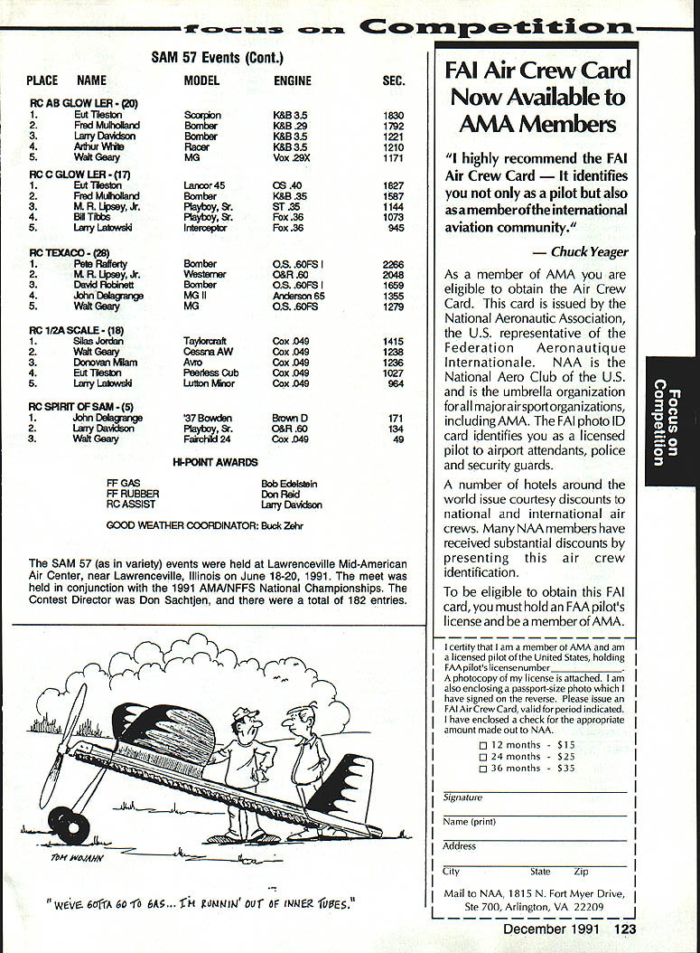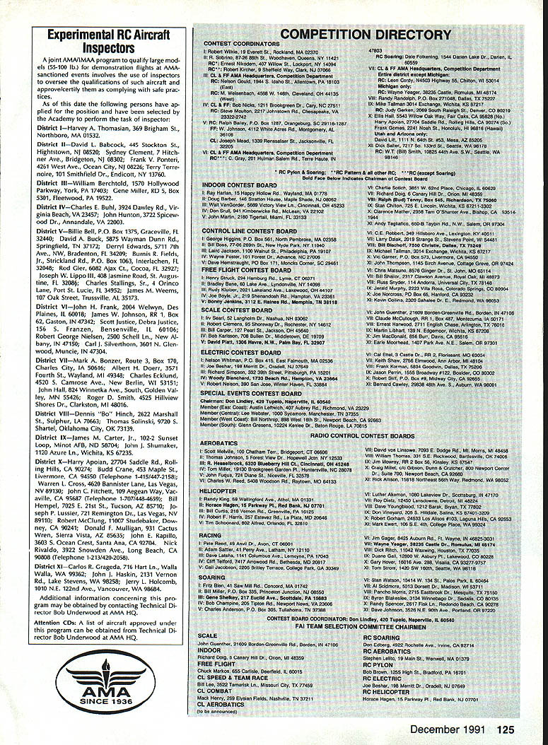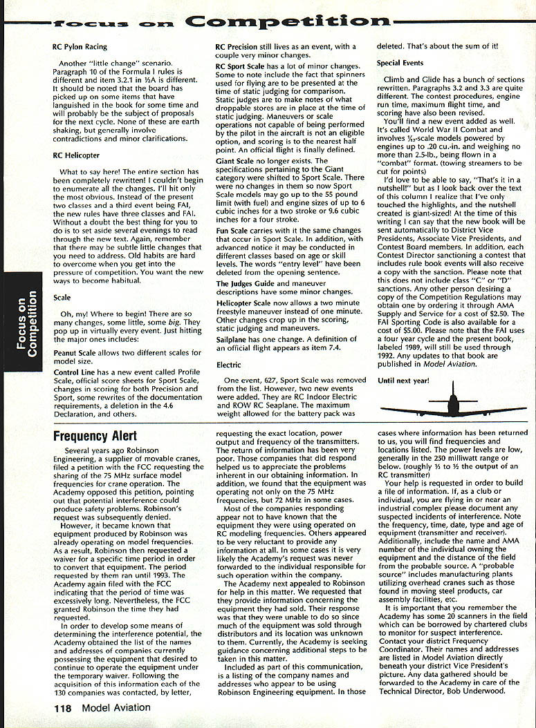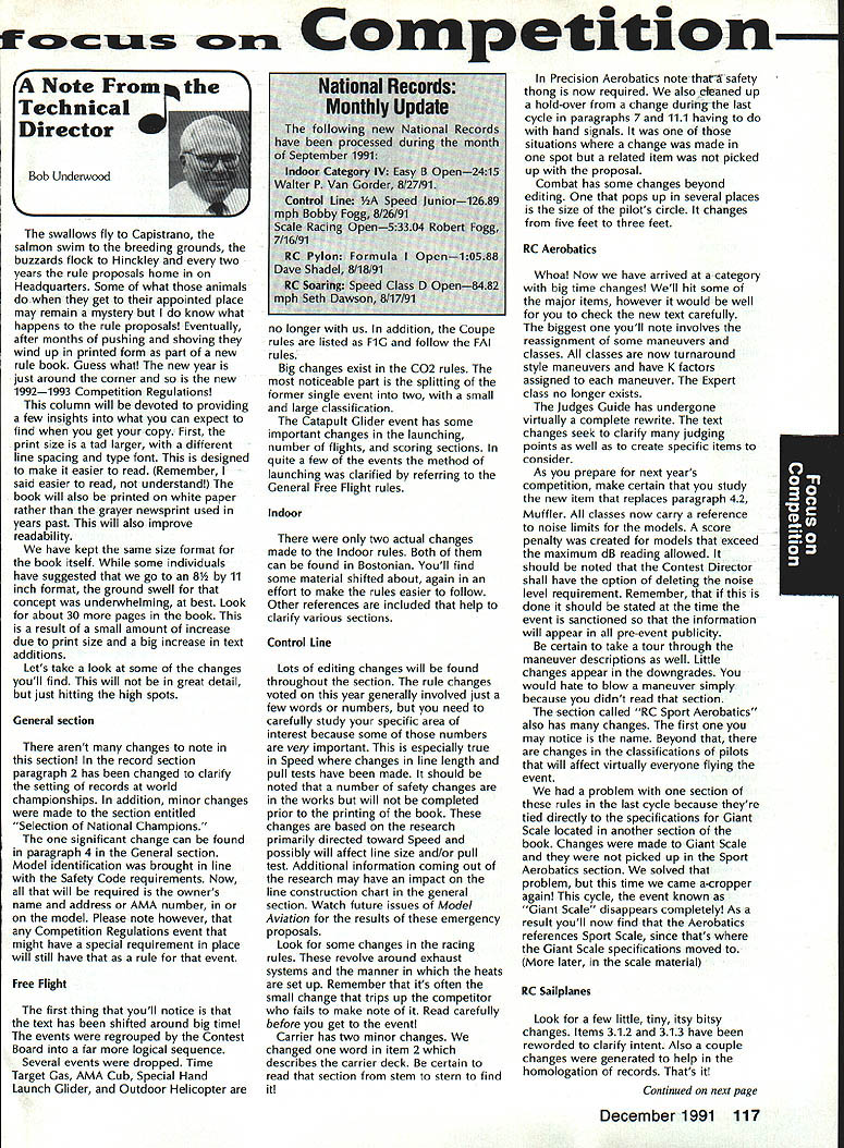 Competition Note Fromthe nical Director Bob Underwood swallows fly Capistrano salmon swim breeding grounds buzzards flock Hinckley two years rule proposals home Headquarters Some what animals get appointed place may remain mystery know what happens rule proposals Eventually after months pushing shoving wind up printed form part new rule book Guess what new year just around corner new 19921993 Competition Regulations column will devoted providing few insights what can expect find get copy First print size tad larger different line spacing type font designed make easier read Remember said easier read understand book will also printed white paper rather grayer newsprint used years past will also improve readability have kept same size format book itself some individuals have suggested go 8/2 11 inch format ground swell concept underwhelming best Look about 30 pages book result small amount increase due print size big increase text additions Lets take look some changes youll find will great detail just hitting high spots General section arent changes note section record section paragraph 2 has changed clarify setting records world championships addition minor changes made section entitled Selection National Champions significant change can found paragraph 4 General section Model identification brought line Safety Code requirements Now will required owners name address AMA number model Please note however Competition Regulations event might have special requirement place will still have rule event Free Flight first thing youll notice text has shifted around big time events regrouped Contest Board far logical sequence Several events dropped Time Target Gas AMA Cub Special Hand Launch Glider Outdoor Helicopter no longer us addition Coupe rules listed FiG follow FAI rules Big changes exist C02 rules noticeable part splitting former single event two small large classification Catapult Glider event has some important changes launching number flights scoring sections quite few events method launching clarified referring General Free Flight rules Indoor two actual changes made Indoor rules Both can found Bostonian Youll find some material shifted about again effort make rules easier follow Other references included help clarify various sections Control Line Lots editing changes will found throughout section rule changes voted year generally involved just few words numbers need carefully study specific area interest because some numbers veiy important especially true Speed changes line length pull tests have made should noted number safety changes works will completed prior printing book changes based research primarily directed toward Speed possibly will affect line size and/or pull test Additional information coming out research may have impact line construction chart general section Watch future issues Model Aviation results emergency proposals Look some changes racing rules revolve around exhaust systems manner heats set up Remember its often small change trips up competitor fails make note Read carefully before get event Carrier has two minor changes changed word item 2 describes carrier deck certain read section stem stern find Precision Aerobatics note safety thong now required also efEaned up hold-over change duringthe last cycle paragraphs 7 111 having hand signals situations change made spot related item picked up proposal Combat has some changes beyond editing pops up several places size pilots circle changes five feet three feet RC Aerobatics Whoa Now have arrived category big time changes Well hit some major items however would well check new text carefully biggest youll note involves reassignment some maneuvers classes classes now turnaround style maneuvers have K factors assigned maneuver Expert class no longer exists Judges Guide has undergone virtually complete rewrite text changes seek clarify judging points well create specific items consider As prepare next years competition make certain study new item replaces paragraph 42 Muffler classes now carry reference noise limits models score penalty created models exceed maximum dB reading allowed should noted Contest Director shall have option deleting noise level requirement Remember done should stated time event sanctioned information will appear pre-event publicity certain take tour through maneuver descriptions well Little changes appear downgrades would hate blow maneuver simply because didnt read section section called RC Sport Aerobatics also has changes first may notice name Beyond changes classifications pilots will affect virtually everyone flying event problem section rules last cycle because theyre tied directly specifications Giant Scale located another section book Changes made Giant Scale picked up Sport Aerobatics section solved problem time came a-cropper again cycle event known Giant Scale disappears completely As result youll now find Aerobatics references Sport Scale since thats Giant Scale specifications moved later scale material RC Sailplanes Look few little tiny itsy bitsy changes Items 312 313 have reworded clarify intent Also couple changes generated help homologation records Thats Continued next page December 1991 117 RC Pylon Racing Another little change scenario Paragraph 10 Formula rules different item 321 AA different should noted board has picked up some items have languished book some time will probably subject proposals next cycle None earth shaking generally involve contradictions minor clarifications RC Helicopter What say entire section has completely rewritten couldnt begin enumerate changes Ill hit obvious Instead present two classes third event being FAI new rules have three classes FAI Without doubt best thing to set aside several evenings read through new text Again remember may subtle little changes need address Old habits hard overcome get pressure competition want new ways become habitual Scale Oh begin changes some little some big pop up virtually event Just hitting major ones includes Peanu