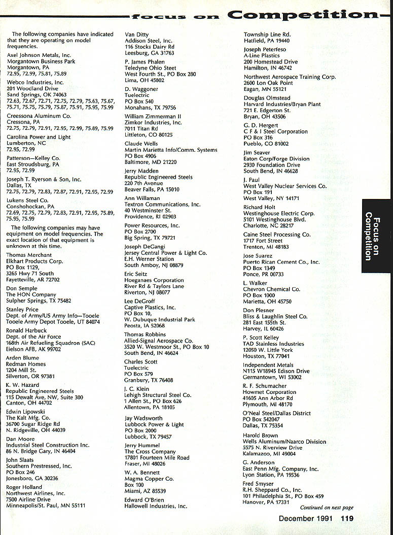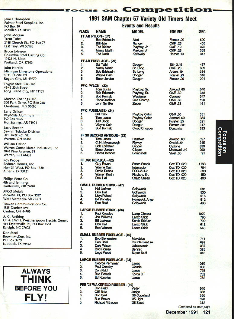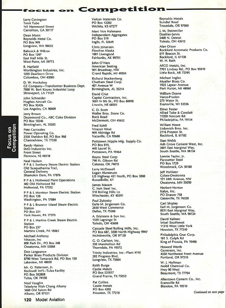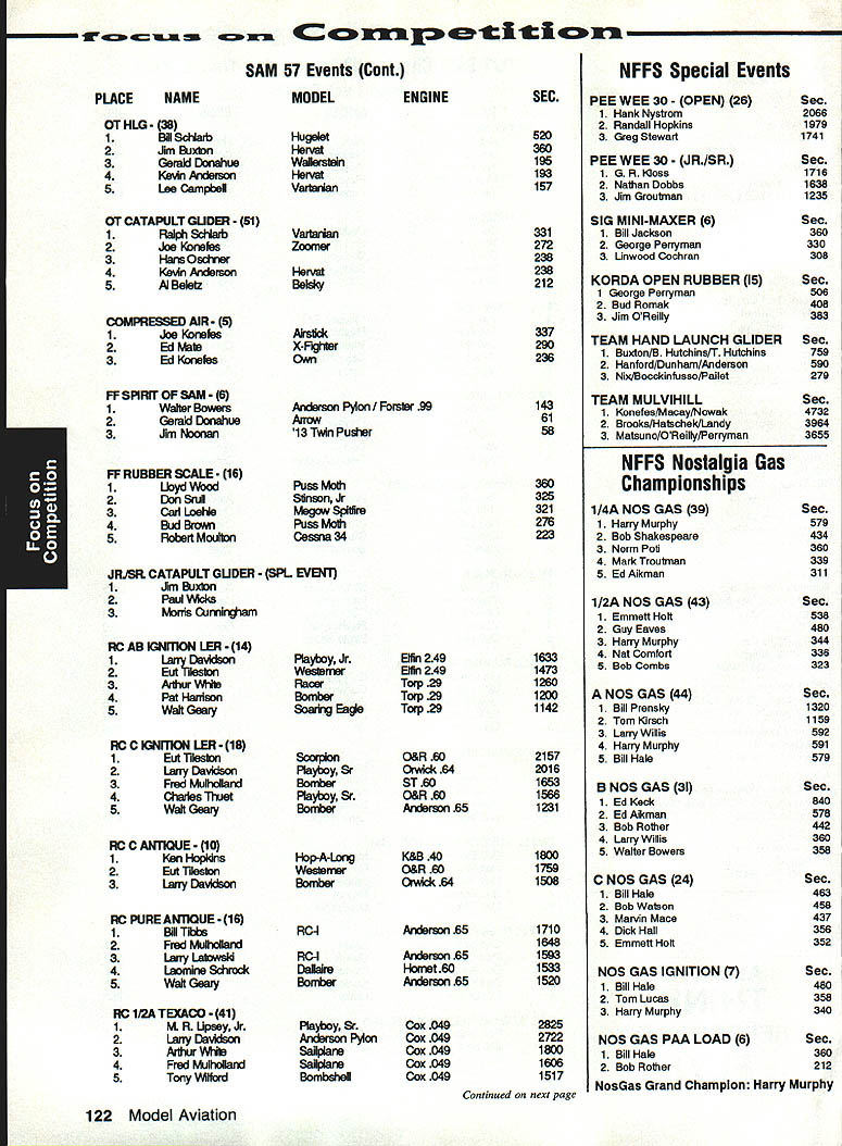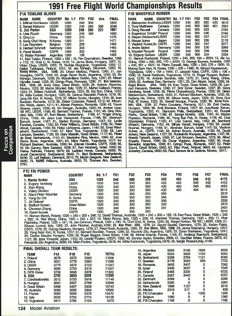 Competition Note Fromthe nical Director Bob Underwood swallows fly Capistrano salmon swim breeding grounds buzzards flock Hinckley two years rule proposals home Headquarters Some what animals get appointed place may remain mystery know what happens rule proposals Eventually after months pushing shoving wind up printed form part new rule book Guess what new year just around corner new 19921993 Competition Regulations column will devoted providing few insights what can expect find get copy First print size tad larger different line spacing type font designed make easier read Remember said easier read understand book will also printed white paper rather grayer newsprint used years past will also improve readability have kept same size format book itself some individuals have suggested go 8/2 11 inch format ground swell concept underwhelming best Look about 30 pages book result small amount increase due print size big increase text additions Lets take look some changes youll find will great detail just hitting high spots General section arent changes note section record section paragraph 2 has changed clarify setting records world championships addition minor changes made section entitled Selection National Champions significant change can found paragraph 4 General section Model identification brought line Safety Code requirements Now will required owners name address AMA number model Please note however Competition Regulations event might have special requirement place will still have rule event Free Flight first thing youll notice text has shifted around big time events regrouped Contest Board far logical sequence Several events dropped Time Target Gas AMA Cub Special Hand Launch Glider Outdoor Helicopter no longer us addition Coupe rules listed FiG follow FAI rules Big changes exist C02 rules noticeable part splitting former single event two small large classification Catapult Glider event has some important changes launching number flights scoring sections quite few events method launching clarified referring General Free Flight rules Indoor two actual changes made Indoor rules Both can found Bostonian Youll find some material shifted about again effort make rules easier follow Other references included help clarify various sections Control Line Lots editing changes will found throughout section rule changes voted year generally involved just few words numbers need carefully study specific area interest because some numbers veiy important especially true Speed changes line length pull tests have made should noted number safety changes works will completed prior printing book changes based research primarily directed toward Speed possibly will affect line size and/or pull test Additional information coming out research may have impact line construction chart general section Watch future issues Model Aviation results emergency proposals Look some changes racing rules revolve around exhaust systems manner heats set up Remember its often small change trips up competitor fails make note Read carefully before get event Carrier has two minor changes changed word item 2 describes carrier deck certain read section stem stern find Precision Aerobatics note safety thong now required also efEaned up hold-over change duringthe last cycle paragraphs 7 111 having hand signals situations change made spot related item picked up proposal Combat has some changes beyond editing pops up several places size pilots circle changes five feet three feet RC Aerobatics Whoa Now have arrived category big time changes Well hit some major items however would well check new text carefully biggest youll note involves reassignment some maneuvers classes classes now turnaround style maneuvers have K factors assigned maneuver Expert class no longer exists Judges Guide has undergone virtually complete rewrite text changes seek clarify judging points well create specific items consider As prepare next years competition make certain study new item replaces paragraph 42 Muffler classes now carry reference noise limits models score penalty created models exceed maximum dB reading allowed should noted Contest Director shall have option deleting noise level requirement Remember done should stated time event sanctioned information will appear pre-event publicity certain take tour through maneuver descriptions well Little changes appear downgrades would hate blow maneuver simply because didnt read section section called RC Sport Aerobatics also has changes first may notice name Beyond changes classifications pilots will affect virtually everyone flying event problem section rules last cycle because theyre tied directly specifications Giant Scale located another section book Changes made Giant Scale picked up Sport Aerobatics section solved problem time came a-cropper again cycle event known Giant Scale disappears completely As result youll now find Aerobatics references Sport Scale since thats Giant Scale specifications moved later scale material RC Sailplanes Look few little tiny itsy bitsy changes Items 312 313 have reworded clarify intent Also couple changes generated help homologation records Thats Continued next page December 1991 117 RC Pylon Racing Another little change scenario Paragraph 10 Formula rules different item 321 AA different should noted board has picked up some items have languished book some time will probably subject proposals next cycle None earth shaking generally involve contradictions minor clarifications RC Helicopter What say entire section has completely rewritten couldnt begin enumerate changes Ill hit obvious Instead present two classes third event being FAI new rules have three classes FAI Without doubt best thing to set aside several evenings read through new text Again remember may subtle little changes need address Old habits hard overcome get pressure competition want new ways become habitual Scale Oh begin changes some little some big pop up virtually event Just hitting major ones includes Peanu