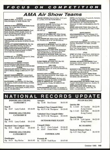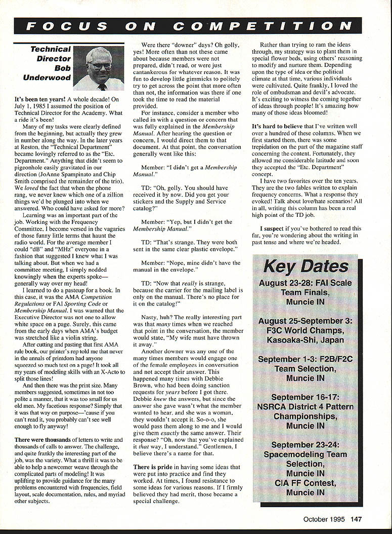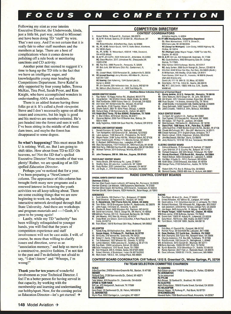 Technical Director Bob Underwood Its ten years whole decade July 1 1985 assumed position Technical Director Academy What ride its tasks clearly defined beginning actually grew number along way later years Reston Technical Department became lovingly referred Etc Department Anything didnt seem pigeonhole easily gravitated direction JoAnne Spampinato Chip Smith comprised remainder trio loved fact phone rang never knew zillion things wed plunged answered could have asked Learning important part job Working Frequency Committee become versed vagaries funny little terms haunt radio world average member could dB MHz everyone fashion suggested knew what talking about committee meeting simply nodded knowingly experts spoke generally way over head learned pasteup book case AMA Competition Regulations FAI Sporting Code Membership Manual warned Executive Director allow white space page Surely came early days s budget stretched like violin string After cutting pasting first AMA rule book printers rep told never annals printdom anyone squeezed much text page took years modeling skills X-Acto split lines print size members suggested sometimes too polite manner too small us old men facetious response Simply way purpose cause cant read probably cant see well enough fly anyway thousands letters write thousands calls answer challenge quite franldy interesting part job variety What thrill able help newcomer weave through complicated parts modeling uplifting provide guidance problems encountered frequencies field layout scale documentation rules myriad other subjects downer days Oh golly yes often came about because members prepared didnt read just cantankerous whatever reason fun develop little gimmicks politely try get across point often information took time read material provided instance consider member called question concern fully explained Membership Manual After hearing question concern would direct document point conversation generally went like Member didnt get Membership Manual TD Oh golly should have received now Did get stickers Supply Service catalog Member Yep didnt get Membership Manual TD Thats strange both sent same clear plastic envelope Member Nope didnt have manual envelope TD Now really strange because carrier mailing label manual Theres no place catalog Nasty huh really interesting part times reached point conversation member would state wife must have thrown away Another downer times members would engage female employees conversation accept answer happened times Debbie Brown doing sanction requests years before got Debbie knew answers since answer gave wasnt what member wanted hear woman wouldnt accept So-o-o would pass along would give exactly same answer response Oh now youve explained way understand Gentlemen believe theres name pride having some ideas put practice find worked times found resistance some ideas various reasons firmly believed merit became special challenge Rather trying ram ideas through strategy plant special flower beds using others reasoning modify nurture Depending upon type idea political climate time various individuals cultivated Quite frankly loved role ombudsman devils advocate Its exciting witness coming together ideas through people Its amazing ideas bloomed Its hard believe Ive written well over hundred columns first started some trepidation part magazine staff concerning content Fortunately allowed considerable latitude soon accepted Etc Department concept have two favorites over ten years two fables written explain frequency concerns What response evoked Talk about love/hate scenarios writing column has real high point TD job suspect youve bothered read far youre wondering about writing past tense headed October1995 147 Following stint interim Executive Director Underwoods kinda just little bit part way retired Missouri have doing TD stuff wire Thats easy Im certain really fair other staff members members large host complications comes down polishing off rule book monitoring sanctions CD activity Another point seemed suggest its time hang up TD title fact have intelligent eager knowledgeable young man heading Competitions Department Steve Kaluf ably supported four young ladies Teresa McKee Tina Pool Sarah Pryor Kim Knight have accomplished wonders understanding AMA modelers added feature having folks go Its called afresh viewpoint Steve dont necessarily agree issues concerns logic good motives member-oriented Hes just headed forest sees well Ive sitting middle darn trees maybe forest has disappeared some degree So whats happening must mean Bob U retiring Well no am going shift titles about TD ED Oh heavens no ED thats spelled Executive Director Nine months plenty Rather speaking ED spelled Education Director Perhaps youve noticed year Ive preparing NewComers column appearance column has brought forth new programs renewed interest fostering youth activities keep talking about some exciting things now beginning work including interactive network developed through Ball State University workshops program materials - Gosh its great young again Lastly TD authority has willingly relinquished younger hands will find years competition experience staff involvement will cast aside will course willing clarify issues direction serve association memory help us move constructive positive fashion Im tied past Im definitely afraid say dont know Whoops Im wrong CONTEST COORDINATORS IRobed Wilkie 19 Eserelt St Backland MA 02370 IICL & FF Richard Sobrira 87-26 88th St Woadhasen NY 11421 BC Robed Kircher 0 SheReid Way Clark NJ 07066 IIICL & BC Neloac Sasld 19440 Idaho Street Allertawo PA 18103 Raat CL PF & BC M Weiseobach 4568 W 146th Cleselard OH 44135 Weaa IVCL & FF Jim CaRlo 4694 Hillbroak Dr Aerardale VA 22003 BC Stoat Maultac 2217 Jahoatawa Rd CheaapeakeVA 23322-2762 8BC Rae Fritz 5980 Pawee Dr Pensacola FL 32526IX PF Bob Jack 984 Williama 00cR Rd Cartenmect FL 32533 CL Jateph Mead 1339 Benocaloer St JackoaroilleFL 32205 VIBC except Soaring Jerry Warder 400 Alder Dr N