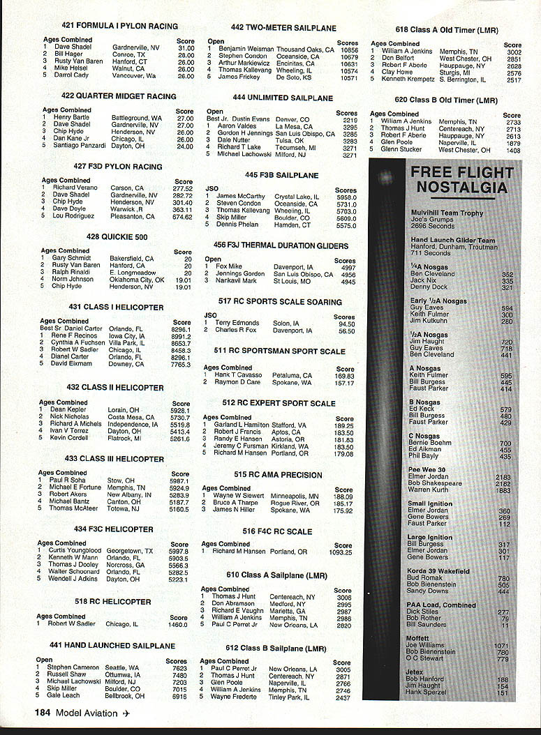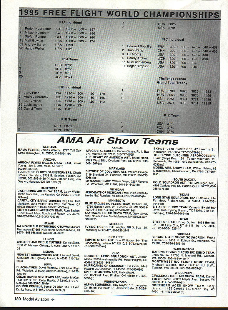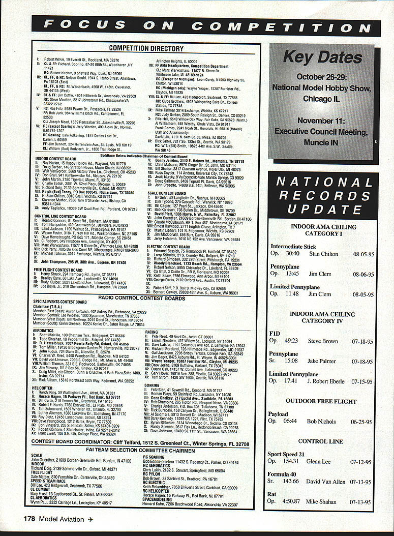 COMPETITION DIRECTORY I Robert Wilkie 19 Everett St Rockland MA 02370 II Ci & FF Richard Sobrino 87-26 88th St Woodhaven NV 11421 RC Robert Kirctrer 9 Shetteld Way Clark NJ 07066 iti CL PP & AC Nelson Gould 1944 S Idaho Street Allentown PA 10t03 East Ci PP & AC M Weiseobach 4568W 146th Clovoland 0044135 West IV CL & FP Jior Coffin 4604 Hillbreok Dr Annandale VA 22003 AC Steve Moulton 2217 Johnstown Rd ChetapoakeIIA 23322-2762 8 AC Rae Fritz 5880 Pawne Dr Peonacola FL 32526 PP Bob Junk 984 Williams Ditch Rd Cattonment FL 32533 CL Joseph Mood 1339 Renooalaer St JackoonuilleFL 32205 Vi AC except Searing Jerry Worden 400 Alden Dr Normal 1L61761-t 207 AC Soaring Dale Falkening t544 Dariet Lake Dr DarienIL 60559 FP Jim Bennett 324 Heltenstein Ave St Louis MD 63119 CL William Bud Bodnioch Jr 1800 Trail Ridge St Arlington Otights IL 68804 Vii PP AMA Headqoeelors Cempeililue Deparimeni CL Marc Warwashana 11577 N Shore Dr Whitmore Lake Ml 48189-91 24 AC Except mr Michigan Leon Cordy 94903 l-lighway 55 Chilton WI 53014 AC Michigan Only Wayne Veager 15387 yvrristor Rd Clayton Ml 49235 Blit CL & PF Bill Lee 423 Hedgecrott Seabrook TO 77586 AC Clyde Brothers 4983 Whispering Oaks Dr College Station TX 77845 ix Mike Tallman 3814 Exchange Wichita KS 67217 AC Judy Gerken 2069 South Raleigh St Denner CD 80219 X Ellit Hall 5543 Willow Oak Way Fair Oaks CA 95628 North Al Williamson 445 Westhy Chula Viola CA 91911 Frank Gomes 2241 Nash St Honolulu HI 98816 Hawaii Utah Arinana Only Ovoid LiD 1111 N 64th St 53 Mesa AZ 85285 Xi Dick Salter 7217 So 133rd St Seattle WA 98178 AC WT Bill Smith 19825 44th Ave SW Seattle WA 98146 Boldface Below IndIcates Chairmen Content Board INOODA CONTEST BOAAOVBonny Jenkins 3112 E Romeo Ad MemphIs TN 39115 Ray Harlan 15 Happy Hollow Rd Woyland MA 01778ViChris Mutoano 8576 Ginger Dr. St John MO 63114 iiDoug 8arher 146 Stratton Huase Maple Shade NJ 08052ViiBill Shailar 2317 Clawoan Avenue Ropul Oak Ml 48073 iiiWalt VanGorder 5669 Victory View [5 Cincinnati 0045233Viii Russ Snyder 114 Andura Universal City TX 78148 8Don GraIl 941 Kimberwicke Rd McLean VA 22102iXJeraldMurphyStdaErnmsJoVaneMmitossprlngsCOW83o VJobs Martin 2180 Tigertail Miami FL 33133XDoug Gulbreath 3488 Topsail Fl Davis CA 95616 ViCharlie Sotich 3851 W 62od Place Chicago IL 60629XiJohn Crosetto 14889 56 54th Bellevae WA 98906 ViiRichard Doig 2139 Sommerville Dr Outord Ml 48371 Viii Aoiph Bod Toony P0 Box B3B545 Richardson TX 7SBBBSCALE CONTEST BOAAO iXH Stan Chilton 3010 Grail Wichita KS 67211iin Sean 52 Langholm Dr Nashua NH 03062 XClarence Mather 2358 Tam OShanter Ave Bishop CAiiDon Typond 275 Cascade Rd Warwick NY 10990 93514-1944iiiBill Carper 127 Pearl St Jackson OH 45648 XiAndy Tagliatico lGO39SWQuail Post Rd Portland 0997219iVBob Karlsson 708 Bullen Dr Middletown DC 19709 9Sanid Pialt 1306 Neore NW Paim Bay FL32BB7 CONTAOL LiNE CONTEST BOARDViJohn Guenther 21689 Burden-Greenville Rd Borden 1947106 Ronald Connors 81 Scott Rd Dakham MA 01068ViiClaude McCullough 991 Boo 487 Montezuma IA 50171 iiTom Hampshire 439 Greenwich Si Belvidere NJ 07023Viii Ernest Harmood 2711 English Chase Arlington TX 7 iiiLaird Jackson 1109 Walnut St Philadelphia PA 10107tXMartin Libbart 1919 Edgemoor Wichita KS 67200 iVWayne Foster 3164 Torkey Hill Rd Winston Salem NC 27106XJim MacDonald 856 Barr Davis CA 95616 9Dave Hemotroaght PD Boo 171 Moocko Corner 0029461XiJerry Holcomb 181096122 Aye Vancouver WA 90684 ViC Robbert 349 Hillsboro Ave Leningion KY 40511 ViiMarc Warwaohana 11577 N Shore Dr WhitmureLake Ml 40189ELECTRiC CONTEST BOARD Viii Dick Perry 7005 Del Don Coart NE Albuquerque NM 87109-2930iEdmund Bassick 75 Romanock Fl Fairfield CT 06432 iXMichael Tallman 3014 Eachange Wichita KS 67217iiLarry Sciboick 21 5 Ceantry Rd Beliport NY 11713 iiiRichard Simpson 332 39th Street Pittsbargh PA 15201 XiJoho Thompson 295W 39th Ave. Eugene OR B74B5iVWoody Bloochord 1733 Beach Rd Hampton VA 23664 VRobert Nelson 5855 Chickadee Lakeland FL 33809 FREE PLIGHT CONTEST BOARDViCal Ettel 3 Castle Dr RR 2 Floriosant MO 63034 Henry Struck 294 HamburG Rd Lyme CT 06371ViiKeith Sham 2756 Elmwuod Ann Arbor Ml 48104 iiOradley Bane 60 Lake Ave Lyndonuille NY t4090Viii George Parks 2102 Doford Ave Austin TX 78704 iiiRudy Klulber 2021 Lakoland Ave Lakewood 0044107iX iVJoe Boyle Jr 219 Shenandaah Rd Hampton VA 23661XRobert Sliti PO Boo B Midway City CA 92655 XiBernard Camley 29838 48th Ave S Auburn WA 90001 RADIO CONTROL CONTEST BOARDS SPECIAL EVENTS CONTEST BOARD Chaimean TEA Member East Cuaot Austin Lettmich 407 Aubrey Rd Richmond VA 23229 Member Central Lee Webater 1000 Sycamore Manchester TN 37355 MomberWest Coast Bill Northrop 2010 Doral Ct Henderson NV 89014 Member South Glenn Gresens 10224 Kenlee Dr Baton Rouge LA 70015 AEROBATICSRACING Scott Melville 100 Chatham Terr Bridgeport CT 96606IFete Reed 49 Anvil Dr Avun CT 06001 IiTodd Sheehan 18 Peppermill Dr Fairport NY 14450iihrneot Nikodem 407 Willow St Lockyort NY 14994 iiiR Heooeihrock 7BB7 Peoria Roily Ad Dalerd OH 45056iiiDave Latoha 1141 Columbus Ave Apt 2 Lemeyne PA 17043 IVTom Miller 19130 Brnokgreen Garden Fl Hunturuville NC 28078IVRichard Moreland 726 Hilimeade Rd Edgewater MD 21037 VJohn Fuqua 724 Diane St Niceville FL 32578VGail Jacobson 2205 Britley Terrace College Pork GA 30349 ViChariot W Reed S400 Woodoon Rd Raytown MO 64133ViJim Gager 8425 Asharn Rd Ft Wayne 1946025-3031 VIIDavid von Linsewe 7093 6 Dodge Rd Mt Morris Ml 48458Vii Wayne Yeagor 15357 Porrister Ad. Clayton Mi 49238 VIiiWllliam Thomas 331 SE Rockwood Bartleuville 0674000ViiiDrewJerina 3109 Osttniew Garland TX 75043 IXJim Mowrey RB 28ev 56 Kinsley KS 67547IXDuane Gall 14157W Cornell Ave Lakewood CO 00220 XCraig Millet Gibson Dunn & Crotcher 4 Park FlazaSaite 1400XGary Hover 16016 Ave 288 Visalia CA 93277-8757 CA 92714XiTom Strom 1420 SW 160th Seattle WA 98116 XiRick Aliloon 15618 Nortscast 56th Way Redmond WA 98052 HELICOPTERSOARING IFritz Bien 41 Sawmill Rd Concord MA 01742 IRandy King 59 Wallinglord Ave Athol MA 01331IIRoman Por