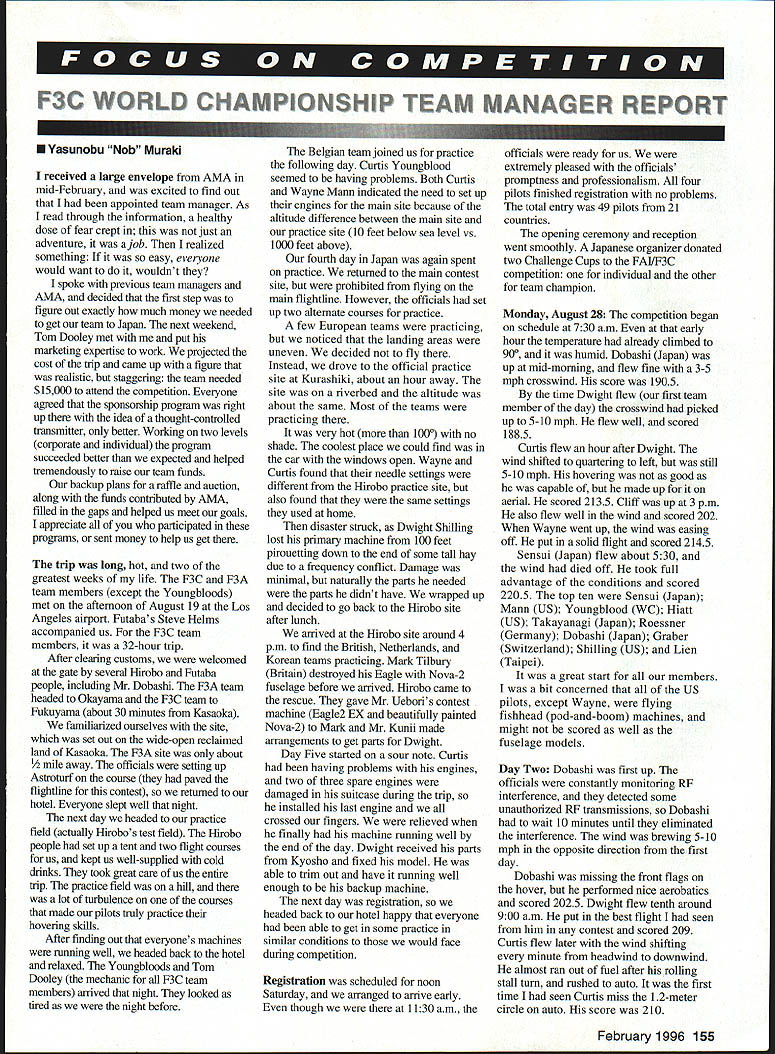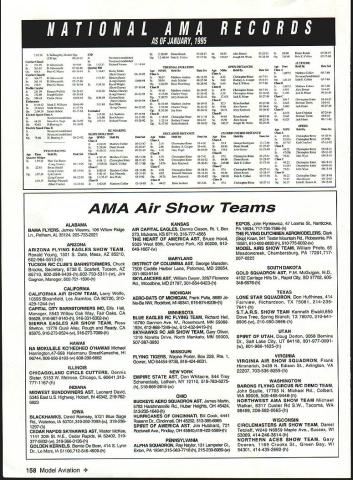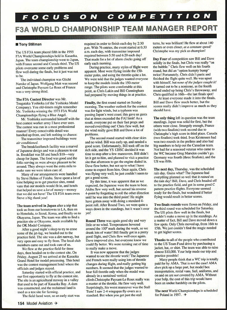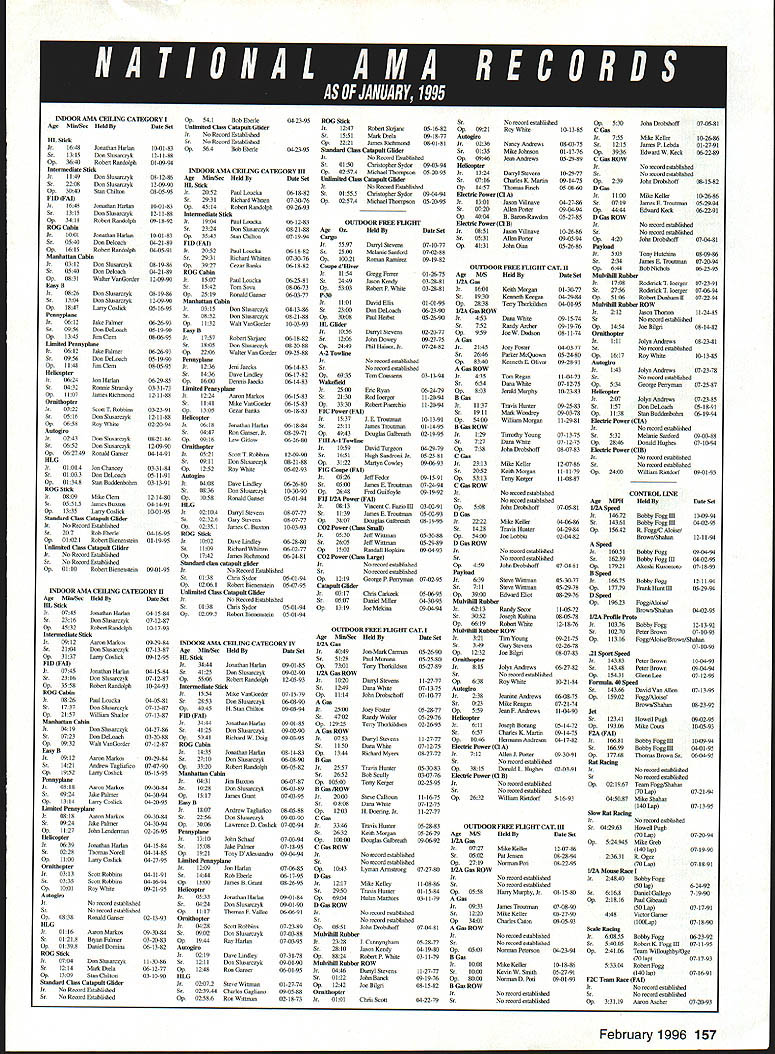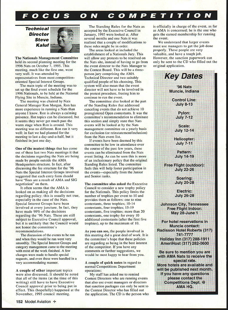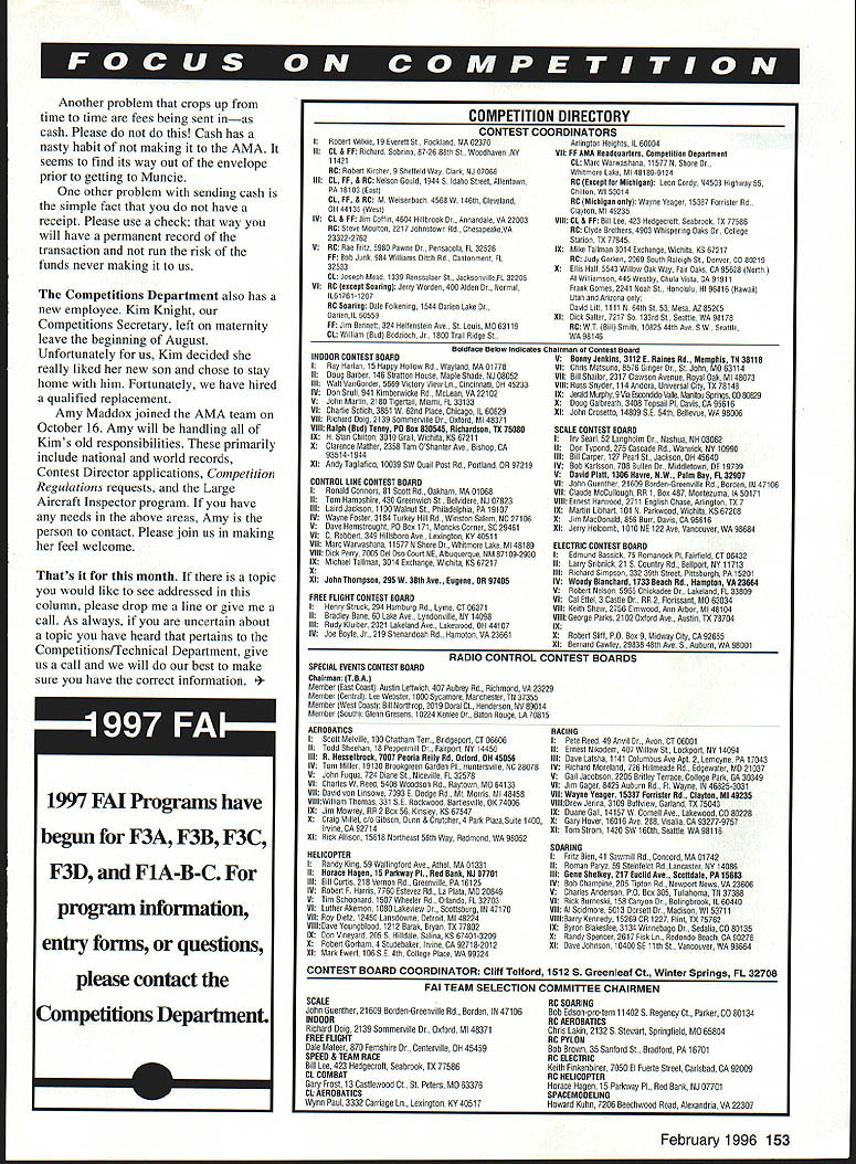 The Nationals Management Committee held its second planning meeting 1996 Nats October 7 1995 meeting much like first went very well attended representatives competitionoriented Special Interest Groups main topic meeting set up final event schedule 1996 Nationals held National Flying Site Muncie Indiana meeting chaired Nats General Manager Ron Morgan Ron has experience running Nats anyone know Ron always calming presence Hot topics can discussed seems never get much past warm stage Ron around meeting no different Ron ran very well fact planned meeting last day-and-a-half finished just day neatest things has come out last two Nats meetings decisions regarding Nats being made people outside AMA Headquarters structure fact after discussing fee structure 96 Nats Special Interest Groups involved suggested entry form should have Fees result AMA SIG negotiation often seems AMA looked making decisions regarding policy usually true especially case Nats Special Interest Groups have involved juncture fact have made 90% decisions regarding 96 Nats still subject Executive Council approval unlikely Council would honor committees recommendations discussion events run would run went very smoothly Special Interest Groups category management came meeting work finished few changes made handle special requests handled very accommodating manner couple other important topics also discussed should noted items time writing still have have Executive Council approval prior being put effect hopefully happened November 1995 council meeting Standing Rules Nats accepted Executive Council January 1995 looked After several months Nats realized couple modifications rules might order areas looked included establishment Nationals Jury will allow protests resolved Nats site instead having go event director Nats Manager Contest Board will threeperson jury comprising AMA Technical Director two suitably qualified people choosing system will also mean event director will have involved protest procedure freeing him continue run event committee also looked part Standing Rules addressed canceling events achieve 10 preregistered Open contestants committees recommendation eliminate section simply state Nats events will looked Nats management committee yearly basis exclusion reinstatement/inclusion Nats event list events have deemed committee low attendance over course past few years events can eliminated Nats event listing As can seen inclusionary policy original Standing Rules listed committee feels will help foster participation eventsespecially Junior Senior ranks committee also asked Executive Council consider new trophy policy Nationals policy limits number trophies per event 10 provides follows nine contestants three trophies 10-14 contestants four trophies 15-19 contestants five trophies 20 contestants trophy 10 additional contestants after first five trophies up maximum 10 As can see people involved meeting did great deal work committees hope policies regarding being best interest competitor have comments further suggestions would happy hear couple quick notes regard normal Competitions Department operations staff has asked remind Contest Directors running events also use event managers directors sanction packages can sent Contest Director has filled out application CD person officially charge event far AMA concerned gets earned membership running event understand larger events must use managers get job done properly people very valuable have tough job However sanction paperwork can sent CD filled out original application 152 Model Aviation nical Director Steve Kaluf Another problem crops up time time fees being sent inas cash Please Cash has nasty habit making AMA seems find its way out envelope prior getting Muncie other problem sending cash simple fact have receipt Please use check way will have permanent record transaction run risk funds never making us Competitions Department also has new employee Kim Knight Competitions Secretary left maternity leave beginning August Unfortunately us Kim decided really liked new son chose stay home him Fortunately have hired qualified replacement Amy Maddox joined AMA team October 16 Amy will handling Kims old responsibilities primarily include national world records Contest Director applications Competition Regulations requests Large Aircraft Inspector program have needs above areas Amy person contact Please join us making feel welcome Thats month topic would like see addressed column please drop line give call As always uncertain about topic have heard pertains Competitions/Technical Department give us call will best make sure have correct information 1 1997 FM Programs have begun F3A F3B F3C F3D F1A-B-C program information entry forms questions please contact Competitions Department I Robert Wilkie 18 Everett St Rockland MA 02370 Ii CL & FF Richard Sobrino 87-26 88th St Woodhavee NY 1421 AC Robert Kircher 9 Shettelrt Way Clark NJ 87088 III CL FE & RC Neisne Gould t944 S Idaho Street Allertowo PA 18183 Rant CL FE & AC M Weiserbach 4568W 146th Cleveland OH 44135 West IV CL & FE Jim Cottin 4604 Hillbrook Dr Atatedale VA 22003 AC Steve Moulton 22t7 Jahtatewn Rd ChesapeakeVA 2 332 2-2762 6 AC Rae Fritz 5880 Pawre Or. Peosacola FL 32528 FE Rob Jark 884 Williamt Ditch Rd Cartonment FL 32533 CL Joneph Mood t338 Revosaluer St JackoonvilleFL 32285 VI RC except Soaring Jerry Werdee 488 Aldet Dr Normal lL8t78t-1207 AC Soaring Dale Fnlkeeivg t544 Darieo Lake Dr DarieniL 88559 FE Jim Bevvett 324 Heltevstein Ave St [aviv MO R3t18 CL William Bud Bodzioch Jr 1888 Trail Ridge St INDODA CONTEST BOAAD I Ray Harlue 15 Happy Hollow Rd Waylund MA 81778 II Doug Barber 146 Stratton House Maple Shode NJ 88852 Ill Walt VanGorder 5869 Victory View Ln Cincinnati OH 45233 IV Don Orull 941 Kimbetwicke Rd McLean VA 22102 6 John Martin 2188 Ti9ertail Miami FL 33133 VI Charlie Sotich 3851 W 62nd Place Chicago IL 60629 VII Richard 000 2139 Sommemille Ontord Ml 48371 VIII Aalph Bed Tenny PD Boo 530845 Aichardoon TX 78