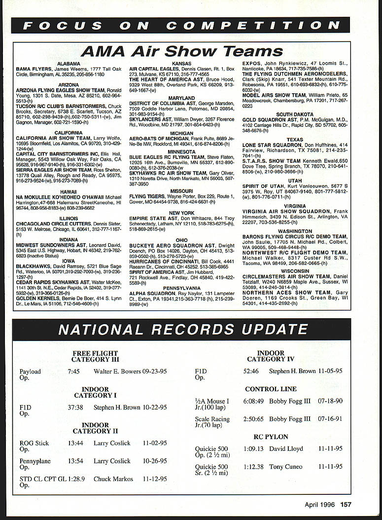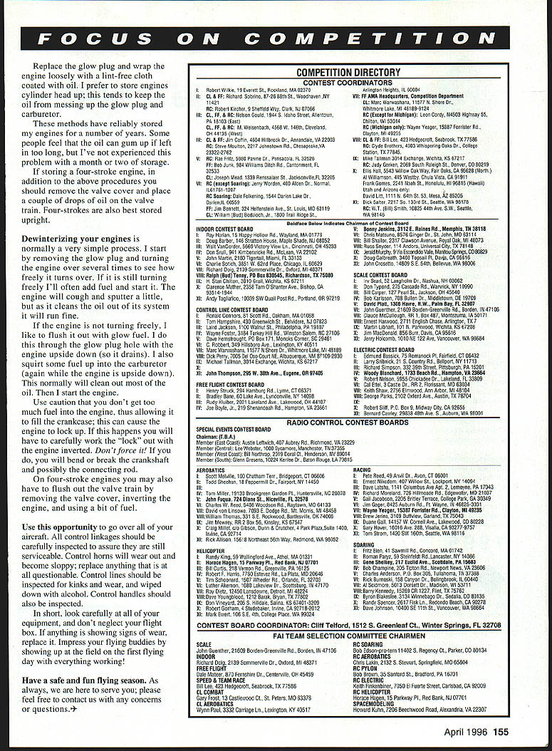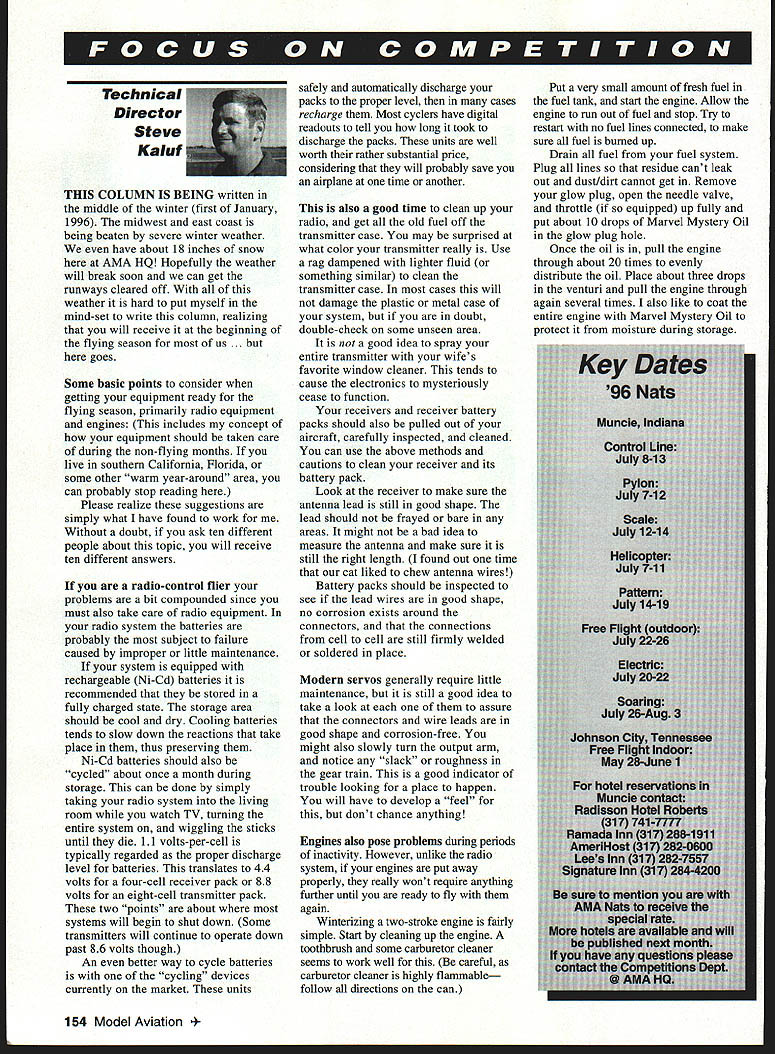 Technical Director Steve Kaluf THIS COLUMN IS BEING written middle winter first January 1996 midwest east coast being beaten severe winter weather have about 18 inches snow AMA HQ Hopefully weather will break soon can get runways cleared off weather hard put myself mind-set write column realizing will receive beginning flying season us . goes Some basic points consider getting equipment ready flying season primarily radio equipment engines includes concept equipment should taken care during non-flying months live southern California Florida some other warm year-around area can probably stop reading Please realize suggestions simply what have found work Without doubt ask ten different people about topic will receive ten different answers radio-control flier problems bit compounded since must also take care radio equipment radio system batteries probably subject failure caused improper little maintenance system equipped rechargeable Ni-Cd batteries recommended stored fully charged state storage area should cool dry Cooling batteries tends slow down reactions take place thus preserving Ni-Cd batteries should also cycled about once month during storage can done simply taking radio system living room watch TV turning entire system wiggling sticks until die 11 volts-per-cell typically regarded proper discharge level batteries translates 44 volts four-cell receiver pack 88 volts eight-cell transmitter pack two points about systems will begin shut down Some transmitters will continue operate down past 86 volts though An better way cycle batteries cycling devices currently market units safely automatically discharge packs proper level cases recharge Most cyclers have digital readouts tell long took discharge packs units well worth rather substantial price considering will probably save airplane time another also good time clean up radio get old fuel off transmitter case may surprised what color transmitter really Use rag dampened lighter fluid something similar clean transmitter case cases will damage plastic metal case system doubt double-check some unseen area good idea spray entire transmitter wifes favorite window cleaner tends cause electronics mysteriously cease function receivers receiver battery packs should also pulled out aircraft carefully inspected cleaned can use above methods cautions clean receiver its battery pack Look receiver make sure antenna lead still good shape lead should frayed bare areas might bad idea measure antenna make sure still right length found out time cat liked chew antenna wires Battery packs should inspected see lead wires good shape no corrosion exists around connectors connections cell cell still firmly welded soldered place Modern servos generally require little maintenance still good idea take look assure connectors wire leads good shape corrosion-free might also slowly turn output arm notice slack roughness gear train good indicator trouble looking place happen will have develop feel dont chance anything Engines also pose problems during periods inactivity However unlike radio system engines put away properly really wont require anything further until ready fly again Winterizing two-stroke engine fairly simple Start cleaning up engine toothbrush some carburetor cleaner seems work well careful carburetor cleaner highly flammable follow directions can Put very small amount fresh fuel fuel tank start engine Allow engine run out fuel stop Try restart no fuel lines connected make sure fuel burued up Drain fuel fuel system Plug lines residue cant leak out dust/dirt cannot get Remove glow plug open needle valve throttle equipped up fully put about 10 drops Marvel Mystery Oil glow plug hole Once oil pull engine through about 20 times evenly distribute oil Place about three drops venturi pull engine through again several times also like coat entire engine Marvel Mystery Oil protect moisture during storage 154 Model Aviation 4 Replace glow plug wrap engine loosely lint-free cloth coated oil prefer store engines cylinder head up tends keep oil messing up glow plug carburetor methods have reliably stored engines number years Some people feel oil can gum up left too long Ive experienced problem month two storage storing four-stroke engine addition above procedures should remove valve cover place couple drops oil valve train Four-strokes also best stored upright Dewinterizing engines normally very simple process start removing glow plug turning engine over several times see freely turns over still turning freely Ill often add fuel start engine will cough sputter little cleans oil out its system will run fine engine turning freely like flush out glow fuel through glow plug hole engine upside down drains also squirt some fuel up carburetor again engine upside down normally will clean out oil start engine Use caution dont get too much fuel engine thus allowing fill crankcase can cause engine lock up happens will have carefully work lock out engine inverted Don tforce you will bend break crankshaft possibly connecting rod four-stroke engines may also have flush out valve train removing valve cover inverting engine using bit fuel Use opportunity go over aircraft control linkages should carefully inspected assure still serviceable Control horns will wear out become sloppy replace anything questionable Control lines should inspected kinks wear wiped down alcohol Control handles should also inspected short look carefully equipment dont neglect flight box anything showing signs wear replace Impress flying buddies showing up field first flying day everything working Have safe fun flying season As always serve please feel free contact us concerns questions4COMPETITION DIRECTORY CONTEST COORDINATORS IRobert Wilkie 19 Everett St Rockland MA 02370Arlington Heights 60004 II CL & FF Richard Sobrino 87-26 88th Si Woodhaven NY Vii FF AMA Headquarters Competition Department 11421 CL Marc Warwathana 11577 N Share Br BC Robert Kircher 9 Shetteld Way Clark NJ 07066 Whitmore Lake Ml 481 89-9