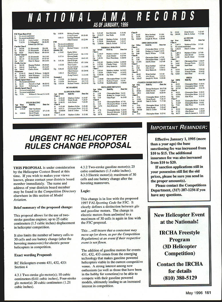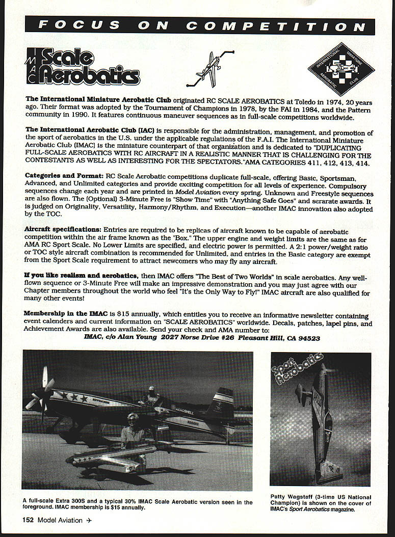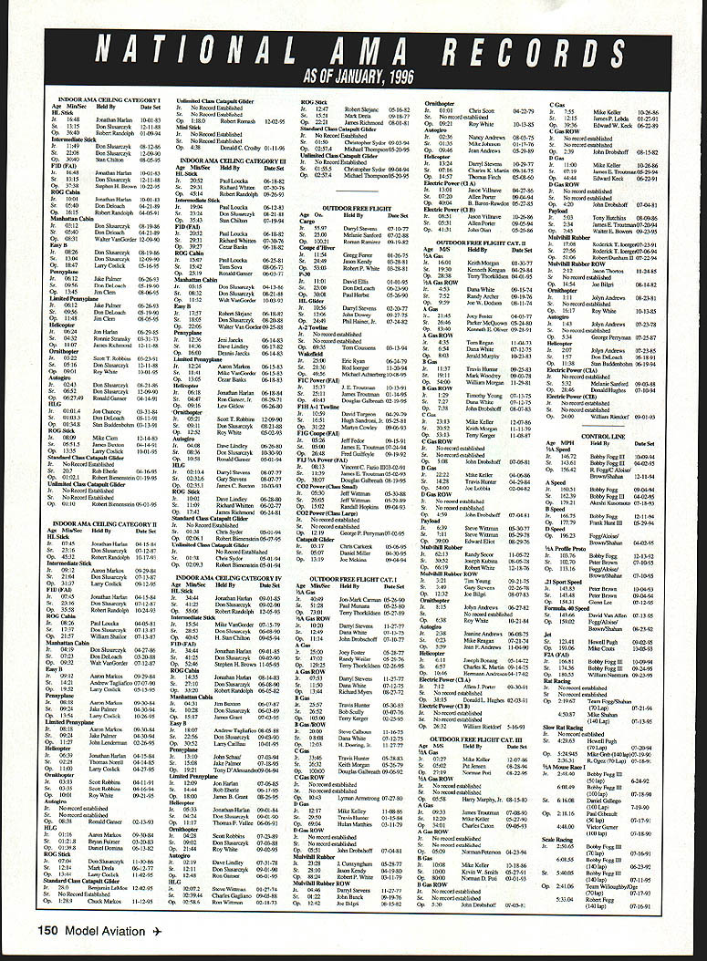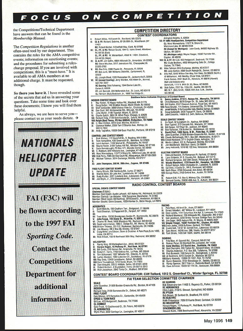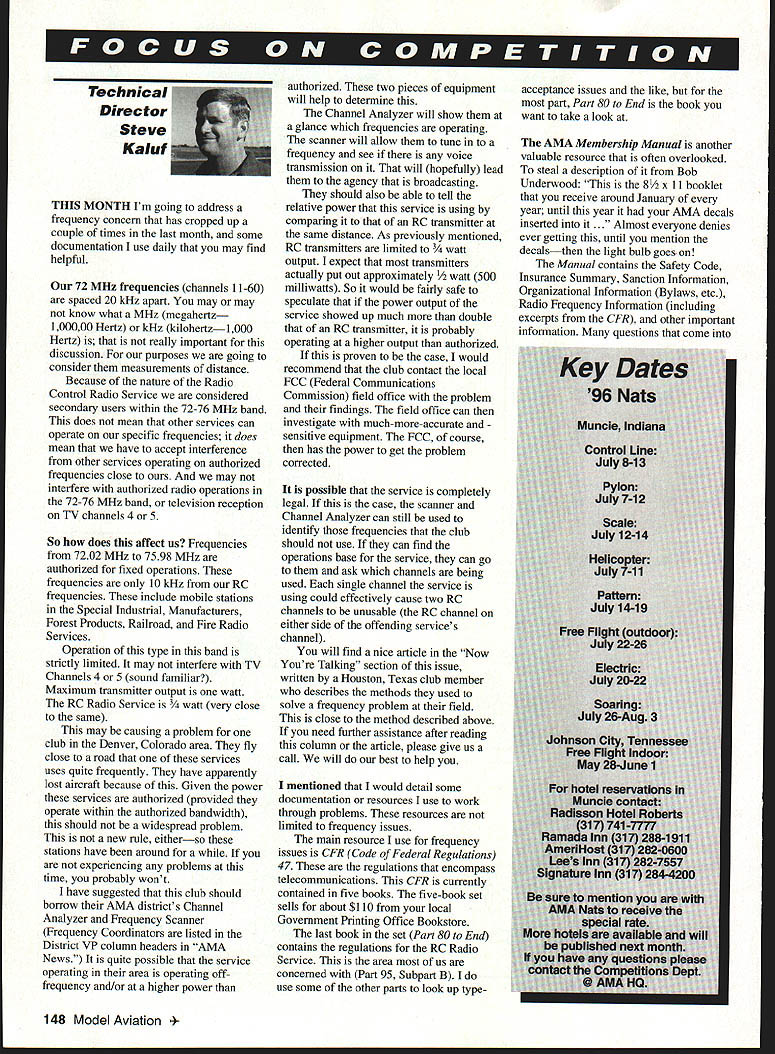 — - - m- — M m chnical Director Steve Kaluf THIS MONTH Im going address frequency concern has cropped up couple times last month some documentation use daily may find helpful 72 MHz frequencies channels 11-60 spaced 20 kHz apart may may know what MHz megahertz 100000 Hertz kHz kilohertz1000 Hertz really important discussion purposes going consider measurements distance Because nature Radio Control Radio Service considered secondary users within 72-76 MHz band does mean other services can operate specific frequencies does mean have accept interference other services operating authorized frequencies close may interfere authorized radio operations 72-76 MHz band television reception TV channels 4 5 So does affect us Frequencies 7202 MHz 7598 MHz authorized fixed operations frequencies tO kHz RC frequencies include mobile stations Special Industrial Manufacturers Forest Products Railroad Fire Radio Services Operation type band strictly limited may interfere TV Channels 4 5 sound familiar Maximum transmitter output watt RC Radio Service 3/4 watt very close same may causing problem club Denver Colorado area fly close road services uses quite frequently have apparently lost aircraft because Given power services authorized provided operate within authorized bandwidth should widespread problem new rule eitherso stations have around experiencing problems time probably wont have suggested club should borrow AMA districts Channel Analyzer Frequency Scanner Frequency Coordinators listed District VP column headers AMA News quite possible service operating area operating offfrequency and/or higher power authorized two pieces equipment will help determine Channel Analyzer will show glance frequencies operating scanner will allow tune frequency see voice transmission will hopefully lead agency broadcasting should also able tell relative power service using comparing RC transmitter same distance As previously mentioned RC transmitters limited 3/4 watt output expect transmitters actually put out approximately /2 watt 500 milliwatts So would fairly safe speculate power output service showed up much double RC transmitter probably operating higher output authorized proven case would recommend club contact local FCC Federal Communications Commission field office problem findings field office can investigate much-more-accurate sensitive equipment FCC course has power get problem corrected possible service completely legal case scanner Channel Analyzer can still used identify frequencies club should use can find operations base service can go ask channels being used single channel service using could effectively cause two RC channels unusable RC channel either side offending services channel will find nice article Now Youre Talking section issue written Houston Texas club member describes methods used solve frequency problem field close method described above need further assistance after reading column article please give us call will best help mentioned would detail some documentation resources use work through problems resources limited frequency issues main resource use frequency issues CFR Code Federal Regulations 47 regulations encompass telecommunications CFR currently contained five books five-book set sells about $110 local Government Printing Office Bookstore last book set Part 80 End contains regulations RC Radio Service area us concerned Part 95 Subpart B use some other parts look up typeacceptance issues like part Part 80 End book want take look AMA Membership Manual another valuable resource often overlooked steal description Bob Underwood 8Y2 x 11 booklet receive around January year until year AMA decals inserted . Almost everyone denies ever getting until mention decalsthen light bulb goes Manual contains Safety Code Insurance Summary Sanction Information Organizational Information Bylaws etc Radio Frequency Information including excerpts CFR other important information questions come 148 Model Aviation etitions/Technical Department have answers can found Membership Manual Competition Regulations another often-used tool department contains rules AMA competitive events information sanctioning events procedures submitting ruleschange proposal involved competitions must-have available AMA members no additional charge must requested though So have have revealed some secrets aid us answering questions Take some time look over documents know will find helpful As always serve nlease contact us needs dictate EST COORDINATORS IRobert Wilkie 19 Everett SI Rockland MA 02370 IICL & Fr Richard Sobrino 87-26 88th St Woodhaven NY 11421 KG Robert Kirchor 9 Stretteld Way Clark NJ 07066 IIICL Fr & KG Nelson Osald 18440 Idaho Street Allentown PA 18103 East CL Fr & KG M Weisonhach 4568W 146th Cleveland 0644135 Went IVCL & FF Jim Coffin 4604 Hilihrank Dr Annandale VA 22003 KG Steve Moaltan 2217 Johnstown Rd ChesapeakeVA 23322-2792 8KG Rae Pnita 5980 Pawno Dr Pennacola FL 32526IX FF Bob Jank 984 Williams Ditch Rd Cantonment FL 325335 CL Joseph Mend 1330 Rensoaleer St JacksanvilleFL 32205 VIKG nacapt Soaring Jerry Warden 400 Alden Dr Normal ILBi 761-1207 KG Searing Dole Folkenint 1544 Darien Lake Dr DanieniL 60559Xl FF Jim Bennett 324 Heltenstein Ave St Loam MD 63119 CL William Bad Badalach Jr 1800 Trail Ridge St Arlington Heighta IL 60004 VII FF AMA Hundquarlarn GnmpatlIiOO Daparlnufll CL Merc Warwanhana 11577 N Shore Dr Whitmoro Lake Ml 48189-9124 KG Except far Michigan Leon Candy N4Sg3 Highway 55 Chiltan WI 53014 KG Michigan Wayne Veager 15387 Farriater Rd Clayton Ml 49235 VIII CL & FF Bill Lee 423 Hedgecrott Seabrook TO 77596 KG Clyde Brothers 4903 Whispering Oaks Dr College Station TO 77645 Mike Tellman 3014 Enchange Wichite KS 67217 KG Jady gerken 2069 Sooth Raleigh St Denver CO 80219 FIlm RaIl 5543 Willew Oak Way Fair Oaks CA 95628 North Al Williamnon 445 Wosthy Chala Vista CA 91911 Prank Somes 2241 Nnah St Henniala HI t6816 Hawaii Iltak Arloona David LiD 1111 N 64th St 53 Mesa AZ 85205 Dick Salter 7217 So 1
