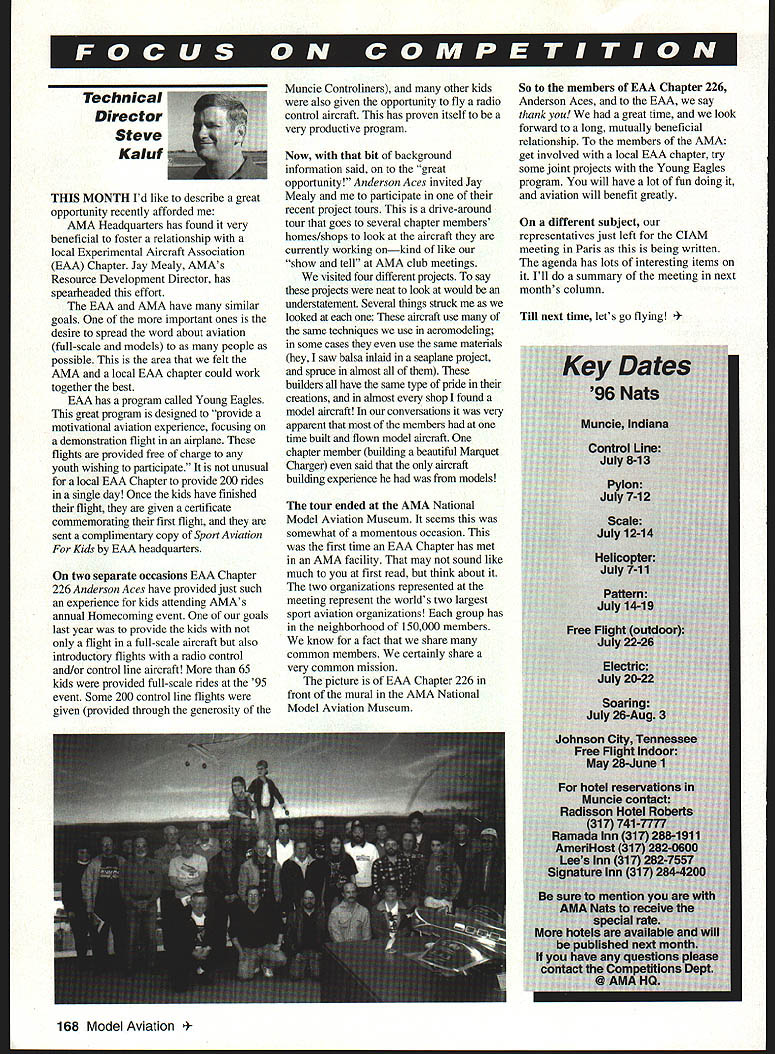 Technical Director Steve Kaluf THIS MONTH Id like describe great opportunity recently afforded AMA Headquarters has found very beneficial foster relationship local Experimental Aircraft Association EAA Chapter Jay Mealy AMAs Resource Development Director has spearheaded effort EAA AMA have similar goals important ones desire spread word about aviation full-scale models people possible area felt AMA local BAA chapter could work together best BAA has program called Young Eagles great program designed provide motivational aviation experience focusing demonstration flight airplane flights provided free charge youth wishing participate unusual local BAA Chapter provide 200 rides single day Once kids have finished flight given certificate commemorating first flight sent complimentary copy Sport Aviation Kids BAA headquarters two separate occasions BAA Chapter 226 Anderson Aces have provided just such experience kids attending AMAs annual Homecoming event goals last year provide kids flight full-scale aircraft also introductory flights radio control and/or control line aircraft 65 kids provided full-scale rides 95 event Some 200 control line flights given provided through generosity Muncie Controliners other kids also given opportunity fly radio control aircraft has proven itself very productive program Now bit background information said great opportunity Anderson Aces invited Jay Mealy participate recent project tours drive-around tour goes several chapter members homes/shops look aircraft currently working onkind like show tell AMA club meetings visited four different projects say projects neat look would understatement Several things struck looked aircraft use same techniques use aeromodeling some cases use same materials hey saw balsa inlaid seaplane project spruce almost builders have same type pride creations almost shop found model aircraft conversations very apparent members time built flown model aircraft chapter member building beautiful Marquet Charger said aircraft building experience models tour ended AMA National Model Aviation Museum seems somewhat momentous occasion first time BAA Chapter has met AMA facility may sound like much first read think about two organizations represented meeting represent worlds two largest sport aviation organizations Bach group has neighborhood 150000 members know fact share common members certainly share very common mission picture BAA Chapter 226 front mural AMA National Model Aviation Museum So members EAA Chapter 226 Anderson Aces BAA say thank great time look forward long mutually beneficial relationship members AIVIA get involved local BAA chapter try some joint projects Young Eagles program will have lot fun doing aviation will benefit greatly different subject representatives just left ClAM meeting Paris being written agenda has lots interesting items Ill summary meeting next months column Till next time lets go flying * 168 Model Aviation 4 p up w p up jw up IS S eininin p up & TEAM SELEC VON PROGRAM ANNOUNCEMENTS 1996 World Championships Indoor FiD August 5-8 1996 Moscow Idaho Scale F4B F4C July 21-28 1996 Periguez France Electric F5B FSD August 16-251996 Czech Republic SpaceDnodeling 5 August 6-14 1996 Slovenia Control Line F2A F2B F2C F2D July 22-29 1996 Norkopping Sweden Junior Free Flight FlA FB FtC August 17-23 1996 Krakow Poland Supporter Information Donation Information please contact Competitions Department 1997 Team Selection Programs following Team Selection Programs currently underway further information about program entry program contact Competitions Department Free flight FlAFlBFlC Helicopter F3C RC Aerobatics F3A RC Soaring F3B RC Pylon F3D RC Aerobatics Team Selection program currently accepting bids host finals held Spring/Summer 1997 RC Pylon Team Selection program currently accepting bids host finals held late Summer Fall 1996 Please submit bids indicating dates location weather hotel information budget support contact person other pertinent information AMA attention Competitions Department COMPETITION DIRECTORY CONTEST COORDINATORS IRobert Wilkie 19 Everett St Rockland MA 02370Arlington Heights IL 69004 iiCL & FF Richard Sobrino 87-26 88th 5 Woedhavee NYVIIPP AMA Headquarters Competition Department 11421CL Marc Warwashana t 1577 N Shore Dr NC Robeg Kircher g Shelfeld Way Clark NJ 07006Whitmore Lake Ml 401 gg-9124 iiiCL FF & NC Nelson Dec14 19440 Idaho Street AllentownNC Except Michigan Leon Cordy N4503 Highway 55 PA 10193 EastChutes WI 53614 CL PP & NC M Weiseebach 4568W 146th ClevelandNC Michigan setH Wayne Yeager 15387 Feerister Rd 06 44135 WestClayton Ml 49235 IVCL & FF Jim Cothir 4604 Hilibreok Sr Annandale VA 22003Bitt CL & FF Bill Lee 423 Hedgecroft Seabreok TO 77566 NC Steve Moalton 2217 Jehrstowr Rd ChesapeakeVANC Clyde Brothers 4903 Whispering Oaks Dr College 23322-2762Station TX 77045 BNC Rae Frito ggg Pawne Er Pensacola FL 32526IXMike Tallman 3614 hochanoe Wichita KS 67217 FF Bob Jock 984 Williams Eltch Rd Cantonment FLNC Jedy gerken 2069 Sooth Raleigh St Denver CD 60210 32533XEllis Hall 5543 Willow Dak Way Fair Oaks CA 85620 North CL Javeph Mead 1329 Rensoaloer St JacksorvilleFL 32205Al Williamson 445 Weotby Chala Vista CA 01 011 ViNC except Bearing Jerry Wordon 400 Alden Dr NormalFrank Domes 2241 Noah St Henolola 6196816 Hawaii 1L61761-1207Utah Arbors NC Searing Dale Paikening 1544 Eerier Lake DrDavid Lilt 1111 N 64th St 53 Mesa AZ 05205 DarieniL 60559XiDick Saher 7217 So 133rd St Seattle WA 98178 HF Jim Bennett 324 Helteestein Ave St Loals MO 63119NC WT Bill SwAb 10025 44th Ave SW Seattle CL William Bad Bodnioch Jr 1000 Trail Ridge StWA 96146 INDOOR CONTEST BOARD Ray Harlac 15 Happy Hellew Rd Wayland MA 01770 ii Deog Barber 146 Stratton Hease Maple Shade NJ 08052 Walt VanGorder 5660 Victery View Ln Cincineati Oh 45232 IV Doe Srott 941 Kimberwicke Rd McLeae VA 22102 V John Martin 2100 Tigertail Miami FL 23123 Vi Charlie Satich 3051 W 62nd Place Chicago IL 60629 Vii Richard Deig 2130 Semmervitte Dr Ostord Mi