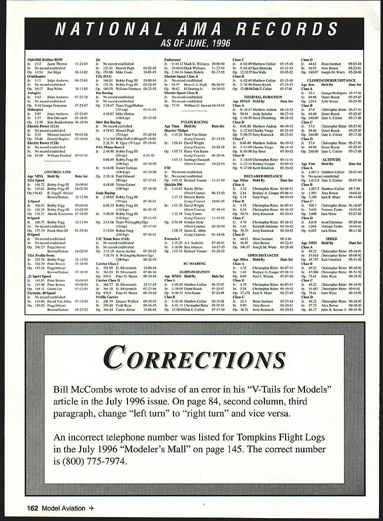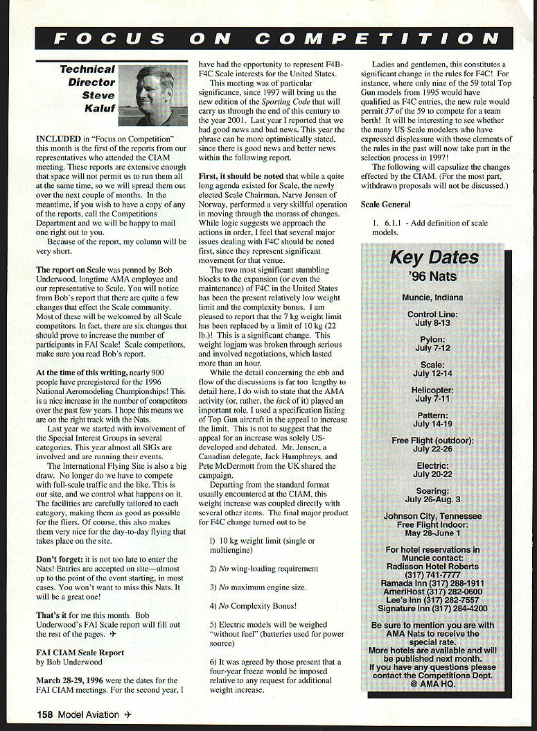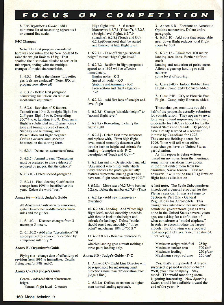 FF Technical Director Steve Kaluf INCLUDED Focus Competition month first reports representatives attended ClAM meeting reports extensive enough space will permit us run same time will spread out over next couple months meantime wish have copy of reports call Competitions Department will happy mail right out Because report column will very short report Scale penned Bob Underwood longtime AMA employee representative Scale will notice Bobs report quite few changes effect Scale community Most will welcomed Scale competitors fact six changes should prove increase number participants FAI Scale Scale competitors make sure read Bobs report time writing nearly 900 people have preregistered 1996 National Aeromodeling Championships nice increase number competitors over past few years hope means right track Nats Last year started involvement Special Interest Groups several categories year almost SIGs involved running events International Flying Site also big draw No longer have compete full-scale traffic like site control what happens facilities carefully tailored category making good possible fliers course also makes very nice day-to-day flying takes place site Dont forget too late enter Nats Entries accepted sitealmost up point event starting cases wont want miss Nats will great Thats month Bob Underwoods FAI Scale report will fill out rest pages ClAM Scale Report Bob Underwood March 28-29 1996 dates FAI ClAM meetings second year have opportunity represent F4BF4C Scale interests United States meeting particular significance since 1997 will bring us new edition Sporting Code will carry us through end century year 2001 Last year reported good news bad news year phrase can optimistically stated since good news better news within following report First should noted quite long agenda existed Scale newly elected Scale Chairman Narve Jensen Norway performed very skillful operation moving through morass changes logic suggests approach actions order feel several major issues dealing F4C should noted first since represent significant movement venue two significant stumbling blocks expansion maintenance F4C United States has present relatively low weight limit complexity bonus am pleased report 7 kg weight limit has replaced limit 10 kg 22 lb significant change weight logjam broken through serious involved negotiations lasted hour detail concerning ebb flow discussions far too lengthy detail wish state AMA activity rather lack played important role used specification listing Top Gun aircraft appeal increase limit suggest appeal increase solely USdeveloped debated Mr Jensen Canadian delegate Jack Humphreys Pete McDermott UK shared campaign Departing standard format usually encountered ClAM weight increase coupled directly several other items final major product F4C change turned out 1 10 kg weight limit single multiengine 2 No wing-loading requirement 3 No maximum engine size 4 No Complexity Bonus 5 Electric models will weighed fuel batteries used power source 6 It agreed present four-year freeze would imposed relative request additional weight increase Ladies gentlemen constitutes significant change rules F4C instance nine 59 total Top Gun models 1995 would have qualified F4C entries new rule would permit 37 59 compete team berth will interesting see whether US Scale modelers have expressed displeasure elements rules past will now take part selection process 1997 following will capsulize changes effected ClAM part withdrawn proposals will discussed Scale General - Add definition scale 1 611 models 158 Model Aviation 4 Add word Continental paragraph 3 616c Add Necessary repairs due flight damage permitted maximum weight still applies appearance model flight may unduly affected 4 616j Add no modifications model except exhausting fuel allowed 5 61 6j Add officials responsible weighing models device used shall available competitors weighing prior first flight contest 6 616k Add Any model opinion judges organizers appears noisy flight will have submit noise check after flight Sec 621 F4B 631 F4C details 7 France submitted proposal allow launching second radio controlled device model determined rules did prohibit such condition proposal withdrawn understanding 8 6194a Increase minimum span 250mm maximum 500mm 9 6l94b Add word maximum 10 A number proposals modify complexity bonuses rendered moot withdrawn F4B Changes 1 62lb Delete words Liquefied gases excluded 2 621 Concerns noise check allows adjustment start flight order prevent forfeiture flight 3 622 Change 12 meters 15 meters 4 624 Replace 633 taken F4C 633 5 627 K factors revised Realism flight subdivided four sections Engine noise tone tuning speed model stability trimming size figures flight elegance 6 628 Optional demonstrations added andlor K factor revised taxi demonstration K7 Overshoot K7 7 6211 Final scoring clarification 1995 effective Championships year 1996 Delete word best second paragraph I Robert Wilkie 19 Roereen St Rockland MA 02370 II CI & FF Richard Sebrino 87-26 88th St Woodlnanen NY 11421 AC Robert Kinchen 9 SheReid Way Clark NJ 07066 III CL FF & BC Nelson Gould 1944 S Idaho Street Allentown PA 19103 Rant CL FE & BC M Weineebach 4568W 146th Cleveland OH 44135 Went IV CL & FF Jim Coffin 4604 Hillbroek Dr Anneedale VA 22003 BC Steve Moulton 2217 Johnstown Rd ChenopeakeVA 23322-2762 V BC Robert Bartonoewico 3626 Ranchwoed Rd Orlaudo FL 32880 Fr Bob Junk 994 Williawn Ditch Rd Cuetonment FL 32533 CL Joseph Mead 1339 Reosnaloer St JacksonvilleFL 32205 VI BC except Searing Jerry Werden 400 Alden Normal [61 761-1 207 BC Searing Dole Folkening 1544 Darien Luke Dr OunleoIL 60559 FF Jim PenneD 324 Helteontein Ave St Louis MO 63119 CL William Bud Bedniech Jr 1800 Troll Ridge St INDOOR CONTEST BOARD I Roy Harlan 15 Happy Hollow Rd Wayland MA 01778 II Doug Barber 146 Stnotten House Maple Shade NJ 08852 III Walt VanGerder 5669 Victory View Ln Cincienati OH 45233 IV Doe Srull 941 Kiwberwicke Rd McLean VA 22102 V John Martin 2180 Tigertail Miami FL 33133 