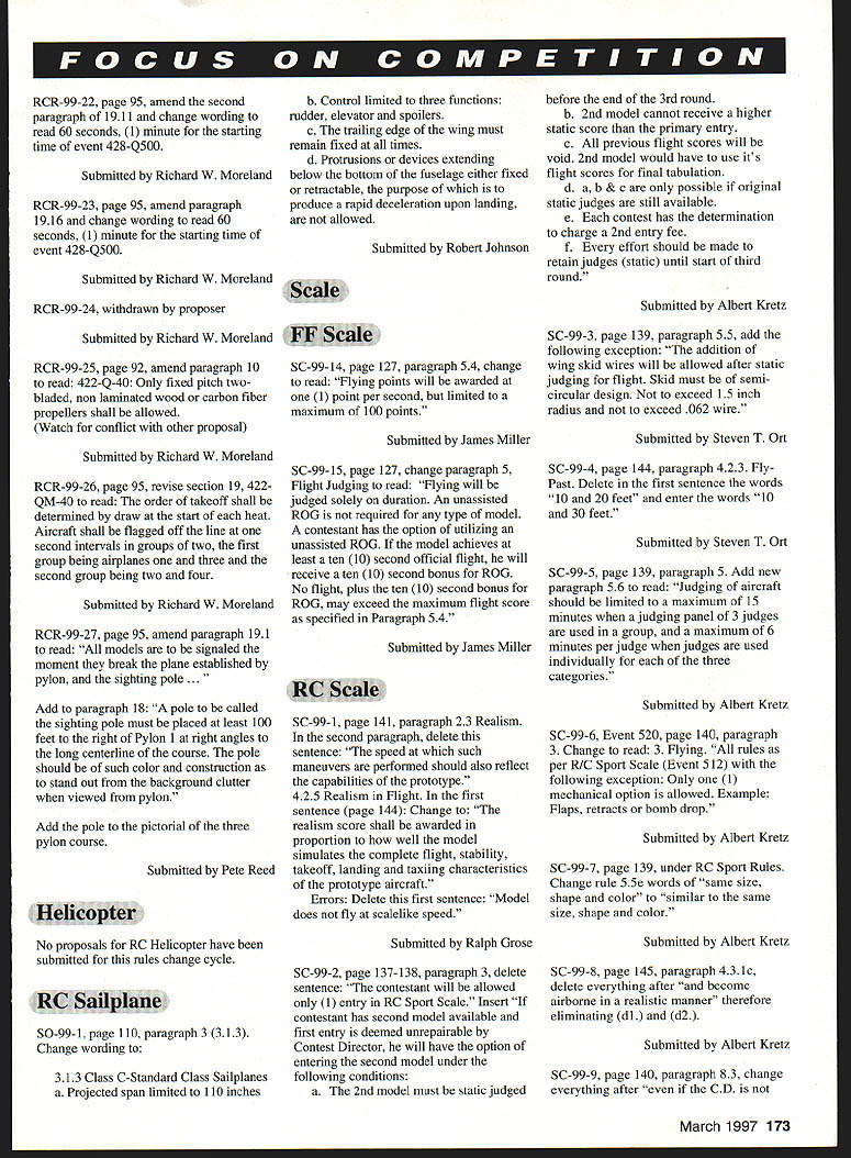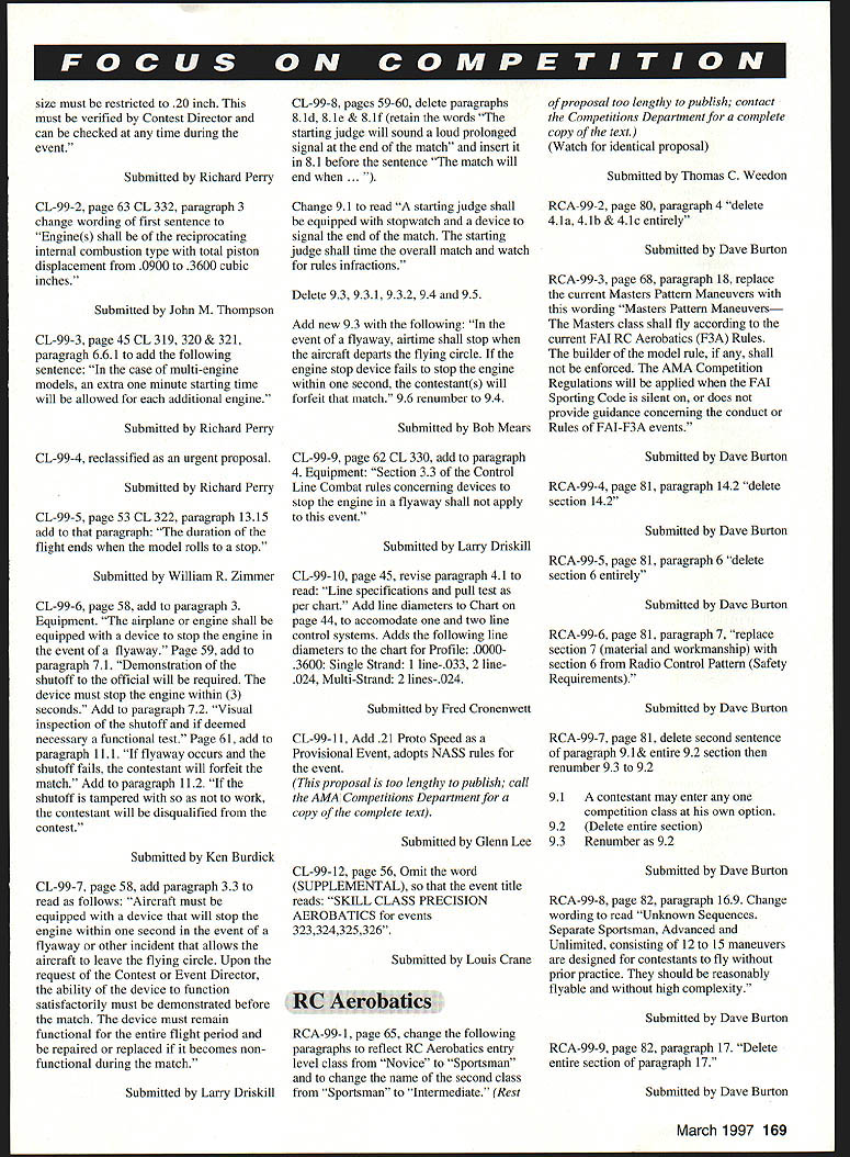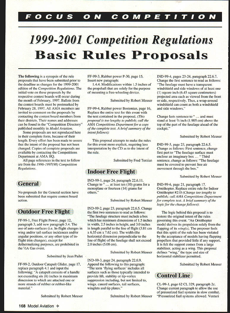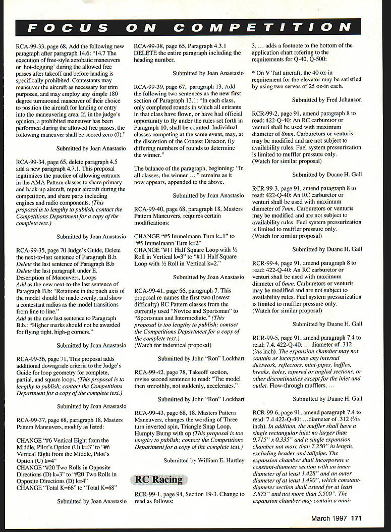 Technical Director Steve Kaluf RULES PROPOSALS have Following short introduction summaries proposals 19992001 Competition Regulations Yes 2001remember three-year rules change cycle now current Competition Regulations will effect until end 1998 cases proposals received too lengthy publish complete form case have summarized what felt intent proposal complete text proposals available calling Competitions Department AMA HQ will hopefully notice have tried publish actual proposals cases possible response member requests does become real expensive space issue magazine please understand entire proposal OK proposers Contest Board Chairpersons AMA HQ have done part now turn process work must read proposals have interest events fly officiate Get out copy 1 996-97 98 Competition Regulations see what being suggested change decide agree disagree proposal contact District Contest Board member let him know feelings people place represent views however cant dont contact Remember You AMAnot just AMA HQ elected officials AMA membership control what happens must participate have control dont shame cant tell times get calls upset members complaining about rule find out did bother comment proper time proper time get comments Contest Board members district Till next time . ers World Aerobatic Championships Final Standings 1Jason Shulman191111 2Frank NoIl187843 3Gerald Neel183548 4Kirk Gray183060 5Chip Hyde182648 6Dean Koger178214 7Robert Elliot176914 MiniStick op Unlimited Catapult Glider op Standard Catapult Glider op Andrew Tagliafico 1428 08/10/96 CAT II Wayne Trivin Wayne Trivin 1479 10/26/96 1479 10/26/96 B Speed Sr Walter VanGorder 1123 10/06/96 CONTROL LINE Bobby Fogg III17675 10/12/96 ELECTRIC B CL Speed op William Stewart 10697 10/13/96 March 1997 167 INDOOR FFCAT III CAT IV Mini-Stick Op 1999-2001 Competition Regulations Basic Rules Proposals following synopsis rule proposals have submitted prior deadline changes 1999-2001 edition Competition Regulations initial vote proposals respective contest boards will occur during month February 1997 Ballots contest boards must postmarked February 28 1997 AMA members invited comment proposals contacting contest board members districts names addresses can found Competition Directory published monthly Model Aviation Some proposals reproduced complete form because length effort has made assure intent proposal has changed Copies complete proposals available contacting Competitions Department AMA HQ page references text follow 1996-199798 Competition Regulations General No proposals General section have submitted require contest board action Outdoor Free Flight FF-99- 1 Free Flight Power page 12 paragraph 3 add new paragraph 34 use auto-surfaces ie In-flight changes wing and/or tail surface incidences and/or angular positions other type inflight trim changes except dethermalizing purposes prohibited /A Gas event Submitted Jean Pailet FF-99-2 Outdoor Catapult Glider page 17 replace paragraph 41 input following catapult consists handle exceeding six 6 inches maximum dimension attached strands rubber rubber-like material Submitted Robert Meuser FF-99-3 Rubber power P-30 page 15 Insert new paragraph 144 Modifications within 15 inches propshaft solely purpose mounting free-wheeling device Submitted Robert Meuser FF-99-4 Rubber power Bostonian page 16 Replace entire text event text contained proposal proposal too lengthy publish call AMA Competitions Department copy complete text brief summary intent follows proposal attempts make rules event explicit requiring less interpretation CD intent rule Submitted Fred Terzian Indoor Free Flight IND-99-1 page 24 paragraph 22611 Change . least ten 10 grams monoplane fourteen 14 grams others Submitted Robert Meuser IND-99-2 page 23 paragraph 2265 Change first two sentences read follows fuselage structure must include box has minimum dimensions 15 inches width 25 inches height 30 inches length parallel line flight 381 cm x 635 cmx 762 cm width horizontal dimension perpendicular line flight fuselage shall exceed 20 inches 508 cm Submitted Robert Meuser IND-99-3 page 24 paragraph 2269 Append following paragraph term flying surfaces includes surfaces such typically intended provide lift stability tip-vortex suppression including limited wings canard surfaces tail surfaces winglets tip plates Submitted Robert Meuser IND-99-4 pages 23-24 paragraph 2267 Change first sentence read follows fuselage must have transparent windshield side windows least 1 square inch 645 square centimeters projected area viewed front side respectively Thus wrap-around windshield can count both windshield side windows Change lasts sentence . must stand least 3/4 inch 1905 cm above top part fuselage ahead cockpit Submitted Robert Meuser IND-99-5 page 23 paragraph 2265 Change follows First sentence change first part fuselage surface must enclose imaginary box ird sentence change follows fuselage must covered prevent free air movement through box Submitted Robert Meuser IND-99-6 page 21 paragraph 17 Ornithopter Replace entire rule Indoor Ornithopter #210 Change too lengthy publish call AMA Competitions Department complete text brief summary logic change follows logic behind proposal restore original intent rules governing event An Ornithopter model derives its propulsion solely flapping its wings proposer feels spirit rule has violated acceptance models having flapping propellers provided little support felt support comes large stabilizer acting wing proposal defines wing type size horizontal stabilizer permitted Submitted Robert Meuser Control Line CL-99-1 page 62 CL 329 paragraph 2c Change current paragraph allow use pressurized fuel systems slow combat Pressurized fuel systems allowed Venturi 168 Model Aviation must restricted 20 inch must verified Contest Director can checked time during event Submitted Richard Perry CL-99-2 page 63 CL 332 paragraph 3 change wording first sentence Engines shall reciprocating internal combustion type total piston displacement 09