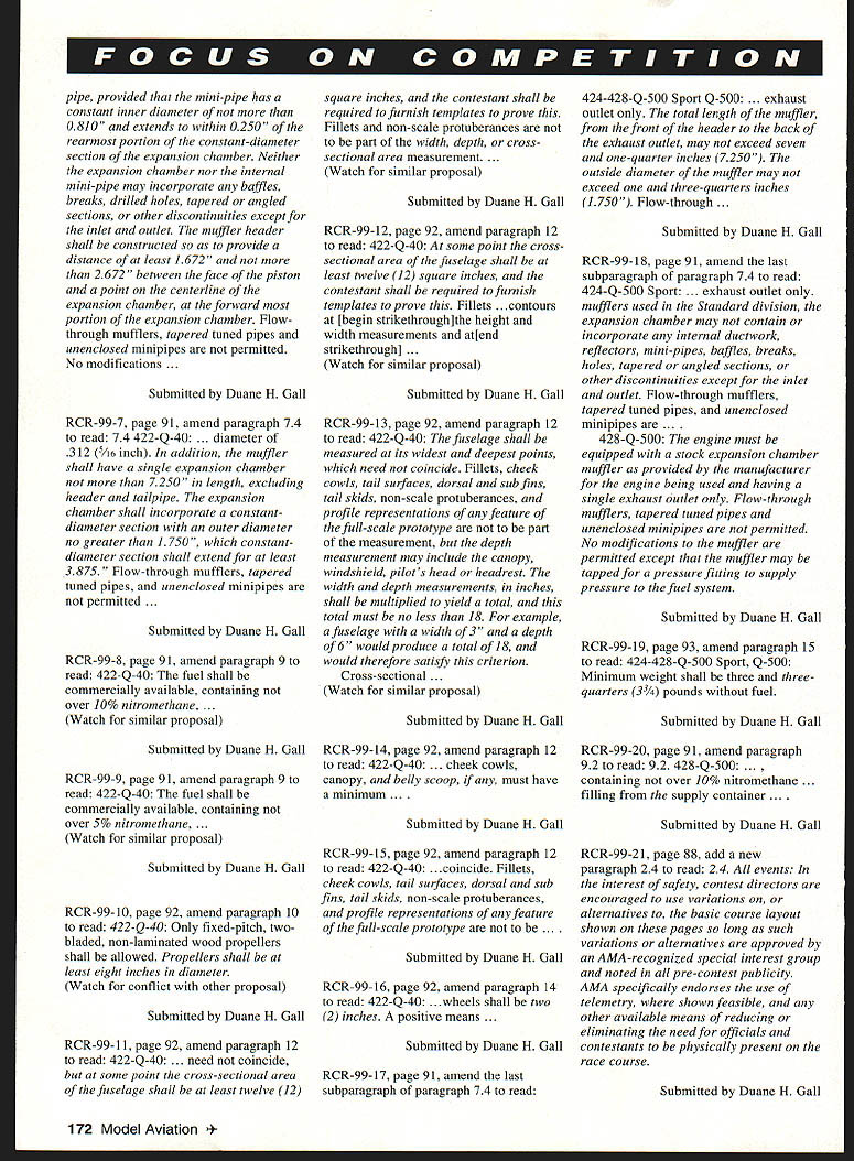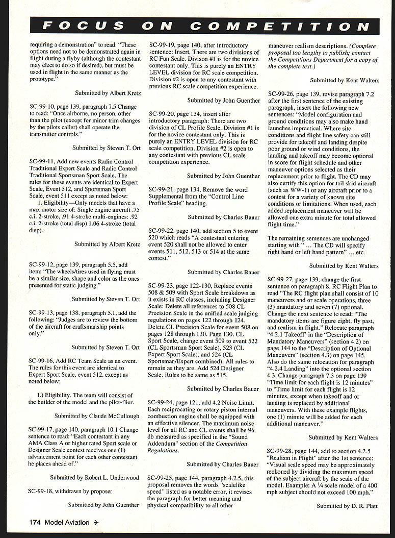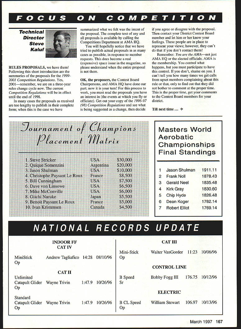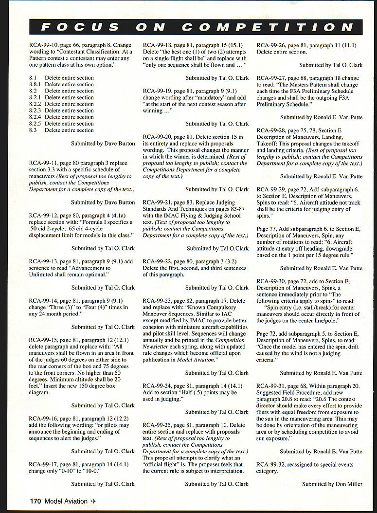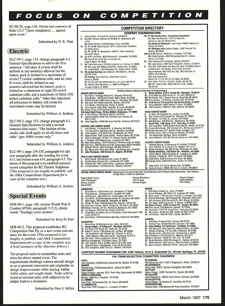 Technical Director Steve Kaluf RULES PROPOSALS have Following short introduction summaries proposals 19992001 Competition Regulations Yes 2001remember three-year rules change cycle now current Competition Regulations will effect until end 1998 cases proposals received too lengthy publish complete form case have summarized what felt intent proposal complete text proposals available calling Competitions Department AMA HQ will hopefully notice have tried publish actual proposals cases possible response member requests does become real expensive space issue magazine please understand entire proposal OK proposers Contest Board Chairpersons AMA HQ have done part now turn process work must read proposals have interest events fly officiate Get out copy 1 996-97 98 Competition Regulations see what being suggested change decide agree disagree proposal contact District Contest Board member let him know feelings people place represent views however cant dont contact Remember You AMAnot just AMA HQ elected officials AMA membership control what happens must participate have control dont shame cant tell times get calls upset members complaining about rule find out did bother comment proper time proper time get comments Contest Board members district Till next time . ers World Aerobatic Championships Final Standings 1Jason Shulman191111 2Frank NoIl187843 3Gerald Neel183548 4Kirk Gray183060 5Chip Hyde182648 6Dean Koger178214 7Robert Elliot176914 MiniStick op Unlimited Catapult Glider op Standard Catapult Glider op Andrew Tagliafico 1428 08/10/96 CAT II Wayne Trivin Wayne Trivin 1479 10/26/96 1479 10/26/96 B Speed Sr Walter VanGorder 1123 10/06/96 CONTROL LINE Bobby Fogg III17675 10/12/96 ELECTRIC B CL Speed op William Stewart 10697 10/13/96 March 1997 167 INDOOR FFCAT III CAT IV Mini-Stick Op 1999-2001 Competition Regulations Basic Rules Proposals following synopsis rule proposals have submitted prior deadline changes 1999-2001 edition Competition Regulations initial vote proposals respective contest boards will occur during month February 1997 Ballots contest boards must postmarked February 28 1997 AMA members invited comment proposals contacting contest board members districts names addresses can found Competition Directory published monthly Model Aviation Some proposals reproduced complete form because length effort has made assure intent proposal has changed Copies complete proposals available contacting Competitions Department AMA HQ page references text follow 1996-199798 Competition Regulations General No proposals General section have submitted require contest board action Outdoor Free Flight FF-99- 1 Free Flight Power page 12 paragraph 3 add new paragraph 34 use auto-surfaces ie In-flight changes wing and/or tail surface incidences and/or angular positions other type inflight trim changes except dethermalizing purposes prohibited /A Gas event Submitted Jean Pailet FF-99-2 Outdoor Catapult Glider page 17 replace paragraph 41 input following catapult consists handle exceeding six 6 inches maximum dimension attached strands rubber rubber-like material Submitted Robert Meuser FF-99-3 Rubber power P-30 page 15 Insert new paragraph 144 Modifications within 15 inches propshaft solely purpose mounting free-wheeling device Submitted Robert Meuser FF-99-4 Rubber power Bostonian page 16 Replace entire text event text contained proposal proposal too lengthy publish call AMA Competitions Department copy complete text brief summary intent follows proposal attempts make rules event explicit requiring less interpretation CD intent rule Submitted Fred Terzian Indoor Free Flight IND-99-1 page 24 paragraph 22611 Change . least ten 10 grams monoplane fourteen 14 grams others Submitted Robert Meuser IND-99-2 page 23 paragraph 2265 Change first two sentences read follows fuselage structure must include box has minimum dimensions 15 inches width 25 inches height 30 inches length parallel line flight 381 cm x 635 cmx 762 cm width horizontal dimension perpendicular line flight fuselage shall exceed 20 inches 508 cm Submitted Robert Meuser IND-99-3 page 24 paragraph 2269 Append following paragraph term flying surfaces includes surfaces such typically intended provide lift stability tip-vortex suppression including limited wings canard surfaces tail surfaces winglets tip plates Submitted Robert Meuser IND-99-4 pages 23-24 paragraph 2267 Change first sentence read follows fuselage must have transparent windshield side windows least 1 square inch 645 square centimeters projected area viewed front side respectively Thus wrap-around windshield can count both windshield side windows Change lasts sentence . must stand least 3/4 inch 1905 cm above top part fuselage ahead cockpit Submitted Robert Meuser IND-99-5 page 23 paragraph 2265 Change follows First sentence change first part fuselage surface must enclose imaginary box ird sentence change follows fuselage must covered prevent free air movement through box Submitted Robert Meuser IND-99-6 page 21 paragraph 17 Ornithopter Replace entire rule Indoor Ornithopter #210 Change too lengthy publish call AMA Competitions Department complete text brief summary logic change follows logic behind proposal restore original intent rules governing event An Ornithopter model derives its propulsion solely flapping its wings proposer feels spirit rule has violated acceptance models having flapping propellers provided little support felt support comes large stabilizer acting wing proposal defines wing type size horizontal stabilizer permitted Submitted Robert Meuser Control Line CL-99-1 page 62 CL 329 paragraph 2c Change current paragraph allow use pressurized fuel systems slow combat Pressurized fuel systems allowed Venturi 168 Model Aviation must restricted 20 inch must verified Contest Director can checked time during event Submitted Richard Perry CL-99-2 page 63 CL 332 paragraph 3 change wording first sentence Engines shall reciprocating internal combustion type total piston displacement 09