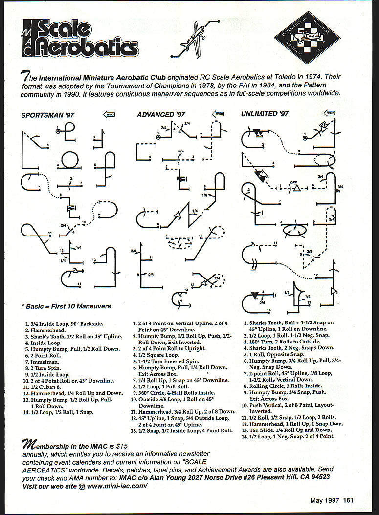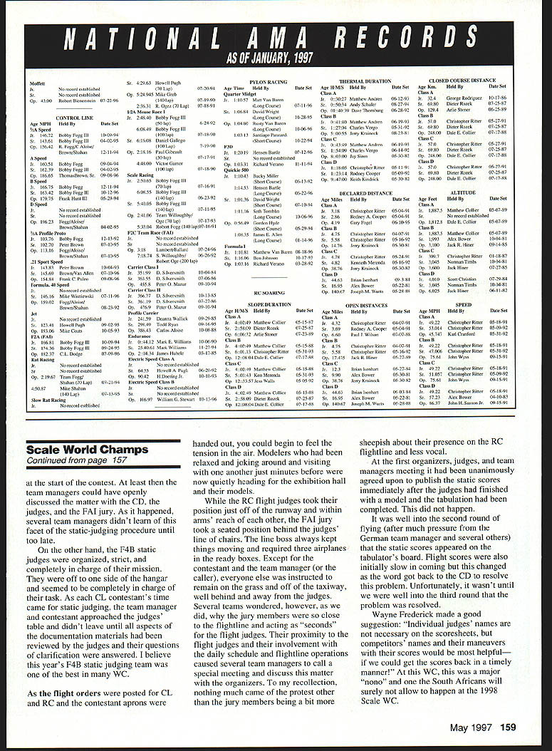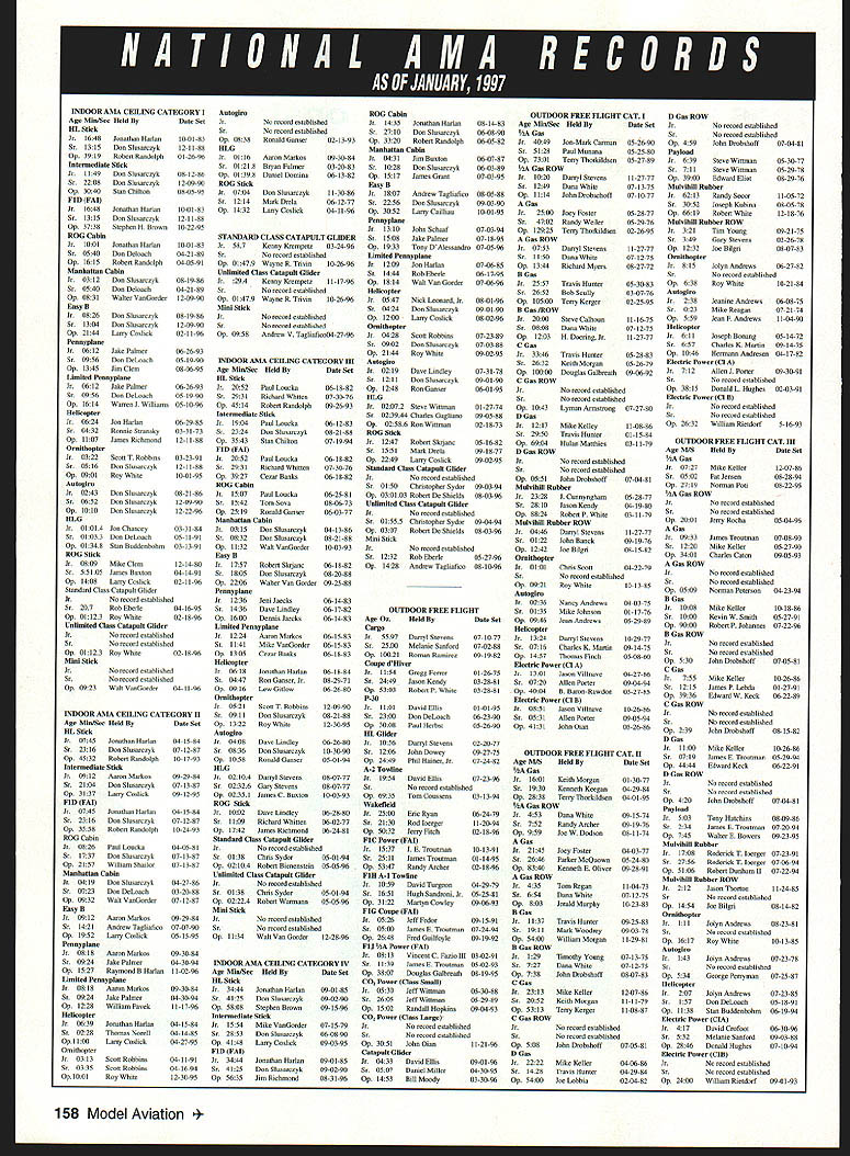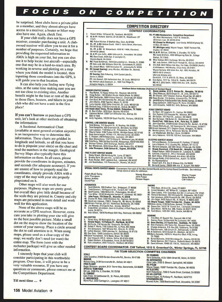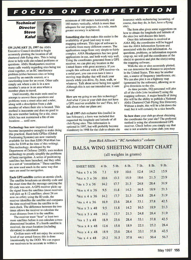 Technical Director Steve Kaluf ON JANUARY 25 1997 AMA Executive Council decided begin accurately plotting location chartered club flying sites being done help site-related problems questions AMA Headquarters receives calls weekly regarding sites being too close together RC interference problem either between sites being caused outside source sanctioning issue event Other calls simply ask site new members s area area member plans travel Until recently main tools used attempt answer questions problems street atlas ruler along description club member site located method inaccurate does no good new member looking site since AMA has maintained file site locations . until now Technology has now improved become inexpensive enough make doing practical Hand-held UPSes Global Positioning Systems now routinely available less $200 Wal-Mart has units $149 time writing technology developed Department Defense DOD uses modern technology greatly simplify problems basic navigation series positioning satellites has launched orbit sort constellation satellites now used much same way stars used navigation GPS satellite carries atomic clock satellite broadcasts identity code exact time message carrying ID code sent GPS receiver picks up signal satellites receivers will pick up 8-12 satellites about 24 now orbit using ID code receiver identifies satellite compares time received satellite its own clock difference between two times allows receiver calculate exact distance satellite receiver must hear least two satellites before can calculate twodimensional location fourth satellite received exact location including elevation calculated Civilian users will enjoy accuracy level armed forces done intentionally DOD can expect receivers accurate within minimum 100 meters horizontally 160 meters vertically adequate purposes As rule much greater accuracy achieved Something else makes easier availability good easy use mapping software type software available different sources applications range very simple fairly complex AMA Headquarters has two good applications use both work very well Using coordinates generated GPS receiver can plot location United States great accuracy couple software GPS receiver via serial port can turn moving map display will track travels drive fly boat walk whatever Talk about never being lost again Although intended use sure neat going use technology what club does have GPS receiver available use First lets talk about what plans 1997 club recharter kits mailed late February form included requested longitude latitude club flying sites information optional 1997 will probably become mandatory 1998 club obtain site insurance rechartering assuming course fact have flying site form also gives some suggestions obtain longitude latitude sites will discuss later Once information received AMA HQ coordinates will logged AMA Information System associated club information As questions problems information requests crop up will pull coordinates sites question plot sites using mapping software site sites accurately plotted can determine distance anywhere United States may another site source frequency interference etc can also plot highway map generated software allowing us give directions site As time permits HQ personnel will plot clubs [site locations] using mapping software major benefit doing will ability publish National AIvIA Chartered Club Flying Site Directory Without doubt will bit down road will certainly nice benefit So does club go about obtaining coordinates site preferred method using aforementioned GPS receiver Check before simply say available club may May1997 155 Rick Allisons RC Aerobatics column BALSA WING SHEETING WEIGHT CHART Weights grams SHEETSIZE41bSib61b71b81b91b 116 x 3 x 367189106124142159 32 x 3 x 36 106133159186213239 1 x 3 x 36142177213248284319 116 x 4 x 3695118142165189213 32 x 4 x 36 142177213248284319 1s x 4 x 36189236284331378425 116 x 3 x 4895118142165189213 32 x 3x 48142177213248284319 18 x 3x 48189236284331378425 11/416 X 4x 48126158189221252284 32 x 4x 48189236284331378425 s x 4x 48252315378441504567 surprised Most clubs have private pilot member almost always have access receiver boater hiker may also have Again check first club really does have GPS receiver consider purchasing unit clubowned receiver will allow use number purposes Certainly hope providing requested information AMA high list can also use help locate lost aircraftespecially may hard-to-reach area working reverse plotting map think model located inputting coordinates GPS will guide location can also help finding new flying sites same time making sure too close existing sites Another benefit might loan rent unit fliers boaters hikers club did have unit first place cant borrow purchase GPS unit lets look other methods obtaining information Sectional Aeronautical Chart available general-aviation airports inexpensive way determine information charts gridded longitude latitude have pinpoint sites chart read numbers margin Geological Survey Maps also typically have information cases please provide coordinates degrees minutes seconds adequate accuracy unsure properly read coordinates simply provide AMA copy map site properly pinpointed Other maps will also work purposes Highway maps pretty good overall give little detail because scale printed County city maps presented detail work well application None above maps will accurate GPS receiver However extra care take plotting site will give us best possible picture Make small dot map show location center runway Place circle around dot call attention using maps please send us clear copy map really dont need want entire map form sent recharter package will give us other needed information sincerely hope club will consider participating worthwhile program Over time will prove very valuable resource have questions comments please contact Competitions Department Till next time4I Robert Wilkie 19 Everett St Rockland MA 02370 II CL & FF Richard Sobrino 87-26 88th St Wood