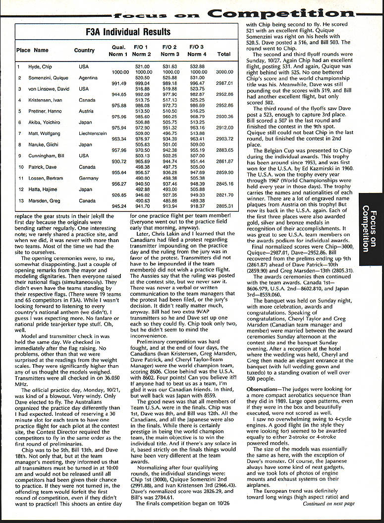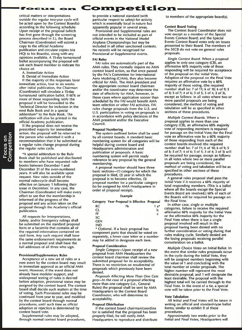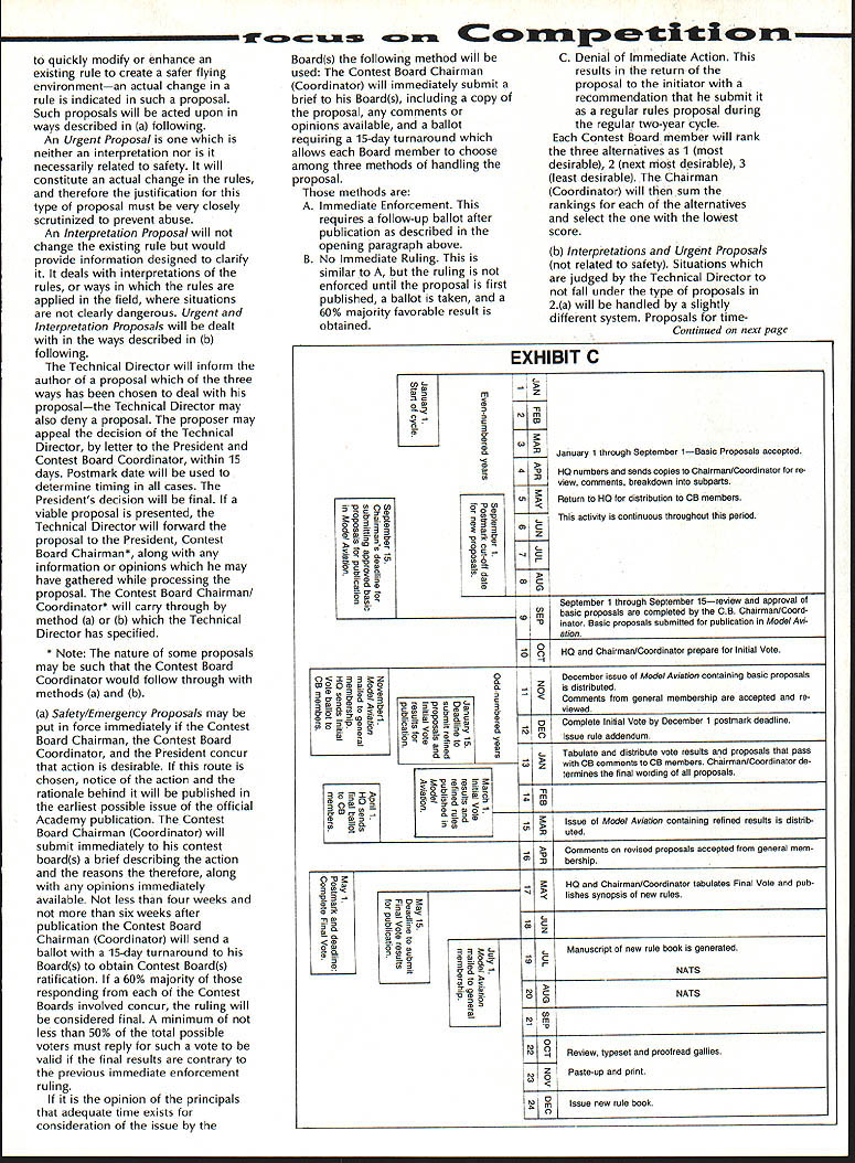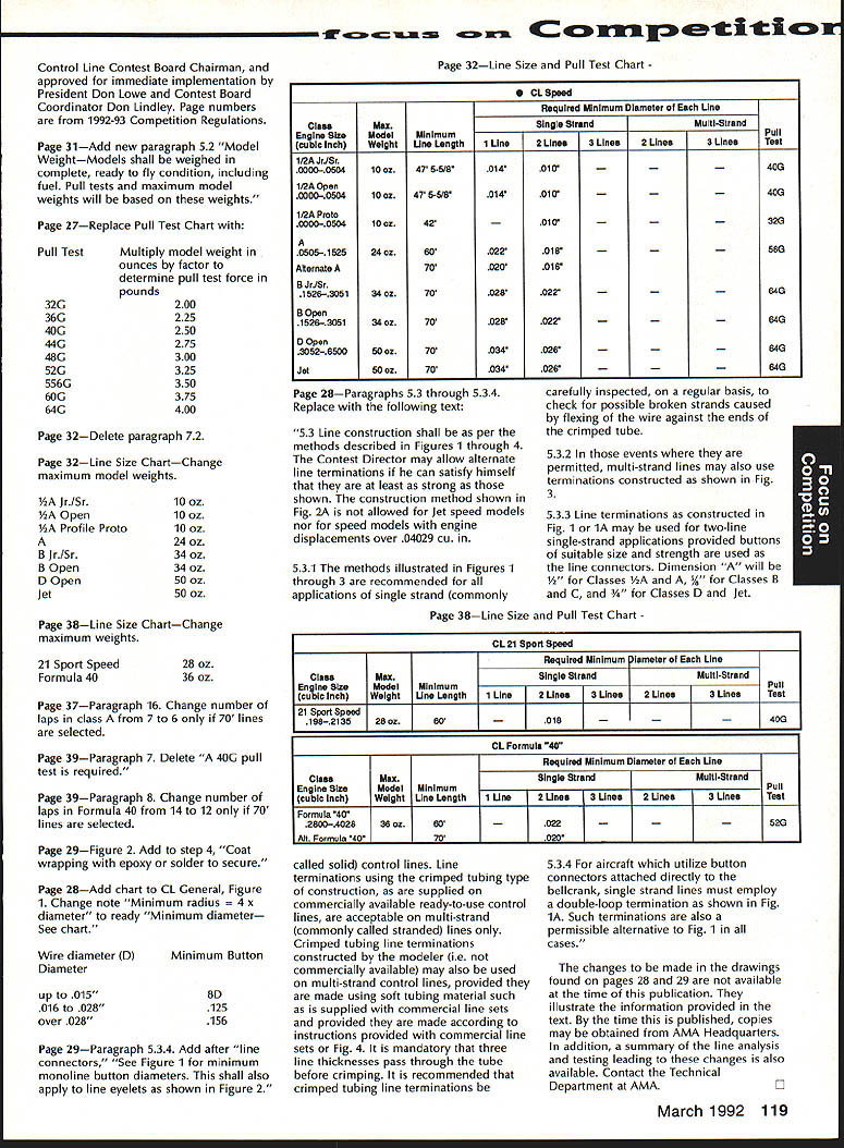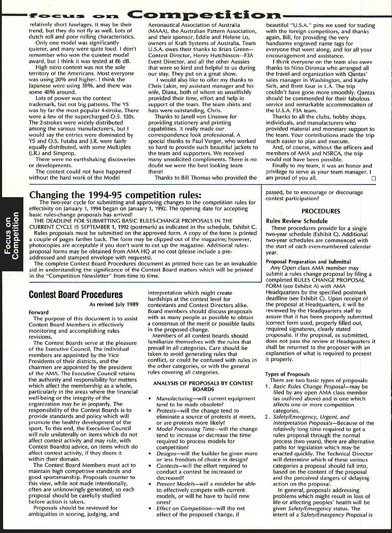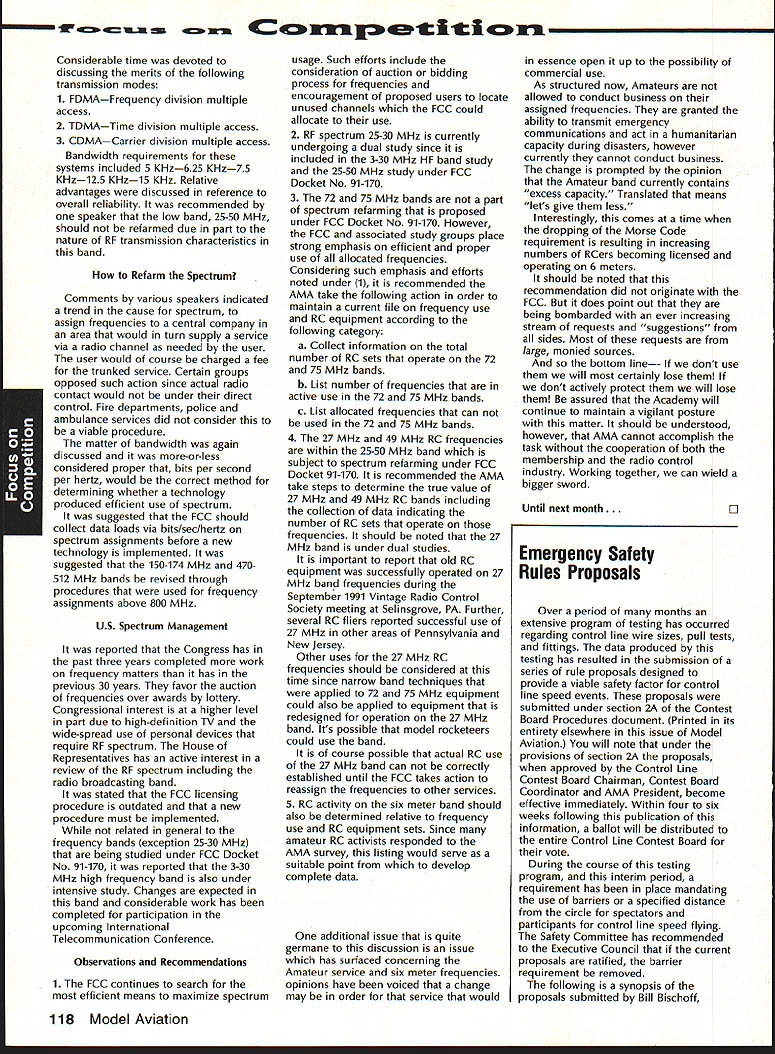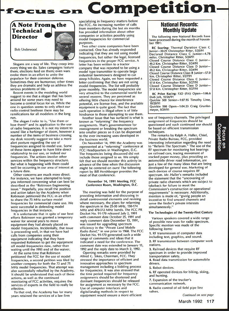 Competition ANoteFromthe Technical Director Bob Underwood Slogans way life creep thing Sales campaigns feature elections feed wars evoke effort unite populace common defense Sometimes humorous other times dramatic help us address serious problems life Recent events modeling world suggest slogan has around some years may need become central focus us question seems affect radio control brethren may ramifications modelers long run slogan refer Use lose its application use radio frequencies intent sound like harbinger doom however number items business crossing desk recently suggest take alert posture regarding use frequencies assigned model use Some items appear have little direct relationship use indeed frequencies actions involve other services within frequency structure what happening could well occurring area interest future date Other concerns much direct instance have attempted keep informed concerning what can best described Robinson Engineering issue Hopefully recall position action taken Academy Robinson petitioned FCC effort share 75 MHz surface model frequencies commercial crane use successful defending model frequencies instance unfortunate spite best efforts Robinson granted temporary waiver several years move equipment already placed model frequencies Incidentally issue proceeding well have calls companies using equipment indicating have requested Robinson get equipment off model frequencies now rather waiting until 1993 end waiver same time Robinson petitioned FCC use model frequencies second petition filed another company both 72 75 MHz model frequencies attempt also successfully rebuffed Academy should understood actions well continued monitoring FCC activities requires services experts field really effective end Academy has years retained services law firm specializing frequency matters before FCC An increasing number calls members during last six months has provided information about other companies activities possibly using model frequencies commercial purposes Two other crane companies have contacted has already responded indicating using model frequencies rather legal licensed frequencies proper FCC service letter has written tractor company reported using model type transmitter operate large industrial lawnmowers designed cut steep hillsides Again have requested letter confirming using model frequencies list will probably grow monthly model frequencies very attractive commercial world several reasons perceived offering little chance interference potential license free available equipment quite good fact such operation illegal often little hindrance attempting use Another issue has surfaced what known refarming frequency assignments Thats governmenteze reassignment breaking spectrum smaller pieces can dispensed ever increasing uses developed business world November 14 1991 Academy represented refarming conference FCC Headquarters Washington DC frequencies being discussed did include assigned us simply felt should monitor activity advance time discussion might centered following report Bill Hershberger provides meat conference November 14 1991 Meeting FCC Conference Room Washington DC meeting held purpose providing information discussing detail controversial elements revising necessary plans refarming spectrum 25-50 MHz 150-174 MHz 470-512 MHz bands FCC PR Docket No 91-170 released July 2 1991 comment date October 25 1991 reply comment date December 13 1991 issued upgrading spectrum efficiency Private Land Mobile Radio Band use prior 1968 FCC Docket No 91-1 70 generated such wide range comments ideas indicated need conference comment date extended January 15 1992 reply date March 2 1992 Opening remarks provided Alfred C Sikes Chairman FCC stressed importance efficient innovative approaches spectrum management including bidding process frequencies also stressed time period required frequency assignments should shortened dormant frequencies should released assignment necessary FCC Use computer interfaces digital/analog methods respect equipment would ensure efficient use frequency channels privileged assignment frequencies should questioned such continued use should based efficient transmission techniques remarks Ralph Hailer Chief Private Radio Bureau FCC provided interesting information regarding need Refarm Spectrum use RF spectrum monitoring hot bearings railroad cars tracing movement stacked paper money plus providing automobile driver road information just few ideas being developed general use Marketing such devices course requires RF spectrum Mr Hailers remarks included statement uncovering private radio channels subject takeback failure meet Commissions construction operational requirements necessary Additionally mention made giving people incentive find unused channels serve finders private interests simultaneously Technologies Twenty-First Century Various speakers covered wide range possible new uses radio spectrum Specific mention made following items 1 RF transmission computer data including text graphics sound 2 RF transmission between computer work stations 3 Railroad devices require RF spectrum order provide improved transportation safety 4 Road data transmission automobile drivers 5 Robot devices 6 RF operated devices biking skiing hunting 7 Expansion truckers communication network 8 Radio control oil field pipe line valves Continued next pnge March 1992 117 National Records Monthly Update following new National Records have processed during month Novem ber 1991 RC Soaring Thermal Duration Class C Junior3029 Christopher Ritter 5/25/91 Declared Distance Class C Junior478 miles Christopher Ritter 5/24/91 Closed Course Distance Class C Junior 492 Km Christopher Ritter 5/24/91 Closed Course Distance Class D Junior 492 Km Christopher Ritter 5/24/91 Closed Course Distance Class B Junior570 Km Christopher Ritter 5/27/91 Closed Course Distance Class C Junior 570 Km Christopher Ritter 5/27/91 Closed Course Distance Class D Junior 570 Km Christopher Ritter 5/27/91 R