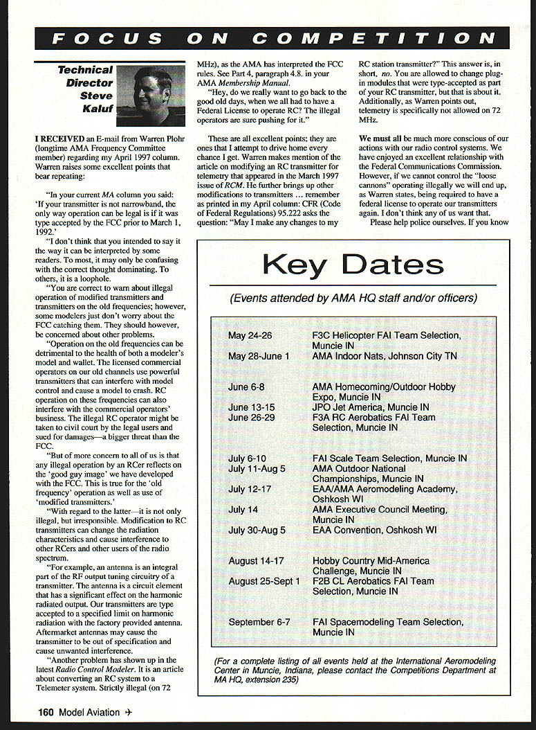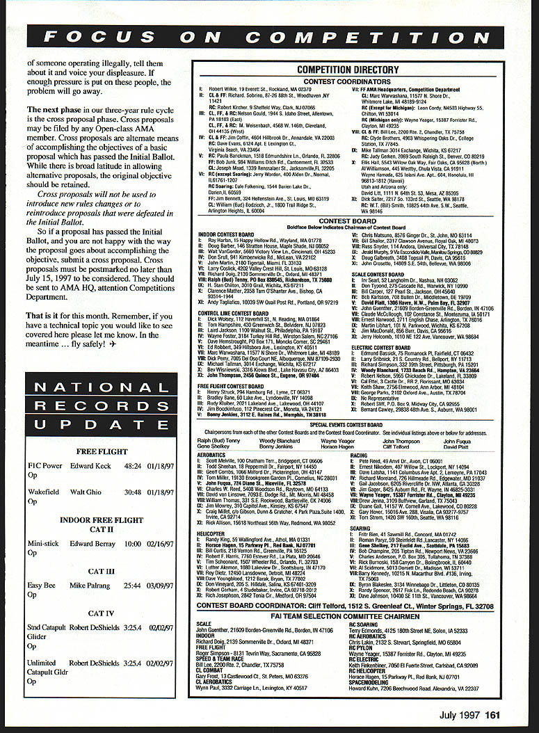 Technical Director Steve Kaluf RECEIVED E-mail Warren Plohr longtime AMA Frequency Committee member regarding April 1997 column Warren raises some excellent points bear repeating current MA column said transmitter narrowband way operation can legal type accepted FCC prior March 1 1992 dont think intended say way can interpreted some readers may confusing correct thought dominating others loophole correct warn about illegal operation modified transmitters transmitters old frequencies however some modelers just dont worry about FCC catching should however concerned about other problems Operation old frequencies can detrimental health both modelers model wallet licensed commercial operators old channels use powerful transmitters can interfere model control cause model crash RC operation frequencies can also interfere commercial operators business illegal RC operator might taken civil court legal users sued damagesa bigger threat FCC concern us illegal operation RCer reflects good guy image have developed FCC true old frequency operation well use modified transmitters regard latterit illegal irresponsible Modification RC transmitters can change radiation characteristics cause interference other RCers other users radio spectrum example antenna integral part RF output timing circuitry transmitter antenna circuit element has significant effect harmonic radiated output transmitters type accepted specified limit harmonic radiation factory provided antenna Aftermarket antennas may cause transmitter out specification cause unwanted interference Another problem has shown up latest Radio Control Modeler article about converting RC system Telemeter system Strictly illegal 72 MHz AMA has interpreted FCC rales See Part 4 paragraph 48 AMA Membership Manual Hey really want go back good old days have Federal License operate RC illegal operators sure pushing excellent points ones attempt drive home chance get Warren makes mention article modifying RC transmitter telemetry appeared March 1997 issue RCM further brings up other modifications transmitters . remember printed April column CFR Code Federal Regulations 95222 asks question May make changes RC station transmitter answer short no allowed change plugin modules type-accepted part RC transmitter about Additionally Warren points out telemetry specifically allowed 72 MHz must much conscious actions radio control systems have enjoyed excellent relationship Federal Communications Commission However cannot control loose cannons operating illegally will end up Warren states being required have federal license operate transmitters agnin dont think us want Please help police ourselves know Key Dates Events attended AMA HO staff and/or officers complete listing events held International Aeromodeling Center Muncie Indiana please contact Competitions Department MA HO extension 235 160 Model Aviation 24-26F3C Helicopter FAI Team Selection Muncie IN May 28-June 1AMA Indoor Nats Johnson City TN June 6-8AMA Homecoming/Outdoor Hobby Expo Muncie IN June 13-15JPO Jet America Muncie IN June 26-29F3A RC Aerobatics FAI Team Selection Muncie IN July 6-10FAI Scale Team Selection Muncie IN July 11-Aug 5AMA Outdoor National Championships Muncie IN July 12-17EAA/AMA Aeromodeling Academy Oshkosh WI July 14AMA Executive Council Meeting Muncie IN July 30-Aug 5EM Convention Oshkosh Wi August 14-17Hobby Country Mid-America Challenge Muncie IN August 25-Sept 1F2B CL Aerobatics FAI Team Selection Muncie IN September 6-7FAI Spacemodeling Team Selection Muncie IN someone operating illegally tell about voice displeasure enough pressure put people problem will go away next phase three-year rule cycle cross proposal phase Cross proposals may filed Open-class AMA member Cross proposals alternate means accomplishing objectives basic proposal has passed Initial Ballot broad latitude allowing alternative proposals original objective should retained Cross proposals will used introduce new rules changes reintroduce proposals defeated Initial Ballot So proposal has passed Initial Ballot happy way proposal goes about accomplishing objective submit cross proposal Cross proposals must postmarked no later July 15 1997 considered should sent AMA HQ attention Competitions Department month Remember have technical topic would like see covered please let know meantime . fly safely 4 aw -BA FREE FLIGHT FtC Power Edward Keck482401/18/97 op Wakefield Walt Ghao304801/18/97 op INDOOR FREE FLIGHT CAT H Mini-stick Edward Berray 1000 02/16/97 op CAT HI Easy Bee Mike Palrang 2544 03/09/97 op CAT IV Stnd Catapult Robert DeShields 3254 02A297 Glider op Unlimited Robert DeShields 3254 02/02/97 Catapult Gldr op I Robert Wilkie 19 Everett St Recklaed MA 02370 II CL FE Richard Sobrine 87-26 88th St. Weodhanee NY 11421 RC Robert Kircher 9 Shetteld Way Claib NJ 07066 III CL EF BC Nelson Gould 19445 Idaho Street Allentown PA 18103 East CL FE RC M Woisenbach 4568W 146th Clevelaod OH 44135 West IV ct FE Jim CoO ie 4684 Hillbrnek Or. Anoandale VA 22003 RC Dave Evans 6124 Apt F Lexington Ct Virginia Beach VA 23464 V NC P0010 Barickman 1516 Edmondshire 10. Orlando FL 32806 FF Bob Jonk 984 Williams Ditch Rd. Cantonment FL 32533 CL Joseph Mood 1339 Renssalaer St. JacksnnvilleFI 32205 VI BC except Soaring Jerry Worden 400 Alden Dr Normal 1LB1761-1207 BC Soaring Dole Fnlkening 1544 Darien Lake Dr DanieniL 60559 FE Jim Bennett 324 Heltenstoic Ave. St tools MD 63119 CL William Bud Bodaloch Jr 1000 Trail Ridge St Arlington Heights IL 60004 INDOOR CONTEST BOARD I Ray Harlan 15 Happy Hollow Rd. Wayloed MA 01778 II Doag Barber 146 Strattoe Hoote Maple Shade NJ 00052 III WaB VanGordor 5669 Victory View Lu. Cincinnati OH 45233 IV Don Srull 941 Kimberwicko Rd. Mctean VA 22102 V John Morbn 2160 Tigertail Miami FL 33133 VI Larry Coslick 4202 Valley Crest Hill St tools MD 63126 VII Richard Doig 2139 Sommerville Dr Oxterd Ml 46371 VIII Ralph Bud TenBy P0 Box B36545 Rlcltarduon 11 76666 IX H Stan Chilton 3010 Grail Wichita KS 67211 Claronce Mather