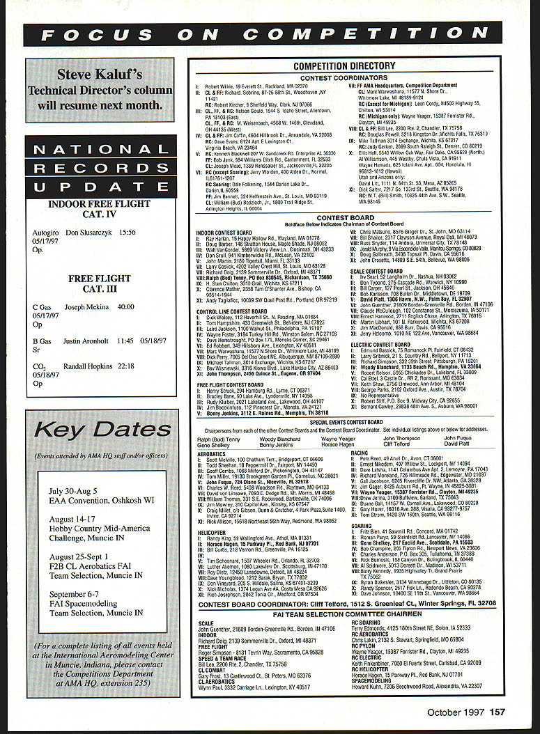 •in ~wm U mU 3 INDOOR FREE FLIGHT CAT lY Don Slusarczyk 1556 FREE FLIGHT CAT III Joseph Mekina 4000 B Gas Justin Aronholt 1145 05/18/97 Randall Hopkins 2218 COMPETITION DIRECTORY CONTEST COORDINATORS I Robert Wilkie 19 Everett St Rockland MA 02370 II CL & FF Richard Sobries 87-26 88th St Woodhaven NY 11421 RE Robert Kircher 9 Shetteld Way Clark NJ 07066 III CL FF & BC Nelson Snald 1044 S Idaho Street Allentown PA t8103 East CL Fr & RC M Weisenbach 4560W 146th Cleveland OH 44135 West IV CL & FF Jim Cettin 4664 Hillbrosk Dr Arnandale VA 22003 RE Dave Evans 6124 Apt E Leoington Ct Virginia Reach VA 22464 8 RE Kenneth Blackneell 207W Sandcreek Rd Enterprise AL 36330 FF Rob Junk 084 Williams Ditch Rd Cantonment FL 32633 CL Isseph Mood 1339 Renosaleer St JackeonvilleFL 32205 VI RE except Snaring Jerry Warden 400 Alden Dr Normal LOt 761-1207 RE Snaring Dale Falkening 1544 Darien Lake Dr DarieniL 60559 FF Jim Bennett 324 Heltenstein Ave St Louis MO 63110 CL William Bed Bedolech Jr 1600 Trail Ridge St Arlington Heights IL 69004 VII FF AMA Headquarteru Cainpetitien Department CL Marc Warwashana 11577 N Shsre Whitmsre Lake Ml 461 09-0124 RE Except ten Michigan Leon Cordy N45D3 Highway 66 Chiltsn WI 53014 RE Michigan nety Wayne Teeter 15307 Forrister Rd Clayton Ml 49235 VIII CL FF Bill Lee 2200 Rte 2 Chandler TX 7575B RE Dsuglas Pswell 5216 Kingston ErWichita Falls TX 76310 tX Mike Tallman 3014 Exchange Wichita 6667217 RE Judy Gerken 2069 South Raleigh St Denver CO 00216 X Ellis Hall 5543 Willow Oak Way Fair Ouko CA 95629 North Al Williamson 445 Weotby Chala Vista CA 01011 Wayne Hamada 625 lolani Ave Apt. 604 Honolulu I-li 06813-1012 Hawaii Utah Ariosna David LiO 1111 N 64th St 53 Mesa AZ 05205 XI Eick Salter 7217 Sn 133rd St Seattle WA 06178 RE WT Bill Smith 10625 44th Ave SW Seattle WA 60146 INDOOR CONTEST BOARO I Ray Harlan 16 Happy Hellew Rd Wayland MA 01778 II Doug Barber 146 Stratton House Maple Shade NJ 0B052 III Walt VanGorder 5669 Victory View Lo Cincinnoti OH 45233 IV Don Srull 041 Kimberwicke Rd McLean VA 22102 8 John Martin 2186 Tigertail Miami FL 33133 VI Larry Ceslick 4202 Valley Crest Hill St Leals MD 63128 VII Richard Doi9 2136 Sommemille Dotord Ml 48371 VIII Ralph Bud Teney PD Ben 030945 Richarduxe TX 75080 IX K Stan Chilten 3010 Grail Wichita KS 67211 X Clarence Mather 2356 Tam OShanter Ave Bishop CA 9351 4-1 944 XI Andy Ta9listico 10039 SW Quail Post Rd Portland OR 97219 CONTROL LINE CONTEST BOARD I Dick Wolsey 112 Haverhill St N Reading MA 61864 II Tam Hampshire 430 Greenwich St Belvidere NJ 67623 III Luird Jackson 1100 Walnat St Philadelphia PA 16107 IV Wayne Fanter 3184 Turkey Hill Rd Wiontan Salem NC 27186 8 Dave Hemstreoght PDBxsl7l Mencks Corner SC 29461 Vt Ed Rebbert 349 Hillnbore Axe Lexington KY 40511 VII Marc Warwashana ll577NShore Dr Whdmore Lake Ml 46109 VIII Dick Perry 7005 Del Ono Coart NE Alboquorque NM 671 09-2930 IX Michael Tallman 3014 Eachan9e Wichita KS 67217 X Ben Wisniewoki 3316 Kiowa Rind Lake havaso City AZ 66403 XI Jnhe Thempene 2458 Duiece St. Eegene OR 07404 FREE FLIORT CONTEST BOARD I Henry Struck 294 Hamburg Rd Lyme CT 06371 II Bradley Bane 60 Lake Ave Lyndenville NY 14098 III Rudy Klulber 2021 Lakeland Ave Lakewood OH 44107 IV Jim Becckintuso 112 PinecrestOir Menota VA 24121 8 Beney Jeekinn 3112 E Raieee Rd Meetphin TN 30110 SCALE John Guenther 21609 Oorden-Greenvile Rd Borden N 47196 INDOOR Richard Onig 2139 Sommotvilie Dr Oxford Ml 40371 FREE FLIGHT Roger Simpson 6131 Tenrin Way Sacramento CA 95828 SPEED & TEAM RACE Oil Lee 2200 Rto 2 Chandler TX 75750 CL COMBAT Gary Front 13 Castlewood Ct St Peters MO 63376 CL AEROBATICS Wynn Paul 3332 Carriage Le Leoingtoe KY 49517 Vt Chris Matueno 8576 Ginger Dr. St John MO 63114 VtI Viii Shailer 2317 Clawnon Avenue Royal Oak Ml 46073 VIII Runs Snyder 114 Andora Univernal City tX 78148 IX Jemid Murphy OVia Escondide Valle Man6eu Spnnga CO 80028 5 Deug Galbreath 3498 Topsail P1 Davis CA 05616 XI John Crxaettn 14809 SC 54th Bellevue WA 96006 SCALE CONTEST BOARD I Ira Sean 52 Langbxlm Dr Nashua NH 63062 II Don Typond 275 Cascade Rd Warwick NY 10690 III Bill Carper 127 Pearl St Jackson 0645646 IV Bob Karlsnon 708 Ballen Middletown 2019709 David PlaIt 1306 Hanre NM Palm Bay FL 32007 John Gaontber 21669 Oorden-Groenville Rd Borden IN 47106 Cisade Mclellough 162 Constance St Monteouma IA 56171 Ernest Harwood 2711 English Chase Arlington TX 76016 Martin Libhart 101 N Parkwood Wichita KS 67260 Jim MacDonald 856 Burr Davia CA 05616 XI Jerry Helcomh 1010 NE 122 Axe Vancouver WA 98664 ELECTRIC CONTEST BOARD Edmund Bassick 75 Rsmanock P1 Fairtield CT 66432 Larry Sribnick 21 5 Cauntry Rd Belipert NY 11713 Richard Simpson 332 39th Street Pittsburgh PA 15261 Weedy Blanchard 1733 Onach Rd Hampten VA 23864 V Robert Nelson 5955 Chickadee Dr Lakeland FL 33889 VI Cal Ettel 3 Castle Dr RR 2 Florissent MD 63934 VII Keith Shaw 2756 Elmwxod Ann Arbor Ml 48104 VttI Gearge Parks 2102 Oxford Ave Austin TX 78704 IX No Representative X Robert SlitI PO Dxv 9 Midway City CA 92655 XI Bernard Cawley 29838 48th Ave S Auburn WA 08091 SPECIAL EVENTS CONTEST BOARD Chairpersons tram ot ether Content Boards Cantest Bxard Coordinatsr See individual listings above belaw addresaex Ralph Bud TonnyWoody BlanchardWoyno YoagerJohn ThompsonJohn Fuqaa Gone ShelkoyBonny JonkinaHoraco HogenCliff TeltordOavid P100 AEROBATICS I Scott Melville 100 Ohatham Terr Bridgeport CT 06606 II Todd Sheehan 19 Peptoermill Er Fairport NY 14450 III Geoff Combs 1066 Miltord Dr Pickeringtxn 0043147 IV Tam Miller 19130 Broekgreen Garden P1 Curnelius NC 20631 V Jnhe Fuqan 724 Diaee St Nicenitie FL 32570 Vt Charles W Reed 5400 Woodoen Rd Raytown MD 64133 Vtt David von Linsowe 7093 C Dodge Rd Mt Merria Ml 40456 VIItWilliam Thomas 331 SC Rockweed Bartleoxille OK 74606 IX Jim Mowrey 310 Capitol Ave Kinsley KS 67547 X Craig Millet c/s Gibaun Dunn & Cratcher 4 Park PlazaSuite 1400 CA 92714 XI Rick Allison 15610 Northeast 56th Way Redmond WA 96052 HELICOPTER I Randy King 59 Wallingford Av