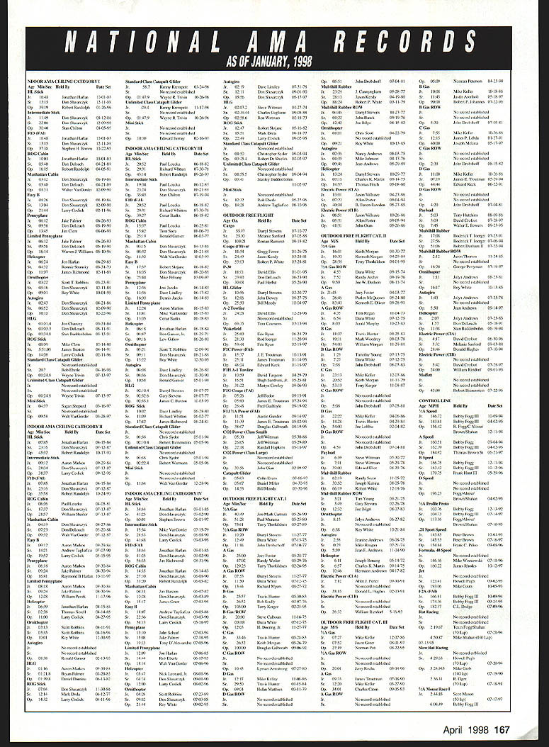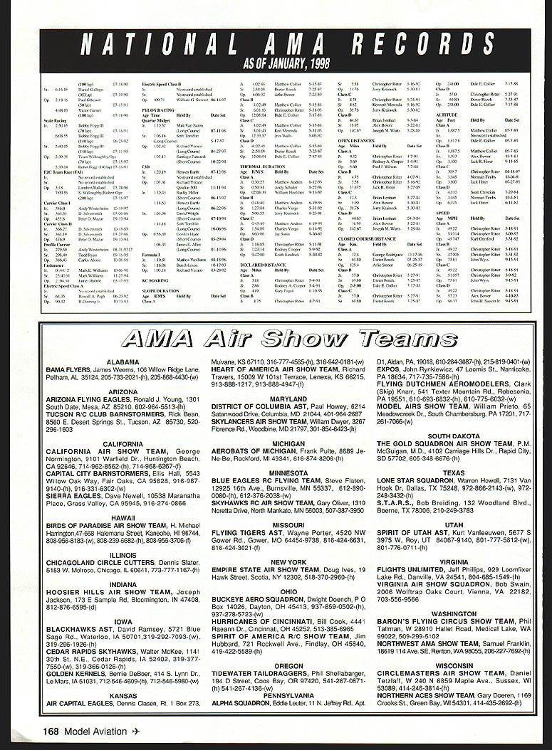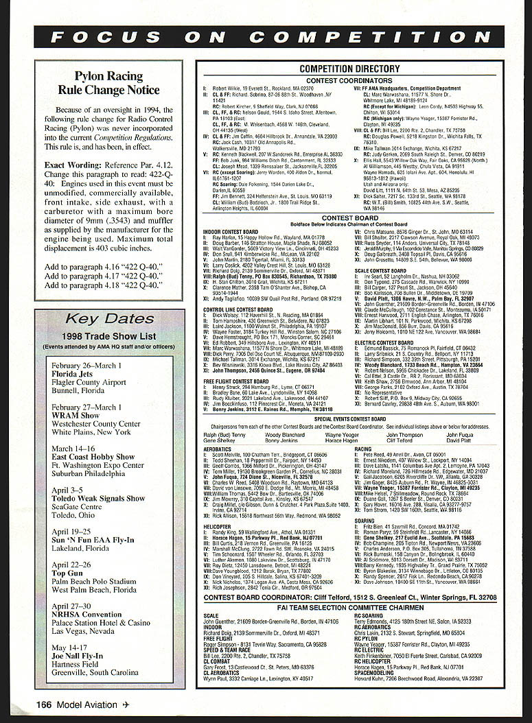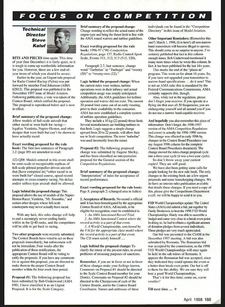 w W w w ~A 1 inin w k m Technical Director Steve Kaluf BITS AND PIECES time again time year late December fairly quiet tough come up worthwhile information However few end-ofyear items should aware Earlier year Urgent rule proposal Radio Control Racing Pylon put forward member Fred Johanson AMA 62812 proposal published November 1997 issue Model Aviation Following publication vote taken Contest Board ratified proposal proposal reproduced below now effect Brief summary proposed change Allow models full-scale aircraft either raced built racing legalize Vendetta Napier-Heston other designs built cant shown have actually raced Exact wording proposed rule book first two sentences Paragraph 32 page 89 amended read 422-QM Models entered event shall semi-scale recognizable replicas full-scale piloted propeller-driven aircraft [have competed in] *either raced built for* closed course speed record attempts cross-country racing No deltas and/or tailless type aircraft shall allowed Logic behind proposed change proposal allows use models Napier Heston Racer Vendetta Mr Smoothie certain other designs full-scale counterparts may never actually have raced luck rules change will help end seemingly never-ending battle within Q-40 ranks competitors will able get back racing Two other proposals recently submitted Contest Boards have voted act proposals immediately enforcement will immediate Four weeks after publication notifications appropriate Contest Board will voting ratify proposals have comments against proposal directed make proper Contest Board member within four-week time period Proposal #1 following proposal has submitted Bob Underwood AMA 690 have classified Urgent Proposal Scale Category Brief summary proposed change Change wording reflect actual name engine type bring thrust limit line AMA issued waivers turbine guidelines Exact wording proposed rule book 1996-97 98 Competition Regulations page 137 Radio Control Sport Scale Events 511512513515520 Paragraph 27 last sentence change word Turbofan Turbojet twenty 20 twenty-two 22 Logic behind proposed change current rules written turbine operations infancy actual competition usage simply anticipated Additionally AMA guidelines turbine operation waiver did exist current 20-pound limit came out early meeting prior availability consumer AMA has now established complete system turbine operation guidelines include 10kg 22-pound thrust limit Several manufacturers building turbines limit Logic suggests simple change upward 20 22 pounds will allow use Scale competition temi turbofan used incorrectly outset Proposal #2 following proposed change submitted Eugene Shelky has classified interpretation proposal General section Competition Regulations Brief summary proposed change Interpretation rules acceptance record performance Exact wording proposed rule book Page 8 paragraph 2 changed area italics 2 Acceptance Records No record official until has homologated appropriate Contest Board AMA records eligible recognition must established An AMA Sanctioned Record Trial 2 An AMA Sanctioned Contest record activity part event 3 World Championship sanctioned FAlfor appropriate class model record activity part event CD must satisfy himself Logic behind proposed change clarify intent present rules avoid problems misusing purposes sanctions Remember favor favor changes make feelings known Comments Proposal #1 should directed Scale Contest Board member District Comments Proposal #2 should directed Chairperson of Contest Boards Contest Board Coordinator Names addresses individuals can found Competition Directory issue Model Aviation Other Important Reminders Remember March 1 1998 non-narrow band transmitters will become illegal operate should come no surprise anyone Ive certainly published fact column enough times Bob Underwood mentioned times wrote column fact has published last 14 years marks end phase-in program went about 16 years So have upgraded transmitter narrow-band specifications . now AMA rule mandated Federal Communications Commission AMA certainly supports though Also regulation please dont forget receiver operate flying site uses 50 frequencies endangering yourself around you use narrow band-capable receiver hopefully also remember piece information Dont forget 1996-1997 version AMA Competition Regulations red cover actually 1996-1998 version change effected early 1996 changes Contest Board Procedures see August 1996 column complete Contest Board Procedures document change moved rules-change proposal cycle three-year cycle two-year cycle So dont throw away current copies still good have also getting some calls people looking new rule book changes existing book few urgent proposals some housekeeping changes have interim rules publication available details changes need copy please give Competitions Department call will happy send FiD World Championships update United States AIVIA did submit bid put together Hanly Brodersen host 1998 FlD World Championships Hardy able assemble budget came very close break-even point doing obtain significant amount donation pledges several individuals pledges very much appreciated bid presented ClAM December 1997 meeting bid also submitted Rumania Romanian bid accepted commission 1998 FlD World Championships will once again held salt mines Romania appears Romanian bid accepted since indicated could operate event better break-even point hat off ability sure will host good World Championships Thats time come warm weather Till next time . l 1998 165 February 26March 1 Florida Jets Flagler County Airport Bunnell Florida February 27March 1 WRAM Show Westchester County Center White Plains New York March P416 East Coast Hobby Show Ft Washington Expo Center Suburban Philadelphia April 35 Toledo Weak Signals Show SeaGate Centre Toledo Ohio April 1925 Sun N Fun EAA Fly-In Lakeland Florida April 2226 Top Gun Palm Beach Polo Stadium West Palm Beach Florida April 2730 NRIISA Convention Palace Station Hotel & Casino Las Vegas Nevada May 14-17 Jo