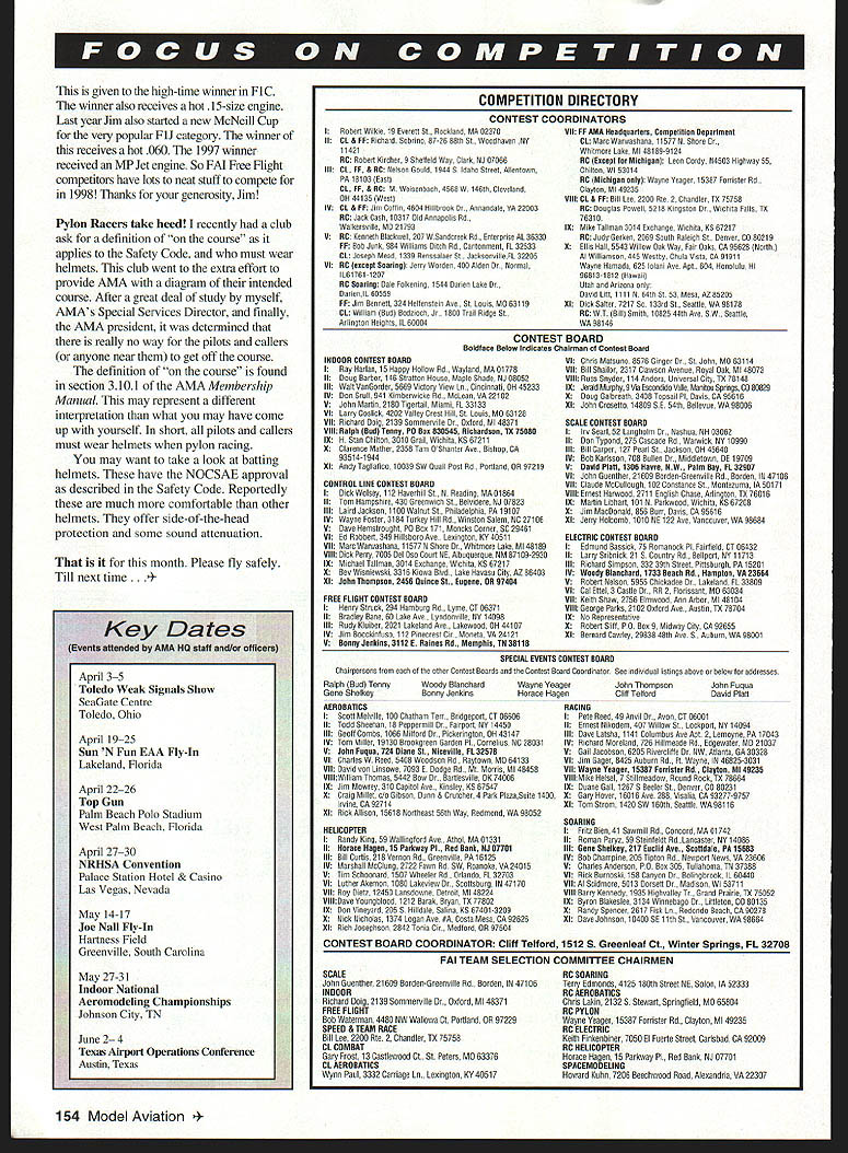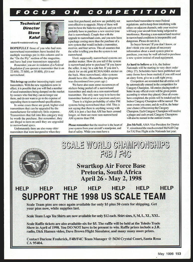 Technical Director Steve Kaluf skaluf@rnodelaircraftorg HOPEFULLY non narrowband transmitters have heeded multiple warnings put column the Fly section magazine have transmitters upgraded Remember violation Federal Regulation jf operate transmitter 72MHz 75 MHz 50MHz f narrowband brings up another interesting topic used transmitters new regulanons now effect possible will find number used transmitters being dumped market owners find can no longer use want go expense upgrading narrowband specifications some cases good higher-end transmitters can upgraded manufacturer relatively little expense Transmitters fall category may worth purchase remember illegal turn until upgraded narrowband specs Unfortunately also older transmitters inexpensive first purchased now probably cost-effective upgrade will need have batteries replaced will probably have purchase new receiver narrowband Couple upgrade narrowband costs now have package costing purchase new system would include transmitter receiver four servos assumes seller telling system narrowband Used supposedly narrowband systems another matter tell system narrowband prior purchase know seller may safe bet dont check old gold RCMAIAJVIA sticker back Most narrowband older systems should have Remember program discontinued two years ago have also seen some occurrences stickers being peeled off narrowband transmitter stuck non-narrowband transmitter sure way have transmitter looked spectrum analyzer higher probability older FM systems being narrowband AM saying anything wrong AM just fact AM has around longer non-narrowband AM systems FM Please remember receiver heart system aircraft s standpoint safety must have narrowband transmitter meet Federal regulations keep interfering others adjacent channels receiver will keep aircraft being subjected interference Running non-narrowband receiver narrowband conditions irresponsible dangerous Please So buyer beware dont know dont think can glean necessary information about used system prior purchase may well advised purchase new system instead used equipment As hard believe Indoor Nationals will starting very short order May 27 Schedules have published entry forms have mailed still need entry form give us call right away Competitors reminded entries will automatically entered competition Category Champion entries placing tenth better official event will given points according placed Once events have completed points will totaled Indoor Category Champion will named events enter well better chance becoming Category Champion Category Champion will receive plaque cash award Category Champions will also named outdoor events Jim MeNeill AIVIA Vice President District V reinstituted much-coveted MeNeill Cup FM Free flight Nationals last year May 1998 153 AX NDJUiULP & Swartkop Air Force Base Pretoria South Africa April 26- May 2 1998 HELPHELPHELPHELPHELPHELPHELP SUPPORT THE 1998 US SCALE TEAM Scale Team pins once again available $5 plus 50 cents shipping Get pins now supplies last Scale Team Logo Tee Shirts now available $12 Shirt sizes 5 M L XL XXL Scale Raffle tickets also availablesix $5 rafile will held Toledo frade Show April 1998 DO NOT have present win Raffle prizes include JR radio Dick Hansen video Dave Brown Flight Sinudator many prizes Contact Darlene Frederick F4BIF4C Team Manager @ 5634 Crystal Court Santa Rosa CA 95404 given high-time winner FiC winner also receives hot 15-size engine Last year Jim also started new McNeill Cup very popular FIJ category winner receives hot 060 1997 winner received IVIP Jet engine So FAd Free Right competitors have lots neat stuff compete 1998 Thanks generosity Jim Pylon Racers take heed recently club ask definition course applies Safety Code must wear helmets club went extra effort provide AMA diagram intended course After great deal study myself AMAs Special Services Director finally AMA president determined really no way pilots callers anyone near get off course definition course found section 3101 AMA Membership Manual may represent different interpretation what may have come up yourself short pilots callers must wear helmets pylon racing may want take look hatting helmets have NOCSAE approval described Safety Code Reportedly much comfortable other helmets offer side-of-the-head protection some sound attenuation month Please fly safely Till next time obert Wilkie 19 Everett St Rockland MA 02370 II CL & FE Richard Sobrino 97-26 89th St Woodhaven NV 471 BC Robert Kircher B Sheteld Way Glare NJ 07066 III CL FE & BC Nelson Gould t944 S Idaho Street Allentown PA 18103 East CL FF & BC M Weisenhach 4568W 146th Cleveland OH 44135 West IV CL & FE Jim Cotho 4604 Hillbroek Er Annandale VA 22003 BC Jack Cash 10317 Old Annapolis Rd Walrseroville ME 21793 R BC Kenneth Blackwell 207 WGandcreek Rd Enterprise AL 36330 FE Bob Junk 984 Williams Ditch Rd Cantonment FL 32533 CL Joseph Mead 1338 Reessaluer St JacknonvilleEL 32205 RI BC except Soaring Jerry Worder 400 Alden Dr Normal lL6t7At-t207 BC Soaring Dale Polkening t544 Darrer Lake Dr DarieniL 80559 FE Jim SenseD 324 Helteasten St Louis MD 63118 CL William Bed Rodvioch Jr 1908 Trail Ridge St Arliotton Heights IL 60084 INDOOR CONTEST BOARD I Ray Harlan 15 Happy Heliew Rd Wayland MA 01778 II Doug Barber 148 StraDon Heave Maple Shade NJ 08052 III Walt VanSolder 5669 Victory View La Cincinnati 0645233 IV Don Grail 941 Kimberwicke Rd McLean VA 22152 B John Martin 2186 Ti8ertaii Miami PL33133 Ill Larry Coslick 4202 Valley Crest Hill SI Levis MO 63128 VII Richard Doig 2139 Gommervilie Dr Ontord Mi 48371 BIll Ralph Bad Denny P0 Ban 830545 Bichardono TX iSOBO IX H Stan Chubs 3510 Grail Wichita KS 07211 B Clarence Matner 2350 Tam OGhanter Ave Bishop CA 935 14-1944 XI Andy Tagliafico 10839GW Quail Post Rd Portland 0997219 CONTROL LINE CONTEST BOARD I Dick Woisey 112 Hanerhili St N Reading MA 01864 II Tow Hampshire 430 Greenwich St Belnidere NJ 07823 Ill Laird Jackava 1158 Walnut St Philadelphia PA 19157 Ill Wayne Poster 3184 Turkey Hill Rd Winsta