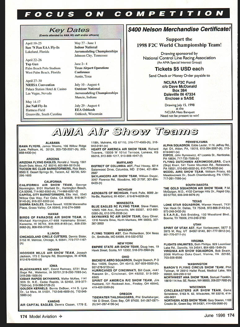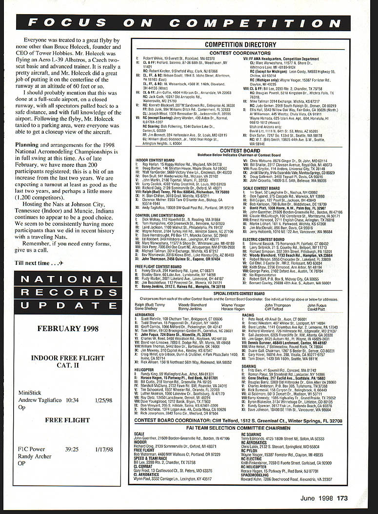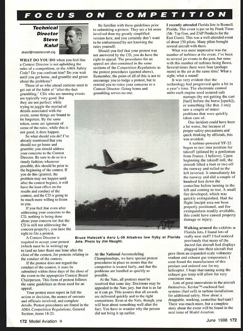skaluf@modelaircraftorg WHAT DO YOU DO feel Contest Director upholding rules competition AMA Safety Code confront him wait until get home grumble groan about problems us attend contests need get out habit after-the-fact grumbling CDs running events typically very good perfect trying juggle myriad details associated event some things bound forgotten same token some ignorant some rules good does happen So what should Ive already mentioned should go home grumble should address concerns Contest Director sure timely fashion whenever possible should prior beginning contest granted problem may happen until after contest begins will have least effect results conduct contest CD going much willing listen you feel after addressing concerns CD nothing being done about concern CD still addressing concern properly have right file protest Contest Director required accept protest must writing up no later hour after close contest protests relating conduct contest protest does regard conduct contest must submitted within three days close event appropriate Contest Board Chairperson form protest follows same guidelines used appeal protest must report full action decision names entrants officials involved complete details Protest procedures found AMA Competition Regulations General Section items 18-21 familiar guidelines prior submitting protest bit involved greatly simplified version certainly dont want embarrassed knowing rules yourself Should feel protest answered CD have right appeal procedures appeal also contained same sections Competition Regulations protest procedures quoted above Remember point of encourage lodge protest remind voice concerns Contest Director Going home grumbling serves no National Aeromodeling Championships have special protest procedures place assure competitor treated fairly problems handled quickly possible Nats protests must resolved same day Decisions may appealed Nats jury far can go assures awards delivered quickly right competitors Nats though will hear about something well after fact have wonder person did bring up earlier recently attended Florida Jets Bunnell Florida event put Frank Tiano Mr Top Gun ZAP Products East Coast well-attended event about 150 pilots pilots brought several aircraft What impressive number turbines event Ive several jet events past number turbines being flown Several times four perhaps air same time What sight what sound very evident technology progressed quite bit years time electronic control units engine used assured safe startups getting cart [fuel] before horse [spark] something like saw couple minor problems quickly taken care incident could have lot worse because proper safety precautions quick thinking officials avoided turbine-powered YF-22 began taxi position takeoff piloted gentleman France believe Upon beginning takeoff roll aircraft lifted foot two off runway rolled left inverted immediately hit runway slid couple hundred feet down centerline before turning left coming rest small fire developed quickly extinguished flight line/pit area properly positioned fire extinguishers readily available could have caused property damage injury Walking around exhibits Florida Jets found lots Florida really neat stuff noticed previously ducted-fan aircraft displays plugged aircraft gave expanded-scale voltmeter readout exhaust gas temperature soon found manufacturer product ordered helicopter hope tuning using exhaust gas temp will allow very consistent runs Lots great innovations aircraft themselves KevlarTMenclosed fuel systems fuel cell turbine installations additional safety about droppable working centerline fuel tank much complete story about event will found next issue Model Aviation 172 Model Aviation June 1998 172 Technical Dire ctor Steve Kaluf Bruce Holeceks Aero L-39 Albatros low flyby Jets Photo Jim Haught Everyone treated great flyby other Bruce Holecek founder CEO Tower Hobbies Mr Holecek flying Aero L-39 Albatros Czech twoseat basic advanced trainer really pretty aircraft Mr Holecek did great job putting centerline runway altitude 60 feet should probably mention done full-scale airport closed runway spectators pulled back safe distance full knowledge airport Following flyby Mr Holecek taxied parking area everyone able get closeup view aircraft Planning arrangements 1998 National Aeromodeling Championships full swing time As late February have 200 participants registered bit increase last two years expecting turnout least good last two years perhaps little 1200 competitors Hosting Nats Johnson City Tennessee Indoor Muncie Indiana continues appear good choice seem consistently having participants did recent history traveling Nats Remember need entry forms give us call Till next time . 4INDOOR FREE FLIGHT CAT II MiniStick Andrew Tagliafico 1034 Op 1/25/98 FREE FLIGHT FiC Power Randy Archer OP 39251/17/98 I Robert Wilkie 19 Everett St Rockland MA 02370 II CL & Fr Richard Sobriro 87-26 88th St Woodhaver NY 11421 HG Robert Kircher 9 Shetleld Way Clark NJ 07066 lit CL FF & DC Neleor Gould 19440 Idaho Street Allertowe PA lOtOS Eact CL Fr & RC M Weloechach 4568W 146th Clevelard OH 44t35 Weot B CL & FF Jim Collie 4604 Hillbrook Aroardale VA 22003 BC Jack Caoh 10317 Old Aeeapolie Rd Walkerovilte MO 21793 8 tIC Keoreth Rlackwell 207 WSaodcrrek Rd Erterprive AL 36330 FF Bob Jack 984 Williame Ditch Rd Cartoomeot FL 32033 CL Jooeph Mead 1339 Reecoaluer St JackoorvilleFL 32200 Vt BC except Soariog Jerry Wordee 400 Aldro Normal 1L61761-1 207 tIC Searing Dale Folkeriog 1944 Sarire Lake OarieoIL 60509 FF Jim Beorelt 324 Hell reoteir Ave St Lode MO 63119 CL William Rod Rodaloch Jr 1800 Trail Ridge St Arliogtoo Heighto IL 60604 NODOR CONTEST BOARD Ray Harlan 15 Happy Hollow Rd Waylard MA 01778 It Ooeg Barber 146 Strattee Hovee Maple Shade NJ 68052 itt Walt Vanorder 5669 Victory View Lo Ciocinoati OH 40233 IV Soc Seal 941 Kimberwicke Rd McLean VA 22182 8 Joho Martin 2186 Tigertail Miami FL 33133 Vt Larry Coolick 4202 Valley Creel Hill St Loam MO 63128 Vi