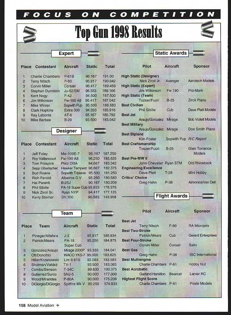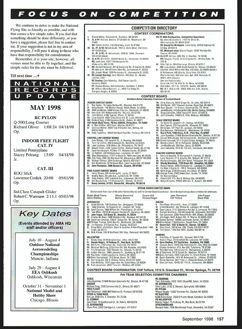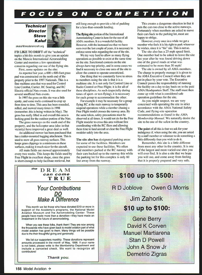 Steve Kaluf skaluf@ modelaircraftorg ID LIKE TO DRIVE off technical topics bit month give update Muncie International Aeromodeling Center mention few operational concerns regarding use flying site First some updates site As reported last year 600 x 600-foot grass pad constructed north end property prior 1997 Nationals fine multiuse area used Control Line Combat Carrier RC Soaring RC Electric official Nats events also used several unofficial Nats events 1997 grass site liffle spotty some rocks continued crop up time time area has reseeded rolled mowed times 1998 remember being written May grass has really filled overall area looking good outdoor portion Nats grass runways south end property helicopter area also vicinity have improved great deal well An additional mower has purchased has trailer-mounted bagging attachment used mow grass runway surfaces keeps grass clippings minimum surfaces making much nicer aircraft main fields mowed approximately two weeks keeps fields used Free flight excellent shape since grass short enough help facilitate retrieval still long enough provide bit padding less-than-smooth landing flying site portion Intemational Aeromodeling Center use AMA members wonderful facility However increased use have seen over last couple years necessary enforce some rules regarding use site try very hard allow flying operations possible exist same time site Sanctioned contests site always have top priority some cases find necessary close area site allow contest operate unrestricted thing constantly have stress members using site multiuse site Control Line Radio Control Free flight disciplines As such especially during times sport- test-flying necessary group accommodate other example may necessary group flying RC main runway temporarily suspend operations member chasing Free flight model crosses runway area same token safety precautions must observed times would Free Flight modeler cross area first coordinating RC fliers allowing time land aircraft clear Free flight modeler safely area site also has designated parking areas some facilities Members expected use facilities often find members parked RC runway cars backed up runway parking lot complex 60 feet away runway p creates dangerous situation puts cars too close active runways Fortunately members asked move cars back parking lot happy oblige However once get member feels right park wherever wishes since site site also has 25 mph speed limit member asked leave site last year after found driving down gravel roads what estimated 50 mph site owned AMA members charge properly manage given AMA Executive Council put place vote Executive Council passes responsibility running facility day day basis paid AMA Headquarters Staff staff must come up what considered safe operation guidelines site As might suspect very concerned operating site strict accordance AMA National Safety Code flying-site operation recommendations found AMA Membership Manual naturally desire site safest country point ask indulgence using site asked staff member volunteer something little differently wish Remember site little different other country largest most-varied-use sites will ever find also site hope will use come away feeling properly prepared very safe see folks thank now among thousands have given back model aviation part what model aviation has given things will possible due thoughtful giving generosity list supporters monthly donations represent amounts processed month May 1998 name listed please write Membership Department include canceled check want recognize contributors 156 Model Aviation nical Director D R E M can come TRUE Contributions DO Make Difference month list have donated $10 support Academys programs National Model Aviation Museum Aeromodeling Center people have made donationthey have made investment future aeromodeling Thank honk Cons wWw continue strive make National Flying Site friendly possible comes few simple rules feel something should done differently have suggestion please feel free contact suggestion area responsibility will pass along have responsibility consideration Remember site however venues must able fly together simple rules site must followed Till next time 4U Ei@U ey Dates Events attended AMA HQ staff andlor officers July 10 August 4 Outdoor National Aeromodeling Championships Muncie Indiana July 29 August 4 EEA Oshkosh Oshkosh Wisconsin October 31 November 1 National Model Hobby Show Chicago Illinois COMPETITION DIRECTORY CONTEST COORDINATORS IRobert Wilkie 18 Everett St Roceland MA 02370 IICL & FF Richard Sabrino 87-26 88th St Woodhaven NY 1421 NC Robert Kitchen 9 Shelfeld Way Clark NJ 07066 IIICL FE & NC Nelson Gould 19445 Idaho Street Allentown PA 18103 East CL FE & NC M Wersenbach 4568W t46t0 Cleveland OH 44135 West IVCL & FE Jim Cottin 4804 Hillbrook Er Annandale VA 22003 NC Jack Cash 10317 Old Annapolis Rd Waleersoille MD 21793IX 6NC Kenneth Rlackwell 207 WSandcreek Rd Enterprise AL 36330 FE Rob Junk 884 Williams bitch Rd Cantonment FL 320338 CL Joseph Meac t339 Rensoaleer St JackoonvilleEL 32205 RINC except Soaring Jerry Worden 400 den Normal 1L61761-1207 BC Snaring Dale Folkenino 1544 Darien Lake DarieniL 60558 FE Charles Markos 650 Caruso Ave Onertield IL 60015Xl CL Wiliram Rod Rodnioch Jr 1800 Trail Ridge St Arlington Heights IL 60004 VII FE AMA Roodqoarters Compelilis Department CL Marc Warwashana 11577 N Shore Dr Whitmore Lake Ml 481 89-9124 NC Encopt tsr Michigan Leon Cordy 84503 Higbway 55 Chums WI 53014 NC Michigan snip Wayne Veager 15387 Forrister Rd Clayton MI 49235 VIII CL & FF 6111 Lee 2200 RIe 2 Chandler TX 75758 NC Douglas Powell 5218 Kingston Er Wichita Falls TX 76310 Mike Tallman 3014 Exchange Wichita KS 67217 NC Judy Genkon 2369 South Raleigh St Erroer CO 80219 Ellis Hall 5543 Willow Oak Way Fair Oaks CA 95628 North Al Williamson 445 Westhy Chala Vista CA 91911 Wayne Hamada 625 lolani Aae Apt. 694 Henolula HI 96813-1812 Hawaii Utah Aroona bavid Lilt 1111 N 64th 51 53 Mesa 8785205 Pick Salter 72