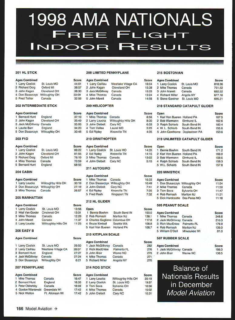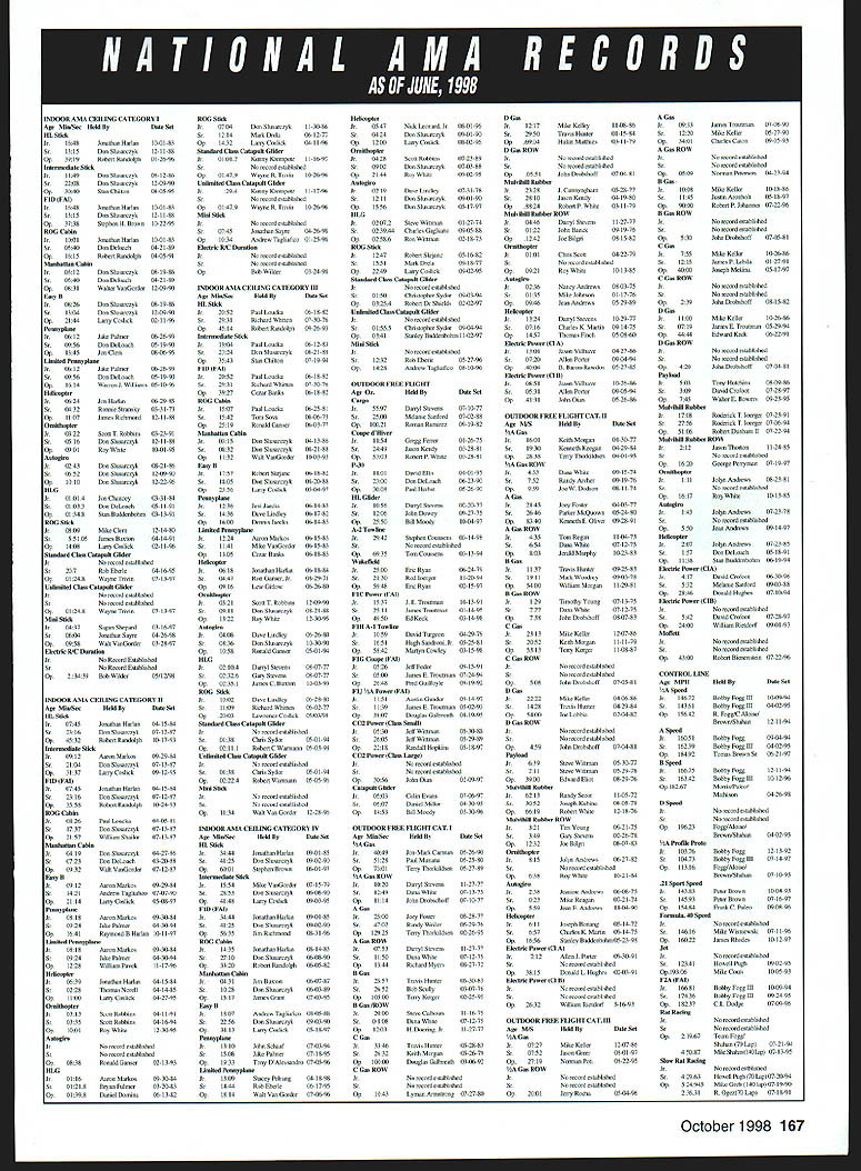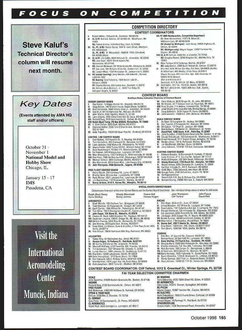 COMPETITION DIRECTORY CONTEST COORDINATORS I Robert Wilkie 19 Roomer St Rockland MA 02370 II CL & FF Richard Sobnino 87-26 88th St Woodlraven NY 11421 AC Robert Kircher 9 Slretteld Way Clark NJ 07066 III CL FF & AC Nelson Goald 19440 Idaho Street Allentown PA 18103 East CI, FF & AC M Weisenbach 4568W 146th Cleveland 0644135 West IV CL & FF Jim Collin 4604 HillErssk Dr Assoodale VA 22003 AC Jack Cash 10317 Old Asnapolis Rd Walkereville MD 21793 8 AC Kenneth Rlackwell 207 WSandcreek Rd rprise AL 36330 FF Rob Junk 984 Williams Ditch Rd Cantonment FL 32533 CL Joseph Mead 1339 Rensoaloer Sn JacesonvilleFL 32305 VI AC escept Soaring Jerry Worden 400 Alden Dr Normal 1L61761 -1207 AC Soaring Dale Folkening 1544 Dories Lake Dr DarieniL 60559 FF Charles Markos 655 Canlise Ave Deerlield IL 60015 CL William Rod Rodvioch Jr 1800 Troil Ridge St Arlington Heighos IL 60004 VII FF AMA Hnadqsarlers Campetitien Department CL Marc Warwashasa 11577 N Shore Dr Whitmore Lake MI 48169-9124 AC Except Michigan Leon Condy N4593 Highway 55 Chihon WI 53014 AC Michigax Wayne Teoger 15387 Forrister Rd Clayton Ml 49235 VIII CL & FF Rill Lee 2200 Ole 2 CEandler TX 75756 AC Douglas Powell 5218 Kingston Dr Wichita Falls TO 76310 IXMike Tollman 3014 Escange Wicita KS 67217 AC Judy Gerkan 2069 Sooth Raleigh St Denver CD 80219 9Ellis Hall 5543 Willow Oak Way Fair Oaks CA 95628 North Al Williameso 445 Westby Chub Vista CA 91911 Wayne Homodo 625 lolani Ave Apt. 694 Honolulu HI 96813-1812 Howai Osah Ariosno coly David Lilt 1111 N 64th 51 53 Mesa 0285265 XIDick Salter 7217 So 133rd SI SeaDle WA 98176 AC WT Rill Smith 10825 4418 Ave SW SeaSle WA 90146 CONTEST BOARD Boldtace Below Indicates Chairman Coetesl Board INDOOR CONTEST BOARD I Ray Harlan 15 Happy Hollow Rd Wayland MA 01778 I Doug Rorber 146 StroDon House Maple Shade NJ 08052 lit Walt VanSender 5689 Victsry View Le Cincinnati 08 45233 IV Den Srull 941 Kimbemeicke Rd McLeas VA 22192 V Jabs Marlin 2180 Tigertoil Miami FL 33133 VI Lorry Coslick 4202 Valley Crest Hill St Louis MO 63128 VII Richard Deig 2139 Semmemille Dr Ostord Ml 48371 VIII Ralph Bad Tenny P0 Boo 030545 Richardson TX 75060 IX H Stan ChiSon 3910 Snail Wichita KS 87211 X Clarence Mother 2359 Tam OShonten Ave Rishep CA 93514-1944 XI Andy Togliof ice 100398W Quail Foot Rd Fortlond OR 97219 CONTROL LINE CONTEST BOARD I Dick Wolsey 112 Haverhill St N Readiog MA 01964 It Tam Hampshire 430 Greenwich St Relvidere NJ 07823 III LairdJucksoo 1180 Walnut St Philadelphia P018107 IV Wayne Foster 3184 Turkey Hill Rd Winstos Salem NC 27106 0 Dave Hemstrsugnt PORes 171 Moncks Corner SC 29401 VI Ed Rebbert 349 Hillsbero Ave Leeingtoo KY 48511 Ott Marc Wormoohana 11577 N Shore Dr Whitmone Lake Ml 48188 VIII Dick Peery 7005 Del Oso CouG NE Albuguergue NM 071 09-2930 IX Michael Tallmon 3014 Eachange Wichdo KS 67217 X Rev Wisniewski 3316 Kiowa Riod Lake Hovaso City 0786403 XI Jehe Thempoon 2456 Osince St Evoene OR 97404 FREE FLIGHT CONTEST BOARD I Heery Steack 294 Hamburg Rd Lyme CT 08371 II Rrodley Rote 80 Lake Ave Lyodenville NV 14898 III Rudy Klviber 3021 Lakeland Ave Lakemoed OH 44167 IV Jim Rocckinleso 112 Finecrest Cm Moneta VA 24121 0 Beney Jenkins 3112 B Raleno Rd Memphis TN 38116 VI Chris Matsuno 9576 Ginger Dr St Jeho MD 83114 VII Rill Shoilor 2317 Clowoen Aveooe Royal Oak Ml 48073 VIII Russ Snyder 114 Aodoro Oniveesal City TX 70148 IX Jerold Marphy 0 Ye Escandide Voile Manbsu Sp#ngs CO 86029 X Doug Galbreoth 3408 Topsoil Fl Doyle CA 95618 XI John Creselto 14809 SD 5415 Rellevue WA 98068 SCALE CONTEST BOARD I Im Sean 52 Loogholm Dr Noshaa NH 03062 II Don Typood 275 Cascade Rd Warwick NY 19990 III Rill Carper 127 Pearl St Jackson 0645640 IV Rob Kadoson 708 Rulleo Dr Middetown DR 19709 Dacid PIaR 1306 00cm NW Palm Bay FL 32807 Jeon Guenther 21809 Rerden-Greensille Rd Rorden IN 47106 Claude McCullough 102 Constance St Meneouma 1050171 Ernest Harwood 2711 English Chase Arlington TO 76016 Mortie Libhart 101 N Parkwood Wichita KS 67200 Jim MacDonald 056 Rum Davis 0005816 Jerry Holcomb 1018 NE 122 Aye Vooceaver WA 98684 ELECTRIC CONTEST BOARD Edmund Rusoick 75 Romonock P1 Fuinield CT 06432 Larry Sribnick 21 5 Country Rd Reilpert NY 11713 Richard Simpsoo 332 39th Street Piffsbuegh P015201 Woedy Btanchard 1133 Beach Rd Hampton VA 23064 0 Robert Nelson 5955 Chickadee Dr Lakelond FL 33889 Vt Cal DUel 3 Castle Dr OR 2 Floniosant MO 63634 VII Keith Show 2756 Dlmmoad Ann Arbor Ml 40104 VIII George Parks 2102 Oslond Ave Aestin TX 70704 IX No Representative X Robert Sliff PO Ros 8 Midway City 0092655 XI Rernard Cawley 29830 48th Ave S Auburn WA 90001 SPECIAL EVENTS CONTEST BOARD Chairpersons tram ether Contest Rounds Contest Round Coordinator See individual listings above belew tar addresses Ralph Rod TommyWoody BiwnabandDuane GallJohn ThompsonJohn Fuquw Gene ShelkeyBonny JenkinsHoraae HagenCliff TellondDavid PIaD AEROBATICS I Scott Melville 100 Chuthom Tern Rnid9eport CT 06808 II Todd Sheehan 18 Peppenmill Dr Fuinport NY 14450 III Geoff Combs 1088 Mi8ond Dr Pickeninglon 0943147 IV Tom Miller 19130 Rnaokgneen Sonden Fl Cornelius NC 28031 V John Feqea 724 Diane St Niceellie FL 32510 VI Charles W heed 5408 Weodoon Rd Roynown MD 64133 VII David van Linoome 7093 E Dodge Rd Mt Morris Ml 40450 VIIIWilliam Thomas 5442 Raw Dr Rartleoville OK 74006 IX Jim Mawney 310 Capitol Ave Kinoley KS 87547 X Craig Millet cia Gibson Dunn & Drubber 4 Punk PlozaSu6e 1400 0092714 XI Rick Allison 15618 Northeast 5615 Way Redmond WA 98052 HELICOPTER I Randy King 59 Wullinglond Ave AlOol MA 01331 It Horace Hagee 15 Parkway Fl Red Back NJ 07701 III Rill Curtis 218 Vernon Rd Greenville P016125 IV Marshall McClun5 2722 Fawn Rd SW Raunoke VA 24015 V Tim SchoanunG 1507 Wheeler Rd Orlando FL 32703 Vt Luther Akemon 1080 Lukeview Dr Scottabung IN 47170 VII Ray Diete 12450 Lunodewne Delnoit Ml 48224 VIIIDove Youngbload 1212 Ranak OryorTO 77002 IX Dan Vineyard 2OSS Hilidole Sauna KS 67401 -3209 X Nick Nicholas 1374 Logue Ave #0 Costa Mesa 0052828 XI Rich Josephson 2842 Tonia