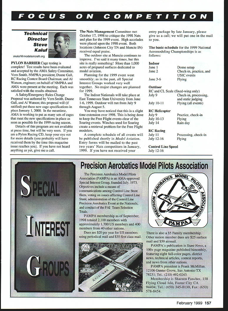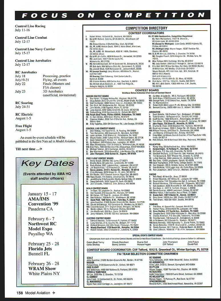 Technical Director Steve Kaluf skaluf@ niodelaircraftorg PYLON BARRIER Cage testing complete Test results have evaluated accepted AMA Safety Committee Vein Smith NMPRA president Duane Gall RC Racing Contest Board Chairman Al Watson engineer behalf NMPRA AIVIA present meeting satisfied results obtained Safety/Emergency Rules Change Proposal authored Vein Smith Duane Gall Al Watson proposal will ratified put new cage specifications place January 1 2000 meantime AMA working put sets cages meet new specifications place soon possible 1999 racing season Details program available press time will very soon Pylon Racing CD keep eye out details probably will have received time magazine issue reaches you have heard anything yet give call Nats Management Committee met October 17 1998 critique 1998 Nats plan 1999 event High accolades placed upon 1998 event Both locations Johnson City TN Muncie IN received equal praise outdoor site Muncie continues improve Ive said times site really something 1000 acres prepared surfaces dedicated model aviation Planning 1999 event went smoothly past Special Interest Groups worked very well together No major changes planned 1999 Indoor Nationals will take place East Tennessee State University June 1-6 1999 Outdoor will run July 9 through August 5 may have noticed slight time extension over 1998 being done keep Free Flight events clear Soaring events Winches used Soaring create retrieval problem Free Flight modelers complete schedule events will published shortly Model Aviation Entry forms will mailed past two years Nats competitors January 1999 have received entry package late January please give us call will put mail basic schedule 1999 National Aeromodeling Championships follows Indoor June 1 June 2 June 3-6 Dome setup Check-in practice USIC events Flying Outdoor RC CL Scale fixed-wing July 9Check-in processing static judging July 10-11Flying events RC Helicopter July 9 July 10-13 July 14 RC Racing July 11 July 12-16 Practice check-in Flying Rain day Processing check-in Flying February 1999 157 Control Line Speed July 12-16 Control Line Racing July 11-16 Control Line Combat July 12-17 Control Line Navy Carrier July 15-17 Control Line Aerobatics July 12-17 RC Acrobatics July 18 Julyl9-21 July 22 July 23 Processing practice flying events Finals Masters F3A classes 3D Aerobatics unofficial invitational RC Soaring July 24-31 RC Electric August 1-5 Free Flight August 1-5 An event-by-event schedule will published first Nats ad Model Aviation I Robert Wilke 19 Everett St Rockland MA 02370 II CL & FP Richard Sobrino 87-26 ROW St Woodhaven NY 11421 RC Robert Kircher 9 Shefteld Way Clark NJ 07066 III CL PP & RC Nelson Gould 1944 S Idaho Street Allentown PA 18103 East CI PP & RC M Weloenbach 4566W 146th Cleveland OH 44135 West IV CL & FF Jim CoRin 4604 Hillbrook Annandale VA 22003 RC Jack Cash 10317 Old Annapolis Ed Walkeronille ME 21793 V RC Kenneth Blackwell 207 WSaedcreok Ed Esterprine AL 36330 PF Bob Junk 984 Williams Ditch Rd Cantonment FL 32533 CL Joseph Mead 1339 Renosaleer St JackoonvilleEL 32205 RI OC except Soaring Jerry Warden 409 Alden Dr Normal lL6t78t-t237 NC Soaring Dale Folkening 1544 Darien Lake Dr DarienIL 60509 FP Charles Markos 655 Carlise Ave Eveetield IL 60010 CL William Bed Boduinch Jr 1900 Trail Ridge St Arlington Heights IL 60004 INDOOR CONTEST BOARD I Ray Harlan 15 Happy Hollow Rd Wayland MA 01778 II Deug Barber 25 5 Charch Rd Unit 60 Maple Shade NJ 08052 III Walt VanGorder 5669 Victory View Ln Cincinnati OH 45233 IV Don Seull 941 Kimberwicke Rd McLean VA 22102 V John Martin 2180 Tigettail Miami FL 33133 VI Larry Cealick 4202 Valley Crest Hill St Louis MO 63128 VII Richard Oslo 2139 Semmemille Dr Ovierd Ml 48371 VIII Ralph Bud Tenny P0 Boo 830845 Richardoen TX 75080 IX H Stan Chutes 3010 grail Wichita KS 67211 X Clarence Mather 2358 Tam OShanter Ann Bishop CA 9351 4-1044 XI Andy Tagliafice 2584 SW Glenhanen Rd Lake Oowe9o 0907234 CONTROL LINE CONTEST BOARD I Dick Wolsey 112 Hanerhill St N Reading MA 01864 II Tom Hampshire 439 Greenwich St Belvidere NJ 87923 III Laird Jackson 1108 Waleat St Philadelphia PA 19107 IV Wayne Foster 3184 Turkey Hill Rd Winston Salem NC 27106 V Dane Hemotroaght PD Boo 171 Moncko Corner SC 29481 VI Ed Robhert 349 Hillobore Ave Levinglon KY 40511 VII Marc Warmashana 11577 N Shore Dr Whitmore Lake Ml 48189 VIII Dick Perry 7885 Del 080 Ceart NE Albuquerque NM 871 09-2938 IX Michael Tallman 3014 Exchange Wichita KS 67217 X Ben Wioniewoki 3316 Kiowa Bind Lake Hanaso City AZ 86403 XI Jehe Thompson 2458 Oaince SI Eugene OR 97404 FREE FLIGHT CDNTEST BOARD I Henry Struck 294 Rte156 Lyme CT 06371 II Bradley Bane 60 Luke Ave Lyndennille NY 14898 III Rudy Klulber 2021 Lakeland Ann Lukewood 0644107 IV Jim Bocckinfuoo 112 Pinecrest Ole Moneta VA 24121 V Bonny Jenkins 3112 E Rainos Rd Memphis TN 30118 VI Chris Matouno 8576 Singer Dr St John MO 63114 VII Bill Shailor 2317 Clawoon Avenue Royal Oak Ml 48073 VIII Russ Snyder 114 Andora Universal City TX 78148 IX Jemid Murprry 9 Va Endde Man6ou Spdngs Valiry CO 80829 X Doug Oulbenath 3408 Topsail P1 Davis CA 95616 XI John Crosette 14889 SE 54th Bellevue WA 08008 SCALE CO NIE ST 00 ARD I Im Snarl 52 Lan9helm Dr Nashua 9683062 II Den Typond 275 Cascade Rd Warwick NY 18090 III Bill Carper 127 Pearl St Jackson 0645640 IV Bob Karlsoon 708 Ballen Dr Middletown DE 10700 V David PIaB 1306 Hanre NW Palm Bay FL 32807 VI John guenther 21609 Borden-Sreenville Rd Borden 1847196 VII Claude McCullough 102 Constance St Montezuma IA 50171 VIII Ernest Harwood 2711 English Chase Arlington TX 78018 IX Martin Libburt 101 N Parkwood Wichita KS 67208 X Jim MacDonald 856 Burr Danlo CA 95616 XI Jerry Holcomb 1810 NE 122 Ann Vancouver WA 98684 ELECTRIC CONTEST BOARD I Edmund Basoick 75 Rewanock P1 Fairfield CT 06432 II Larry Sribnick 21 5 Ceuntry Rd Boliport NY 11713 III Richard Simpson 332 39th Street Pittvbur9h PA 15201 IV Woody Blanchard 1733 Beach Rd Hampton VA 23084 V Robert Nelson 5955 Chickadee Dr Lakeland FL 3380